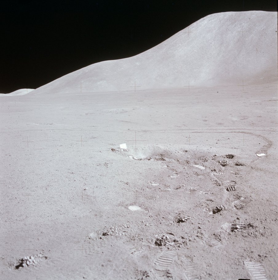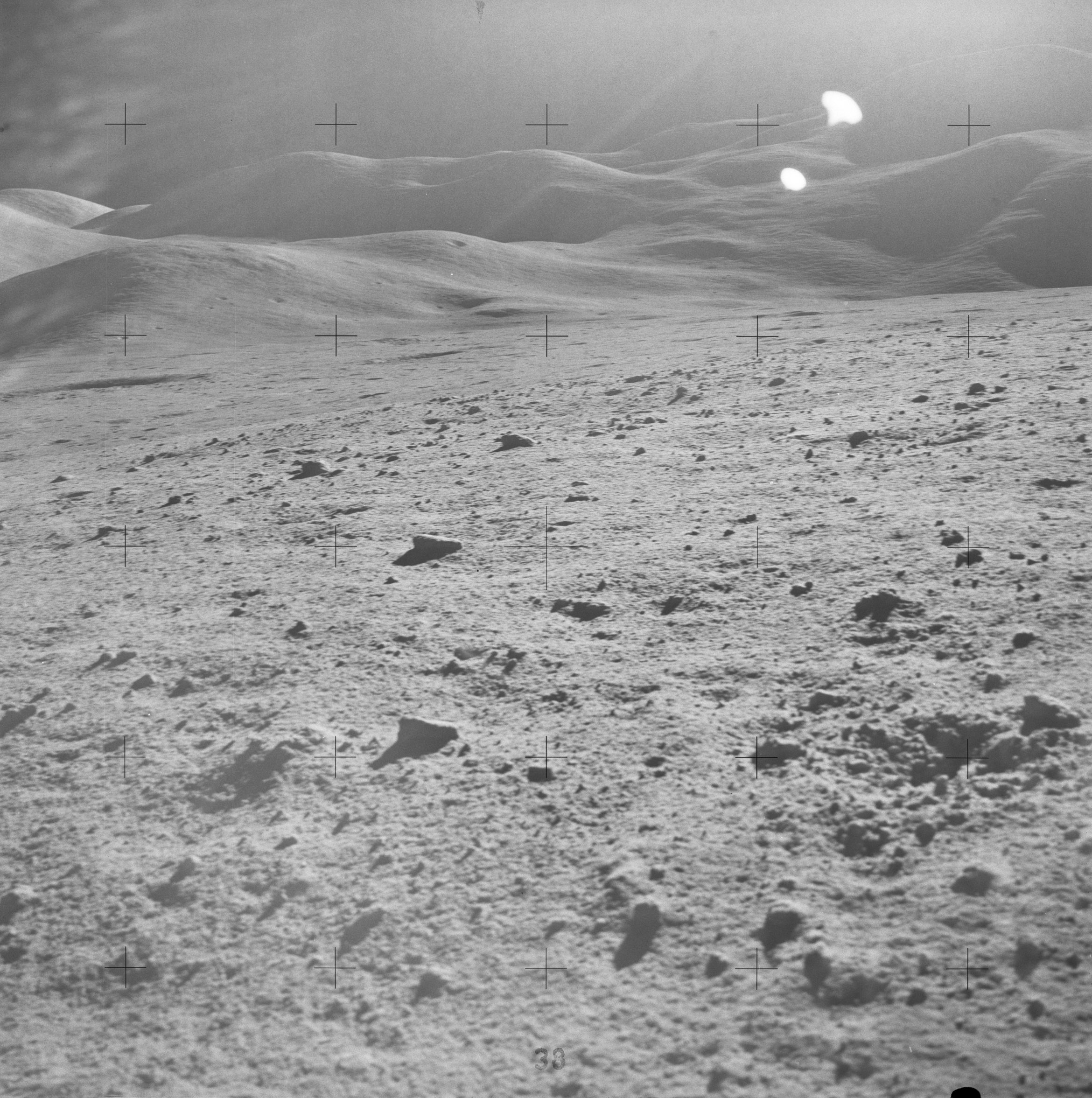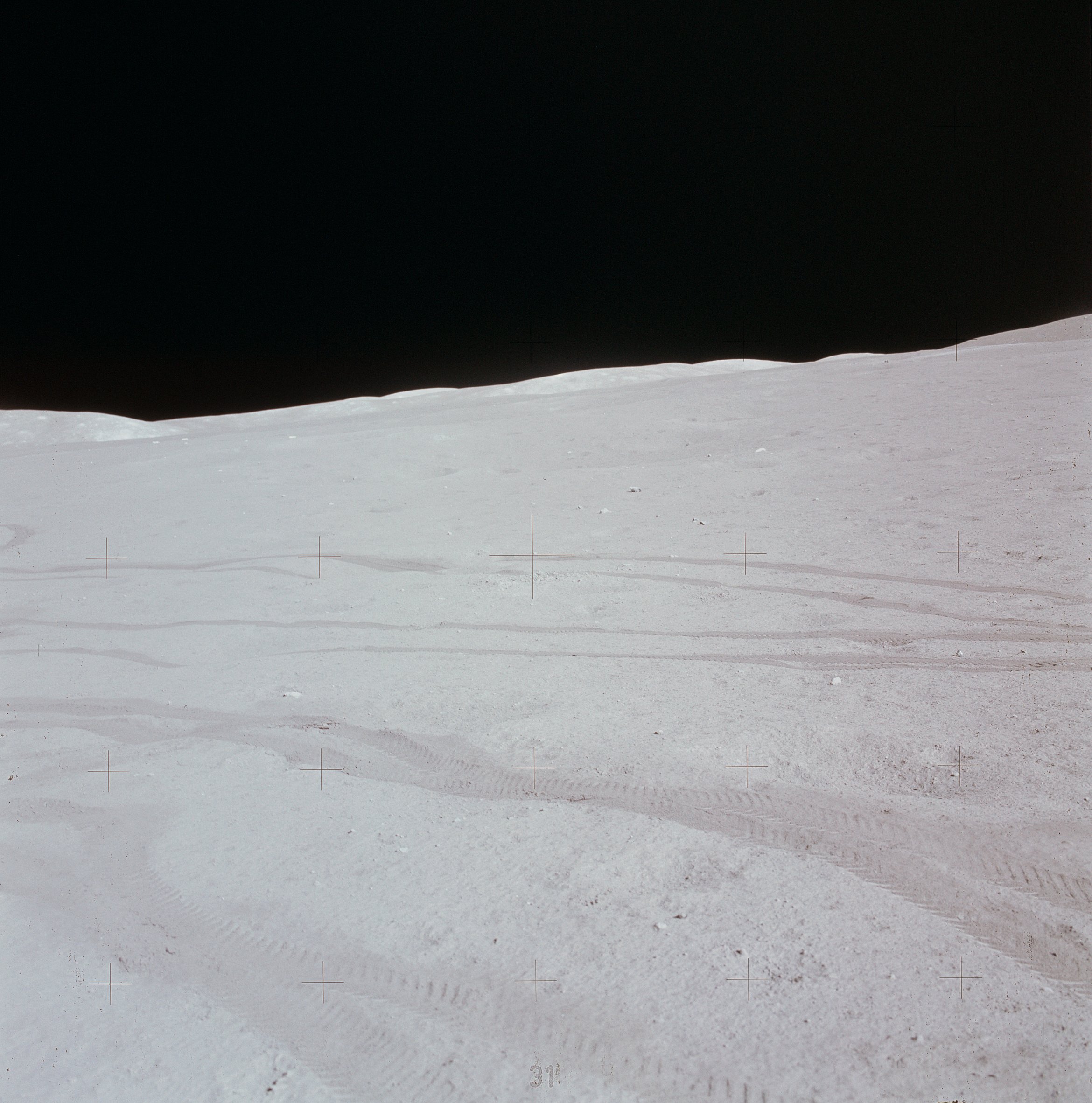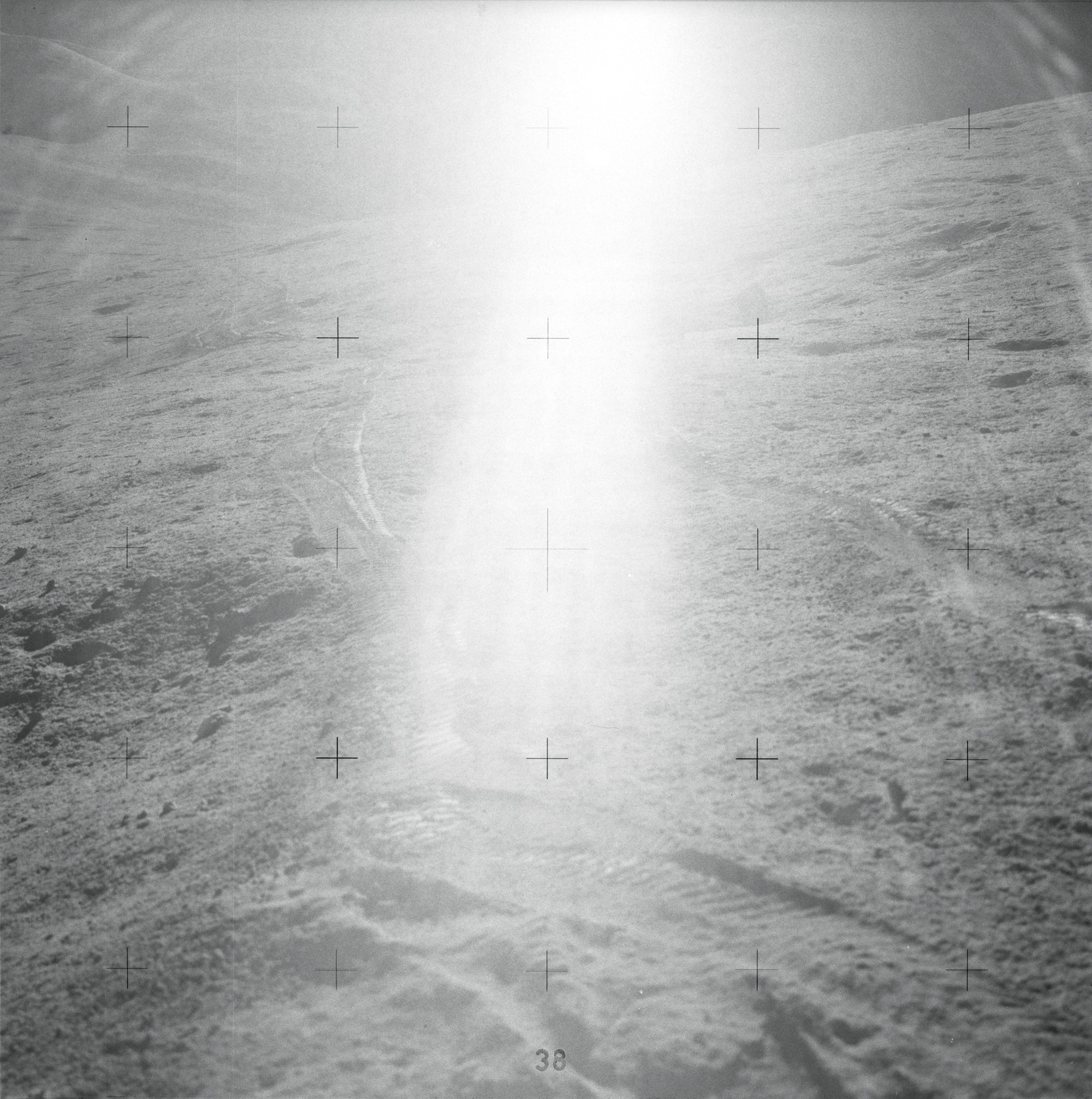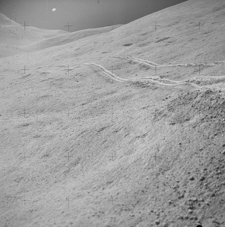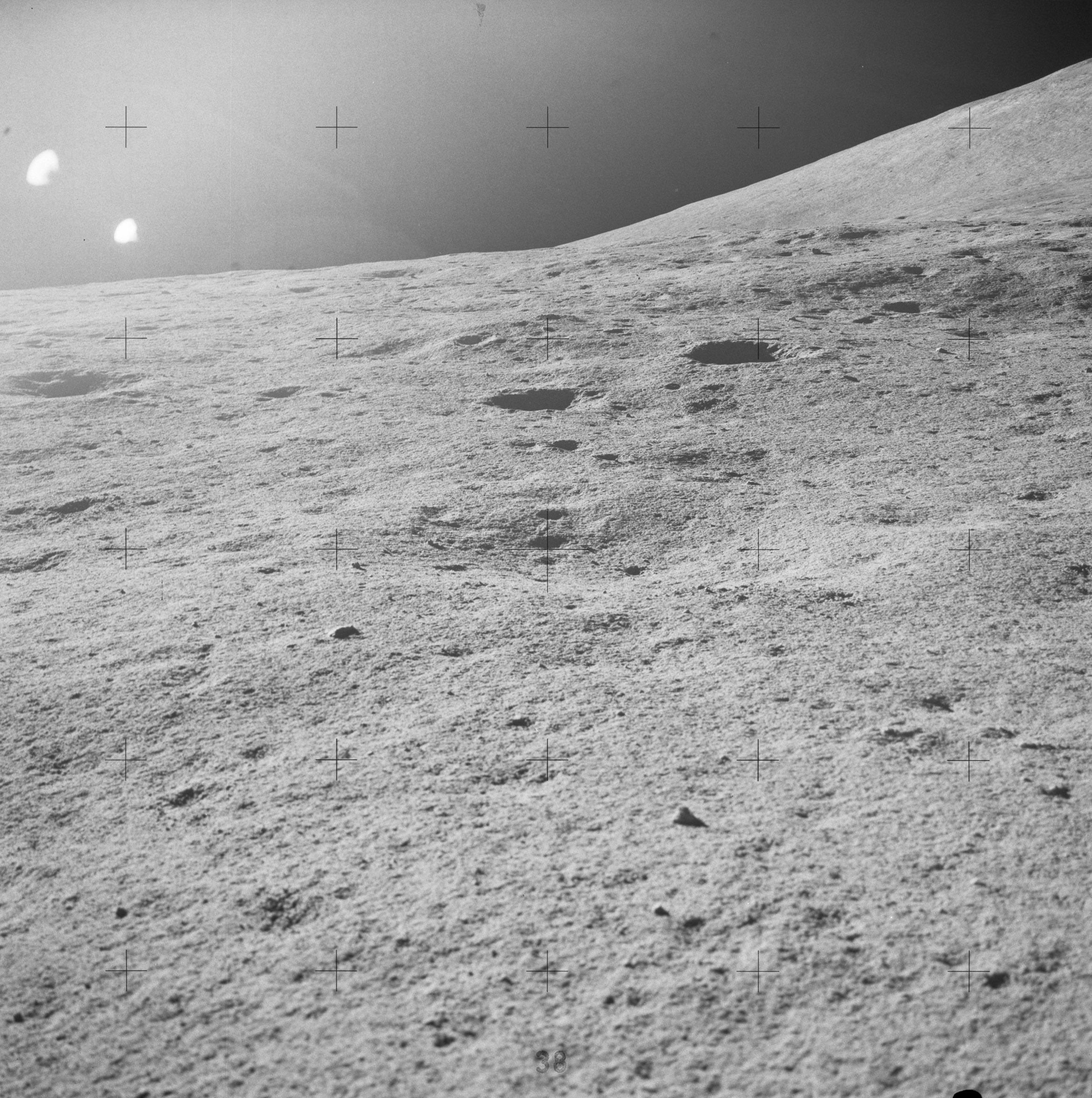 Stephen Tellier scanned a portion of Pan Camera frame 9798, which was taken during CSM Rev 38 at about 151:37. At that time, Dave and Jim were in the LM after the completion of EVA-2. A prominent feature of this image is the darkening of the soil around the LM and along a corridor extending from the LM toward 11 o'clock. See a comparison with frame 9377 by Markus Mehring, who has processed the images to account for differing orientations, different scales due to differing CSM-LM ranges, and different foreshortening due to differing CSM elevation angles. As Jack Schmitt discusses in the Apollo 17 commentary, the surface around the LM became brighter after being swept by the descent engine exhaust. As can be seen in photos taken on the surface, areas subsequently disturbed by the astronauts became relatively dark again. At locations relatively far from the LM, disturbed soil had the same brightness as undisturbed soil, another indication of brightening due to the engine exhaust.Rev. 50 Pan Camera 9809, North Detail ( 332k )