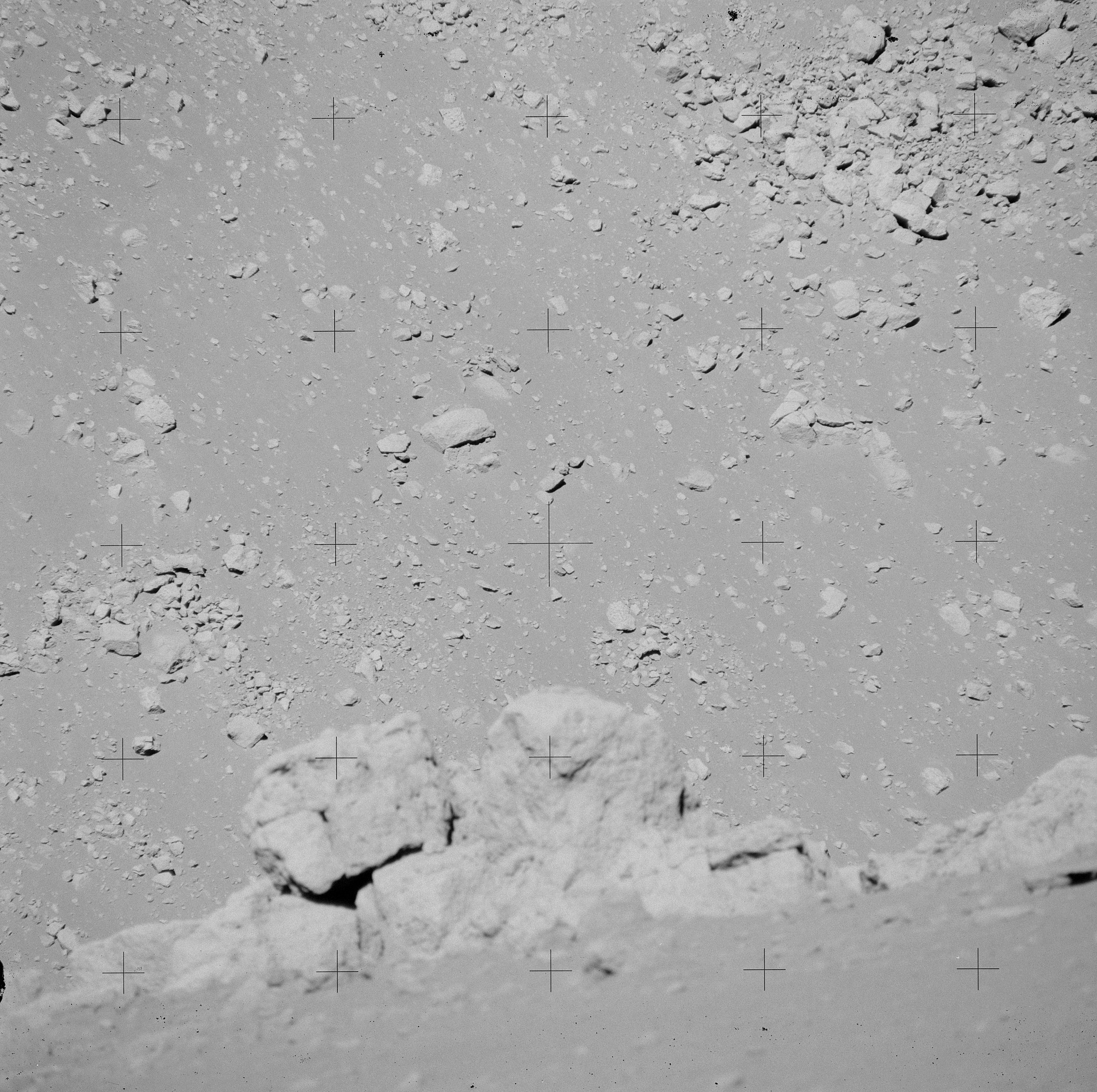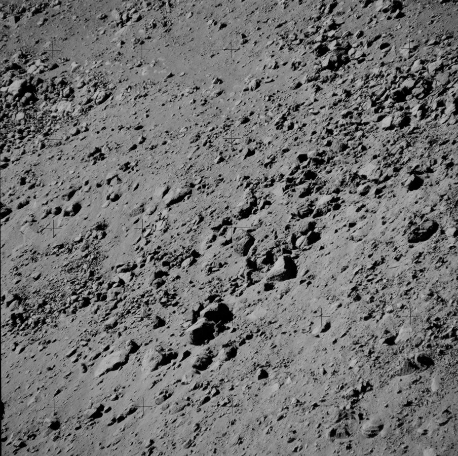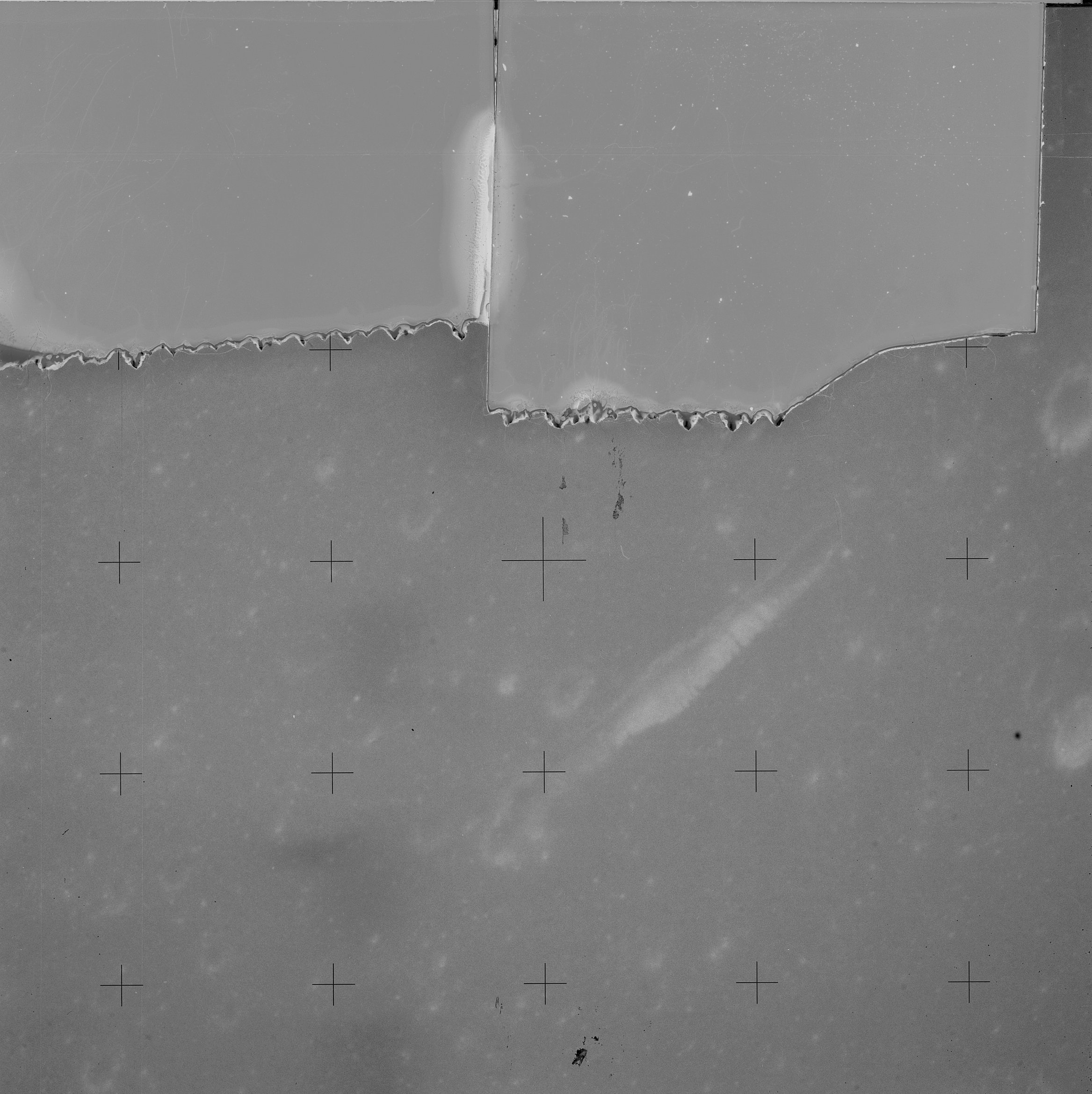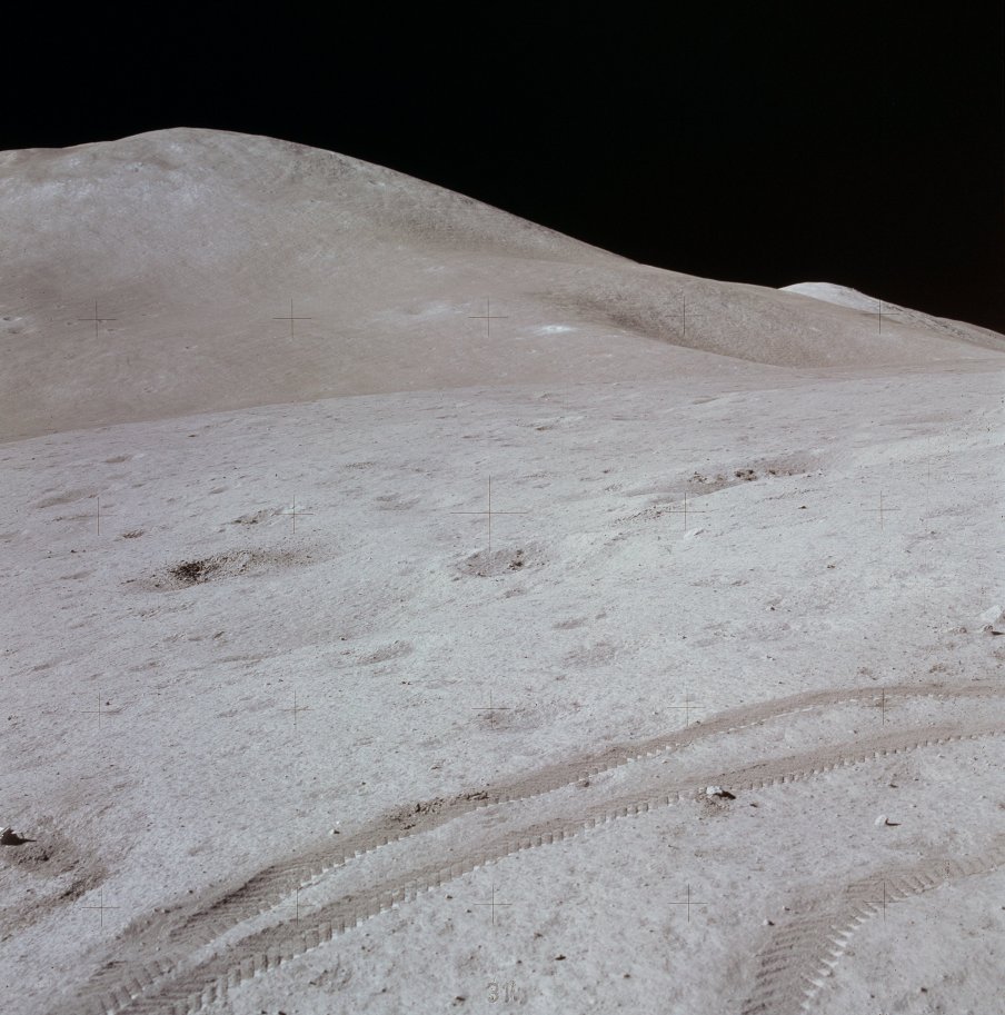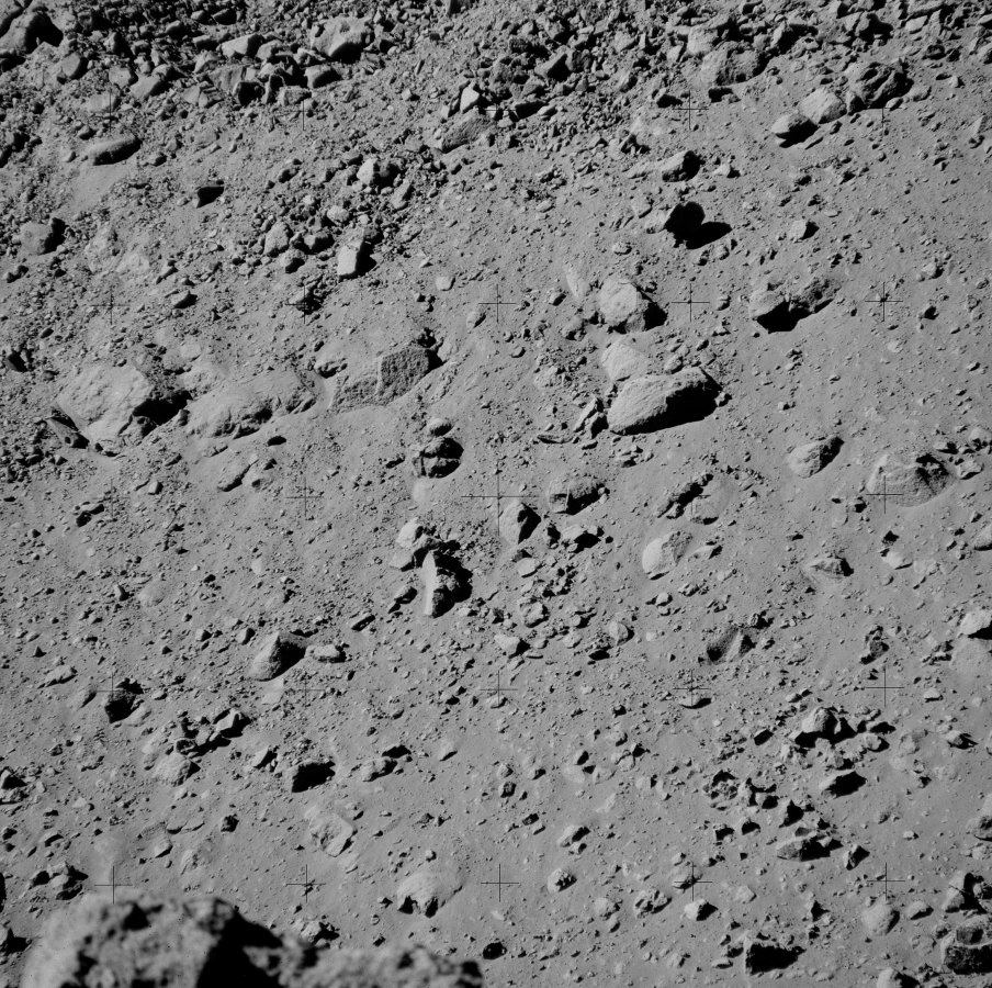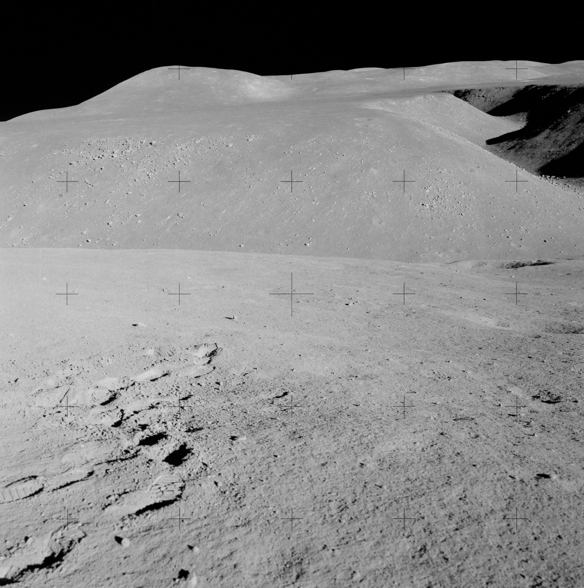Stephen Tellier scanned a portion of Pan Camera frame 9798, which was taken during CSM Rev 38 at about 151:37. At that time, Dave and Jim were in the LM after the completion of EVA-2. A prominent feature of this image is the darkening of the soil around the LM and along a corridor extending from the LM toward 11 o'clock. See a comparison with frame 9377 by Markus Mehring, who has processed the images to account for differing orientations, different scales due to differing CSM-LM ranges, and different foreshortening due to differing CSM elevation angles. As Jack Schmitt discusses in the Apollo 17 commentary, the surface around the LM became brighter after being swept by the descent engine exhaust. As can be seen in photos taken on the surface, areas subsequently disturbed by the astronauts became relatively dark again. At locations relatively far from the LM, disturbed soil had the same brightness as undisturbed soil, another indication of brightening due to the engine exhaust.Rev. 50 Pan Camera 9809, North Detail ( 332k )