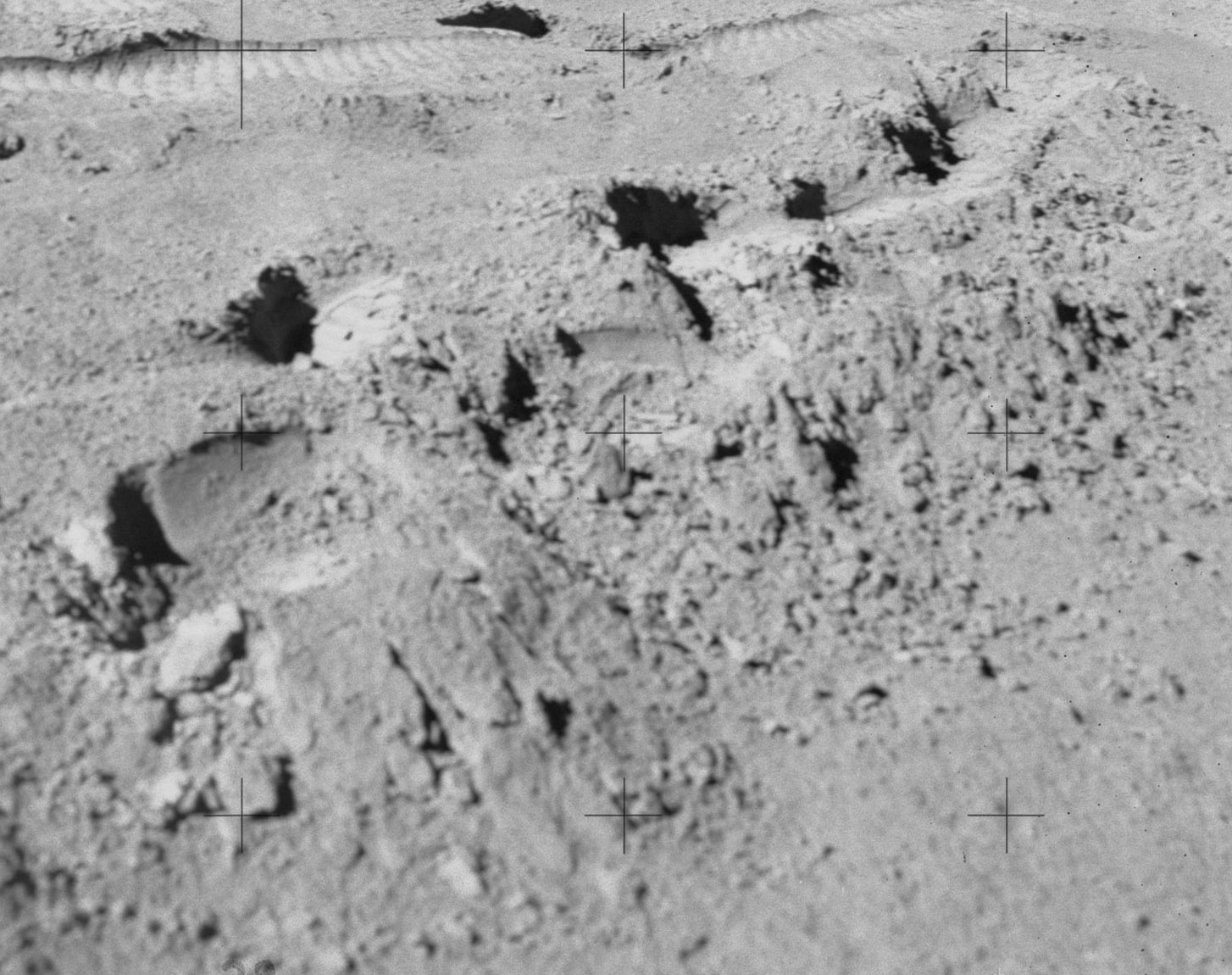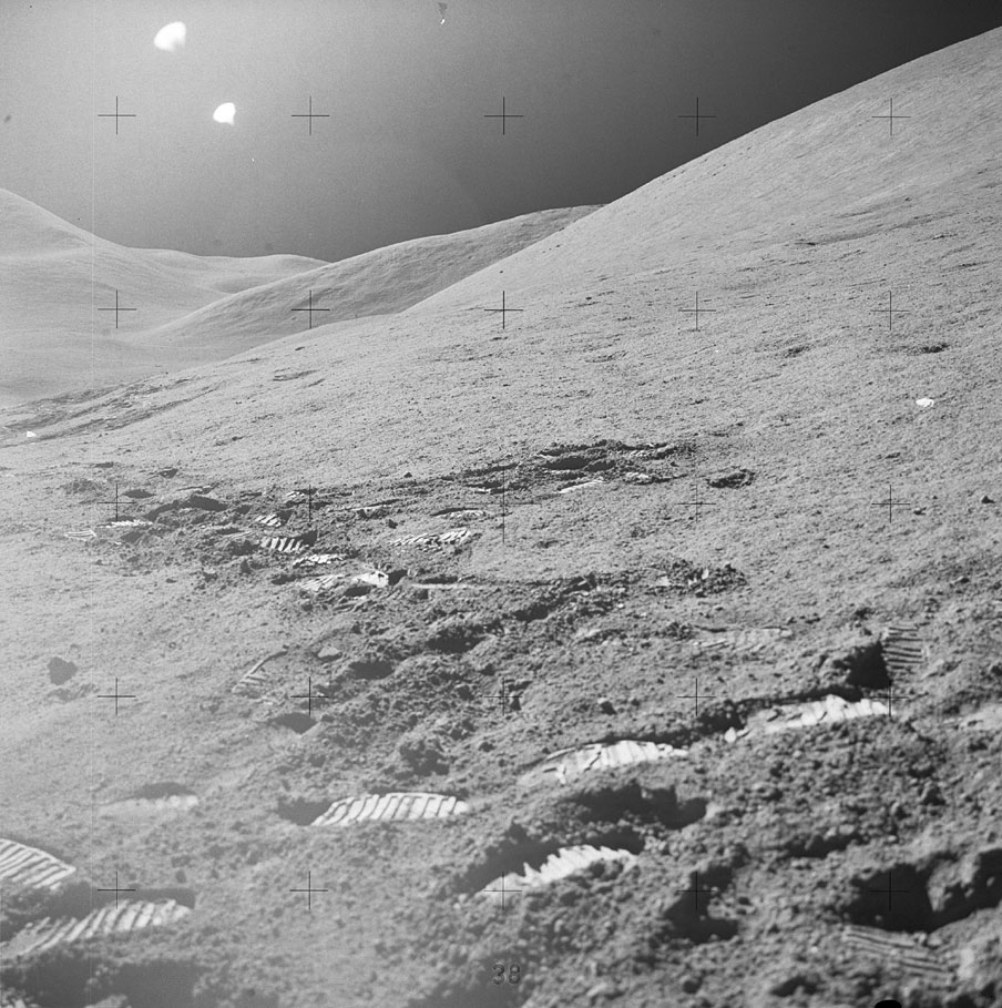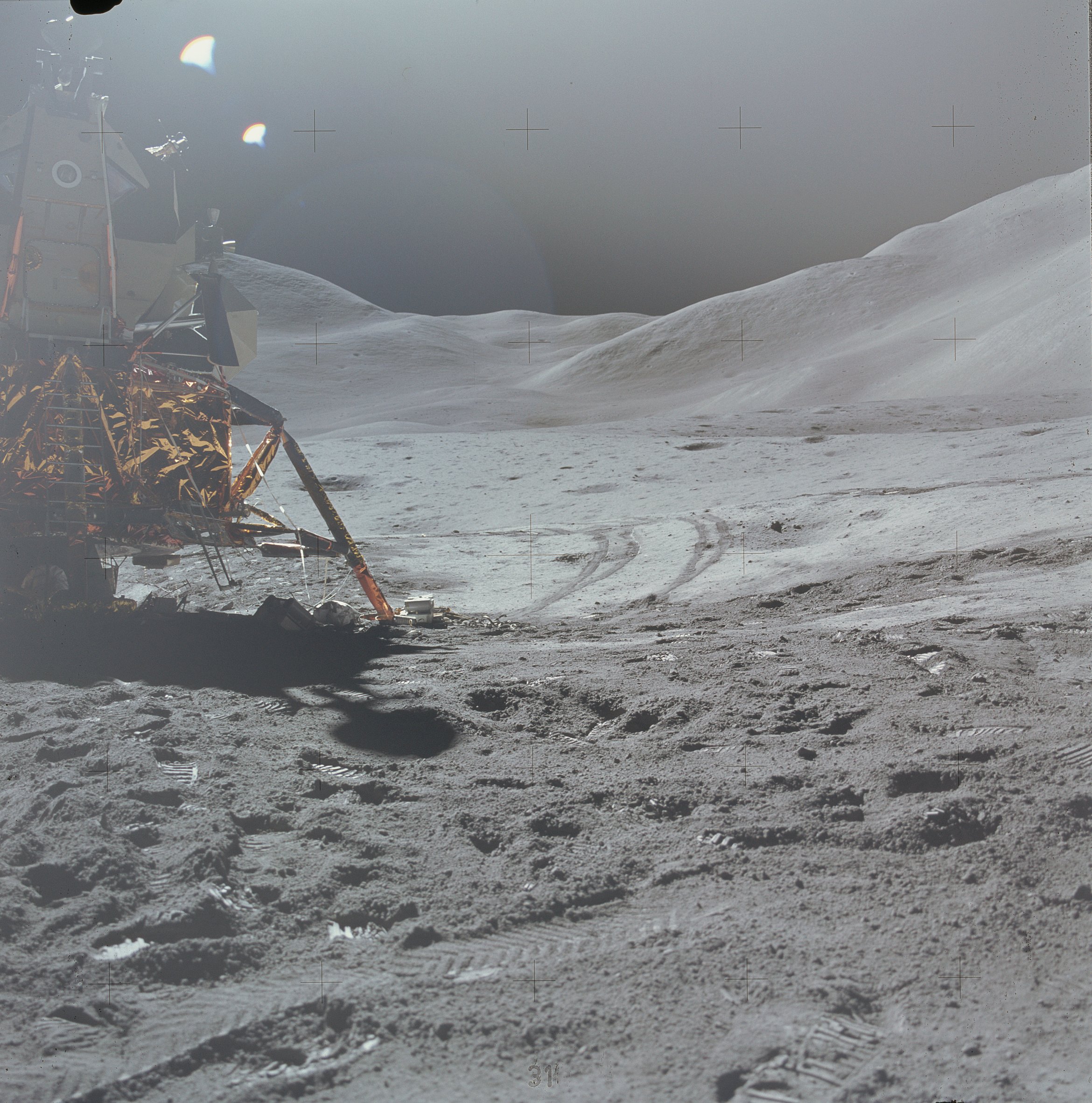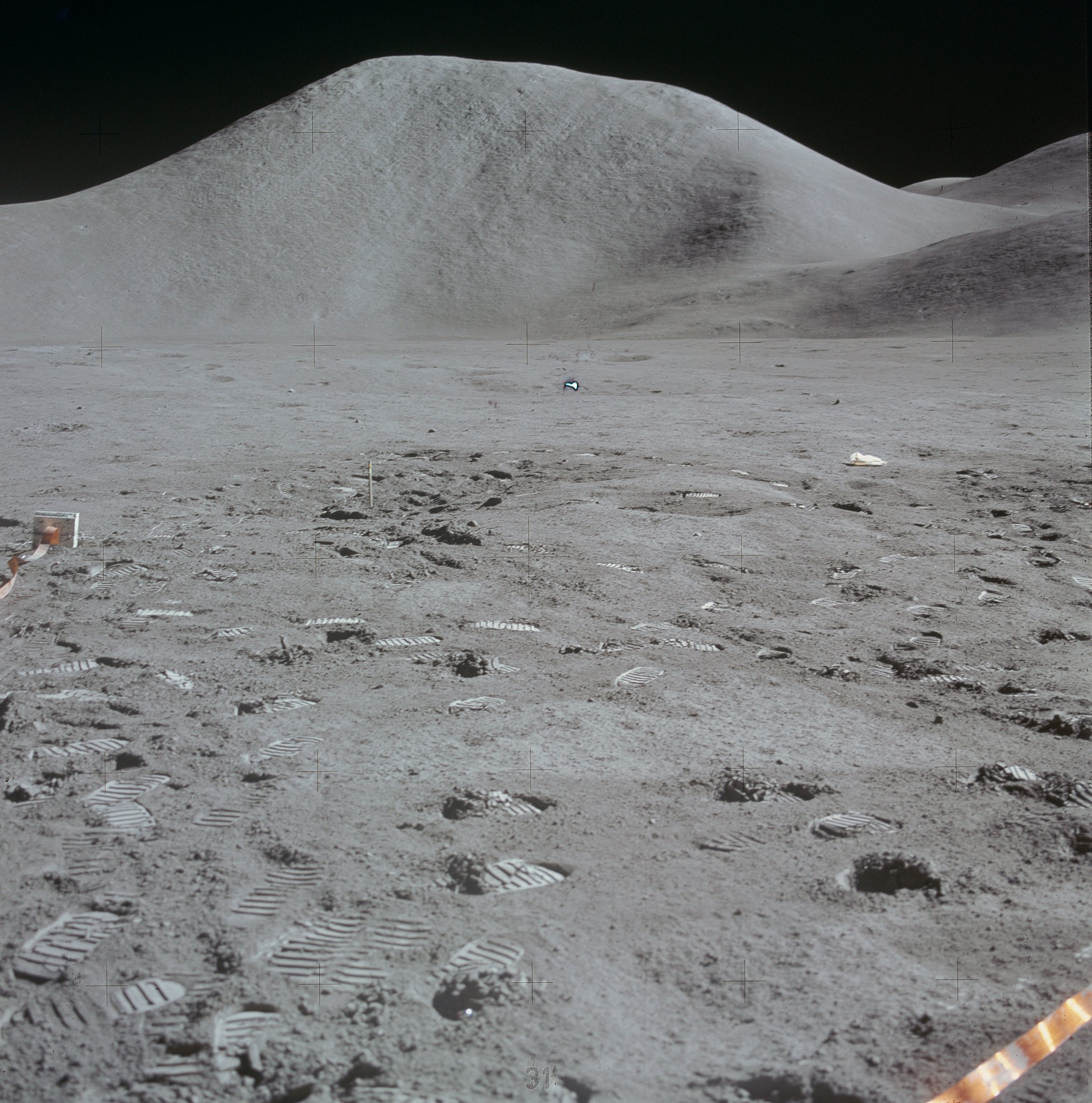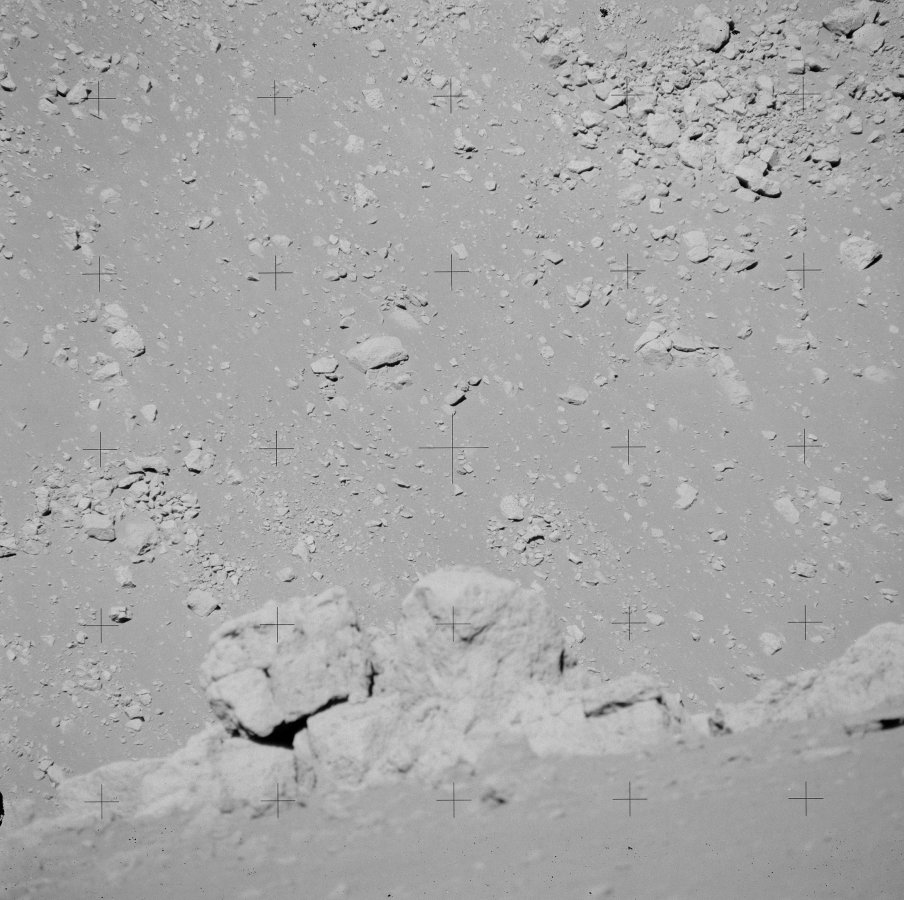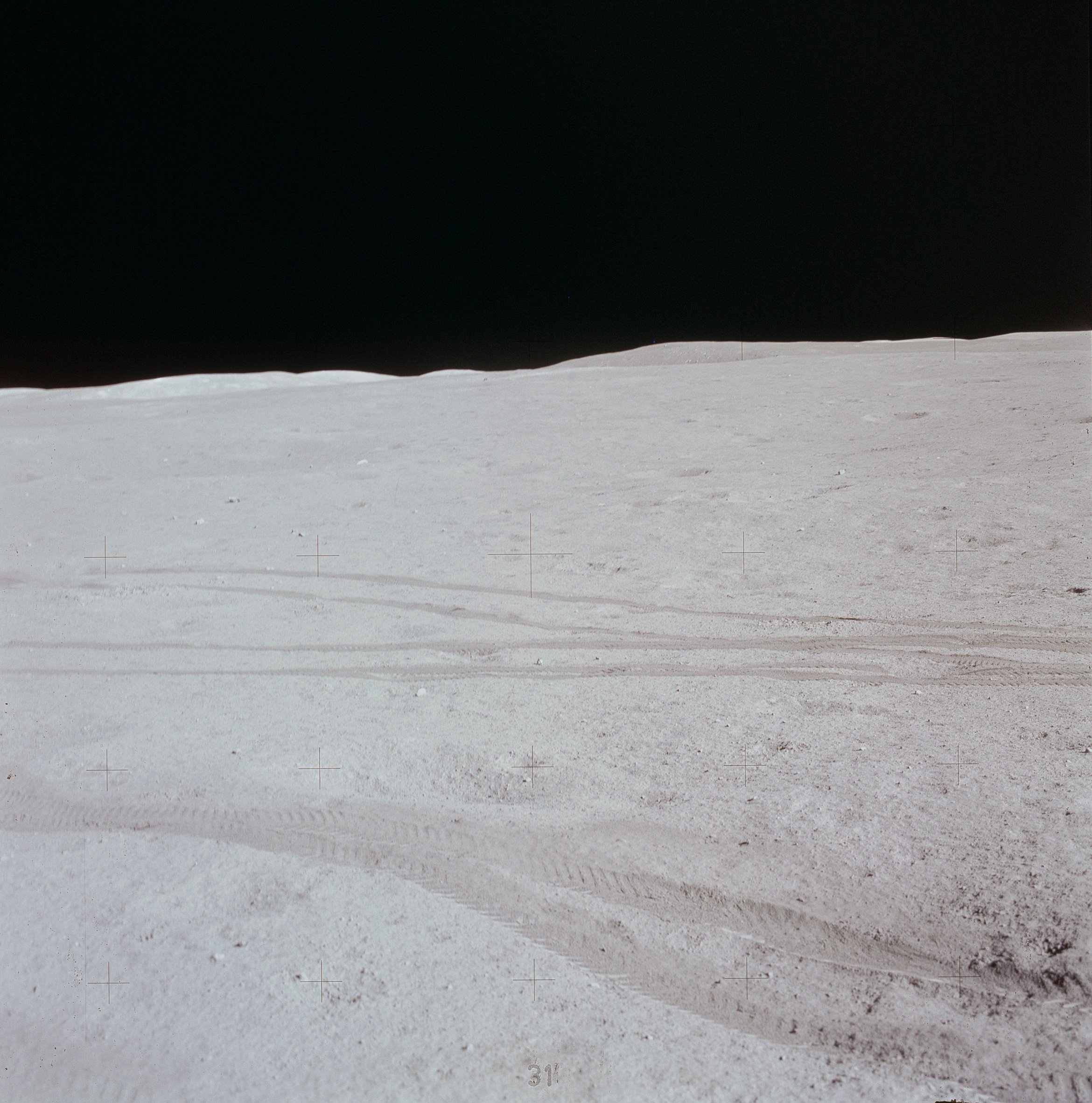 Stephen Tellier scanned a portion of Pan Camera frame 9798, which was taken during CSM Rev 38 at about 151:37. At that time, Dave and Jim were in the LM after the completion of EVA-2. A prominent feature of this image is the darkening of the soil around the LM and along a corridor extending from the LM toward 11 o'clock. See a comparison with frame 9377 by Markus Mehring, who has processed the images to account for differing orientations, different scales due to differing CSM-LM ranges, and different foreshortening due to differing CSM elevation angles. As Jack Schmitt discusses in the Apollo 17 commentary, the surface around the LM became brighter after being swept by the descent engine exhaust. As can be seen in photos taken on the surface, areas subsequently disturbed by the astronauts became relatively dark again. At locations relatively far from the LM, disturbed soil had the same brightness as undisturbed soil, another indication of brightening due to the engine exhaust.Rev. 50 Pan Camera 9809, North Detail ( 332k )