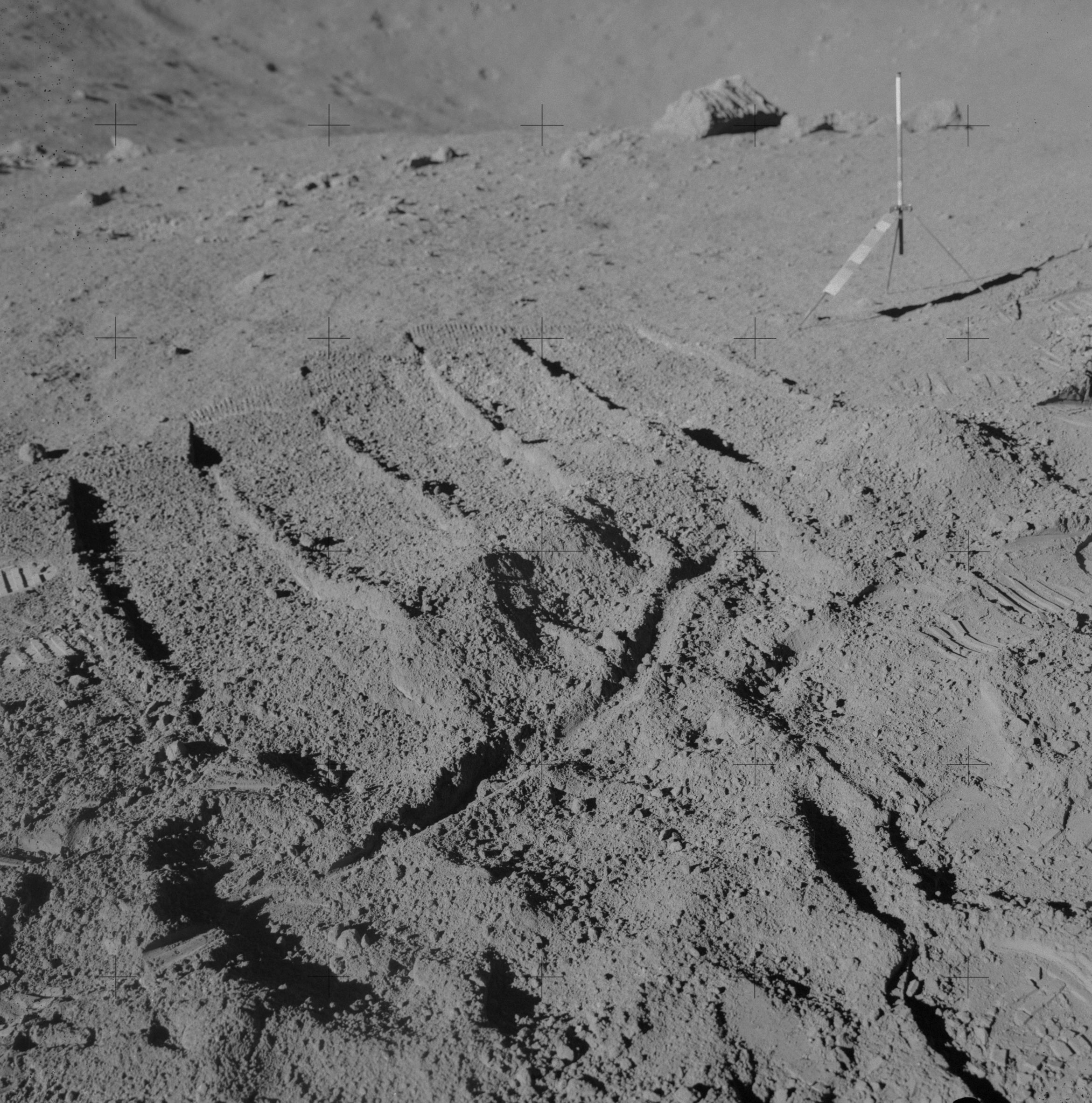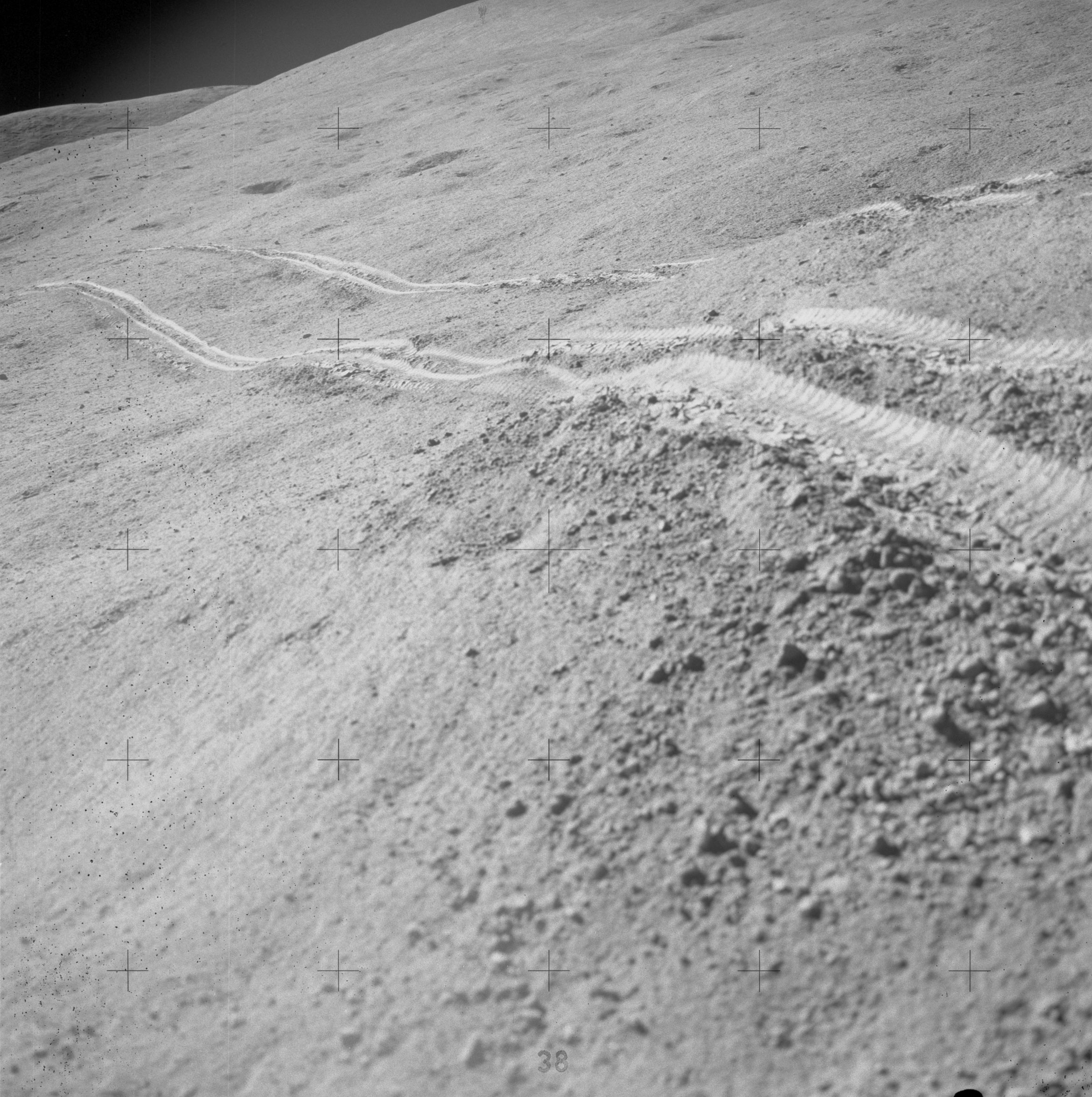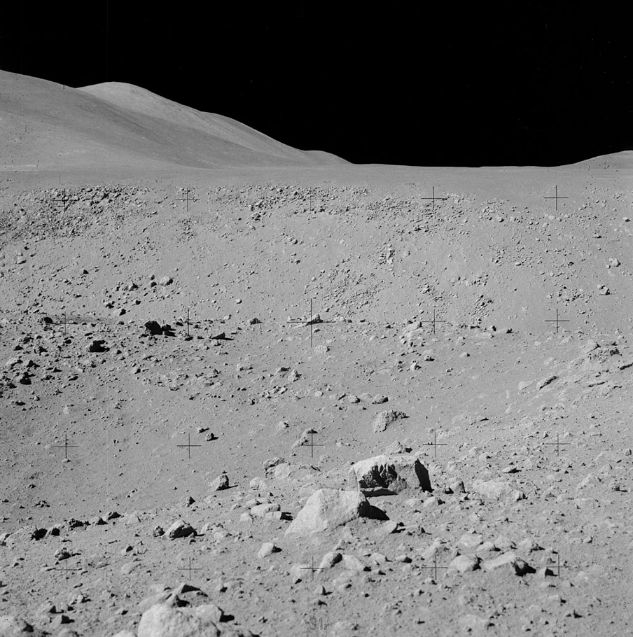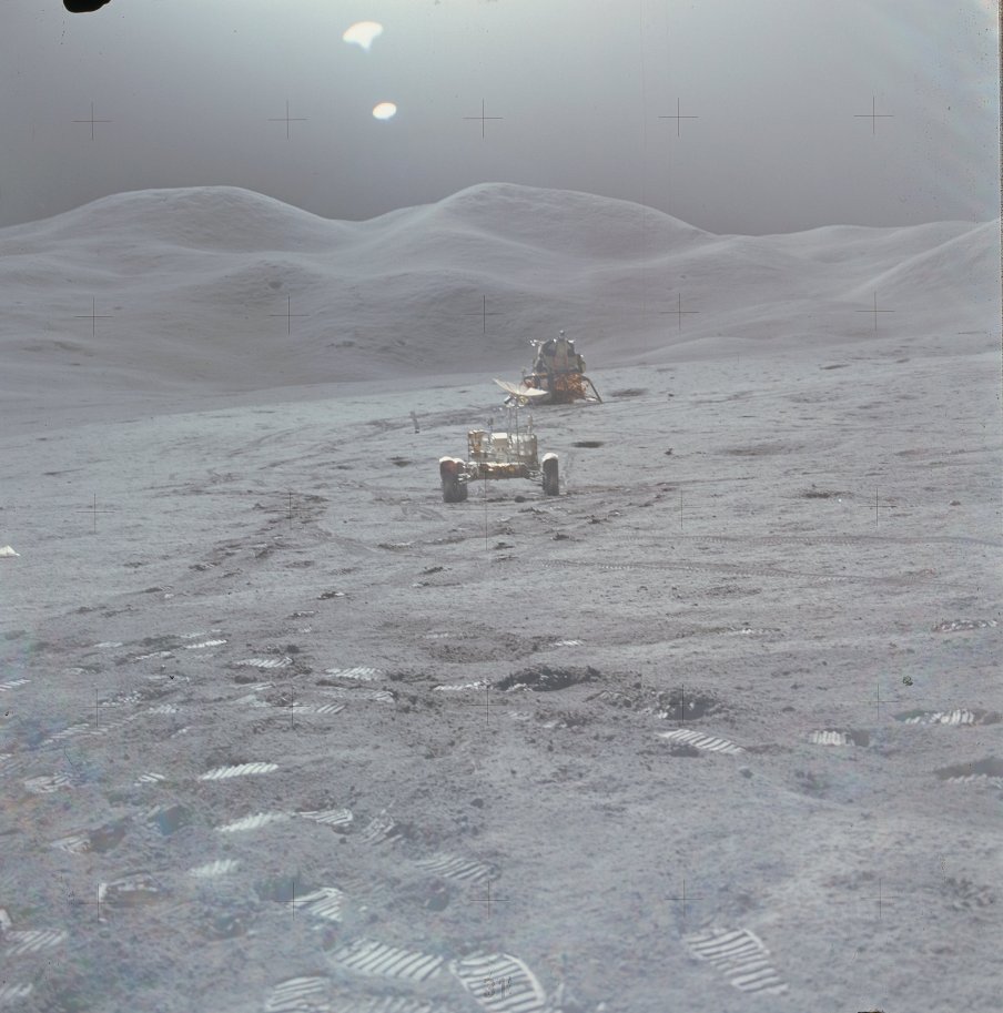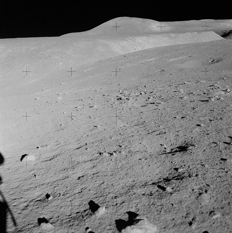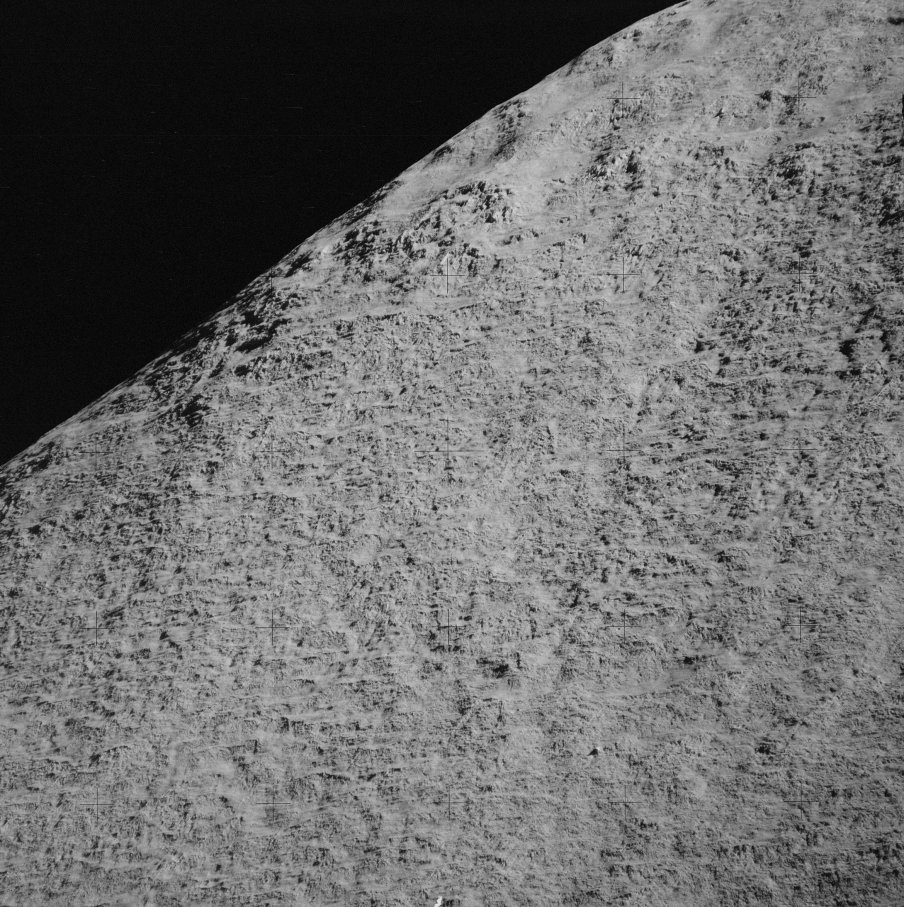 Stephen Tellier scanned a portion of Pan Camera frame 9798, which was taken during CSM Rev 38 at about 151:37. At that time, Dave and Jim were in the LM after the completion of EVA-2. A prominent feature of this image is the darkening of the soil around the LM and along a corridor extending from the LM toward 11 o'clock. See a comparison with frame 9377 by Markus Mehring, who has processed the images to account for differing orientations, different scales due to differing CSM-LM ranges, and different foreshortening due to differing CSM elevation angles. As Jack Schmitt discusses in the Apollo 17 commentary, the surface around the LM became brighter after being swept by the descent engine exhaust. As can be seen in photos taken on the surface, areas subsequently disturbed by the astronauts became relatively dark again. At locations relatively far from the LM, disturbed soil had the same brightness as undisturbed soil, another indication of brightening due to the engine exhaust.Rev. 50 Pan Camera 9809, North Detail ( 332k )