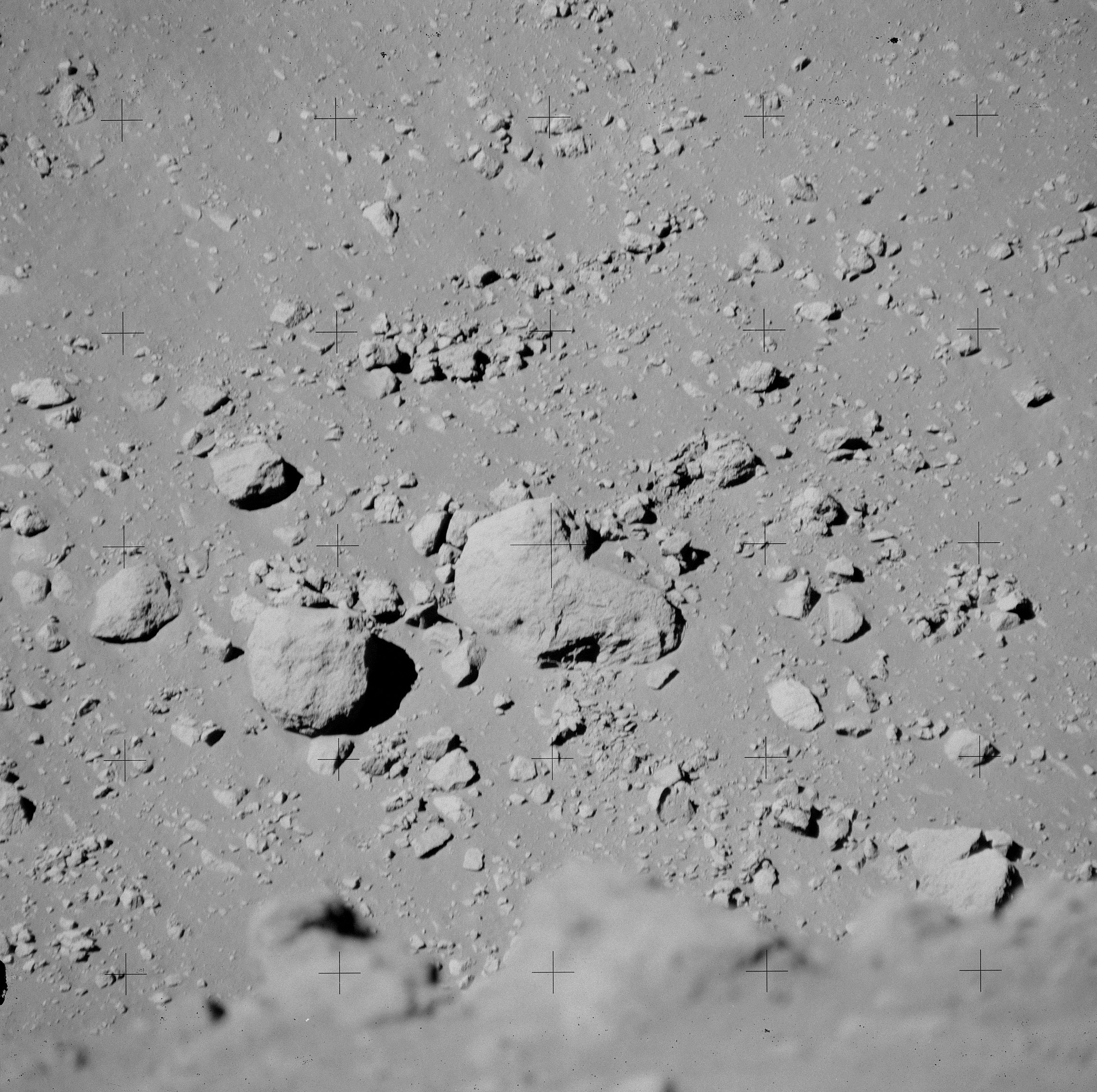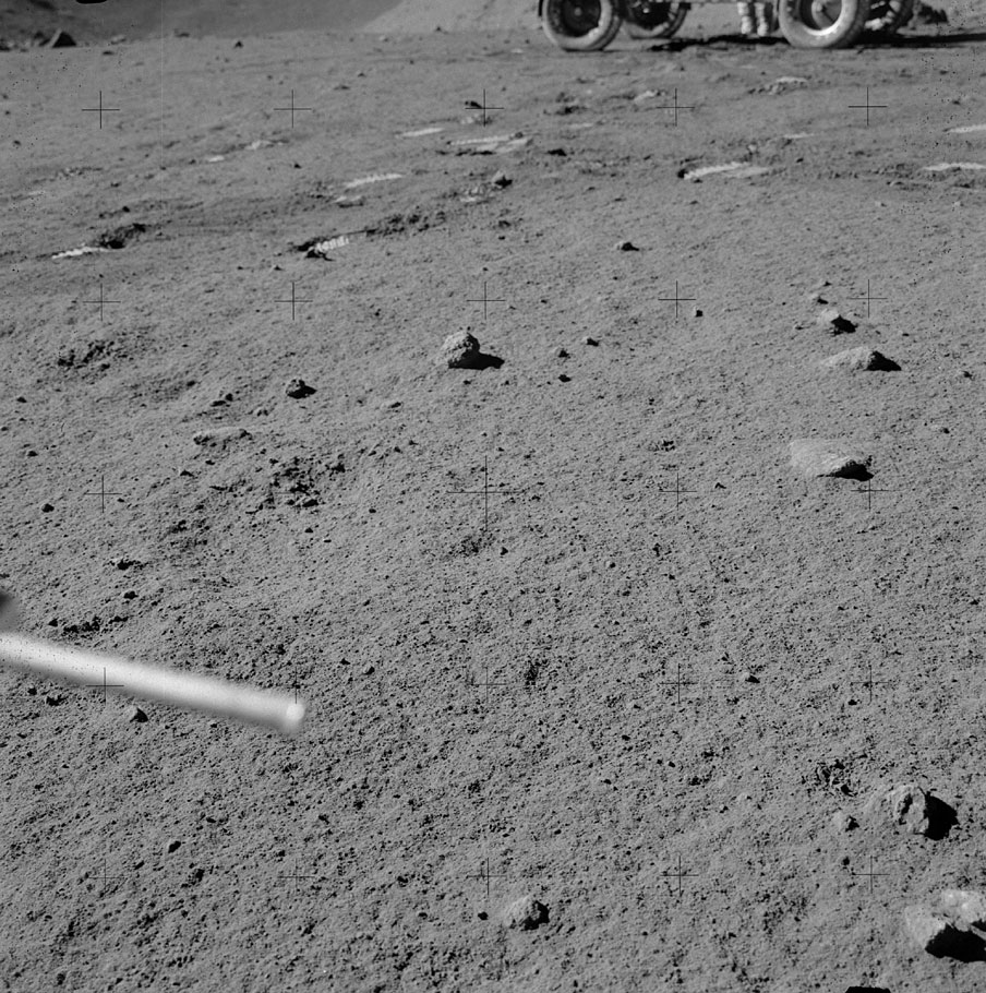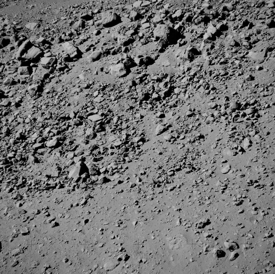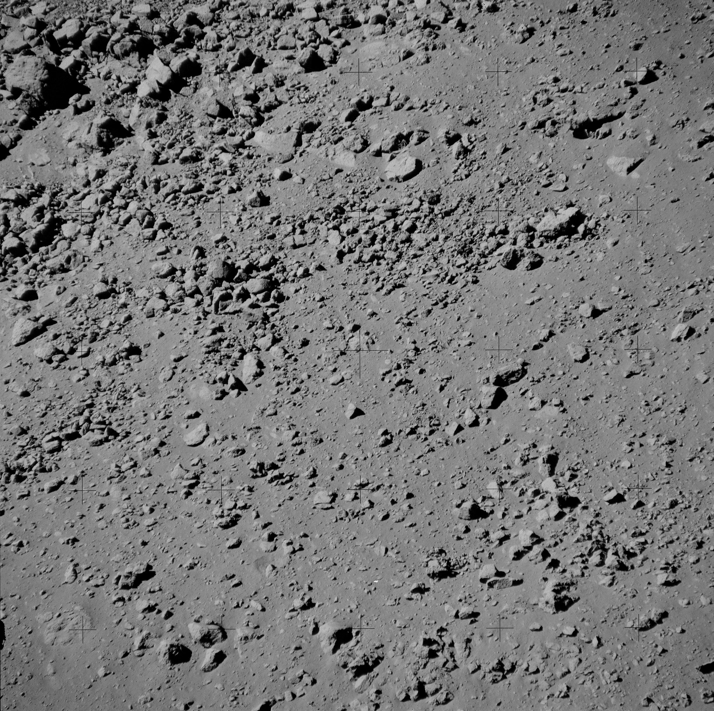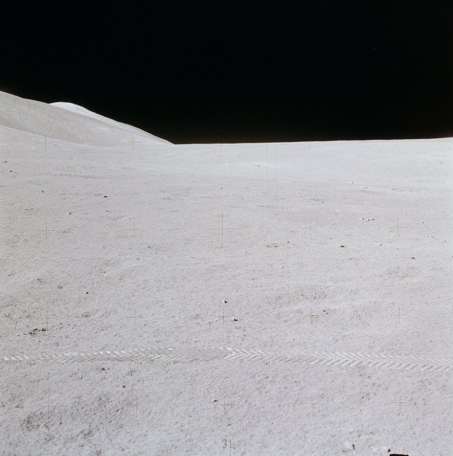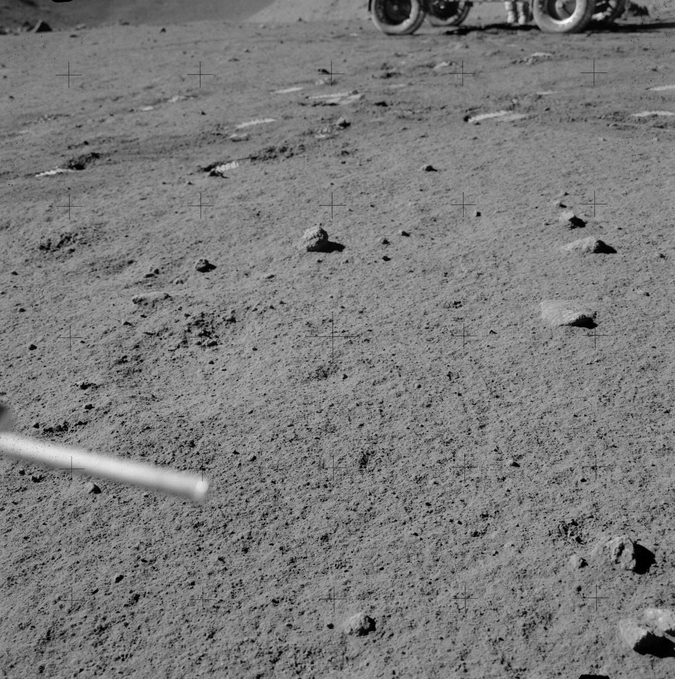 Stephen Tellier scanned a portion of Pan Camera frame 9798, which was taken during CSM Rev 38 at about 151:37. At that time, Dave and Jim were in the LM after the completion of EVA-2. A prominent feature of this image is the darkening of the soil around the LM and along a corridor extending from the LM toward 11 o'clock. See a comparison with frame 9377 by Markus Mehring, who has processed the images to account for differing orientations, different scales due to differing CSM-LM ranges, and different foreshortening due to differing CSM elevation angles. As Jack Schmitt discusses in the Apollo 17 commentary, the surface around the LM became brighter after being swept by the descent engine exhaust. As can be seen in photos taken on the surface, areas subsequently disturbed by the astronauts became relatively dark again. At locations relatively far from the LM, disturbed soil had the same brightness as undisturbed soil, another indication of brightening due to the engine exhaust.Rev. 50 Pan Camera 9809, North Detail ( 332k )