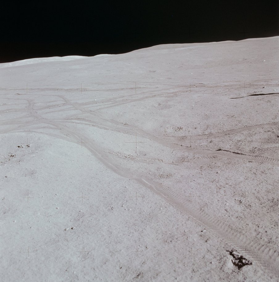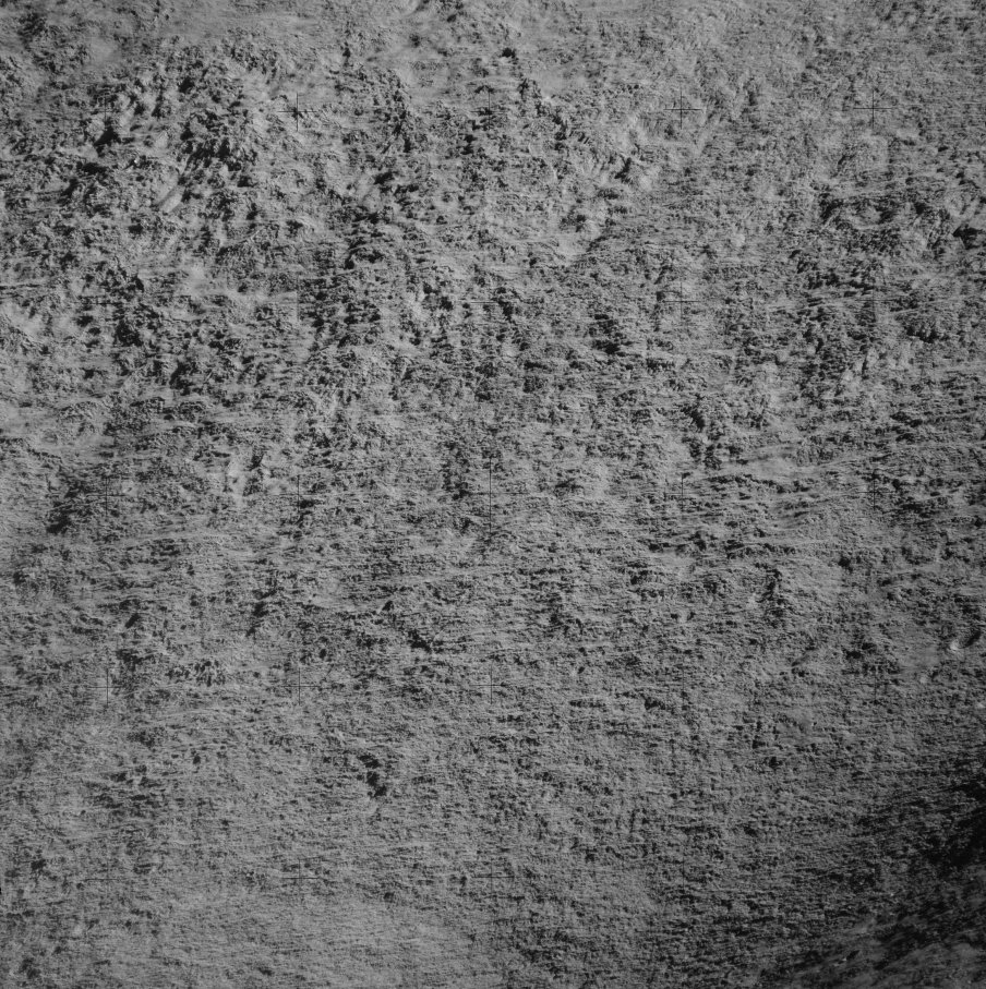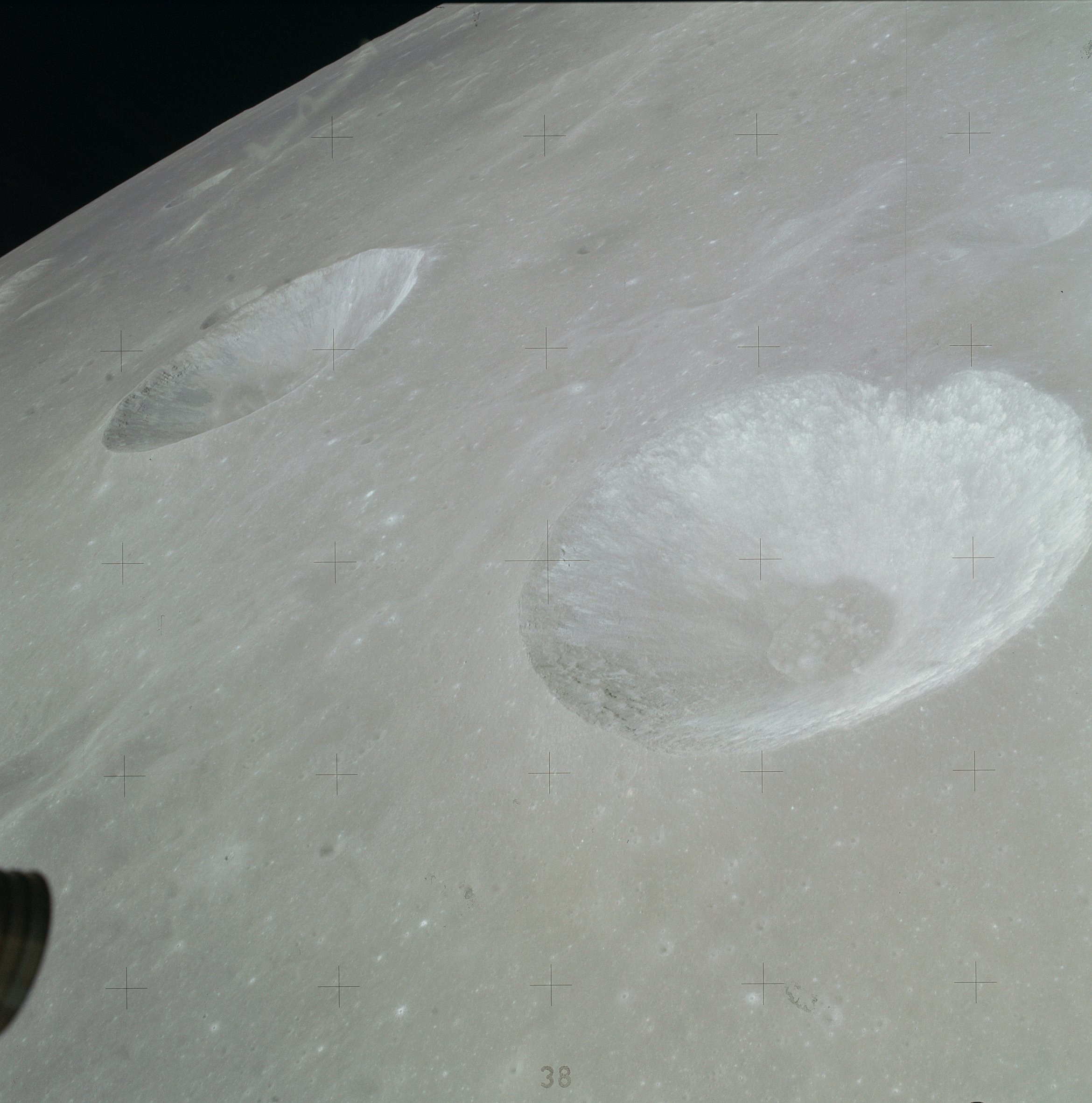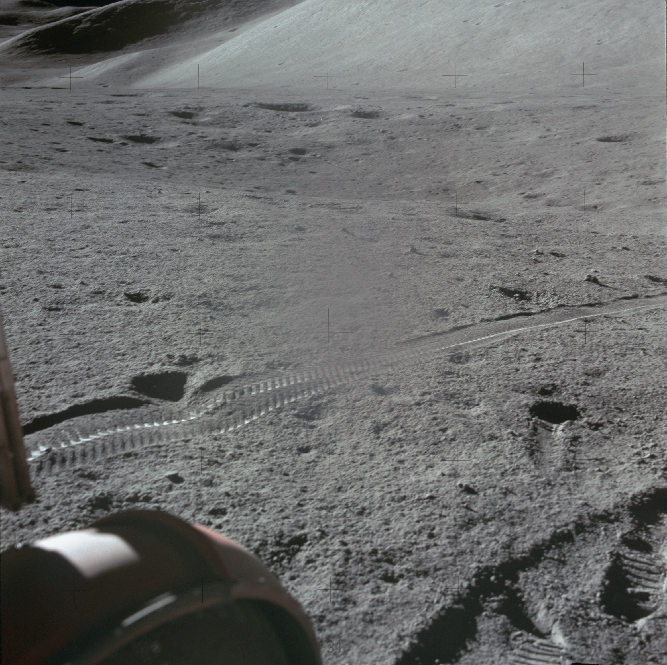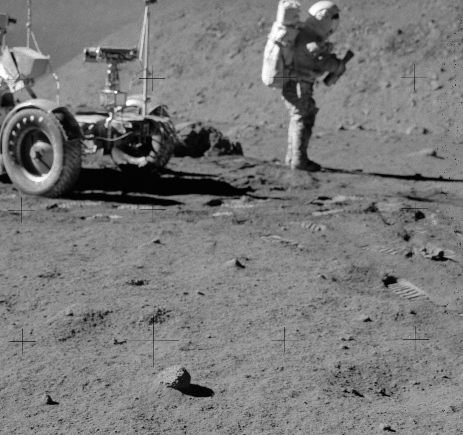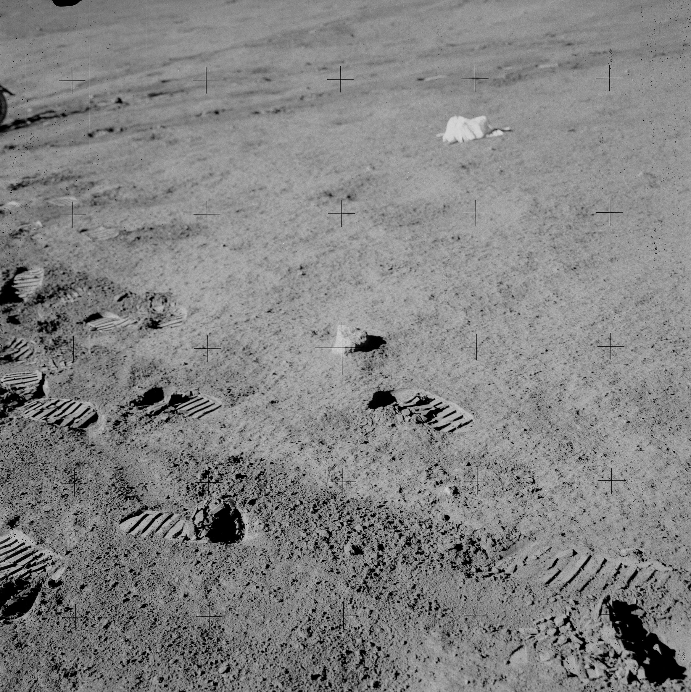 Stephen Tellier scanned a portion of Pan Camera frame 9798, which was taken during CSM Rev 38 at about 151:37. At that time, Dave and Jim were in the LM after the completion of EVA-2. A prominent feature of this image is the darkening of the soil around the LM and along a corridor extending from the LM toward 11 o'clock. See a comparison with frame 9377 by Markus Mehring, who has processed the images to account for differing orientations, different scales due to differing CSM-LM ranges, and different foreshortening due to differing CSM elevation angles. As Jack Schmitt discusses in the Apollo 17 commentary, the surface around the LM became brighter after being swept by the descent engine exhaust. As can be seen in photos taken on the surface, areas subsequently disturbed by the astronauts became relatively dark again. At locations relatively far from the LM, disturbed soil had the same brightness as undisturbed soil, another indication of brightening due to the engine exhaust.Rev. 50 Pan Camera 9809, North Detail ( 332k )