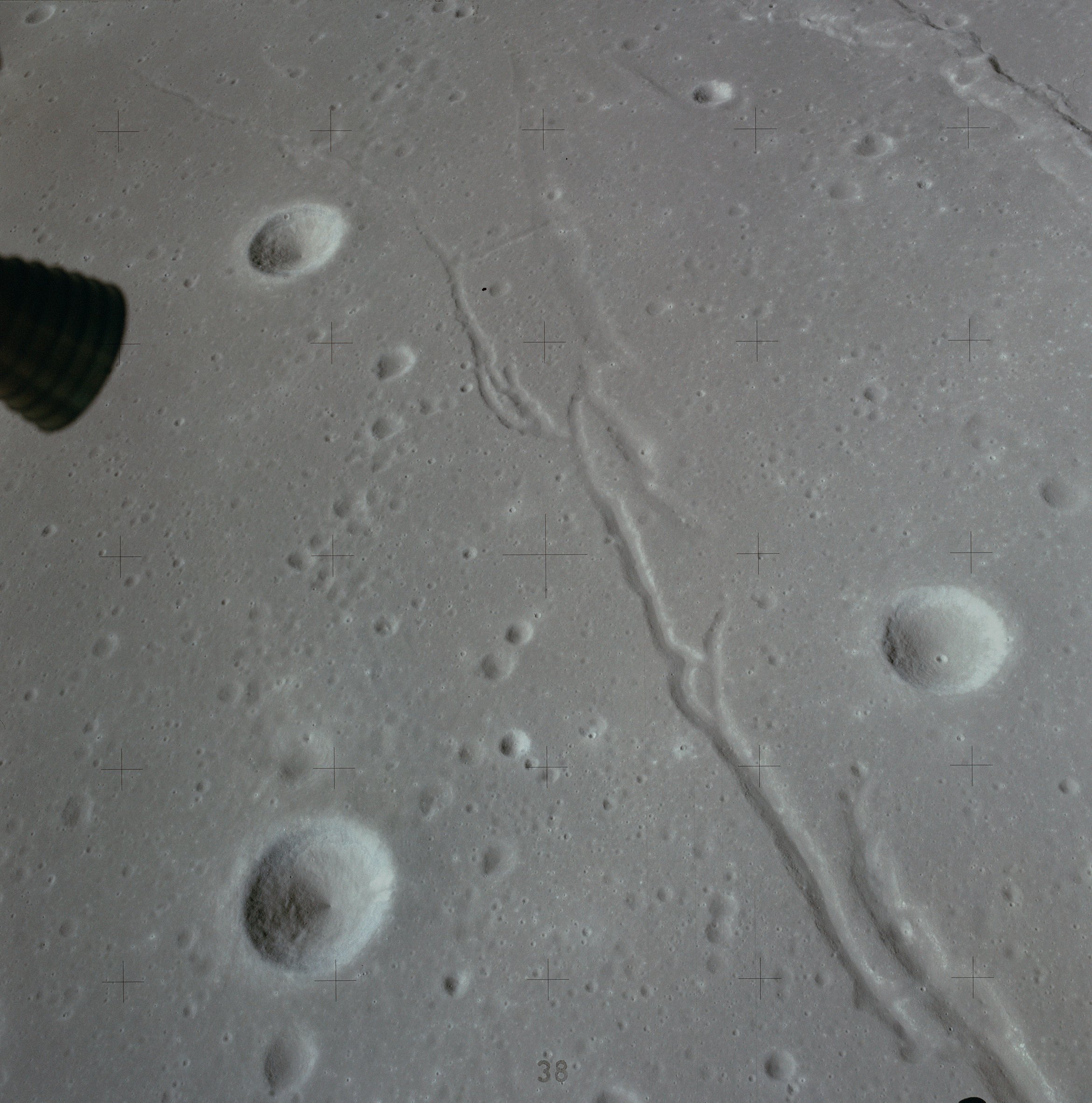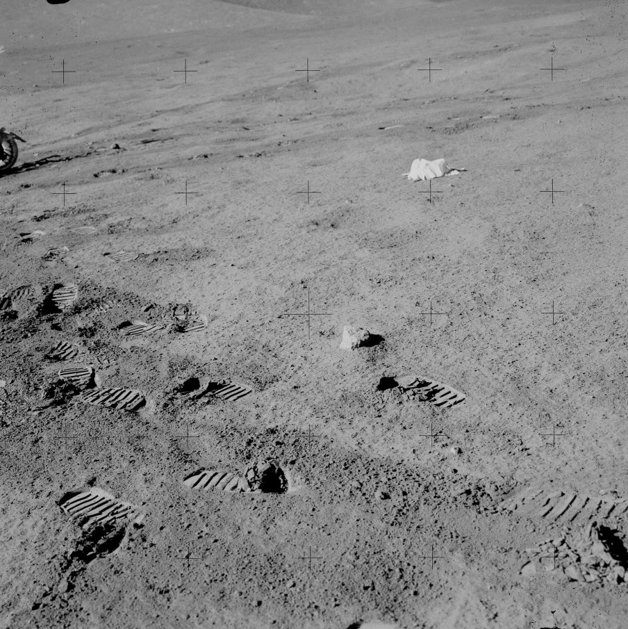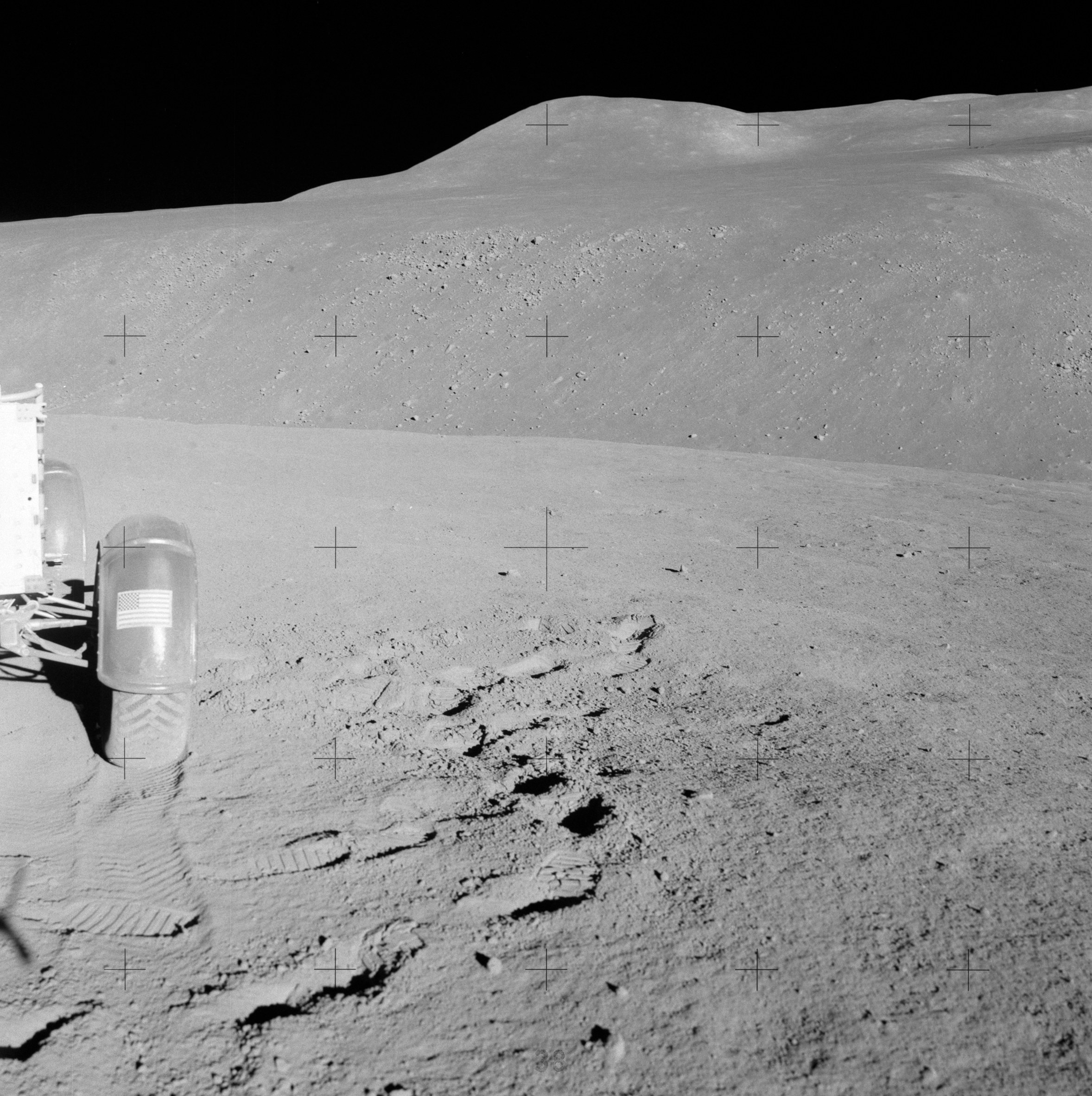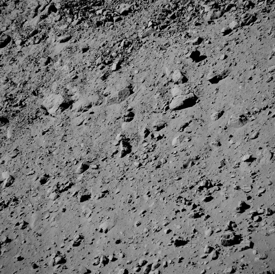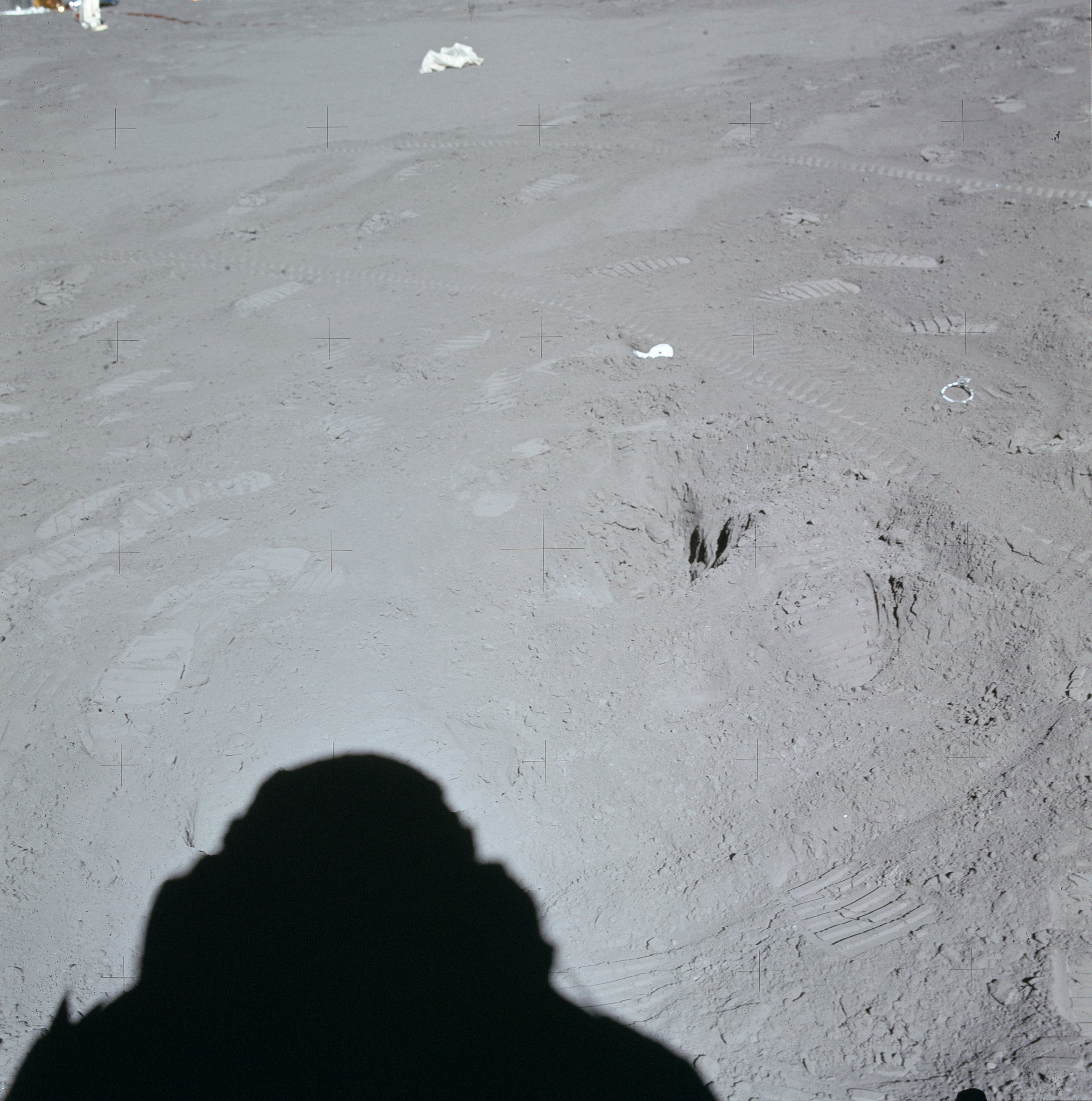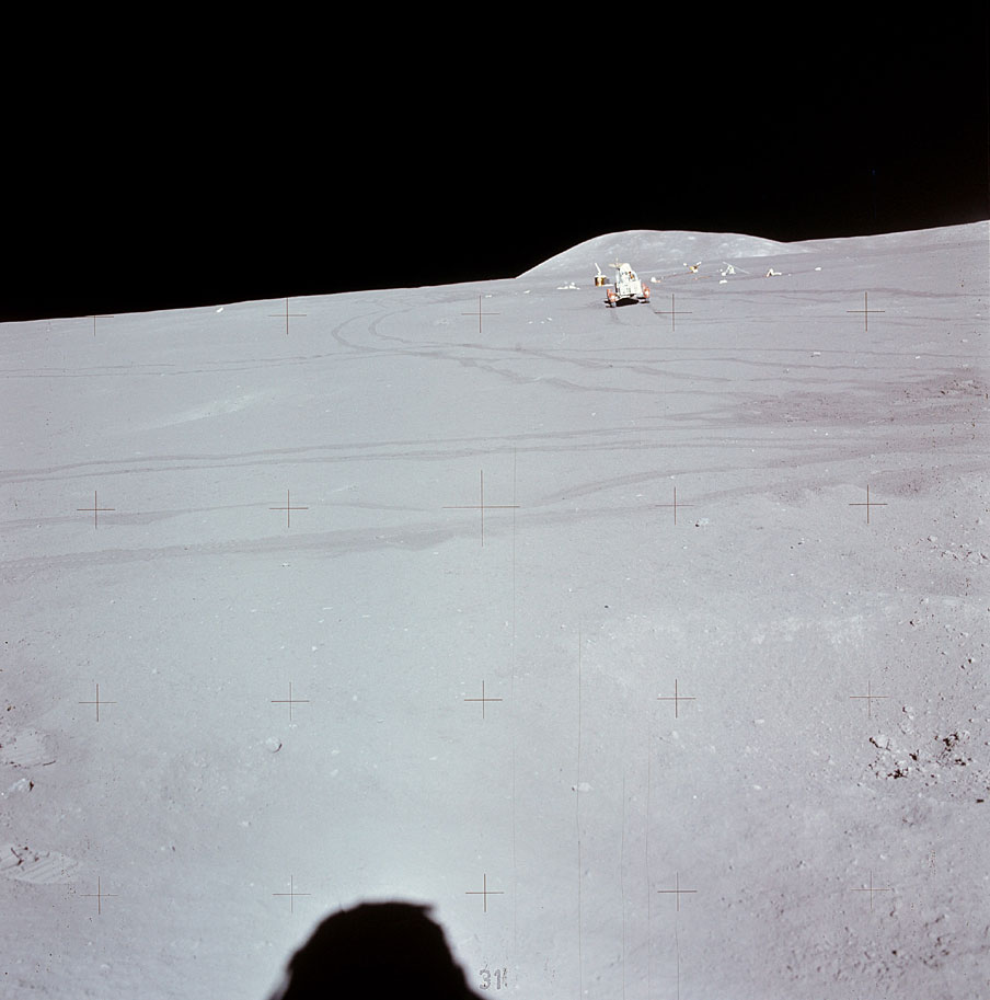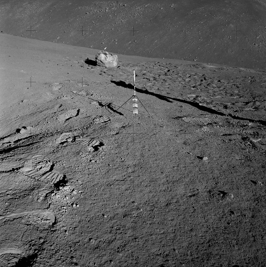 Stephen Tellier scanned a portion of Pan Camera frame 9798, which was taken during CSM Rev 38 at about 151:37. At that time, Dave and Jim were in the LM after the completion of EVA-2. A prominent feature of this image is the darkening of the soil around the LM and along a corridor extending from the LM toward 11 o'clock. See a comparison with frame 9377 by Markus Mehring, who has processed the images to account for differing orientations, different scales due to differing CSM-LM ranges, and different foreshortening due to differing CSM elevation angles. As Jack Schmitt discusses in the Apollo 17 commentary, the surface around the LM became brighter after being swept by the descent engine exhaust. As can be seen in photos taken on the surface, areas subsequently disturbed by the astronauts became relatively dark again. At locations relatively far from the LM, disturbed soil had the same brightness as undisturbed soil, another indication of brightening due to the engine exhaust.Rev. 50 Pan Camera 9809, North Detail ( 332k )