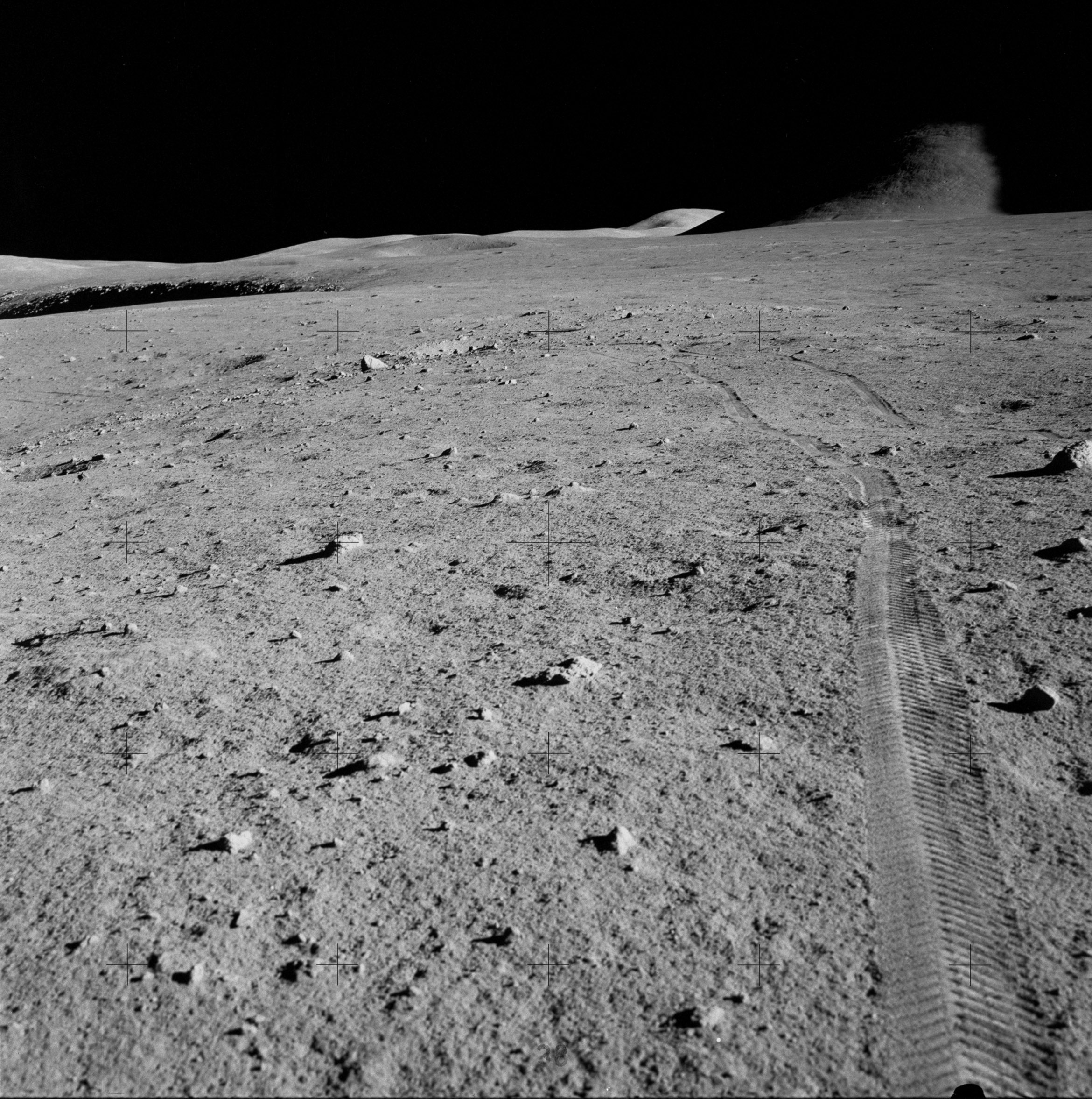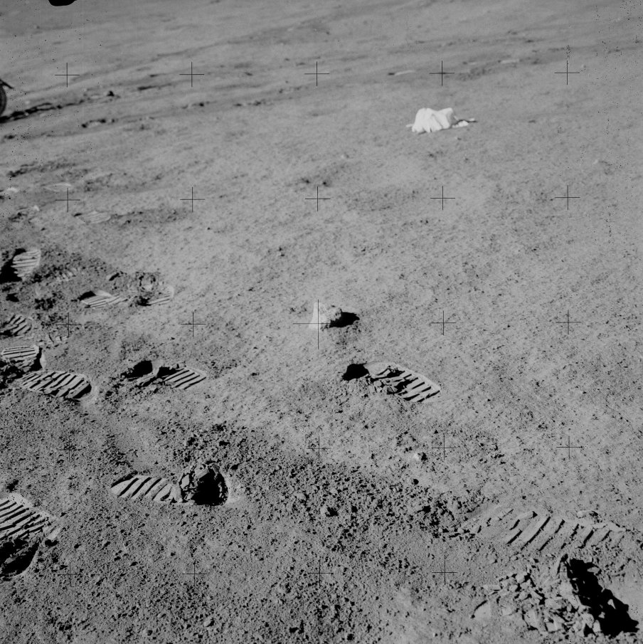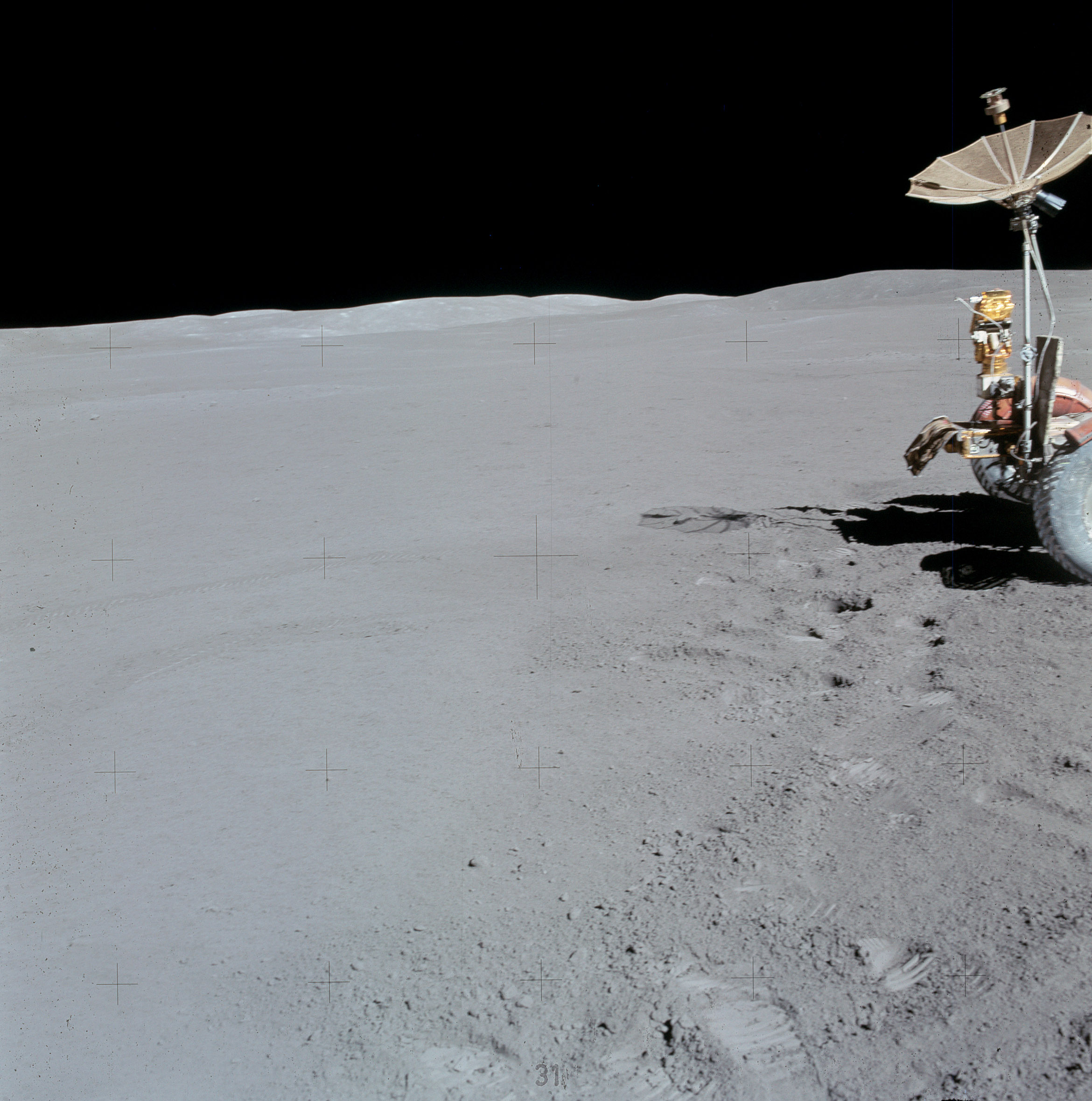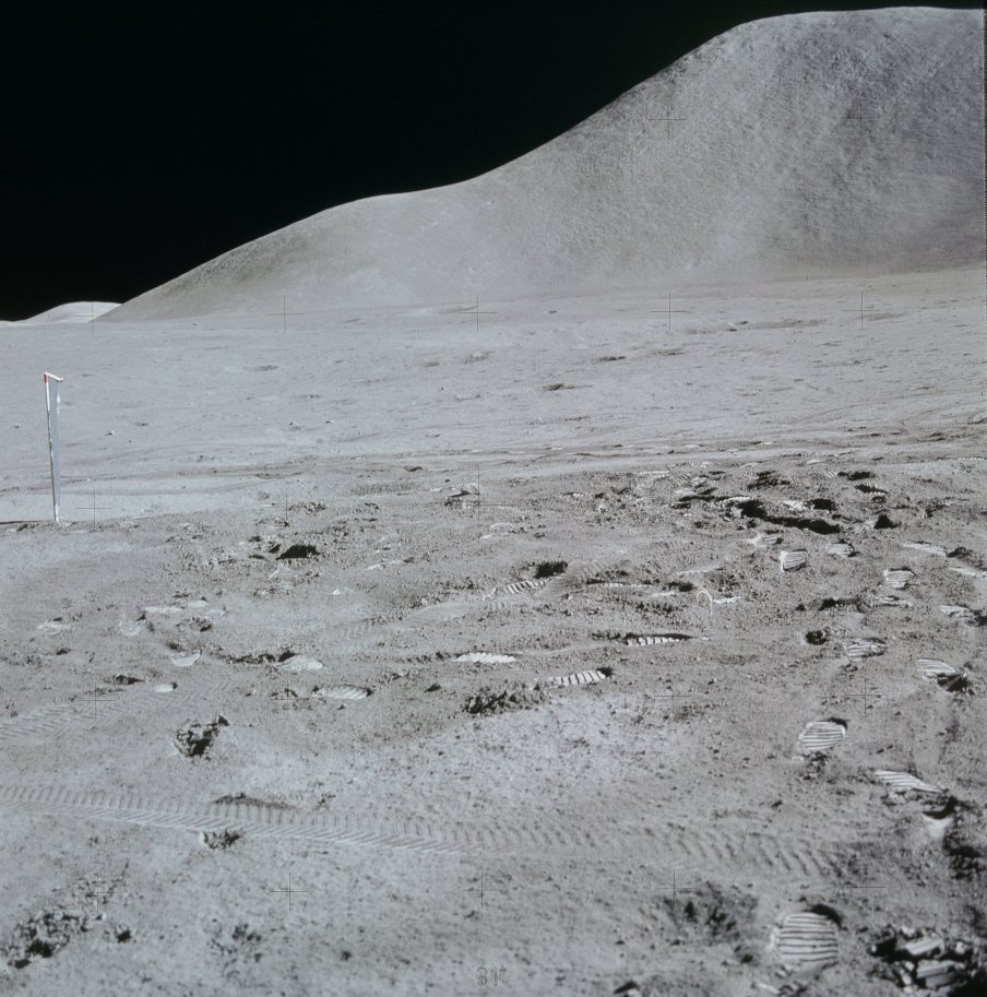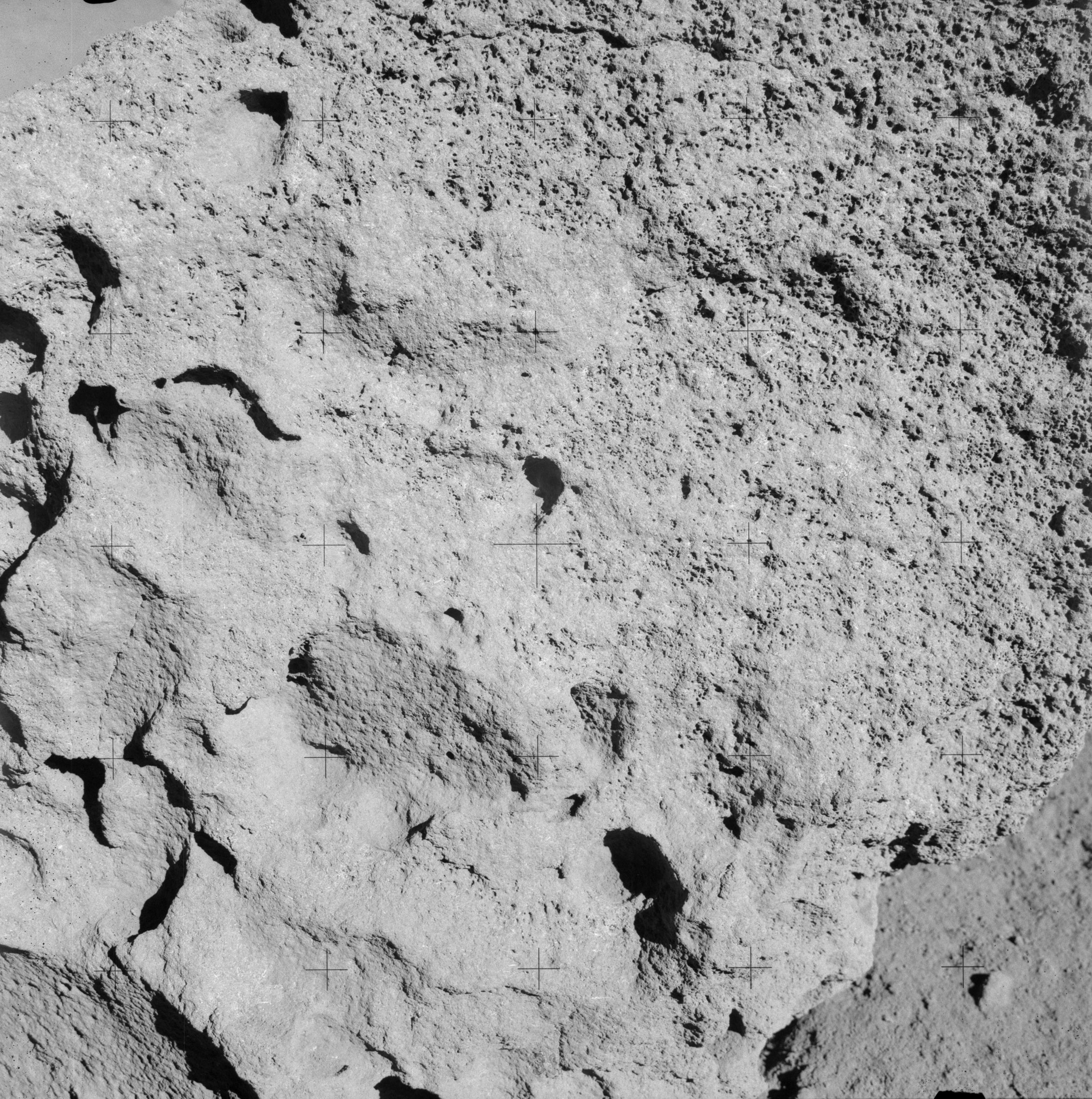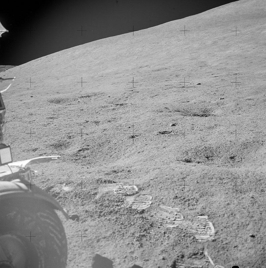 Stephen Tellier scanned a portion of Pan Camera frame 9798, which was taken during CSM Rev 38 at about 151:37. At that time, Dave and Jim were in the LM after the completion of EVA-2. A prominent feature of this image is the darkening of the soil around the LM and along a corridor extending from the LM toward 11 o'clock. See a comparison with frame 9377 by Markus Mehring, who has processed the images to account for differing orientations, different scales due to differing CSM-LM ranges, and different foreshortening due to differing CSM elevation angles. As Jack Schmitt discusses in the Apollo 17 commentary, the surface around the LM became brighter after being swept by the descent engine exhaust. As can be seen in photos taken on the surface, areas subsequently disturbed by the astronauts became relatively dark again. At locations relatively far from the LM, disturbed soil had the same brightness as undisturbed soil, another indication of brightening due to the engine exhaust.Rev. 50 Pan Camera 9809, North Detail ( 332k )