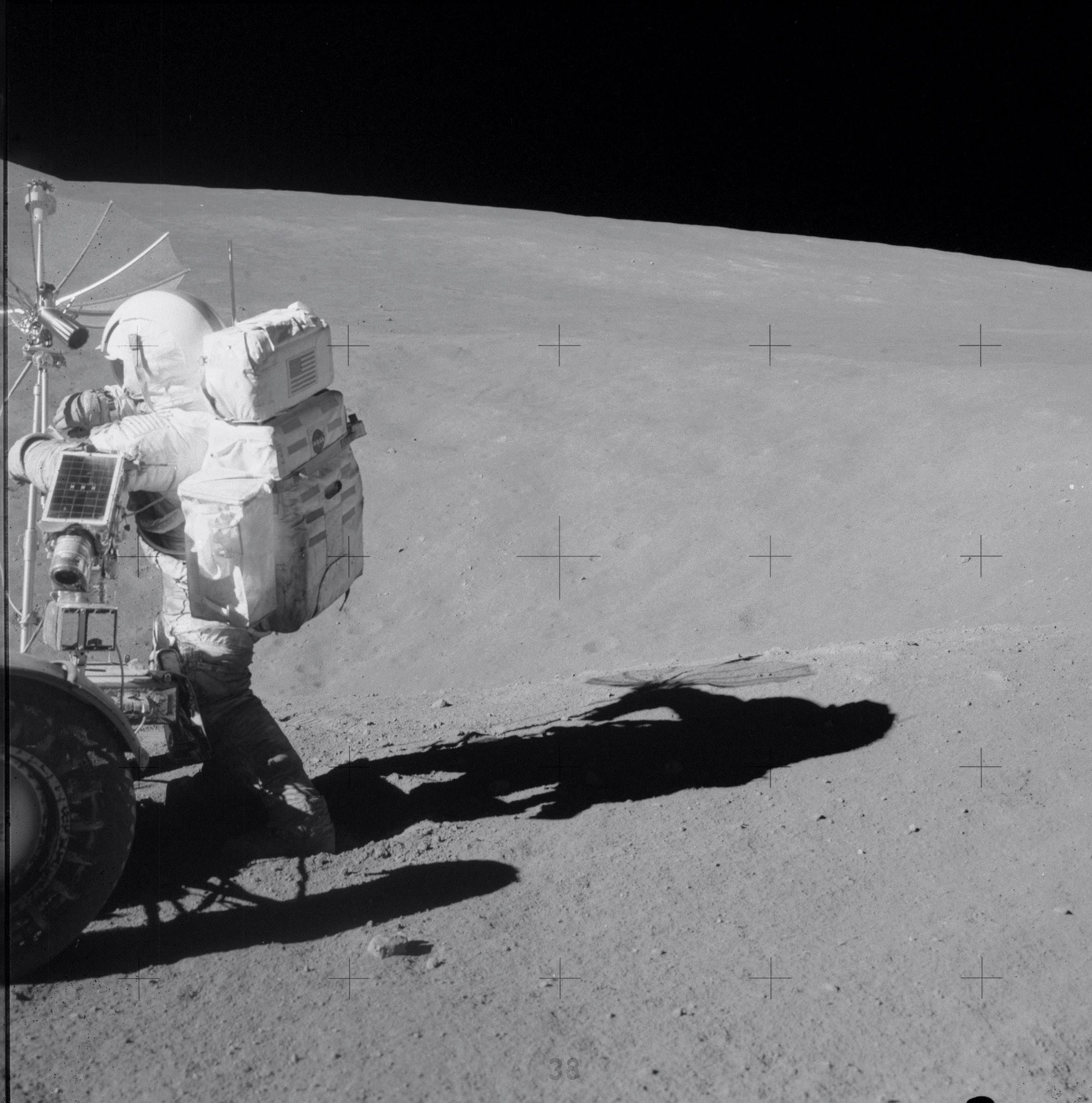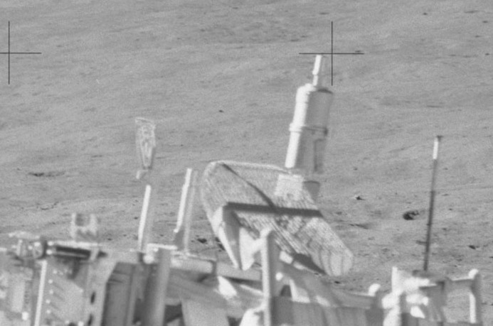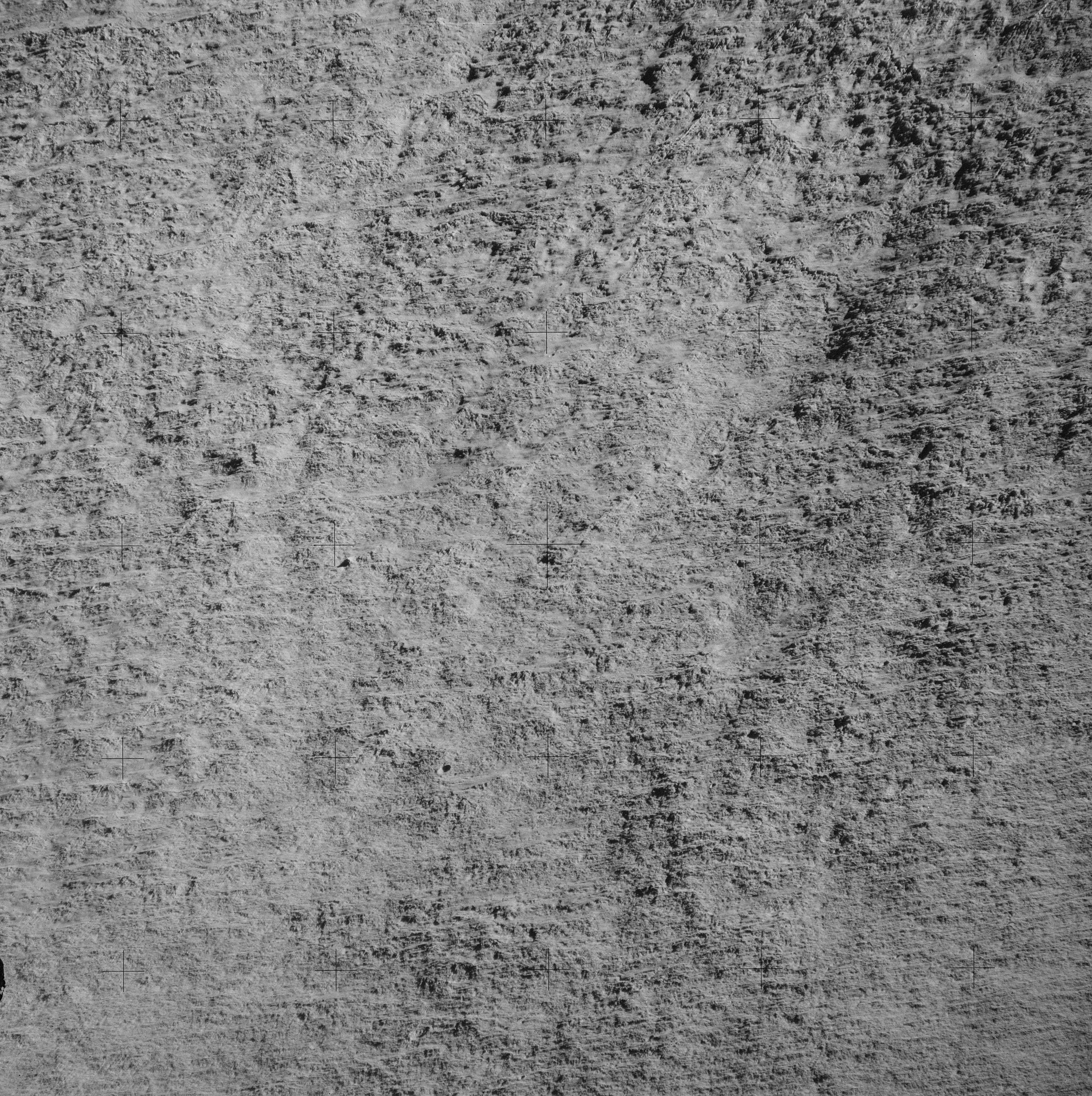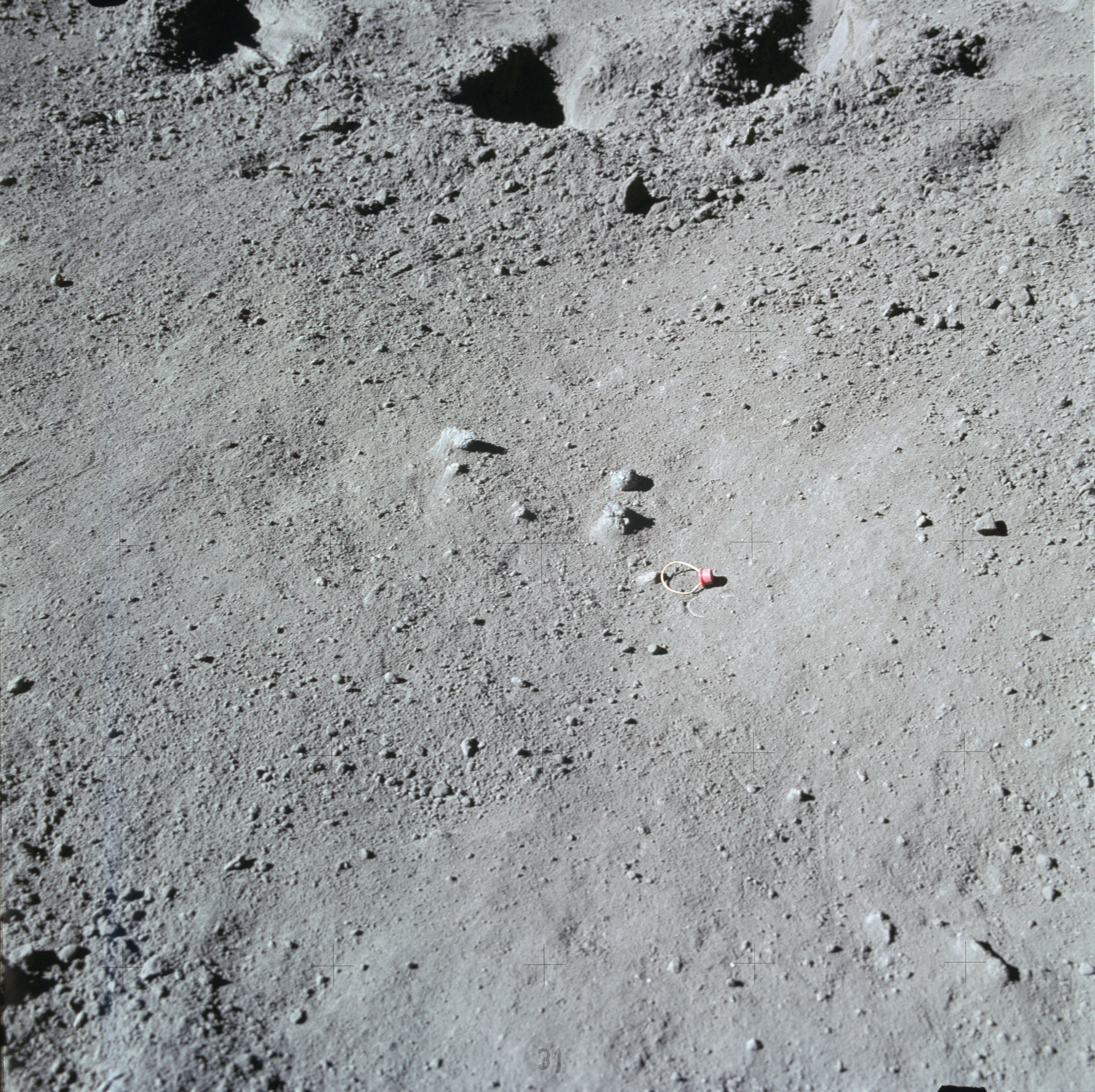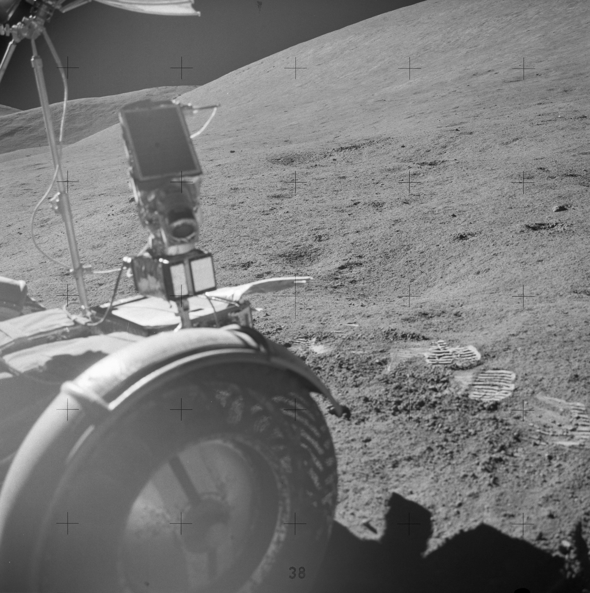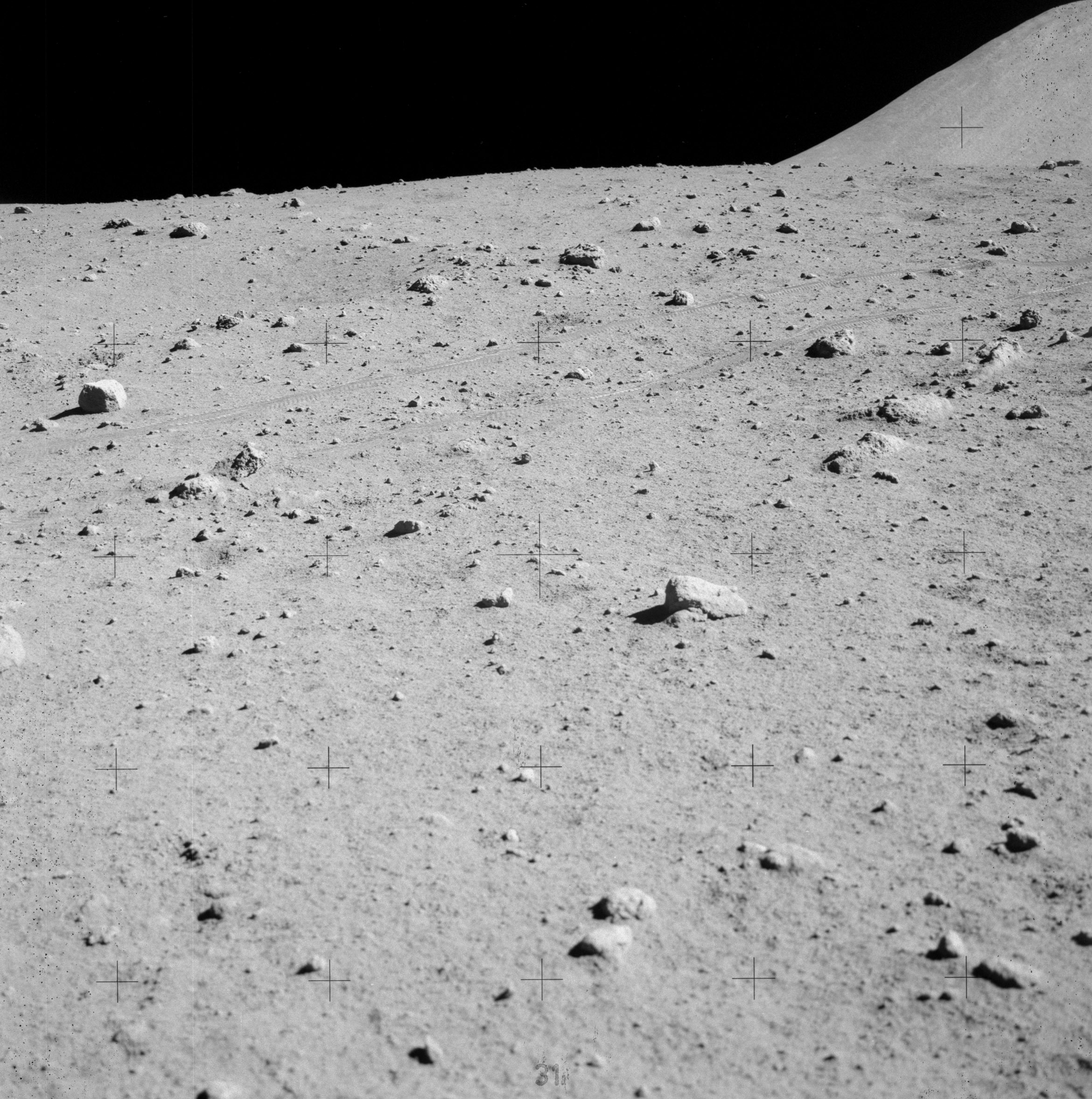 Stephen Tellier scanned a portion of Pan Camera frame 9798, which was taken during CSM Rev 38 at about 151:37. At that time, Dave and Jim were in the LM after the completion of EVA-2. A prominent feature of this image is the darkening of the soil around the LM and along a corridor extending from the LM toward 11 o'clock. See a comparison with frame 9377 by Markus Mehring, who has processed the images to account for differing orientations, different scales due to differing CSM-LM ranges, and different foreshortening due to differing CSM elevation angles. As Jack Schmitt discusses in the Apollo 17 commentary, the surface around the LM became brighter after being swept by the descent engine exhaust. As can be seen in photos taken on the surface, areas subsequently disturbed by the astronauts became relatively dark again. At locations relatively far from the LM, disturbed soil had the same brightness as undisturbed soil, another indication of brightening due to the engine exhaust.Rev. 50 Pan Camera 9809, North Detail ( 332k )