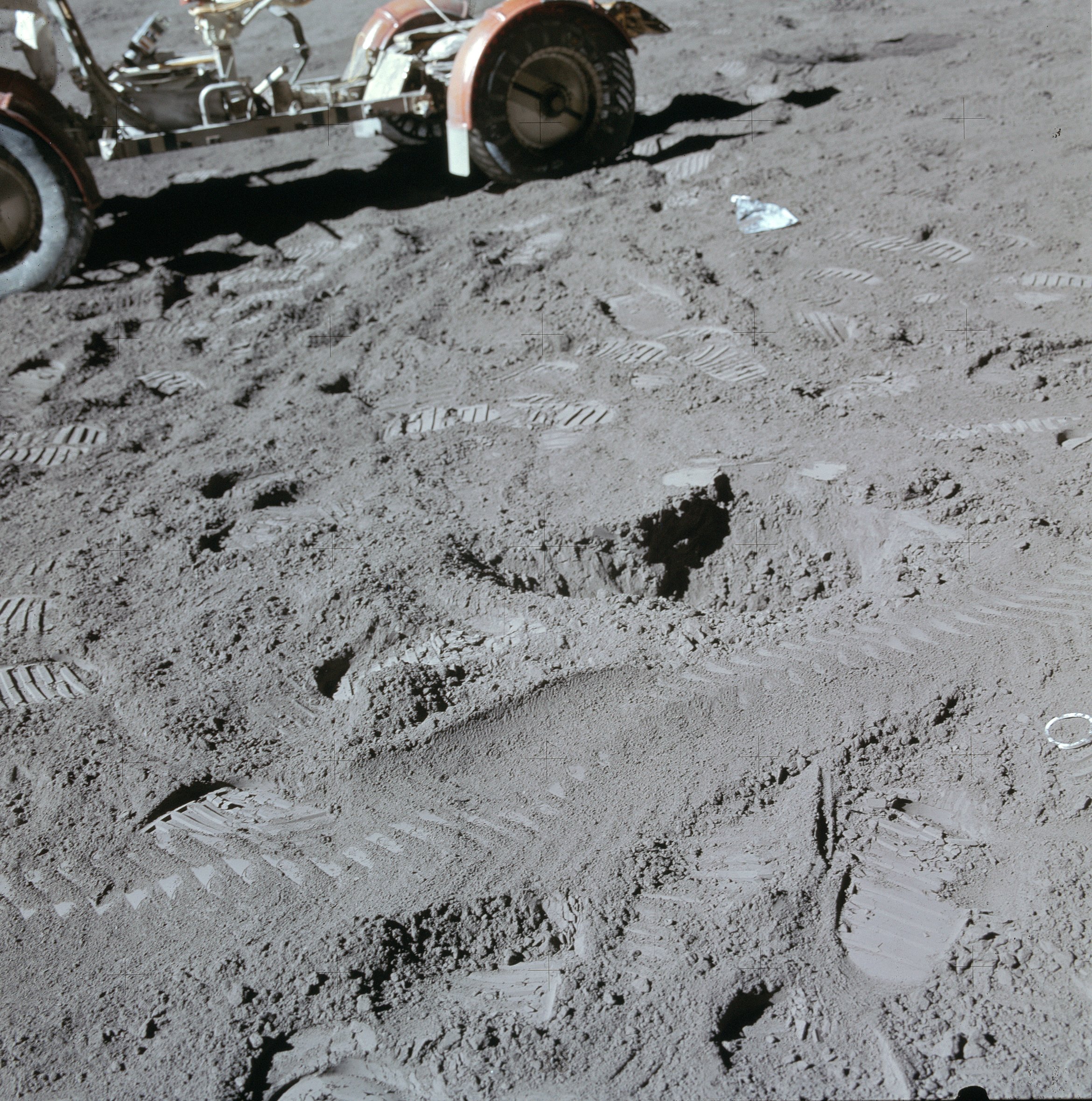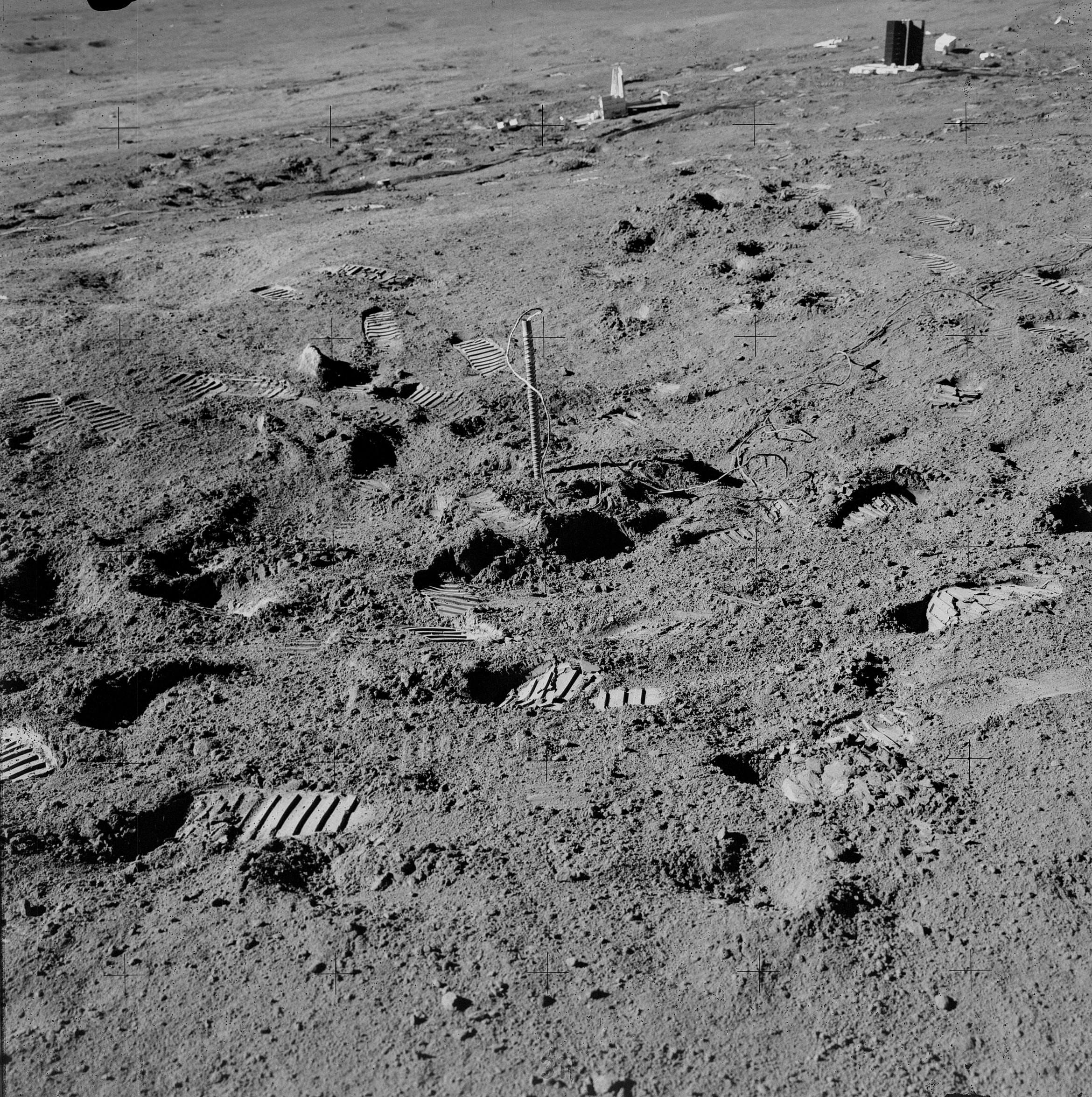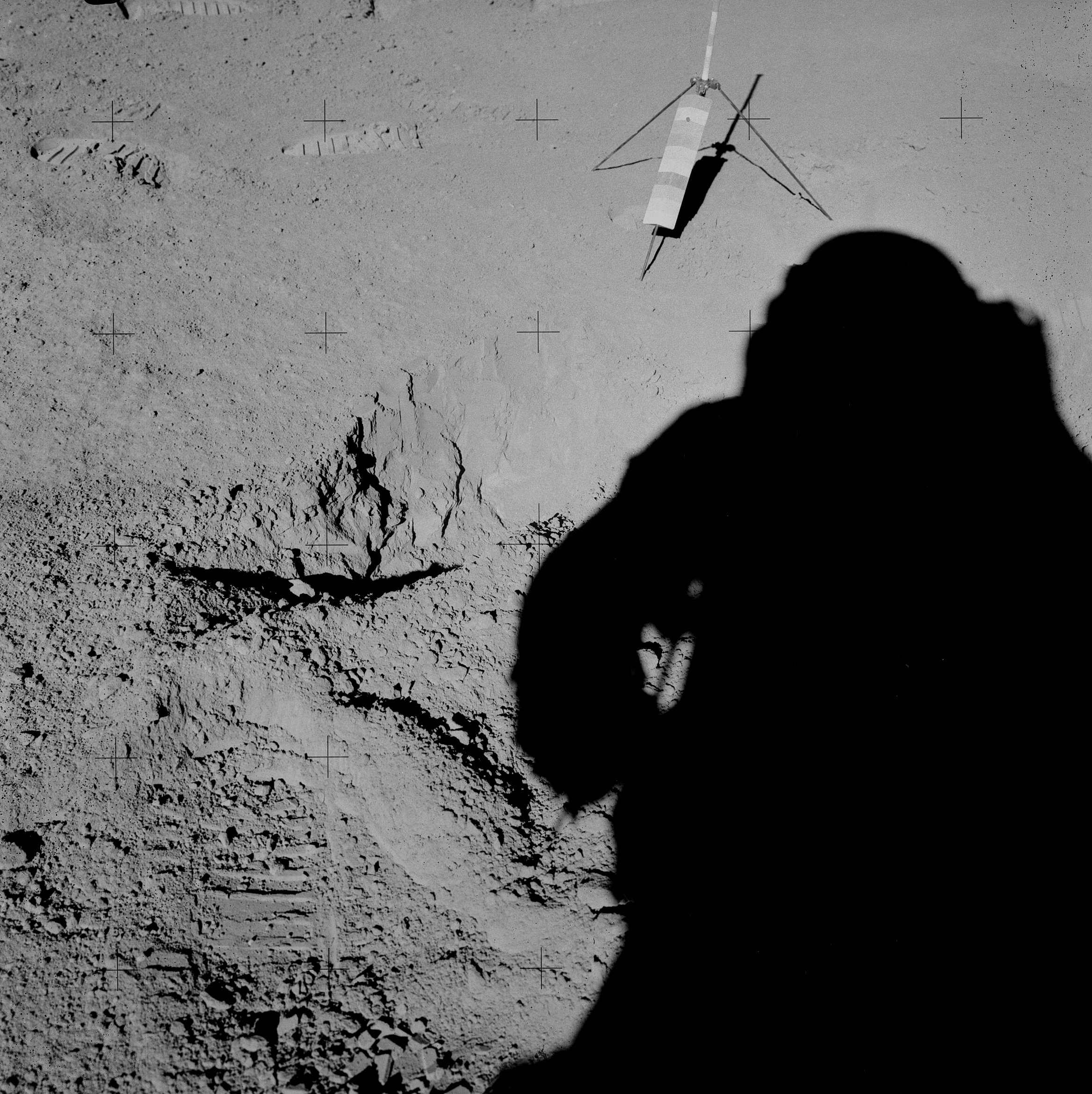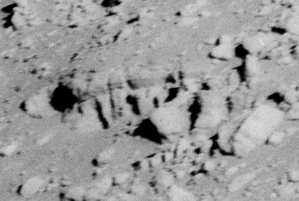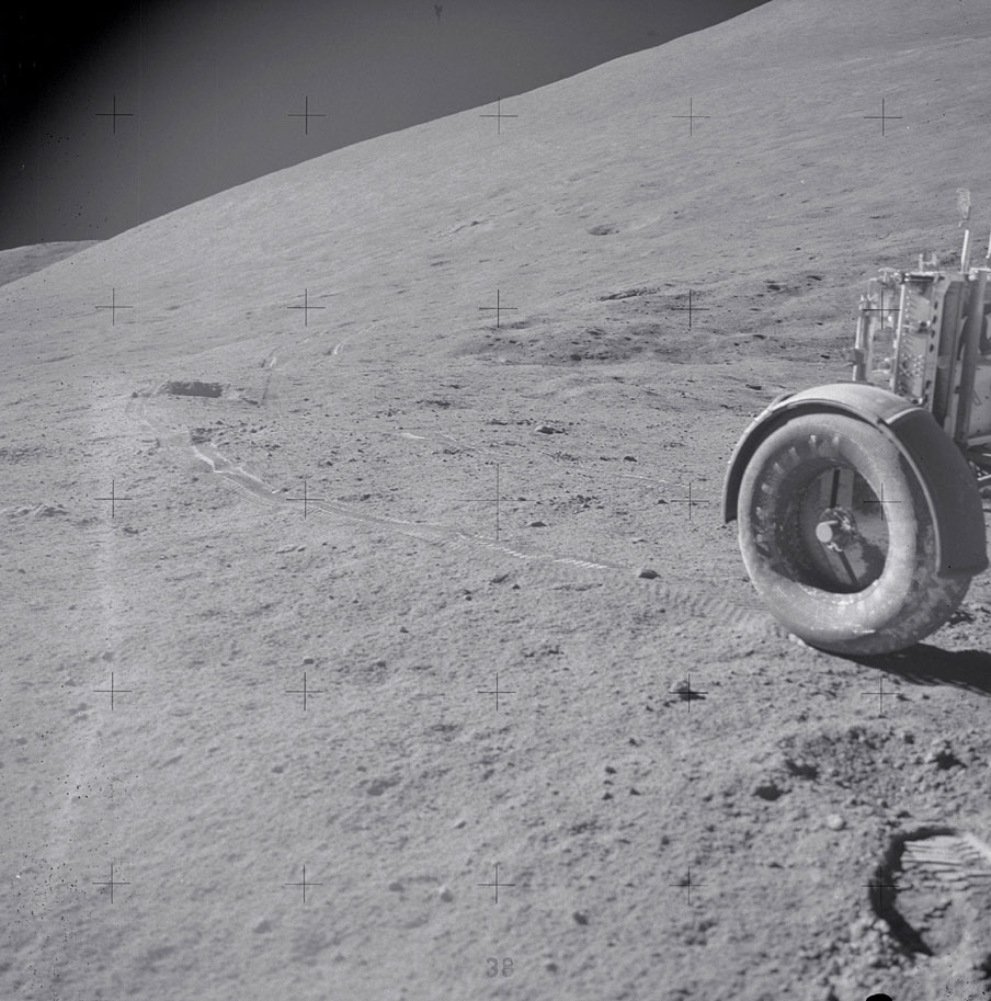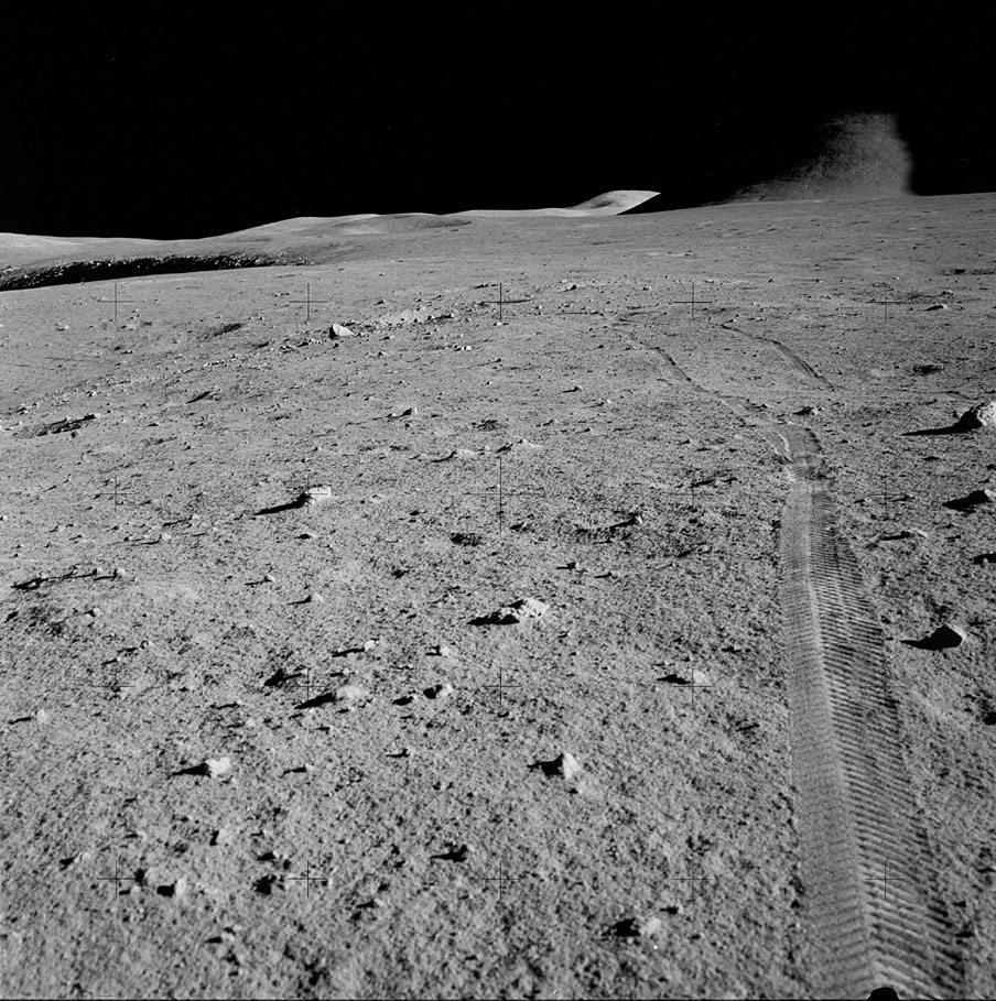 Stephen Tellier scanned a portion of Pan Camera frame 9798, which was taken during CSM Rev 38 at about 151:37. At that time, Dave and Jim were in the LM after the completion of EVA-2. A prominent feature of this image is the darkening of the soil around the LM and along a corridor extending from the LM toward 11 o'clock. See a comparison with frame 9377 by Markus Mehring, who has processed the images to account for differing orientations, different scales due to differing CSM-LM ranges, and different foreshortening due to differing CSM elevation angles. As Jack Schmitt discusses in the Apollo 17 commentary, the surface around the LM became brighter after being swept by the descent engine exhaust. As can be seen in photos taken on the surface, areas subsequently disturbed by the astronauts became relatively dark again. At locations relatively far from the LM, disturbed soil had the same brightness as undisturbed soil, another indication of brightening due to the engine exhaust.Rev. 50 Pan Camera 9809, North Detail ( 332k )