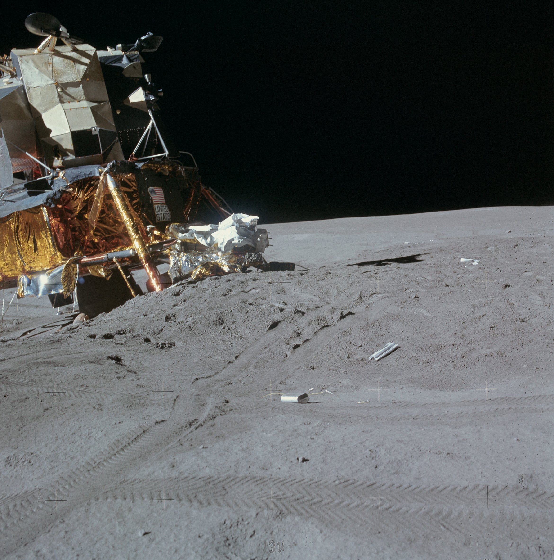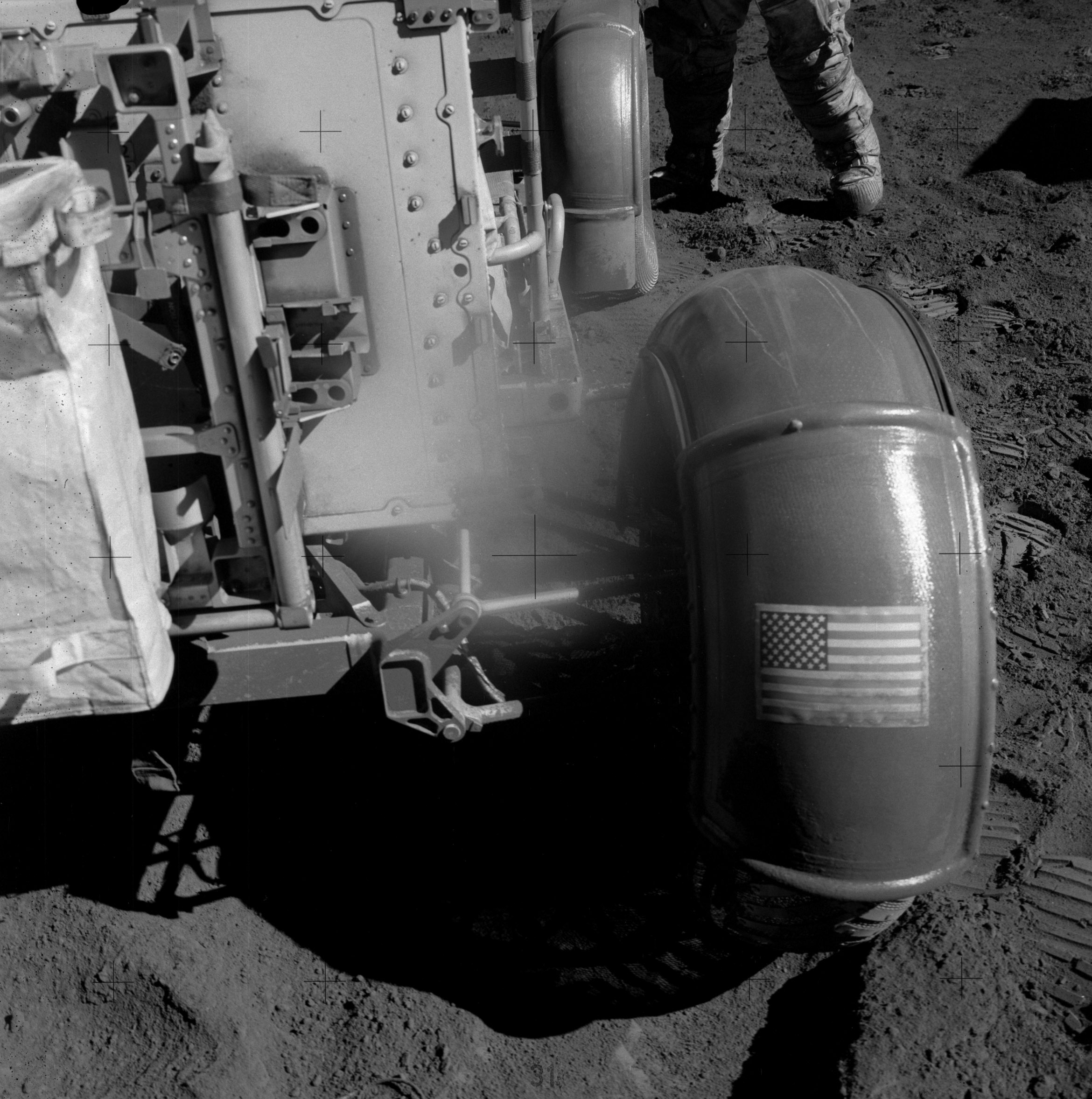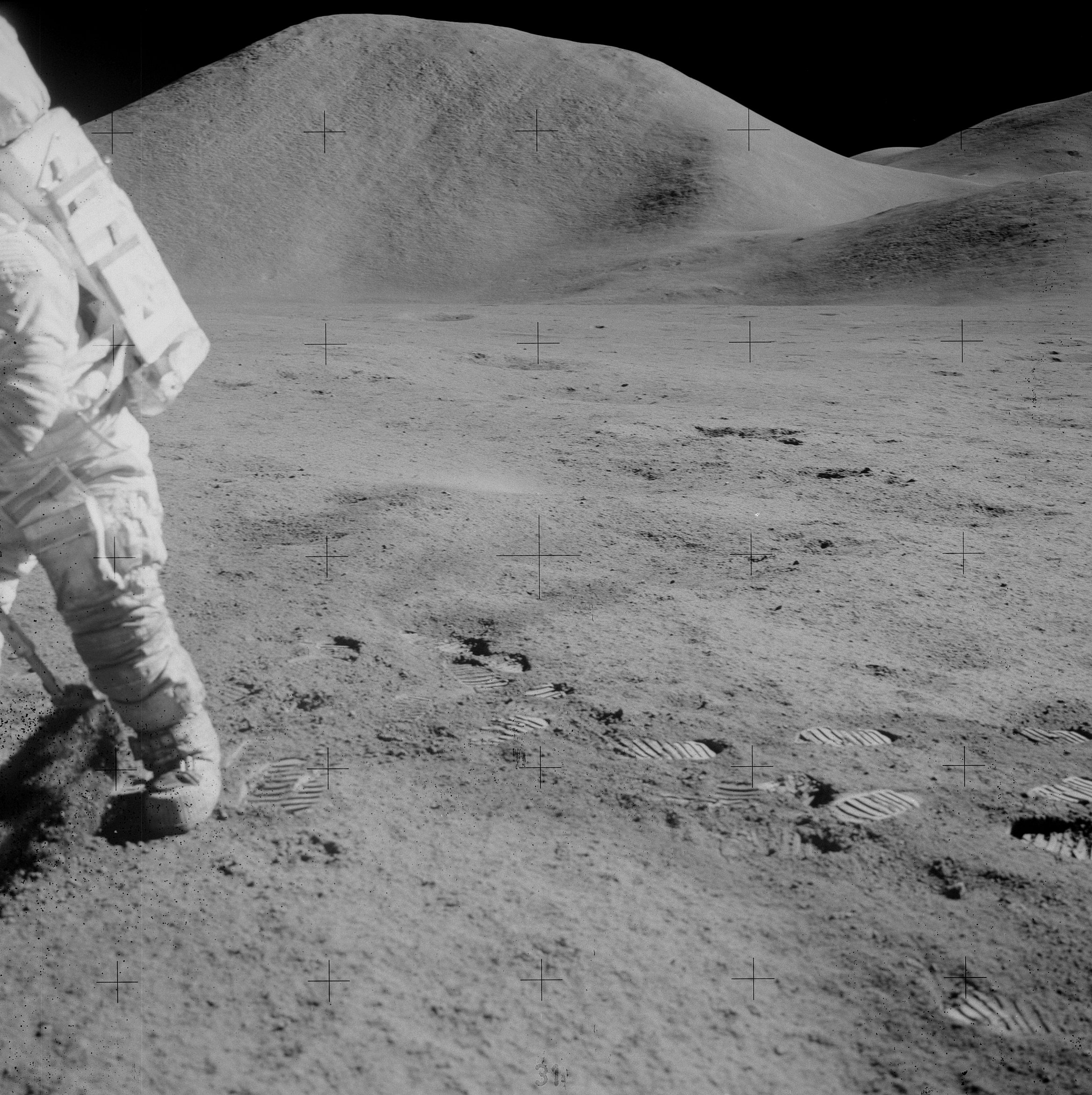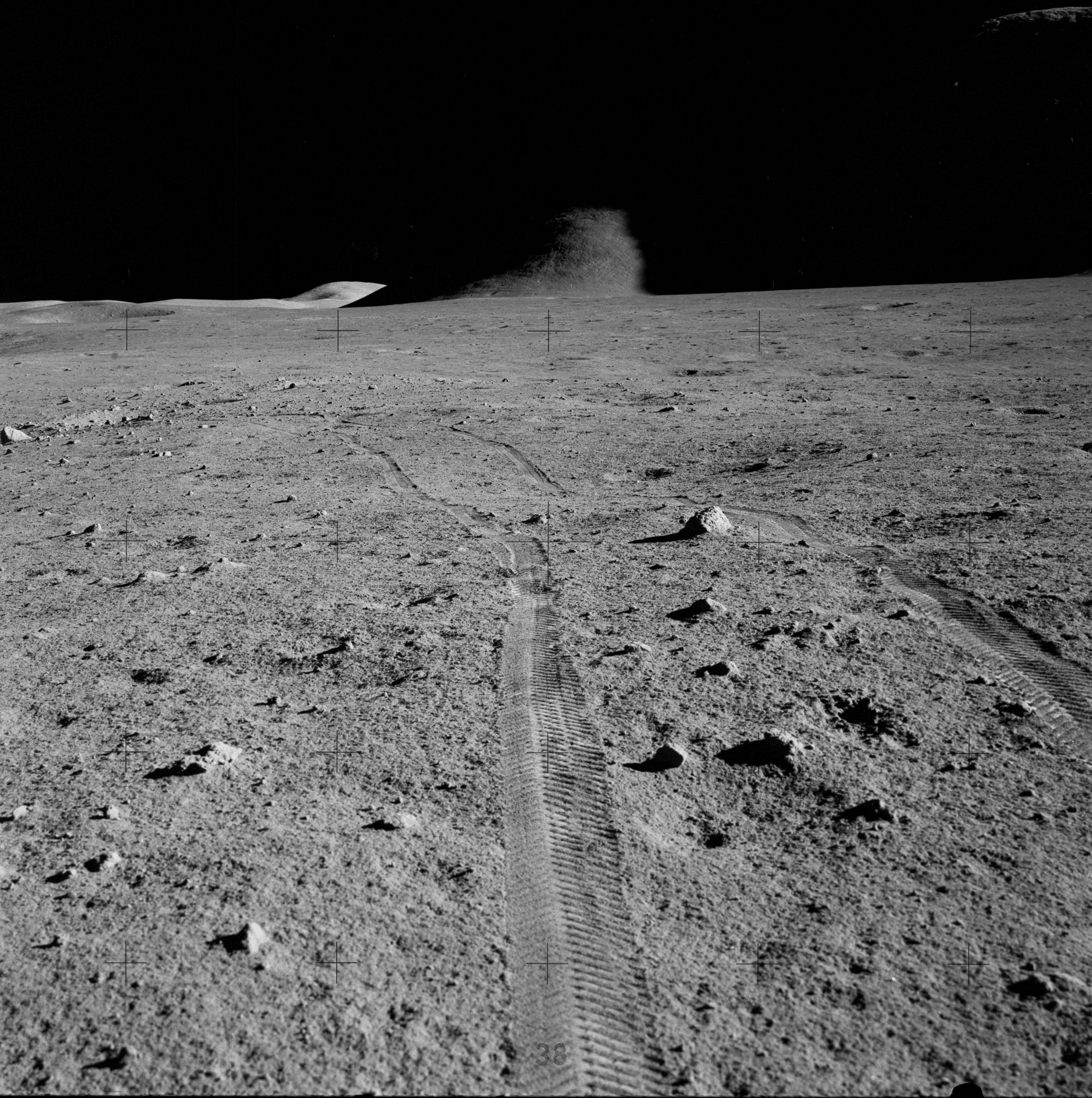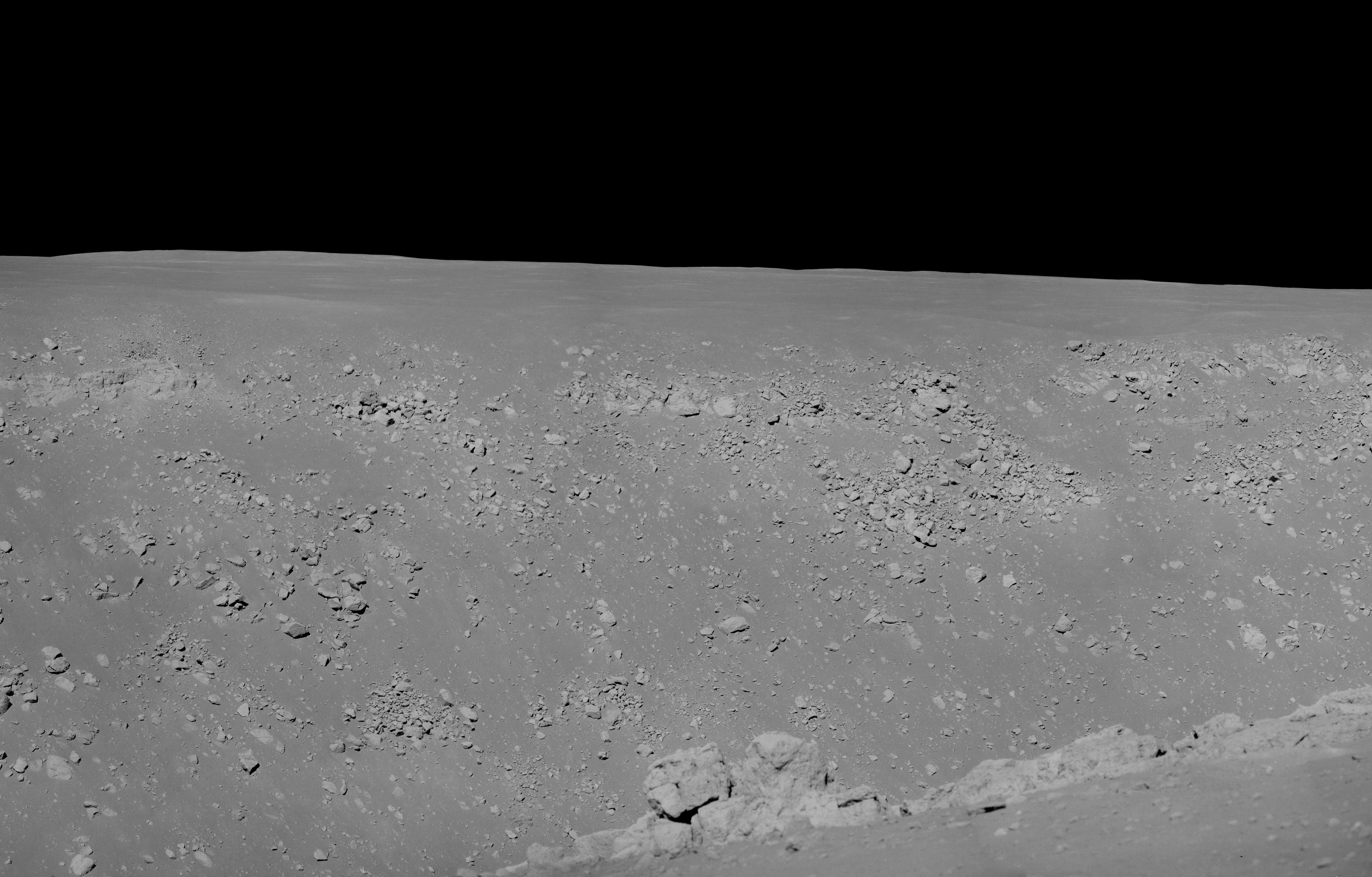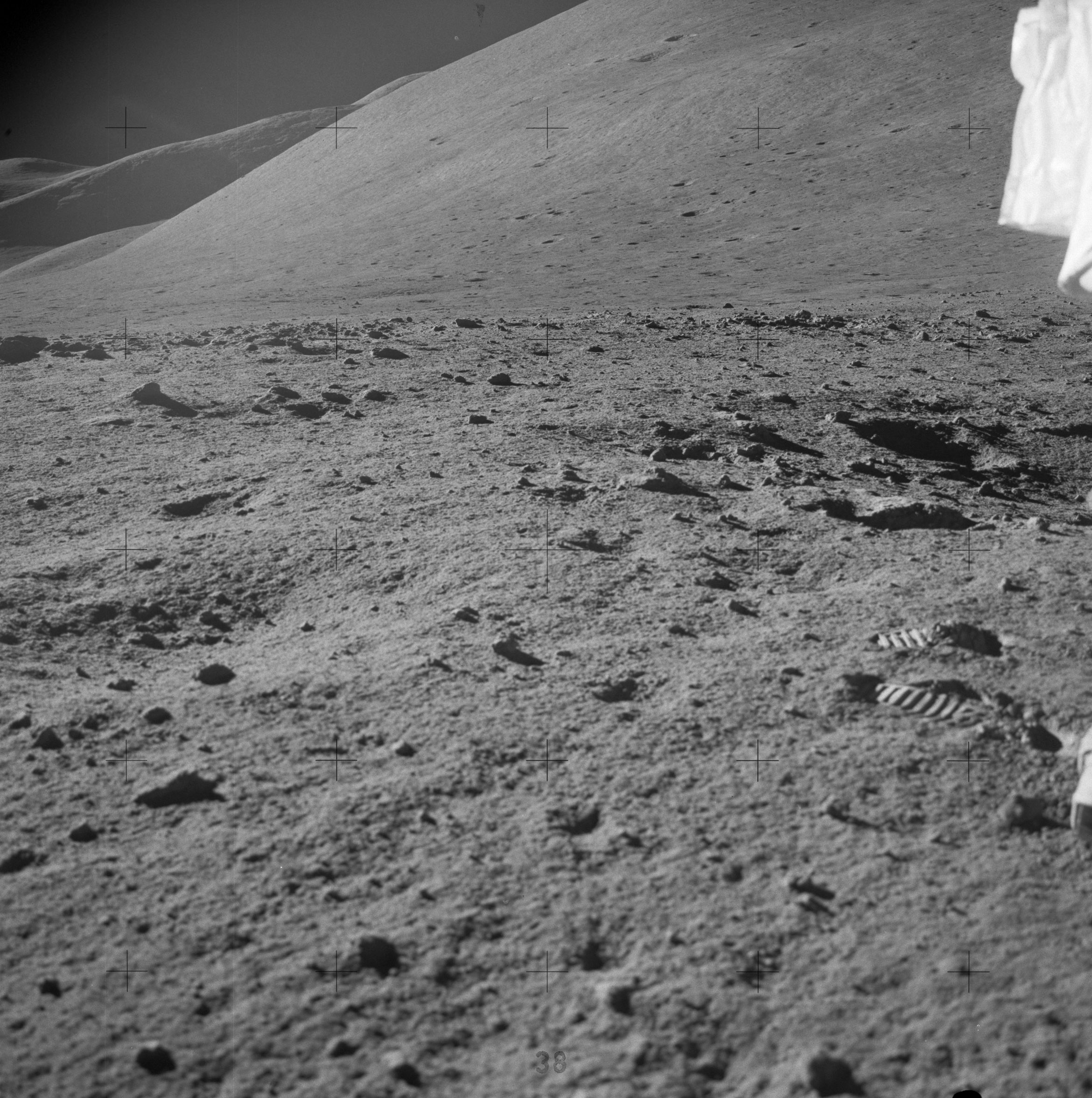 Stephen Tellier scanned a portion of Pan Camera frame 9798, which was taken during CSM Rev 38 at about 151:37. At that time, Dave and Jim were in the LM after the completion of EVA-2. A prominent feature of this image is the darkening of the soil around the LM and along a corridor extending from the LM toward 11 o'clock. See a comparison with frame 9377 by Markus Mehring, who has processed the images to account for differing orientations, different scales due to differing CSM-LM ranges, and different foreshortening due to differing CSM elevation angles. As Jack Schmitt discusses in the Apollo 17 commentary, the surface around the LM became brighter after being swept by the descent engine exhaust. As can be seen in photos taken on the surface, areas subsequently disturbed by the astronauts became relatively dark again. At locations relatively far from the LM, disturbed soil had the same brightness as undisturbed soil, another indication of brightening due to the engine exhaust.Rev. 50 Pan Camera 9809, North Detail ( 332k )