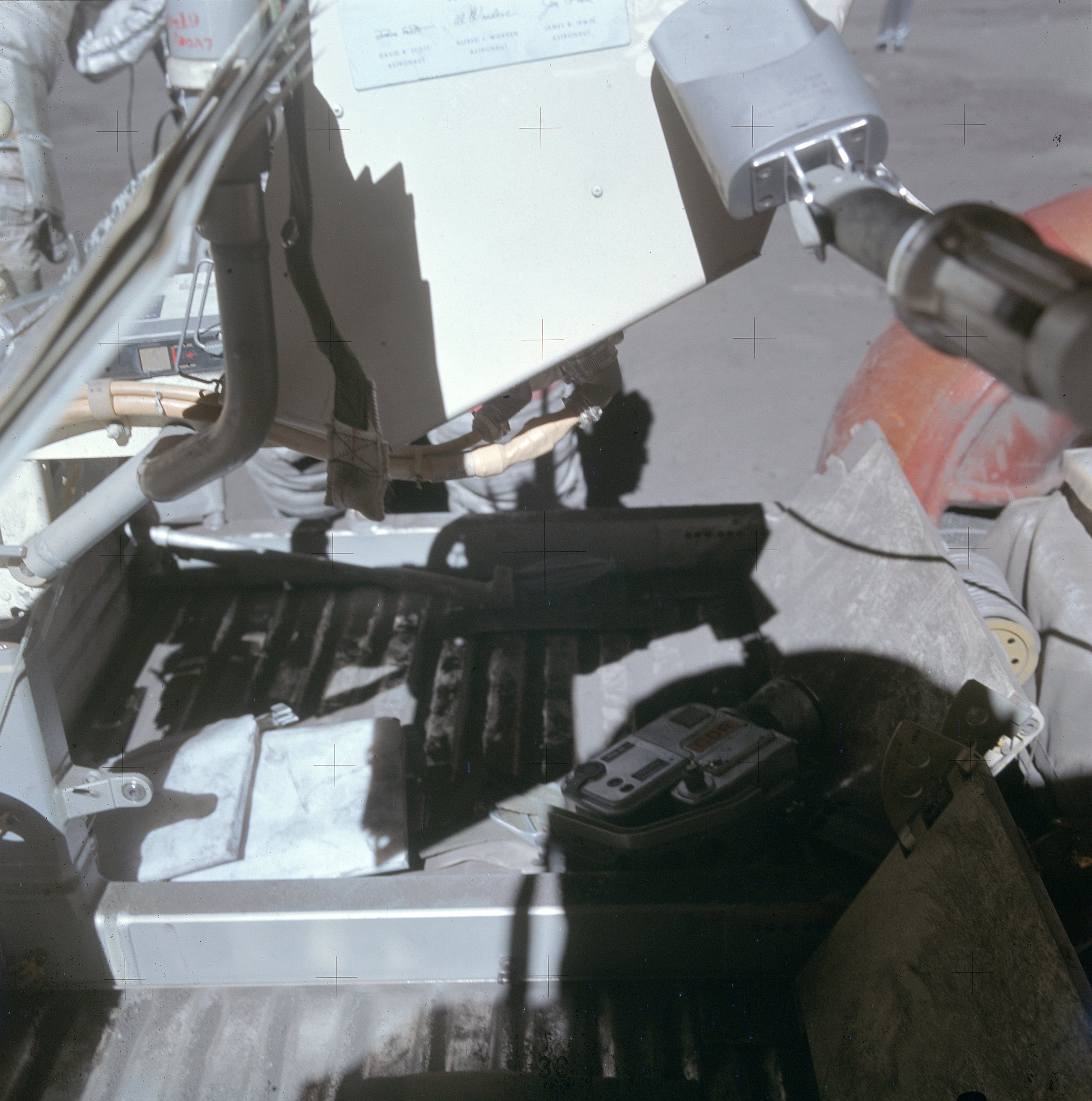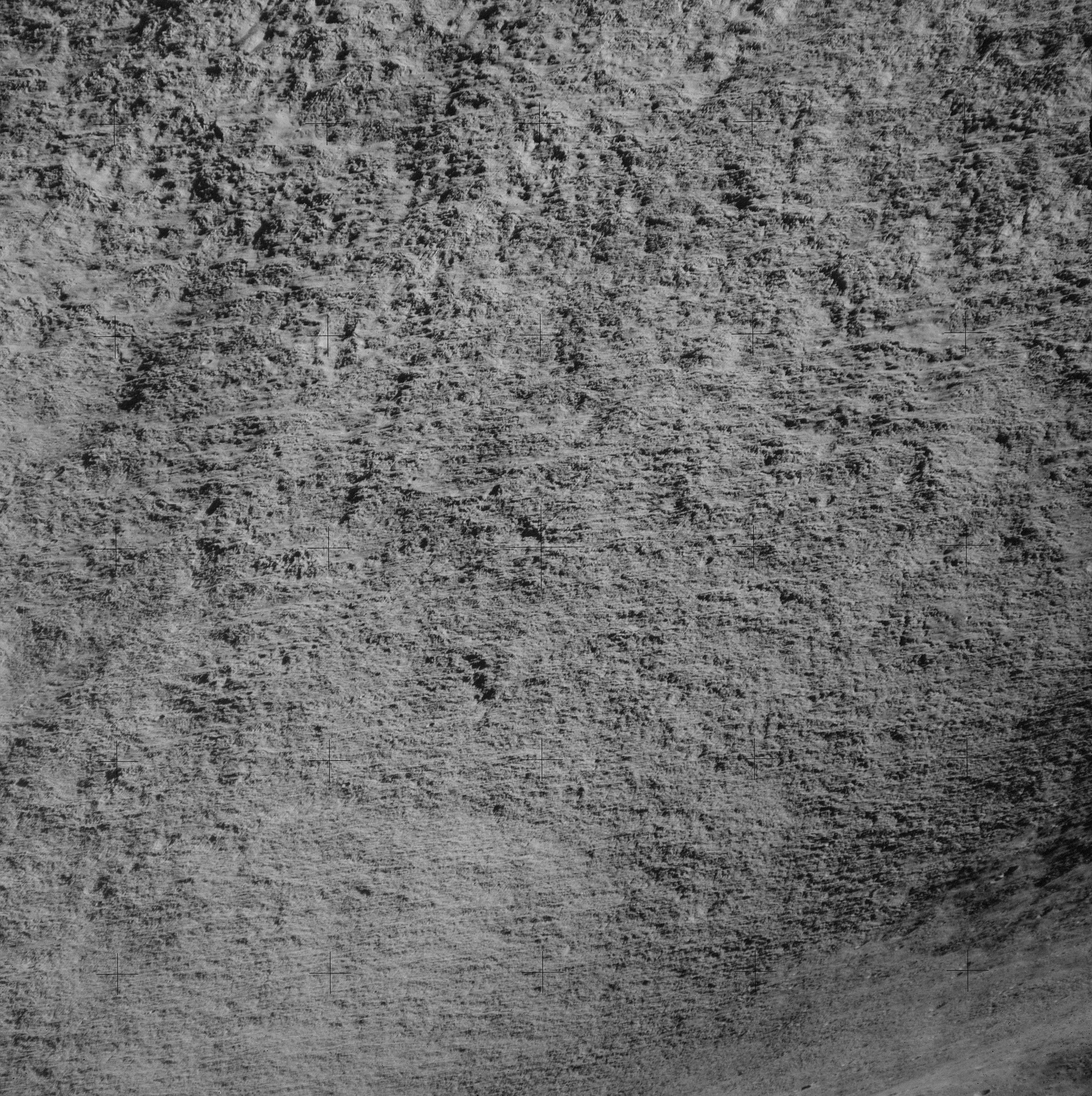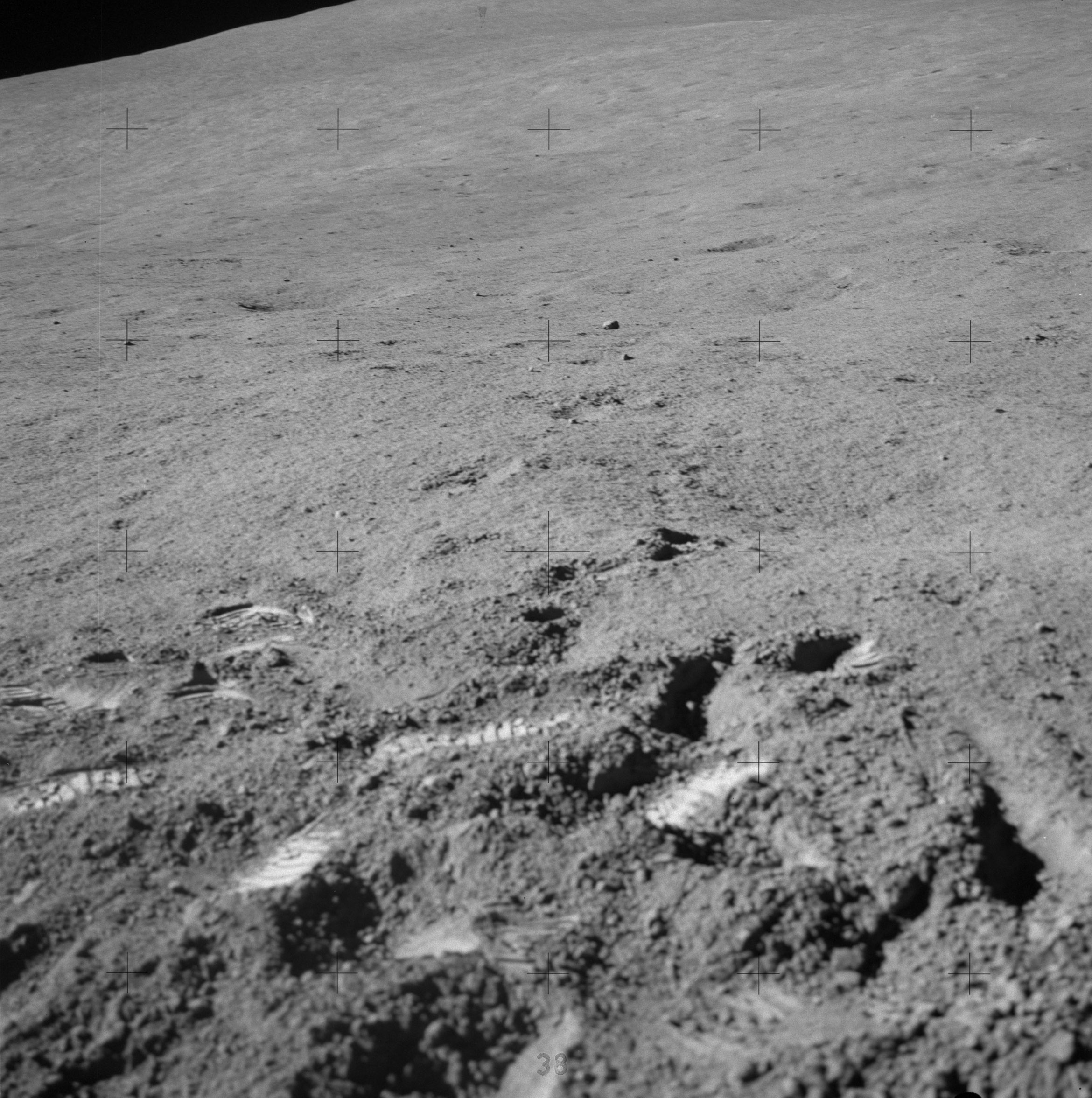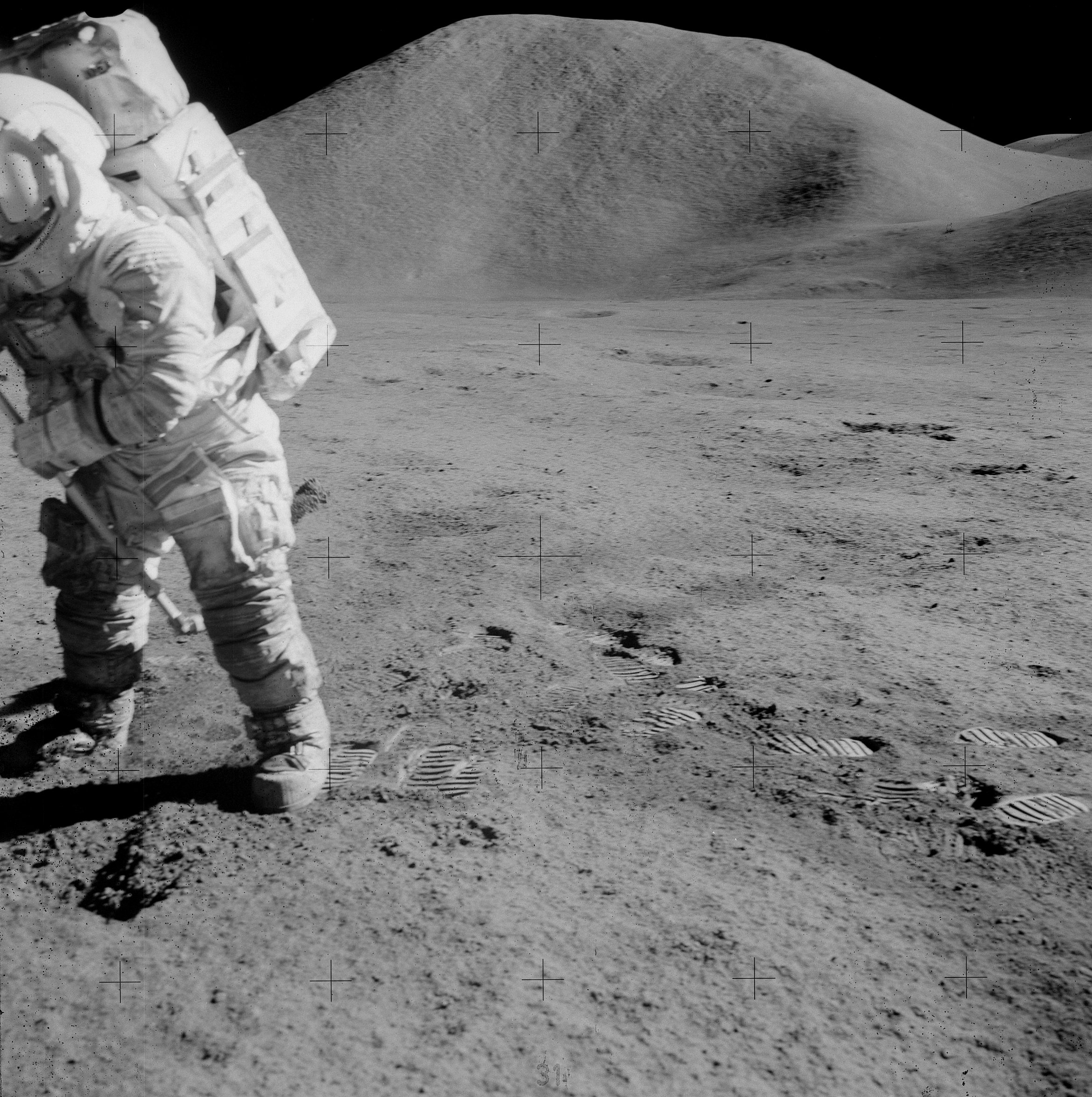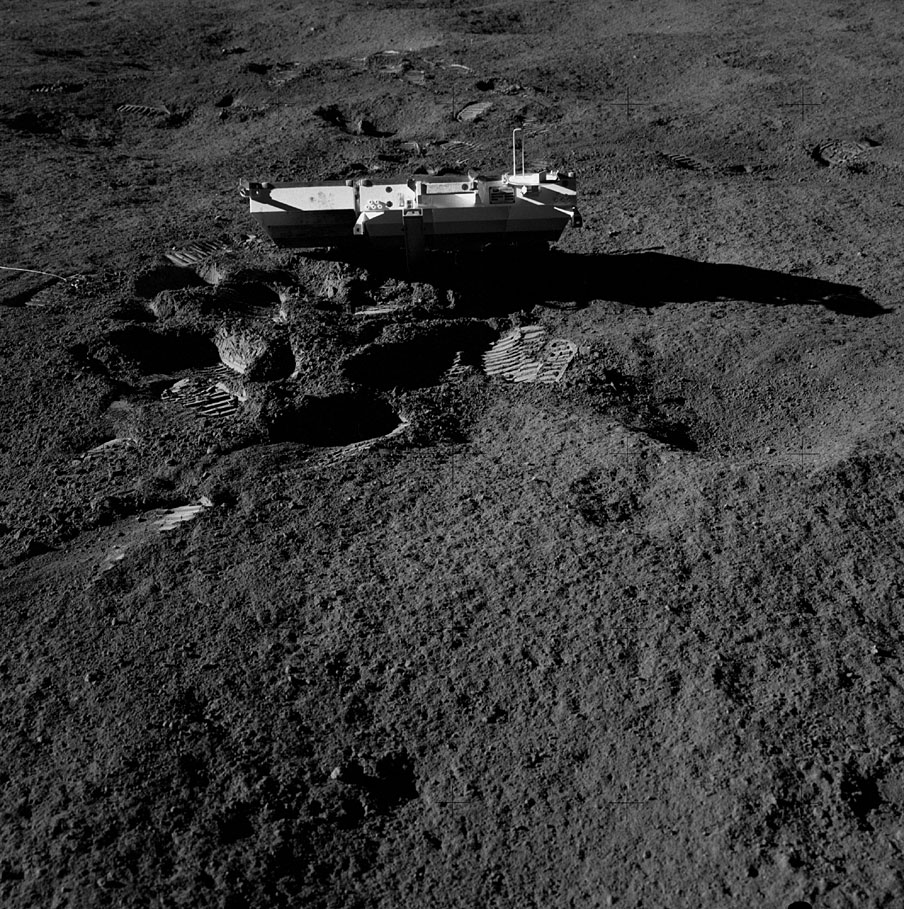 Stephen Tellier scanned a portion of Pan Camera frame 9798, which was taken during CSM Rev 38 at about 151:37. At that time, Dave and Jim were in the LM after the completion of EVA-2. A prominent feature of this image is the darkening of the soil around the LM and along a corridor extending from the LM toward 11 o'clock. See a comparison with frame 9377 by Markus Mehring, who has processed the images to account for differing orientations, different scales due to differing CSM-LM ranges, and different foreshortening due to differing CSM elevation angles. As Jack Schmitt discusses in the Apollo 17 commentary, the surface around the LM became brighter after being swept by the descent engine exhaust. As can be seen in photos taken on the surface, areas subsequently disturbed by the astronauts became relatively dark again. At locations relatively far from the LM, disturbed soil had the same brightness as undisturbed soil, another indication of brightening due to the engine exhaust.Rev. 50 Pan Camera 9809, North Detail ( 332k )