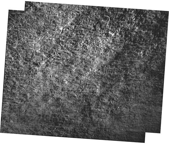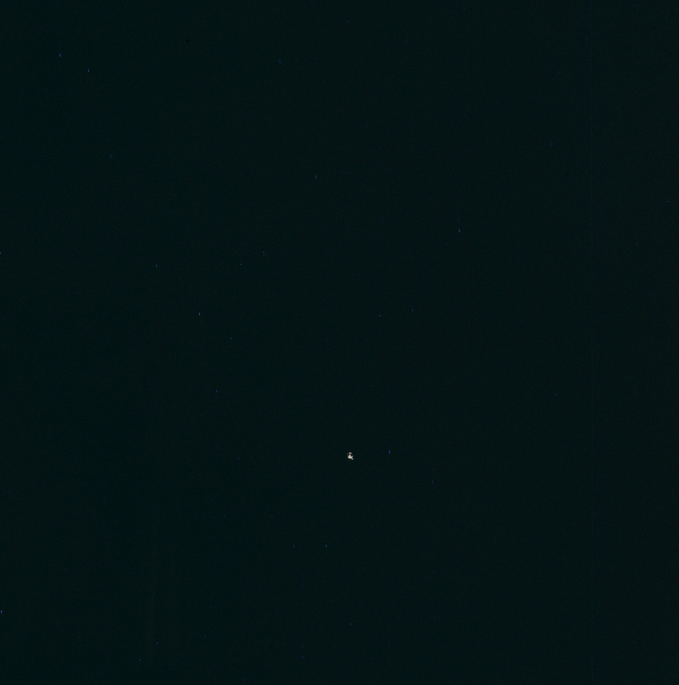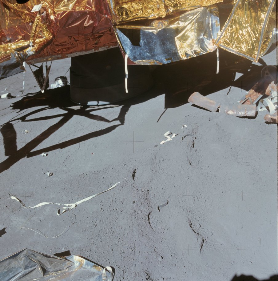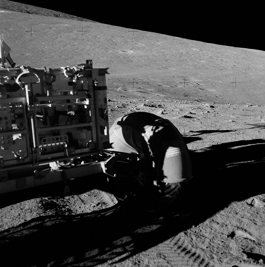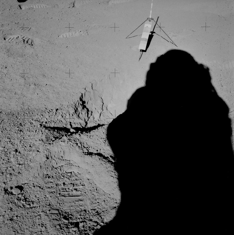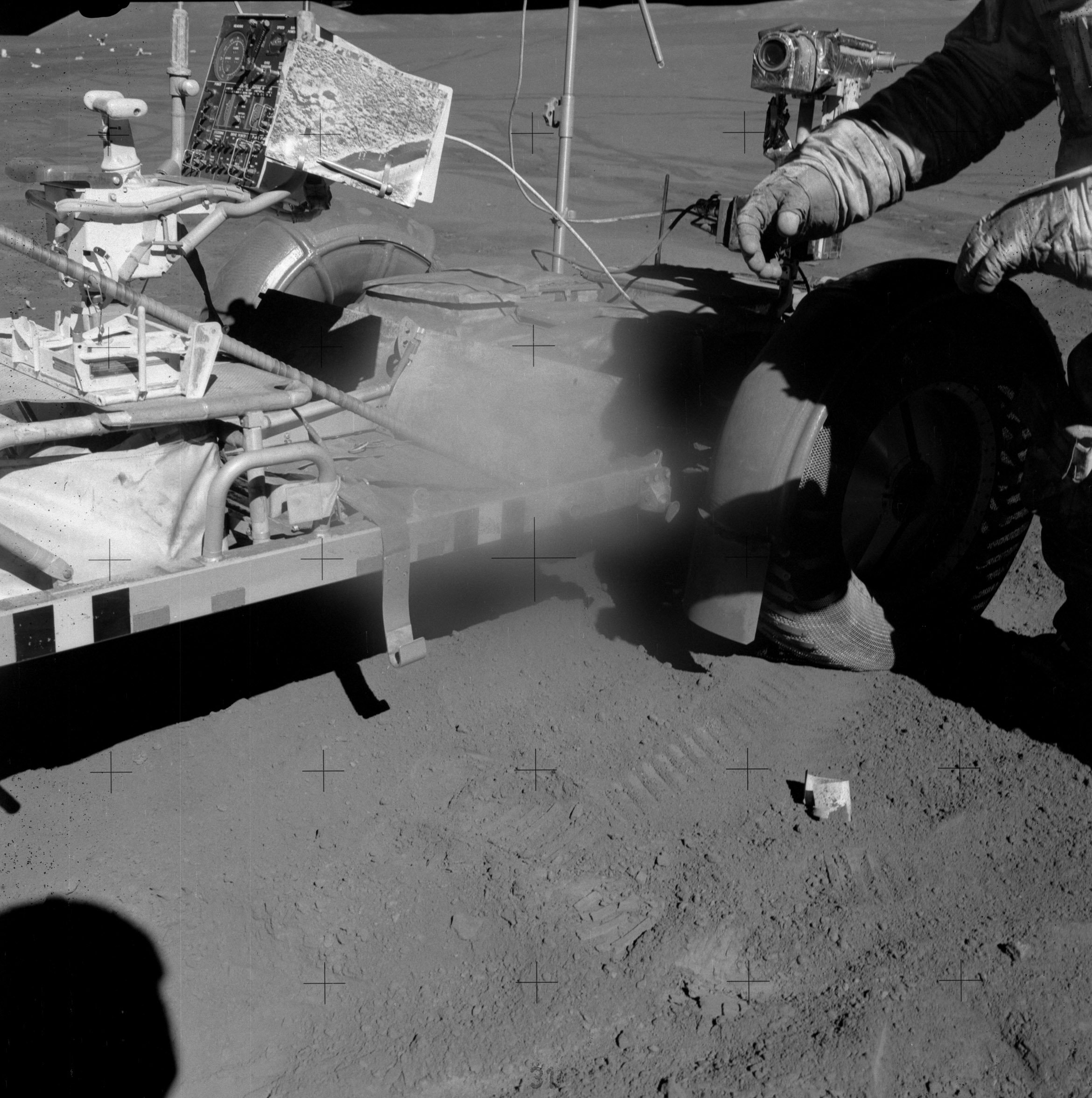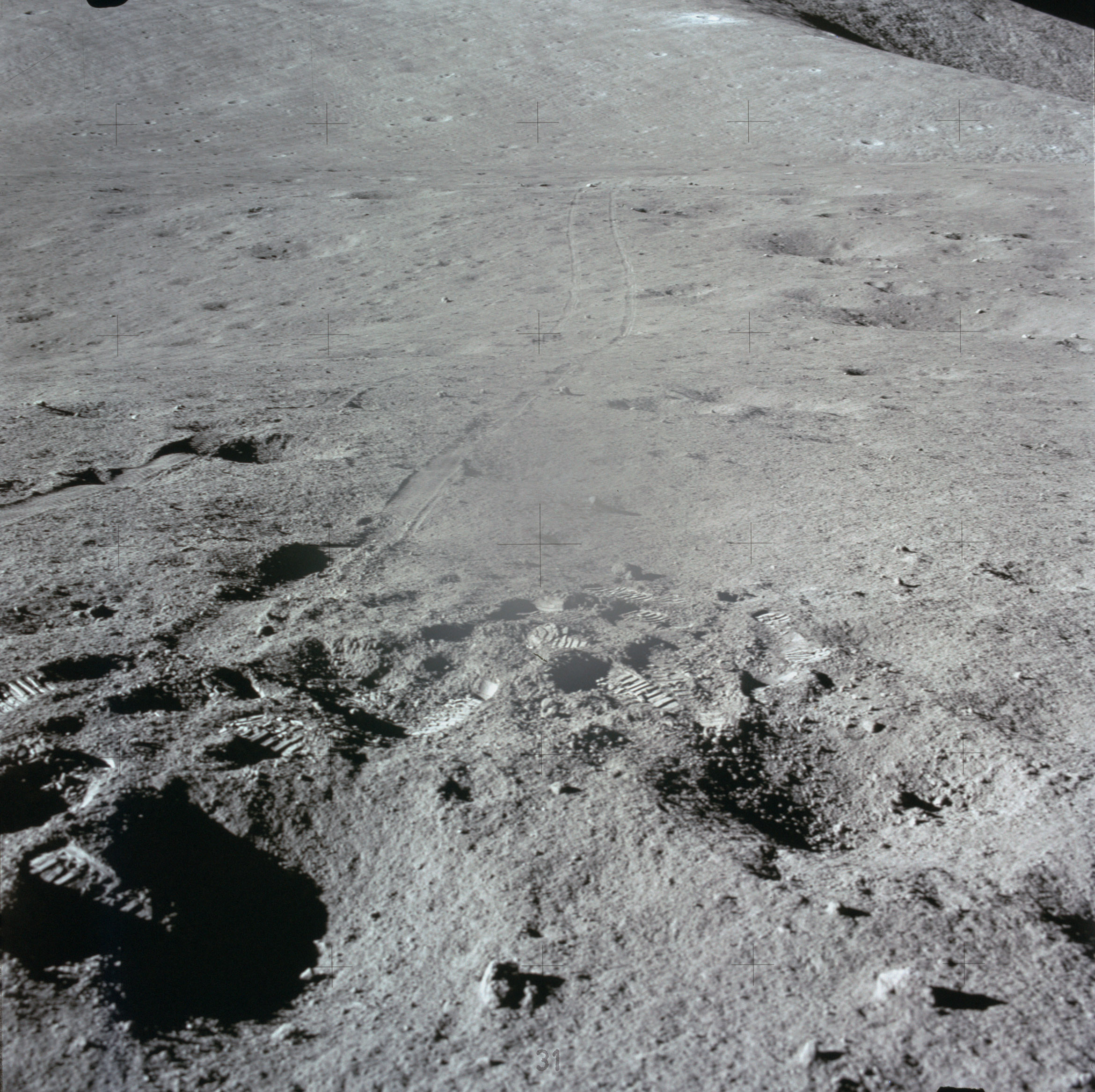 Stephen Tellier scanned a portion of Pan Camera frame 9798, which was taken during CSM Rev 38 at about 151:37. At that time, Dave and Jim were in the LM after the completion of EVA-2. A prominent feature of this image is the darkening of the soil around the LM and along a corridor extending from the LM toward 11 o'clock. See a comparison with frame 9377 by Markus Mehring, who has processed the images to account for differing orientations, different scales due to differing CSM-LM ranges, and different foreshortening due to differing CSM elevation angles. As Jack Schmitt discusses in the Apollo 17 commentary, the surface around the LM became brighter after being swept by the descent engine exhaust. As can be seen in photos taken on the surface, areas subsequently disturbed by the astronauts became relatively dark again. At locations relatively far from the LM, disturbed soil had the same brightness as undisturbed soil, another indication of brightening due to the engine exhaust.Rev. 50 Pan Camera 9809, North Detail ( 332k )