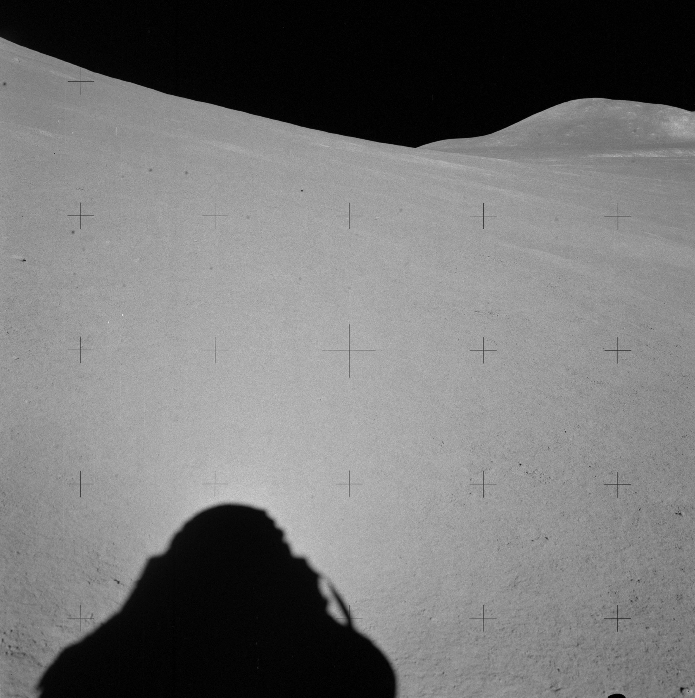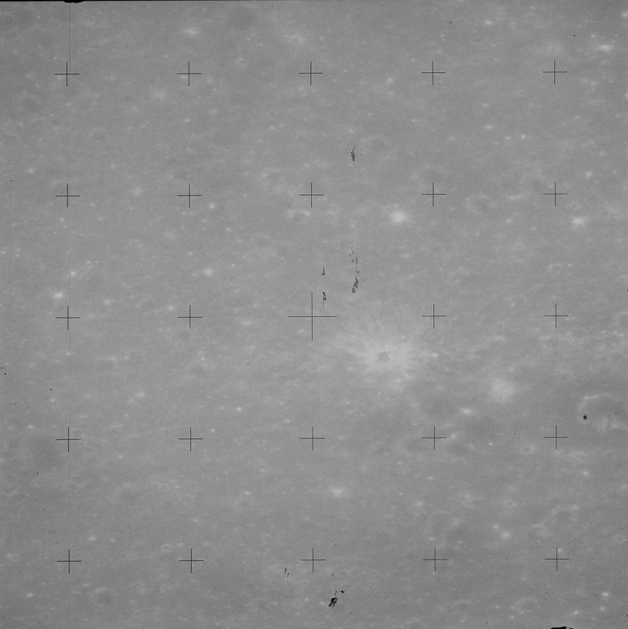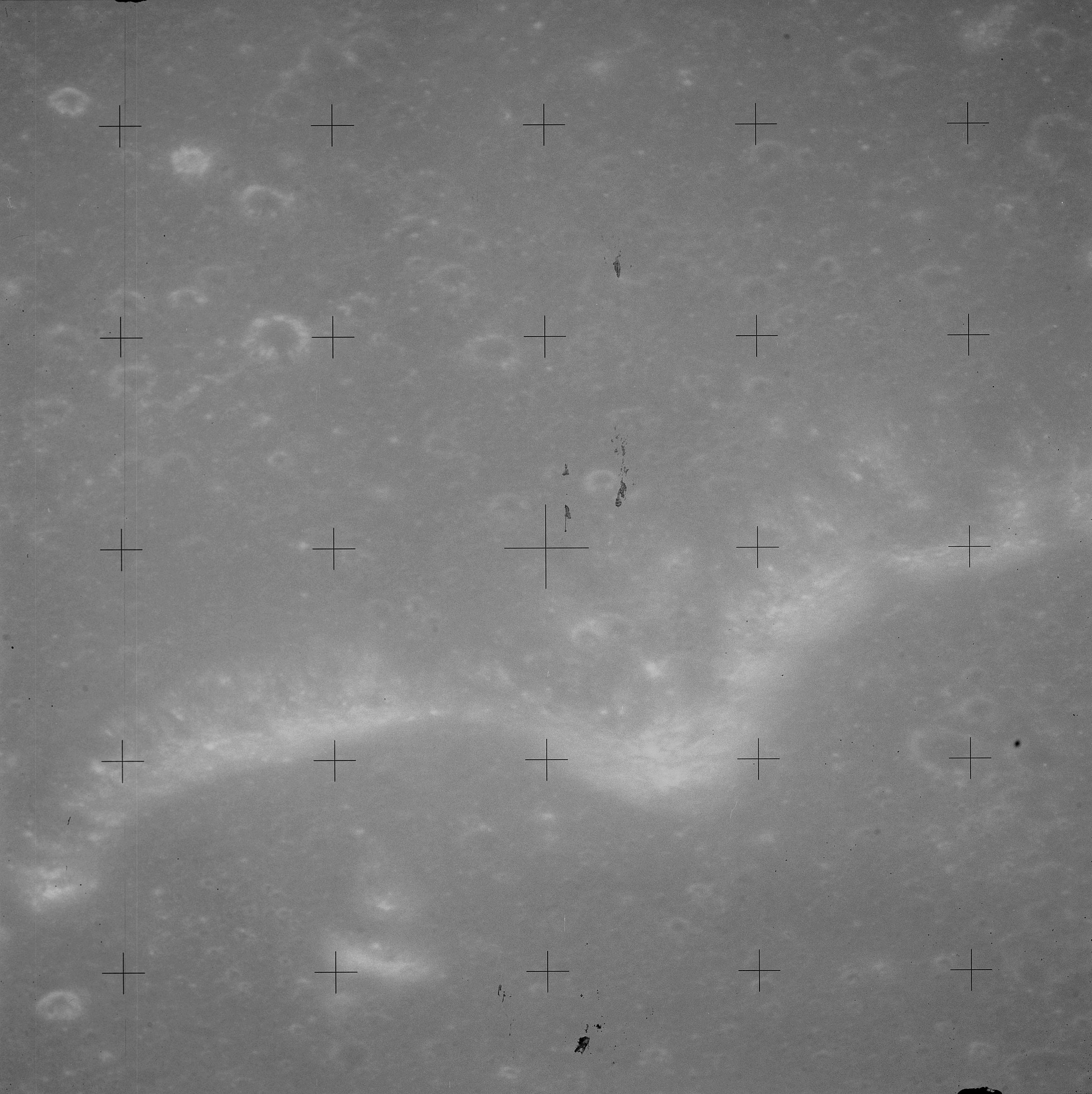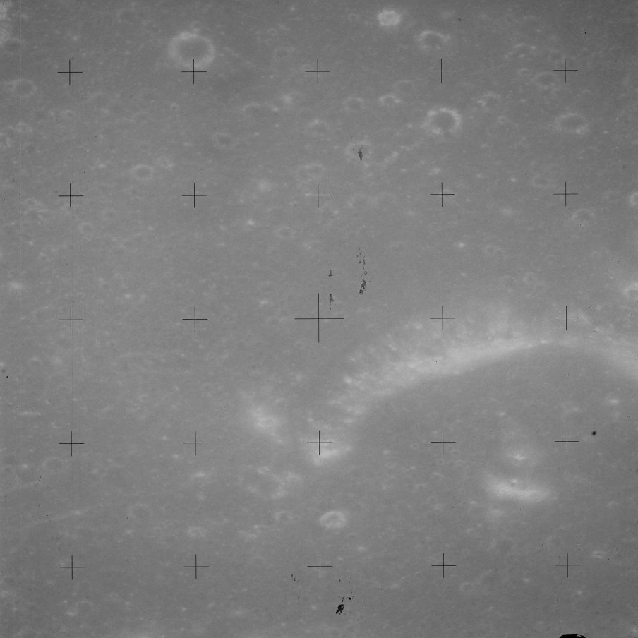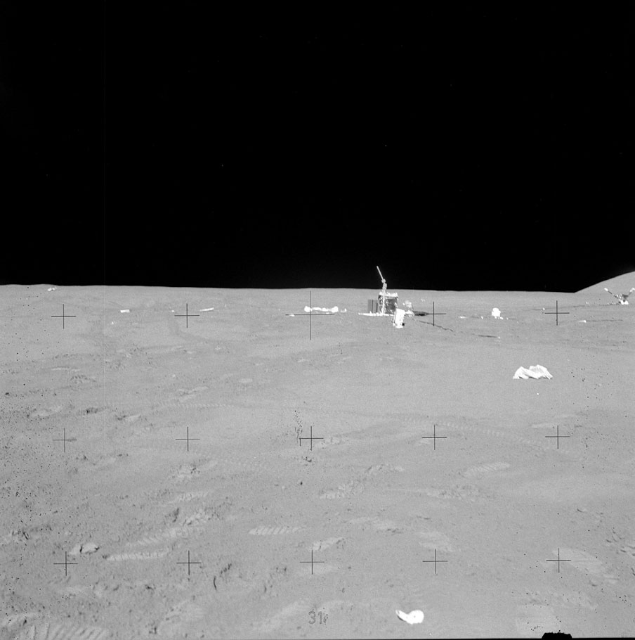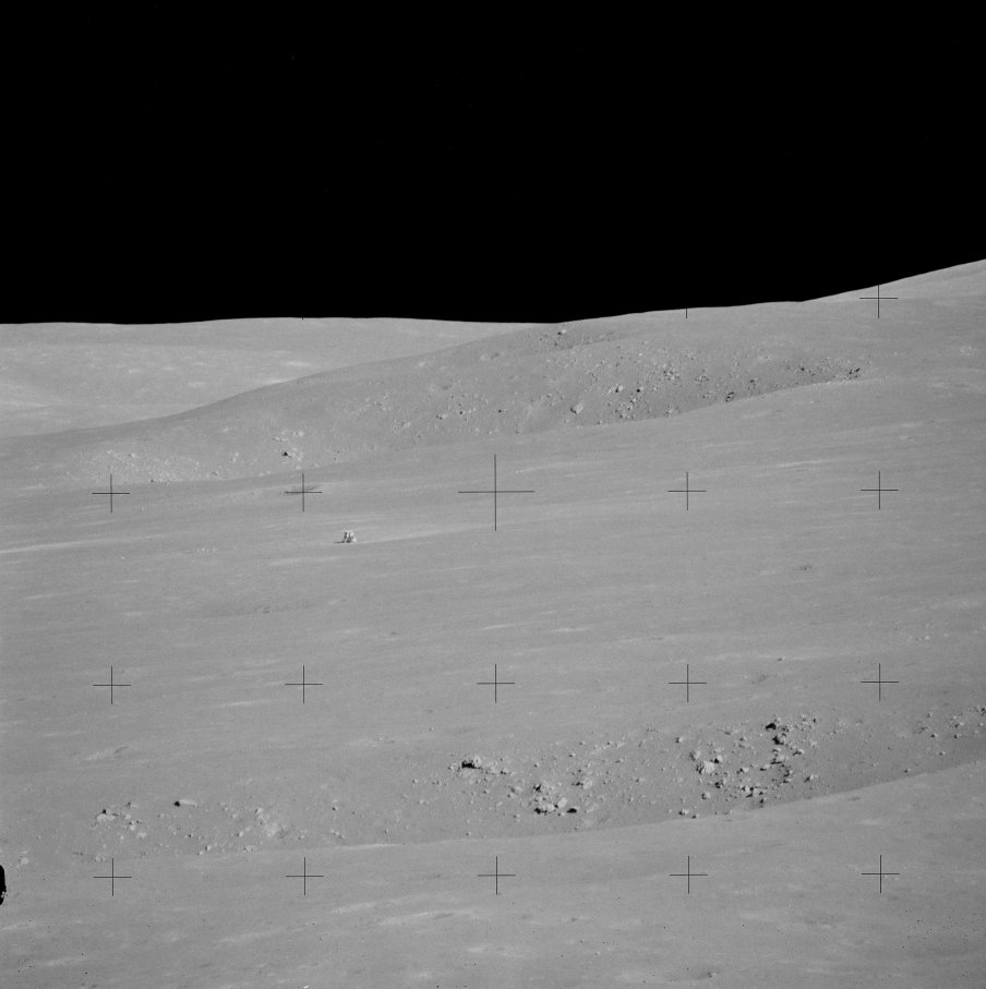 John Pfannerstill scanned a portion of Pan Camera frame 9430, which was taken during CSM Rev 27 at 23:52:54.7 GMT/UTC on 31 July 1971 from an altitude of 102.82 km. The Ground Elapsed Time was 130:18:54, which was during the period after EVA-1 when Dave and Jim were recharging their PLSSs. The LM can be seen near the center of a detail.Rev 33 Mapping (Metric) Camera Frame 1134 ( 13 Mb )