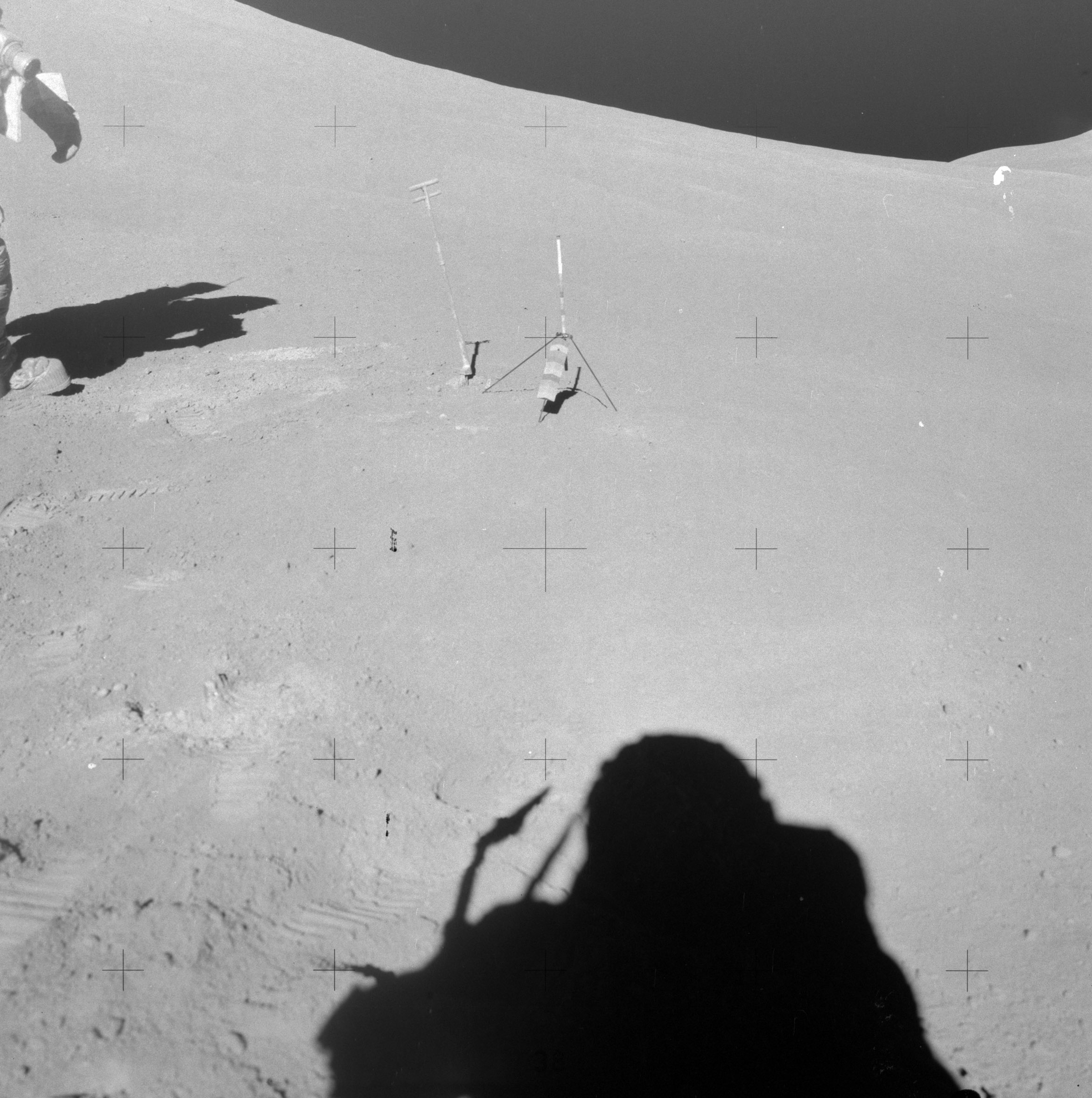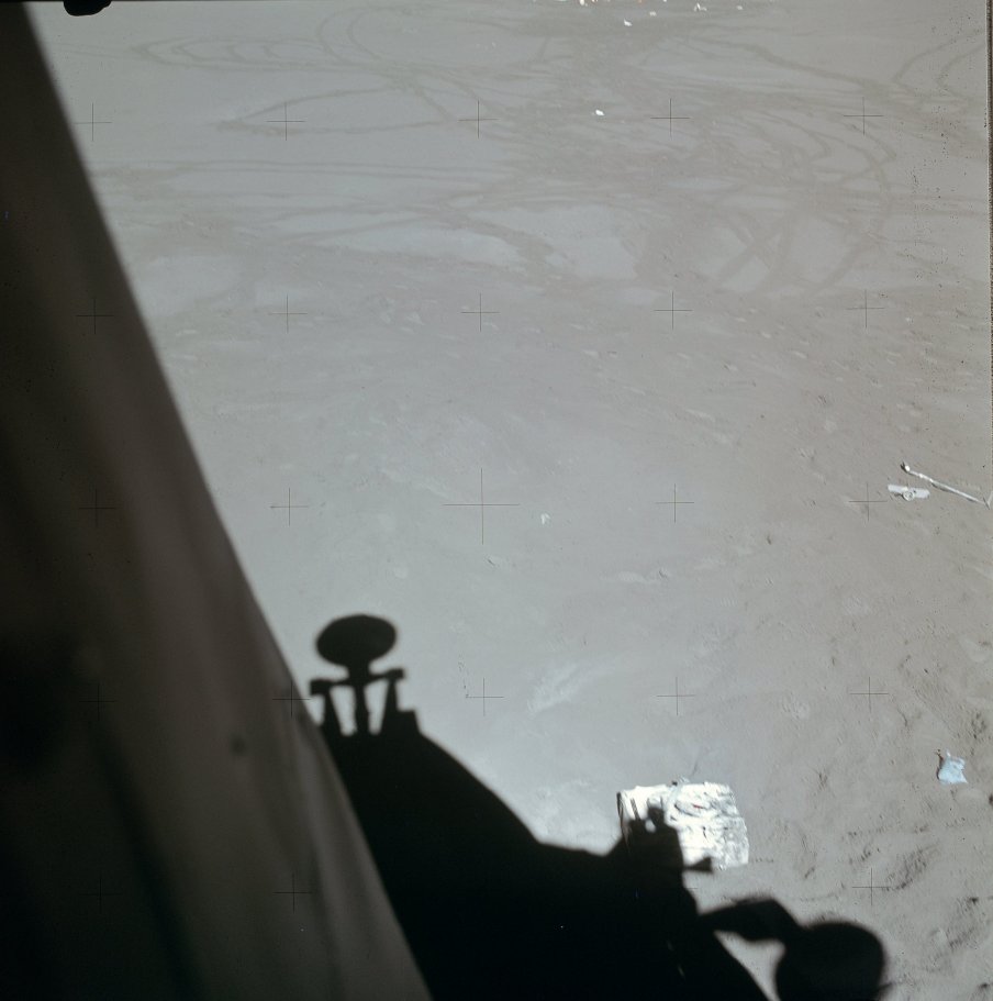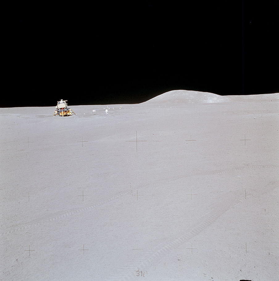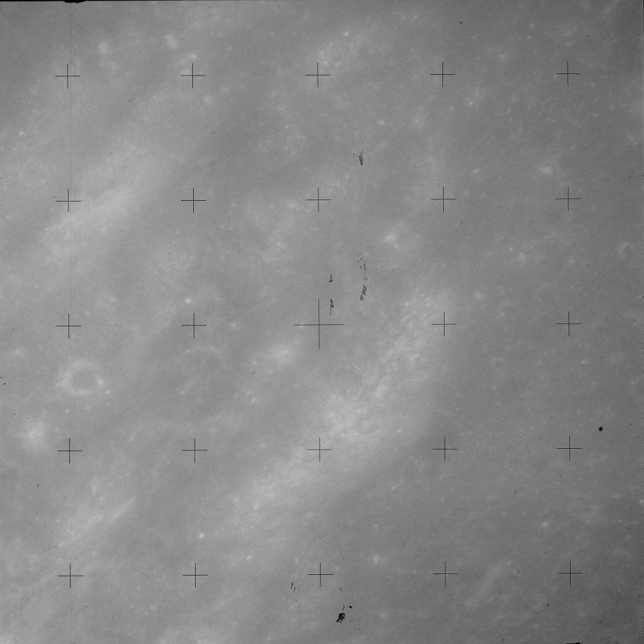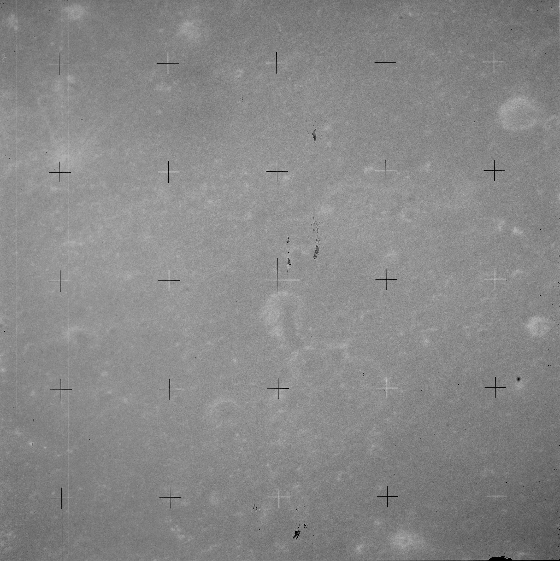John Pfannerstill scanned a portion of Pan Camera frame 9430, which was taken during CSM Rev 27 at 23:52:54.7 GMT/UTC on 31 July 1971 from an altitude of 102.82 km. The Ground Elapsed Time was 130:18:54, which was during the period after EVA-1 when Dave and Jim were recharging their PLSSs. The LM can be seen near the center of a detail.Rev 33 Mapping (Metric) Camera Frame 1134 ( 13 Mb )