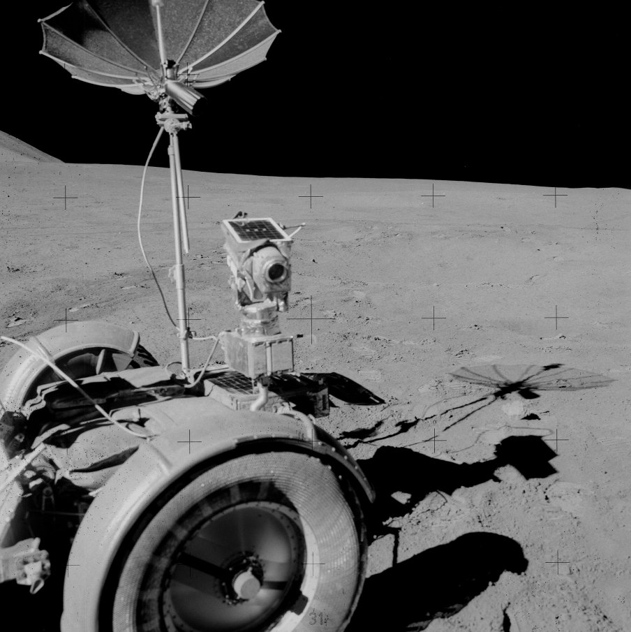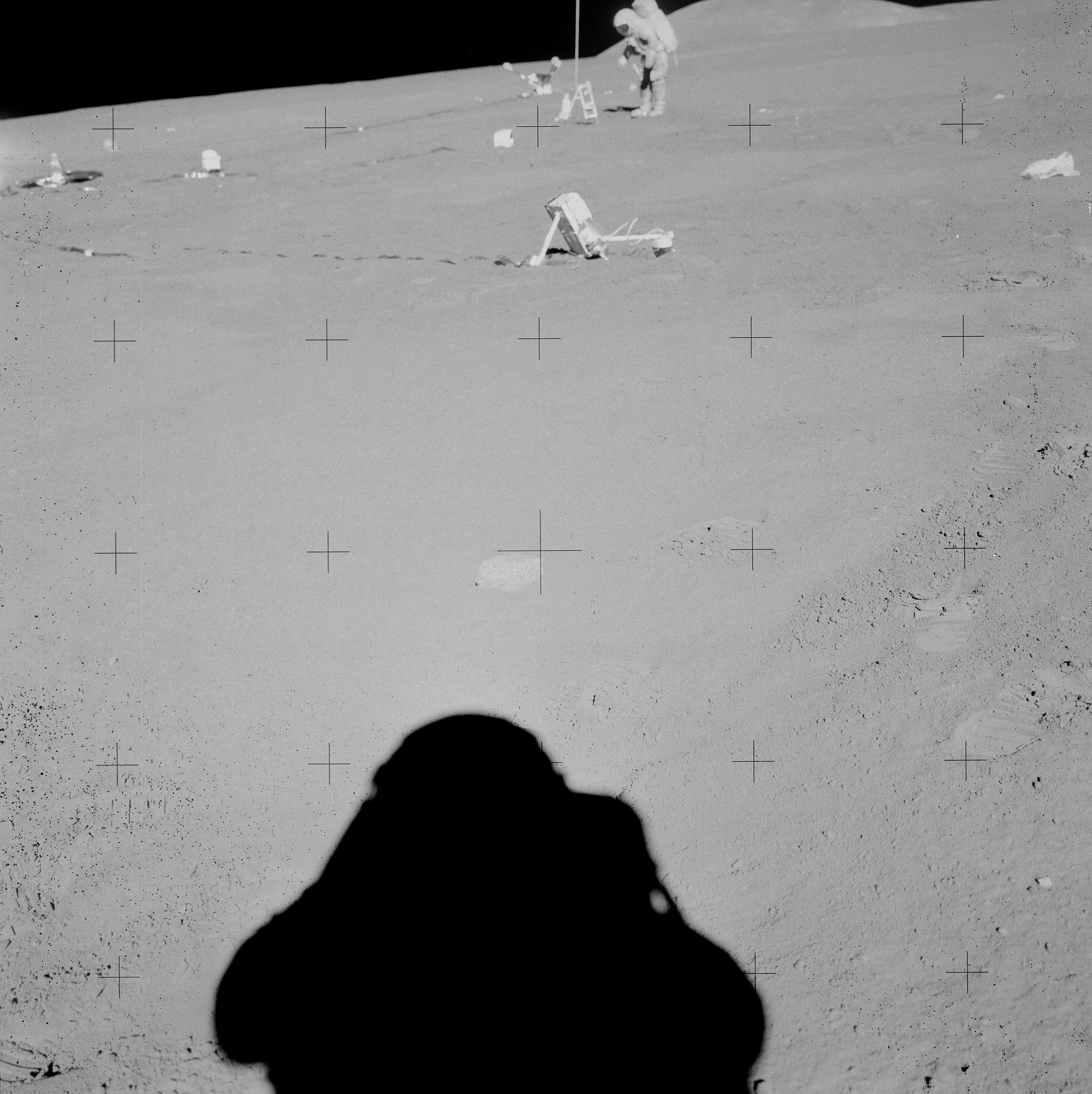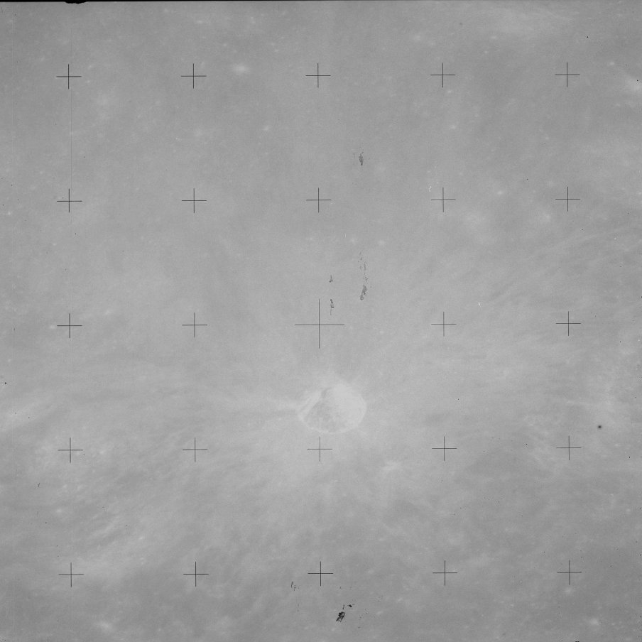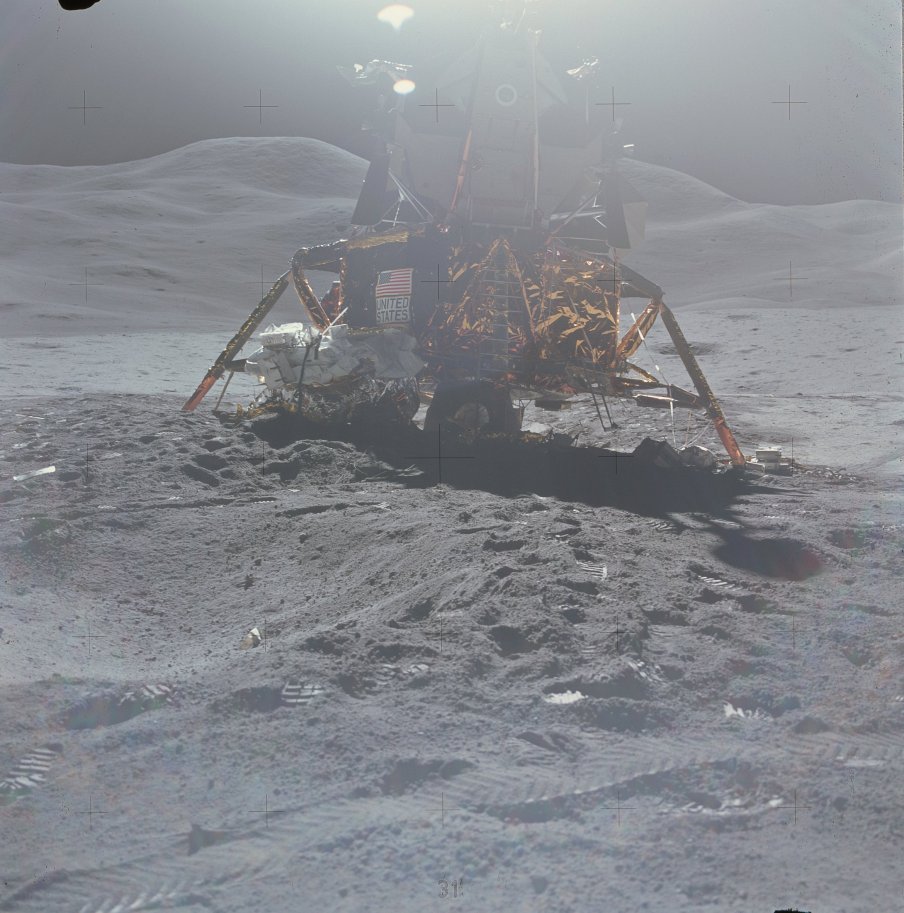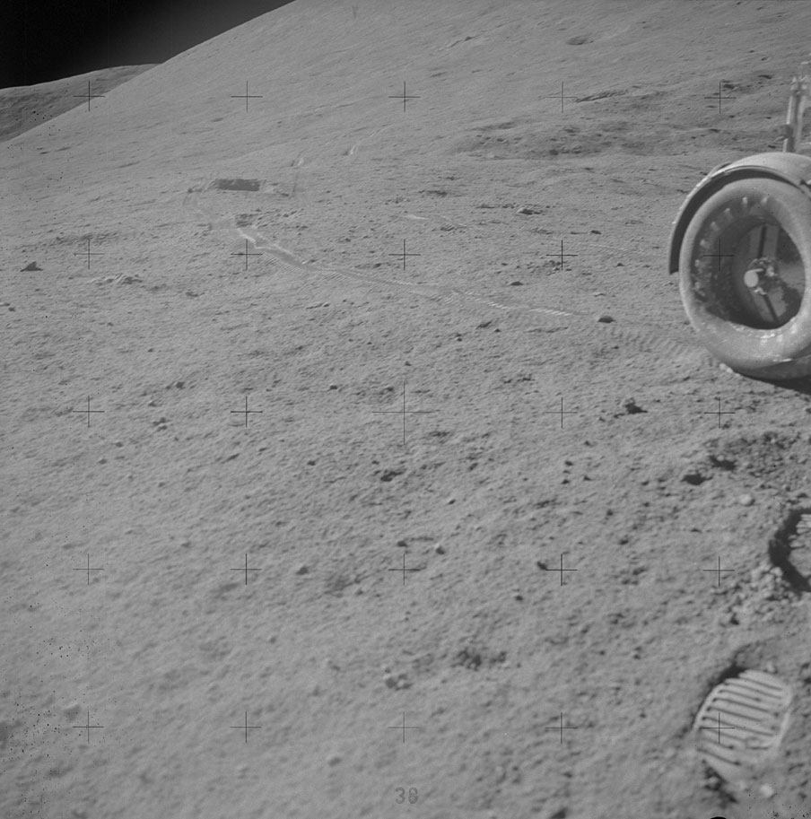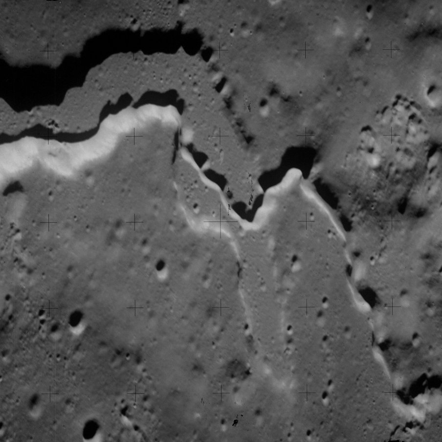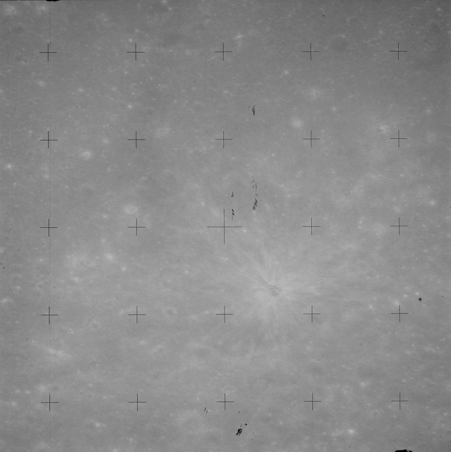 John Pfannerstill scanned a portion of Pan Camera frame 9430, which was taken during CSM Rev 27 at 23:52:54.7 GMT/UTC on 31 July 1971 from an altitude of 102.82 km. The Ground Elapsed Time was 130:18:54, which was during the period after EVA-1 when Dave and Jim were recharging their PLSSs. The LM can be seen near the center of a detail.Rev 33 Mapping (Metric) Camera Frame 1134 ( 13 Mb )