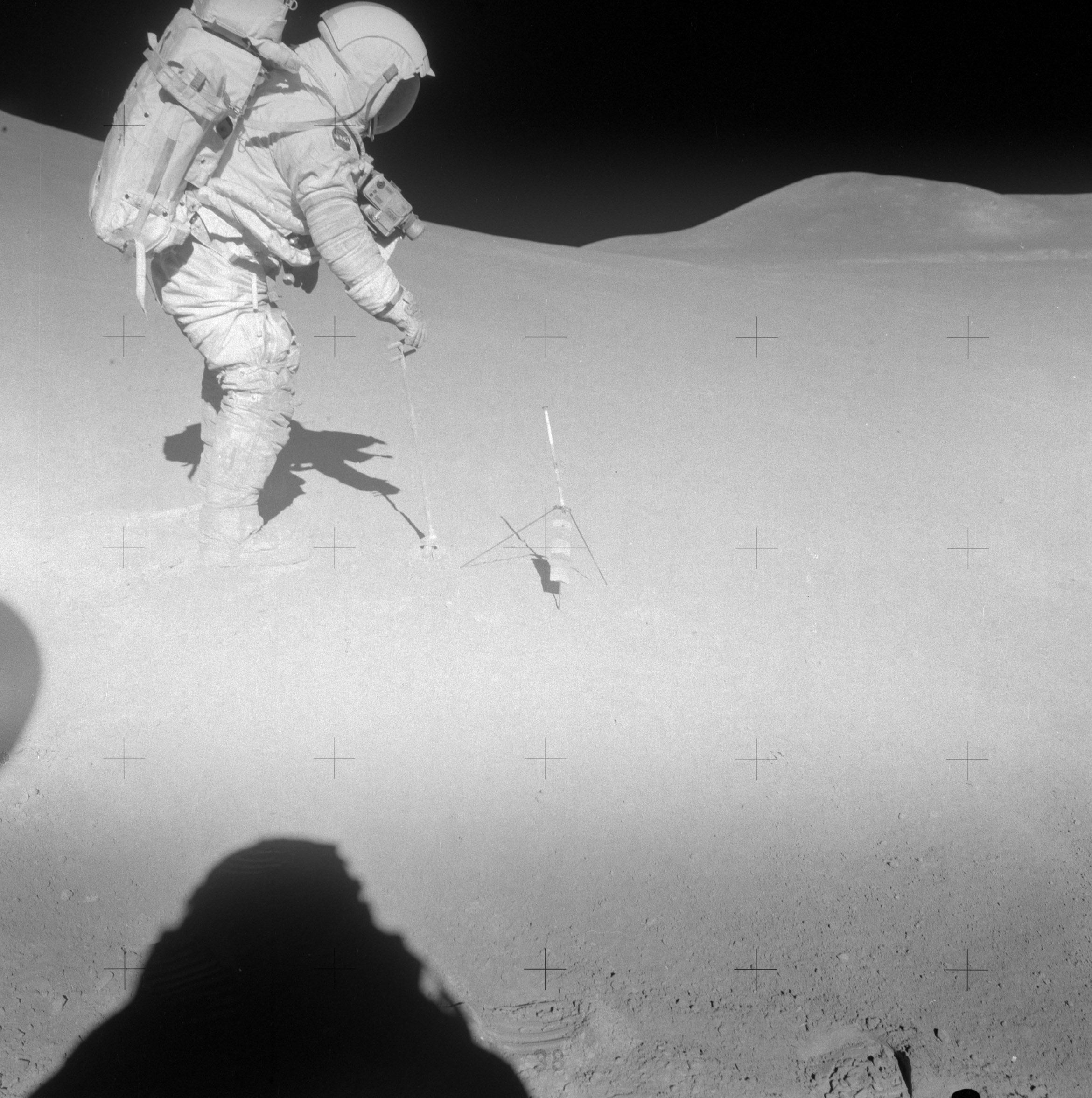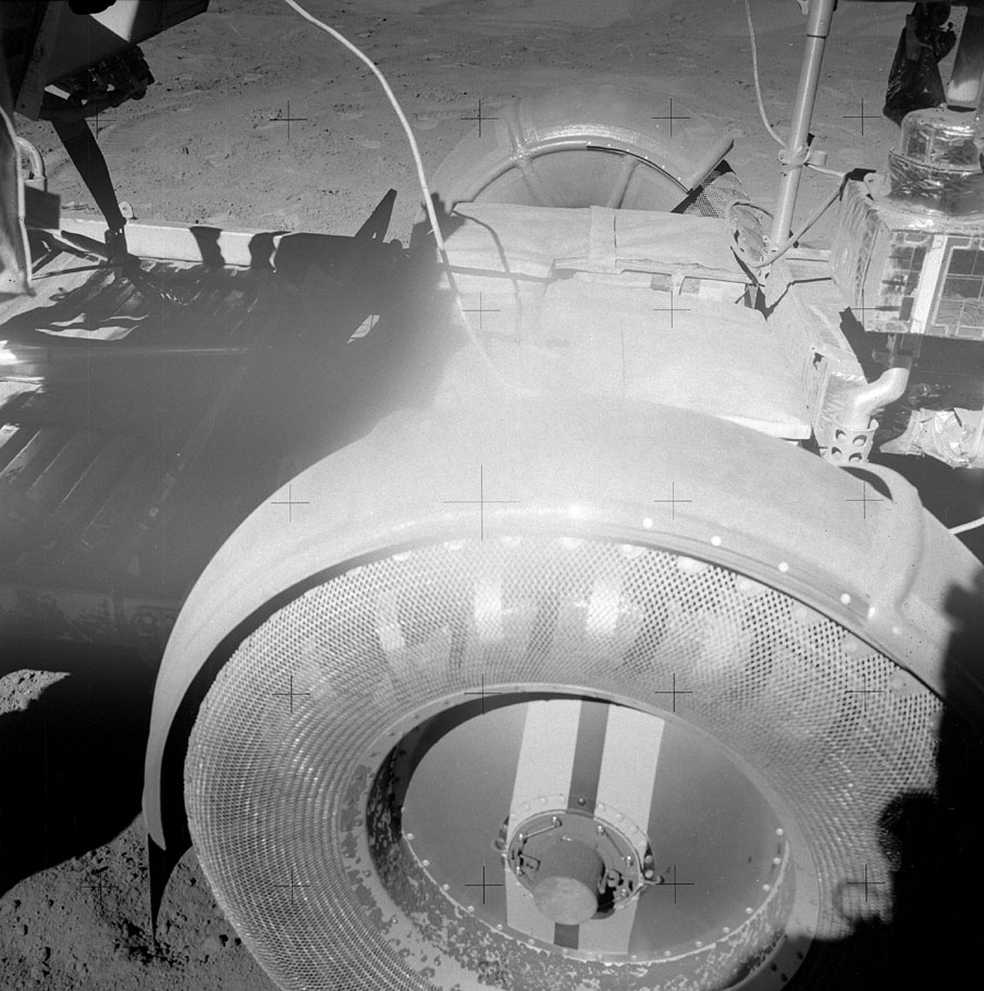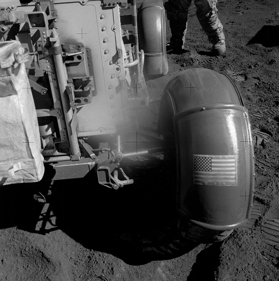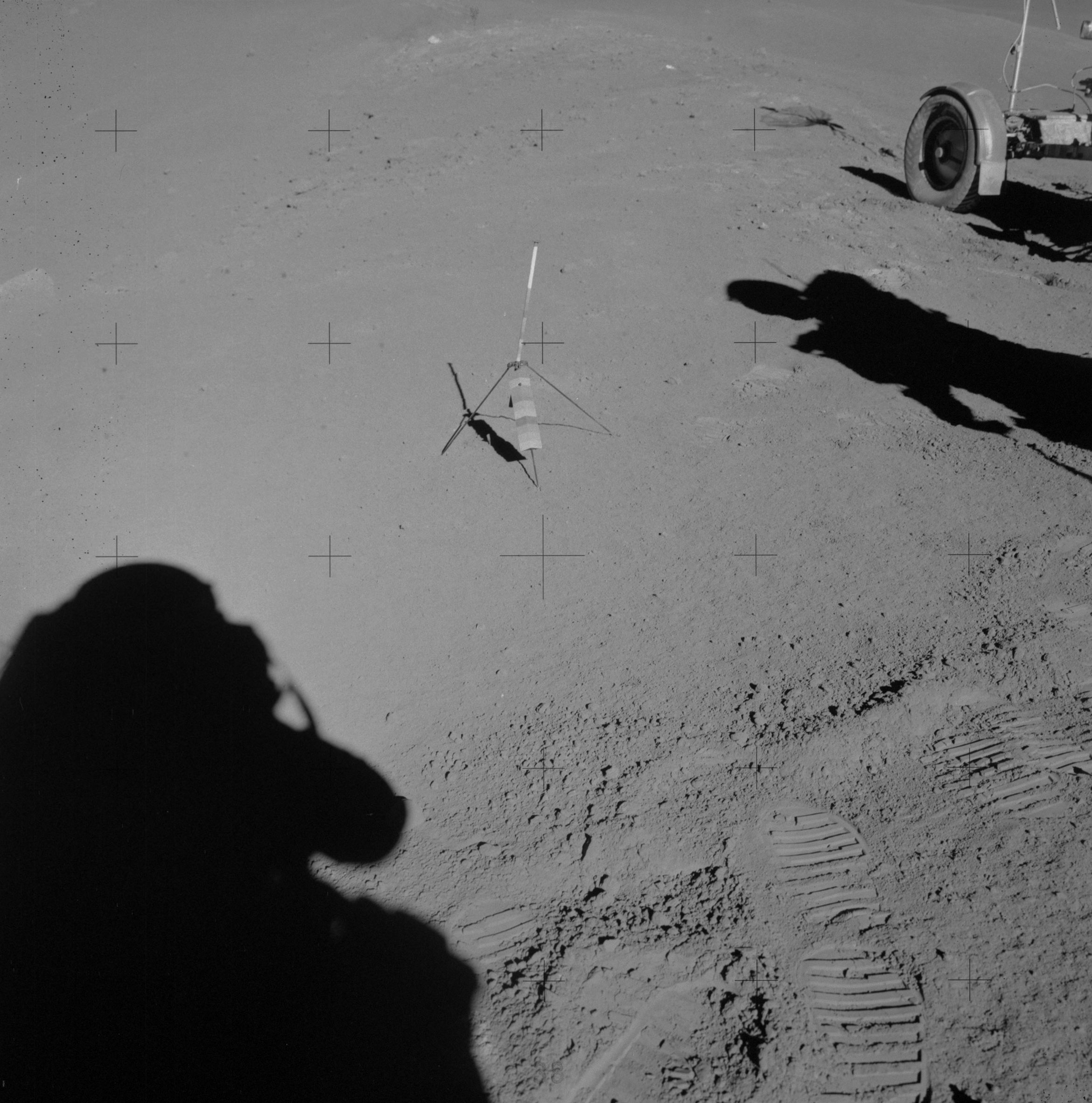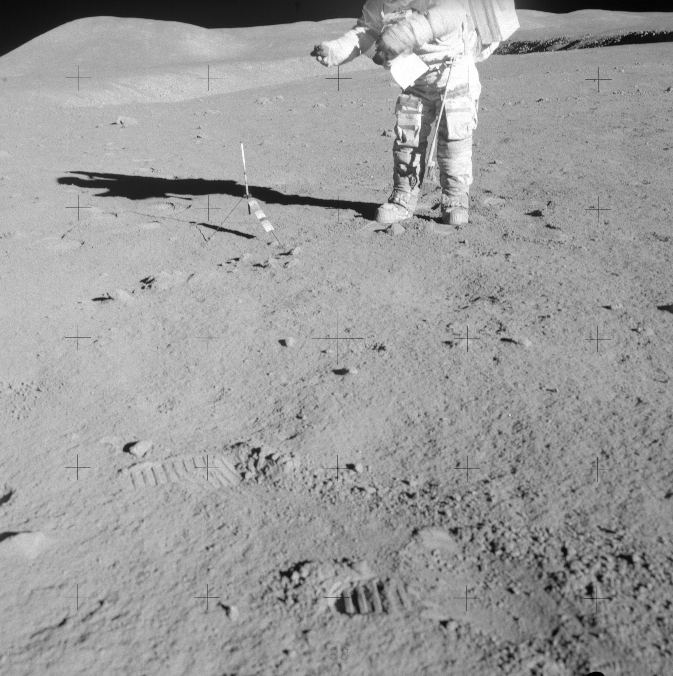 John Pfannerstill scanned a portion of Pan Camera frame 9430, which was taken during CSM Rev 27 at 23:52:54.7 GMT/UTC on 31 July 1971 from an altitude of 102.82 km. The Ground Elapsed Time was 130:18:54, which was during the period after EVA-1 when Dave and Jim were recharging their PLSSs. The LM can be seen near the center of a detail.Rev 33 Mapping (Metric) Camera Frame 1134 ( 13 Mb )