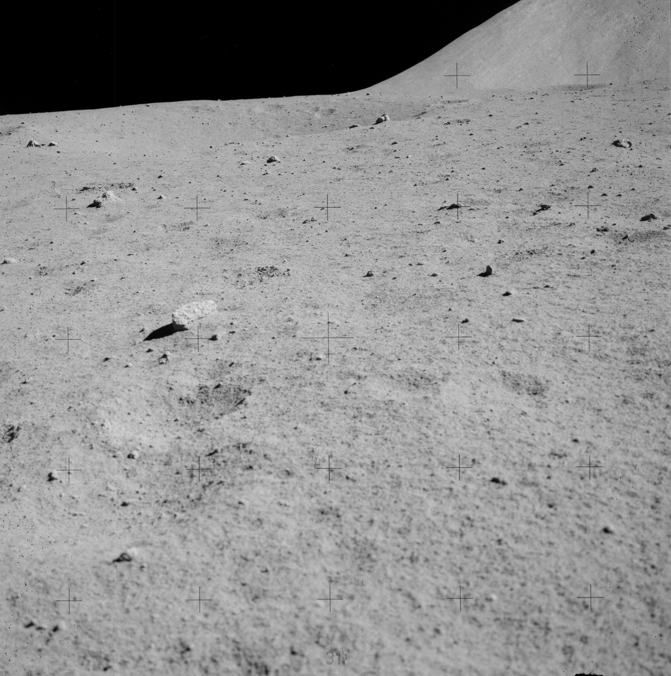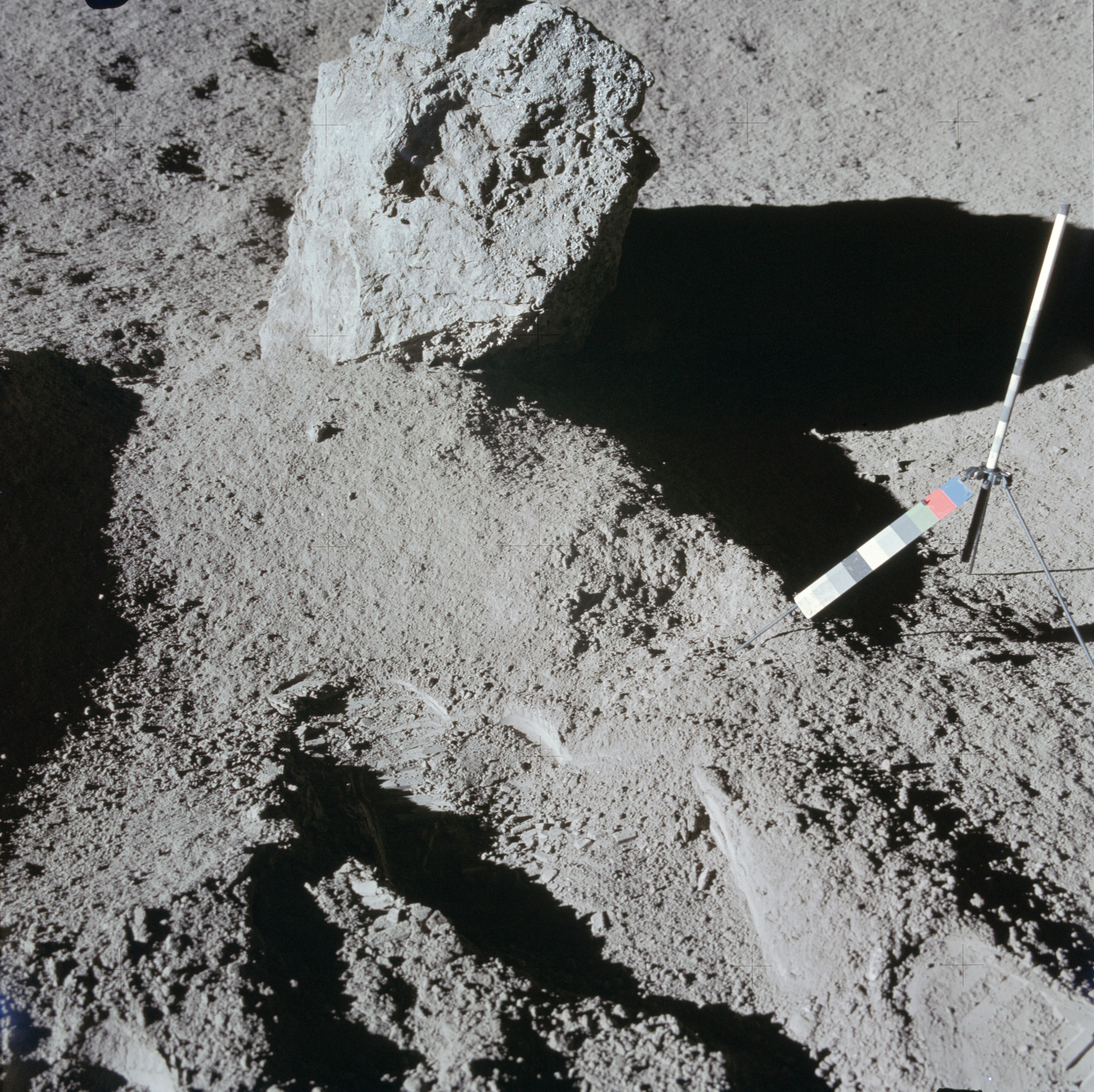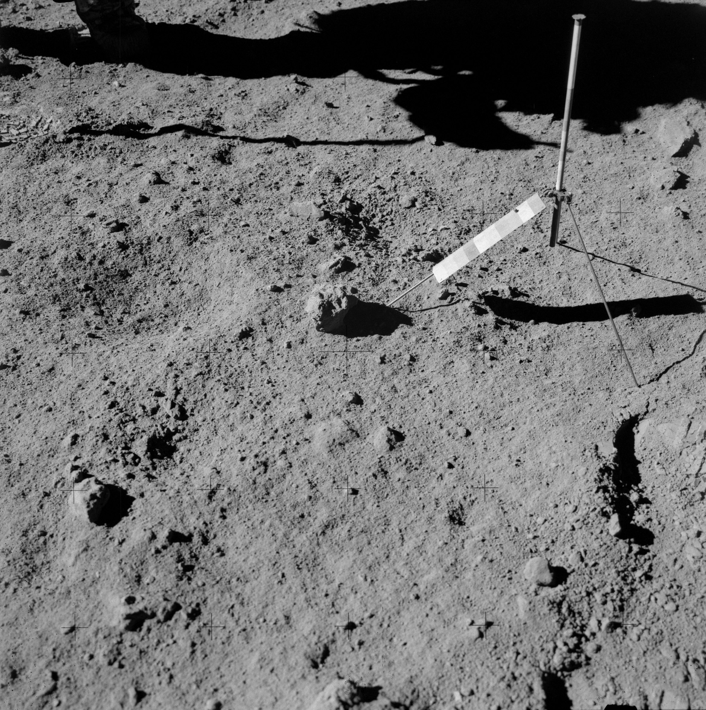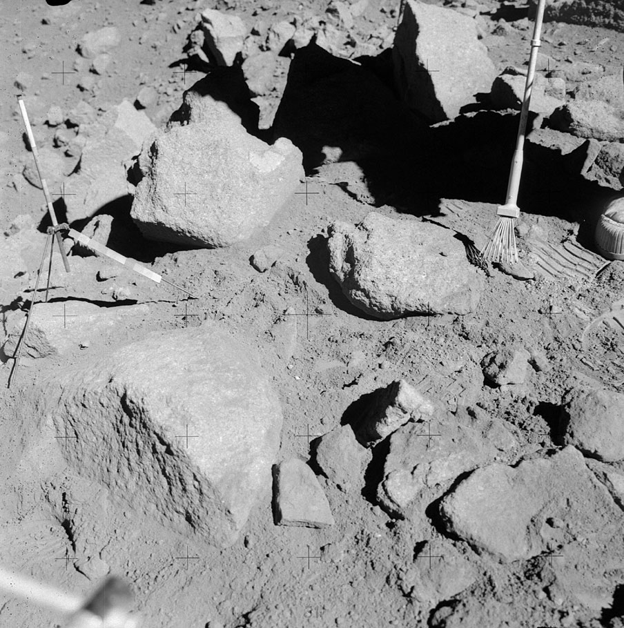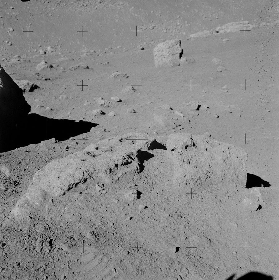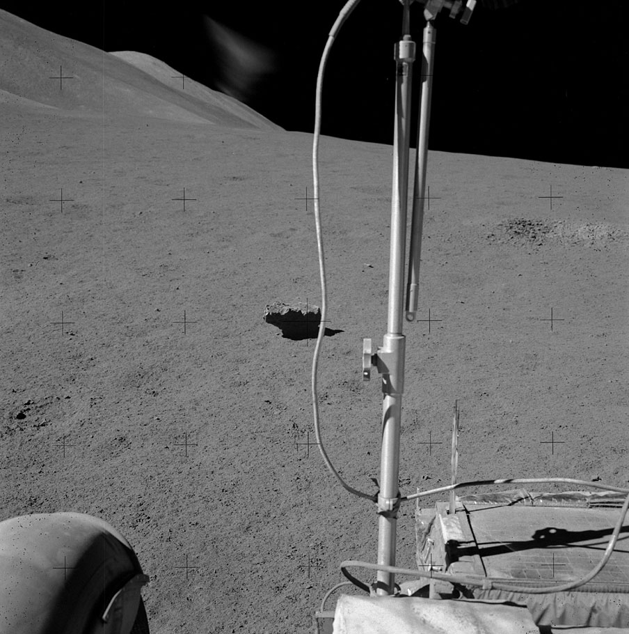 Seventh view of Great Scott. Black and white image. The cube at the lower right is one inch (2.54 cm) on eash side.S71-44778 (5 Mb or 0.4 Mb)