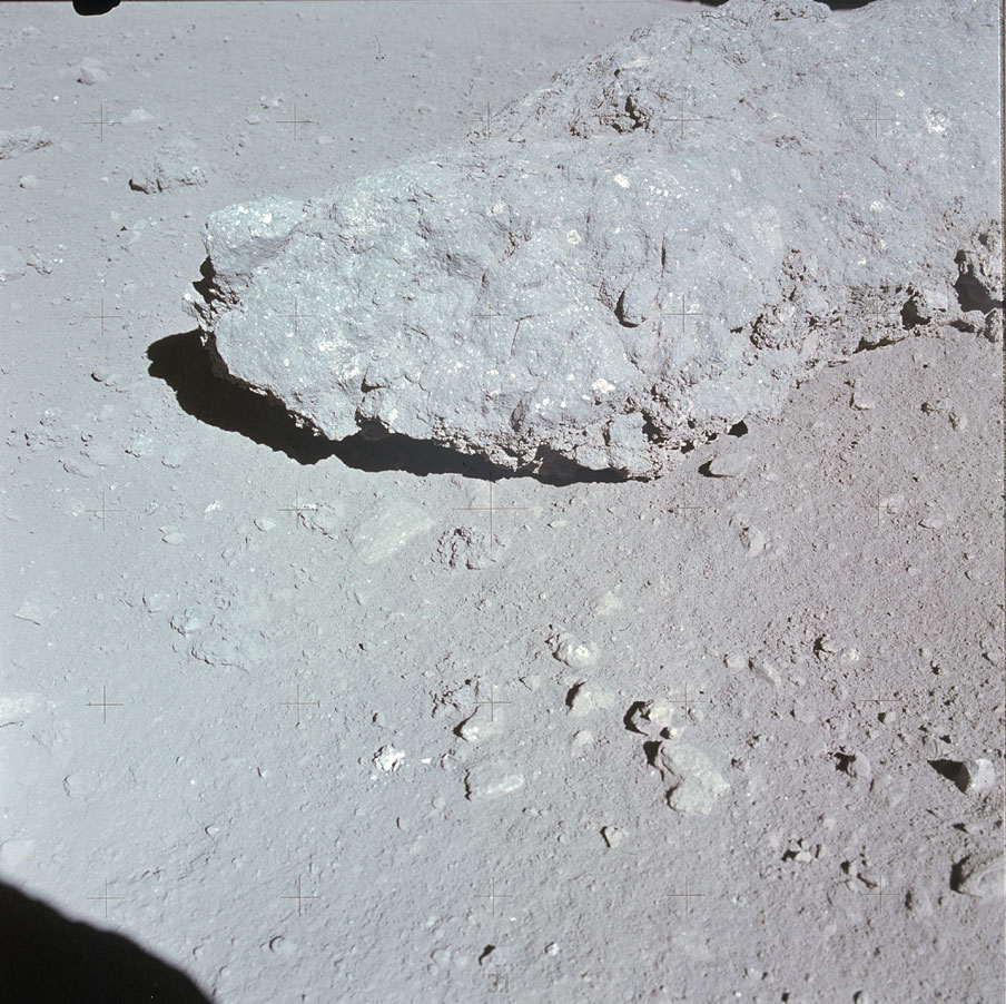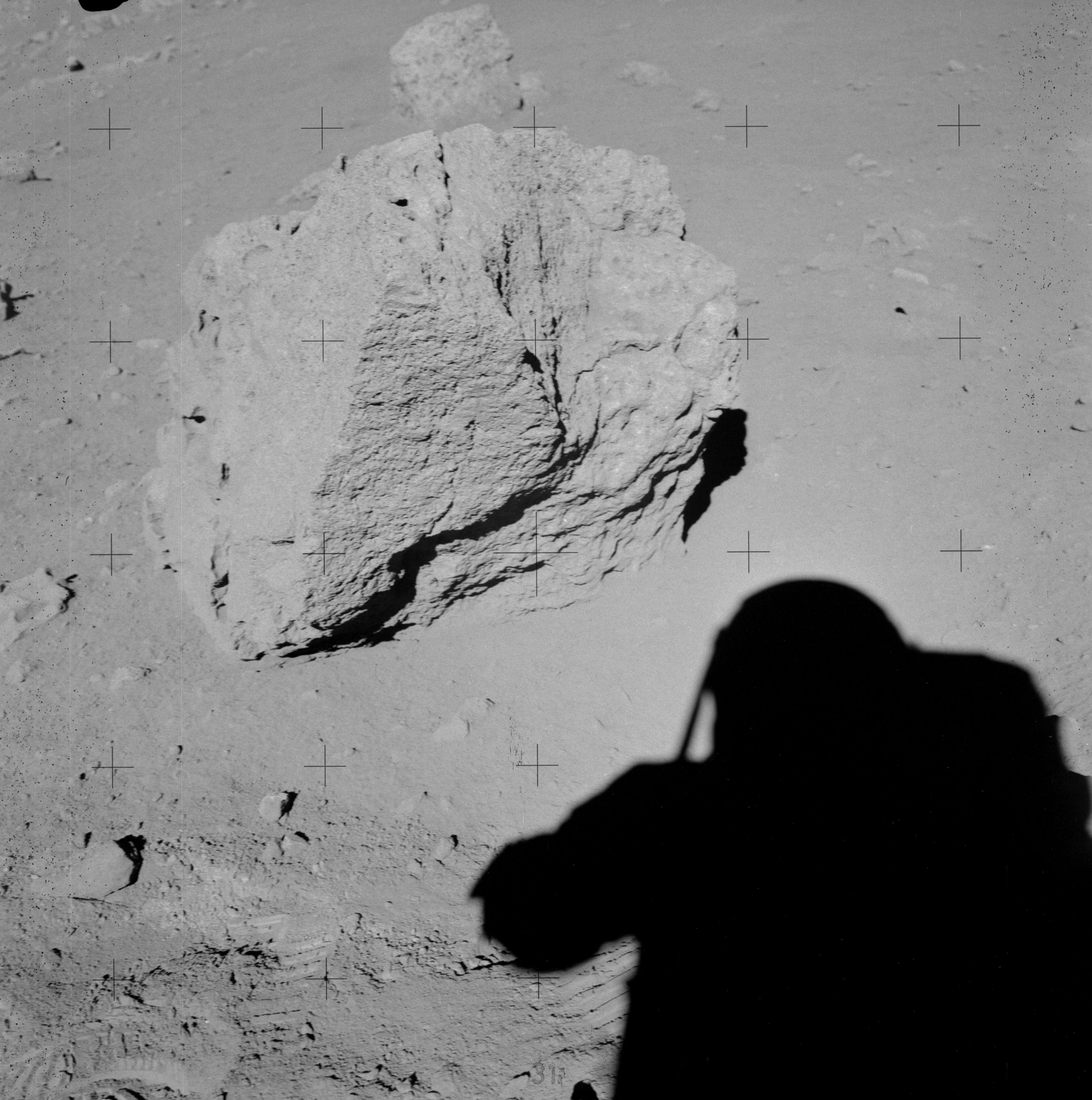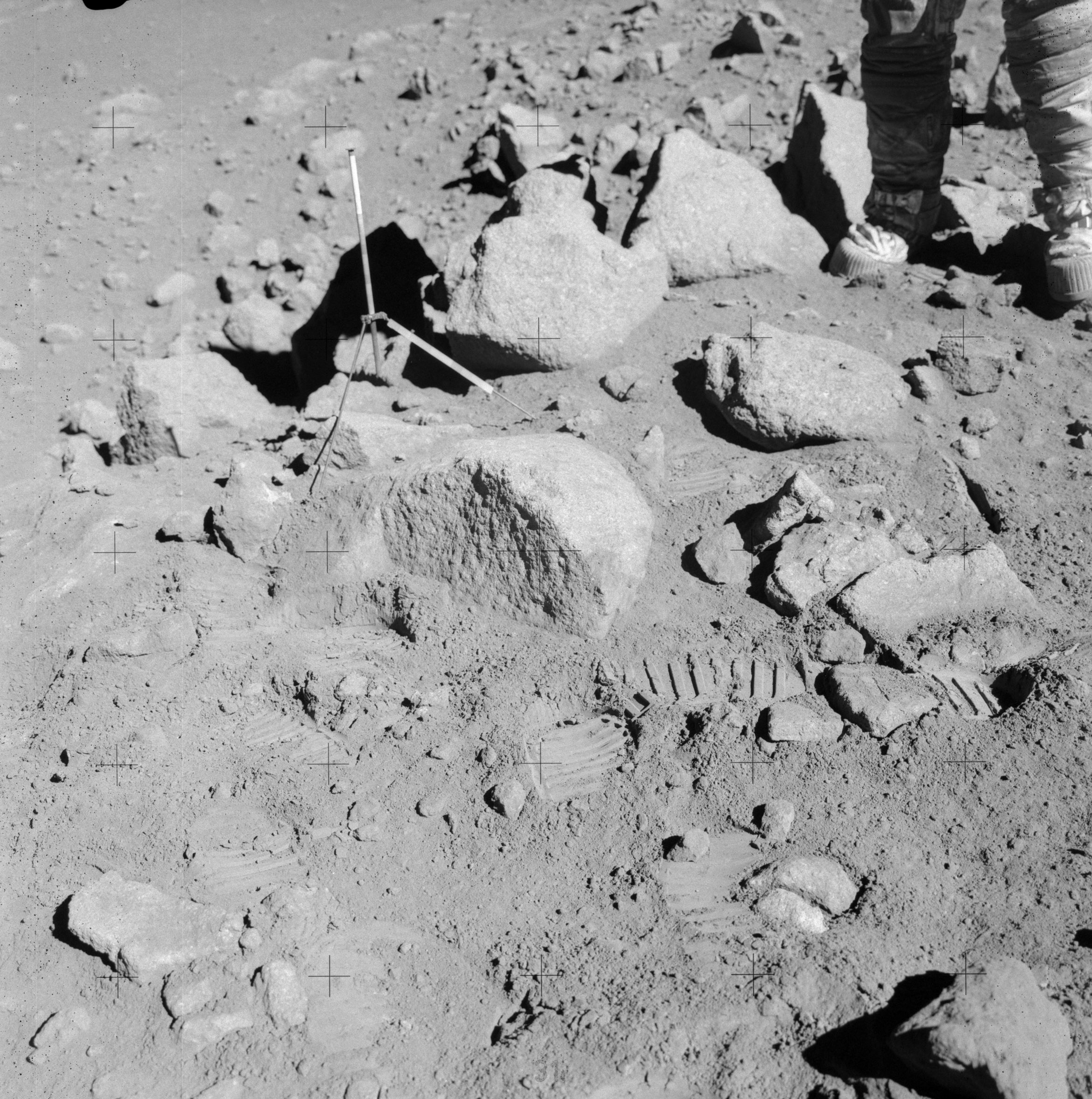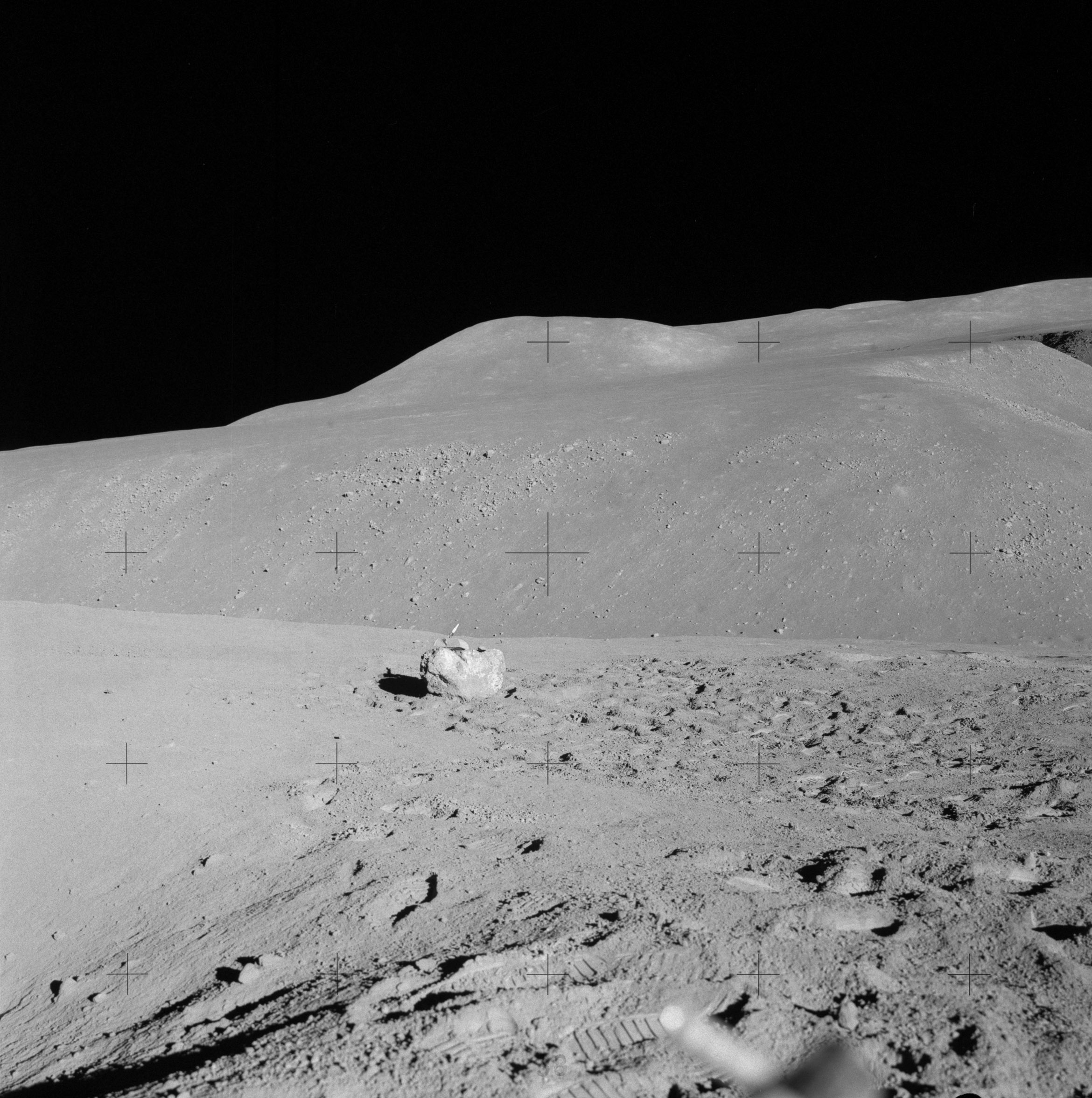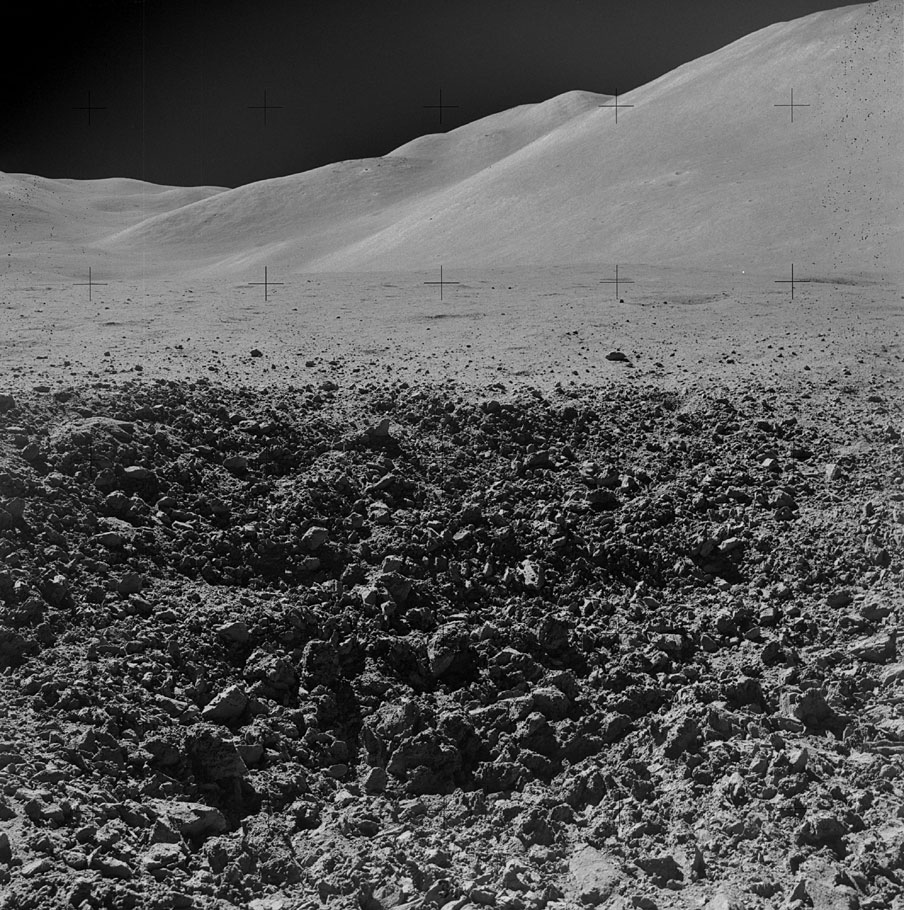 Seventh view of Great Scott. Black and white image. The cube at the lower right is one inch (2.54 cm) on eash side.S71-44778 (5 Mb or 0.4 Mb)