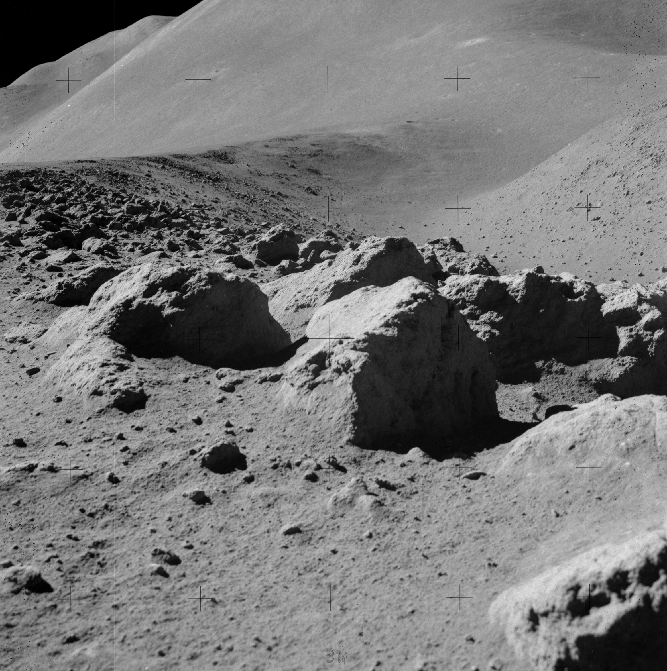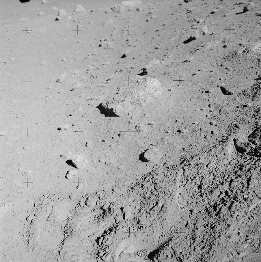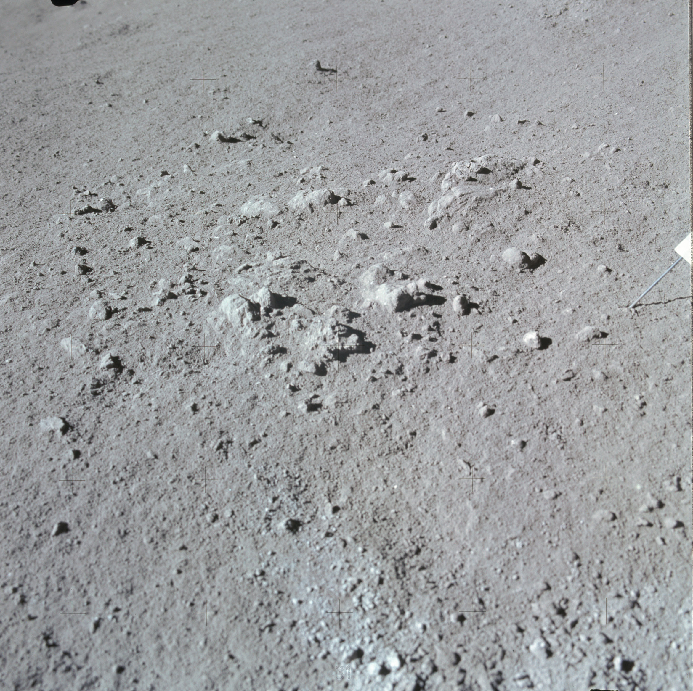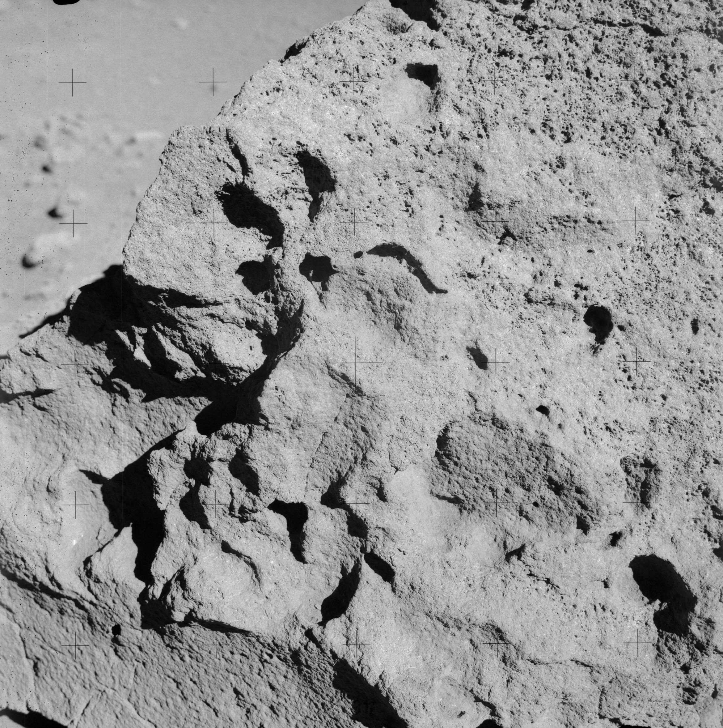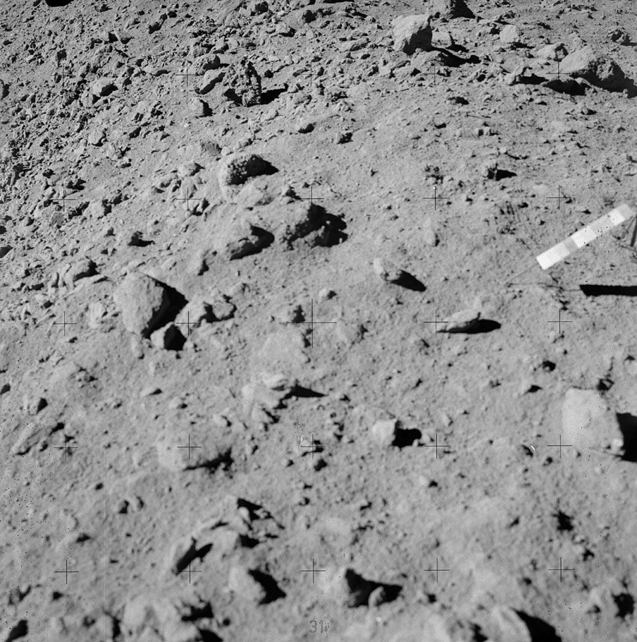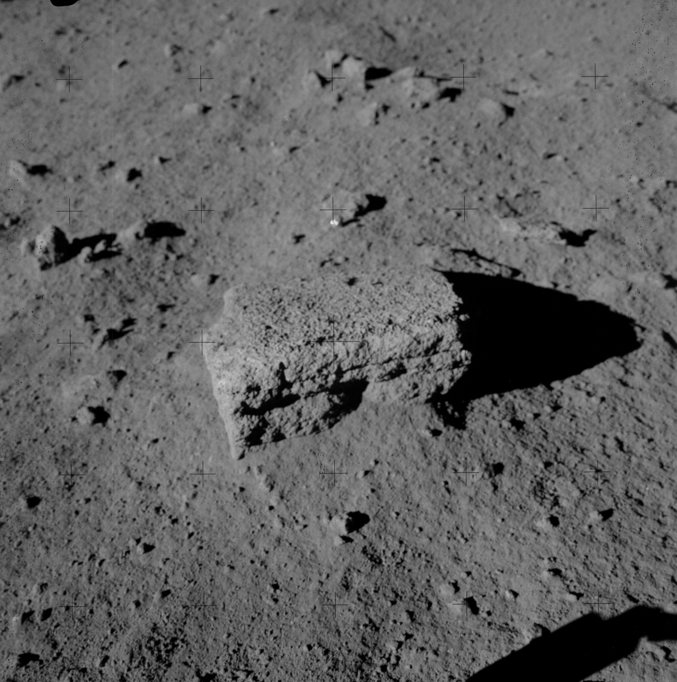 Seventh view of Great Scott. Black and white image. The cube at the lower right is one inch (2.54 cm) on eash side.S71-44778 (5 Mb or 0.4 Mb)