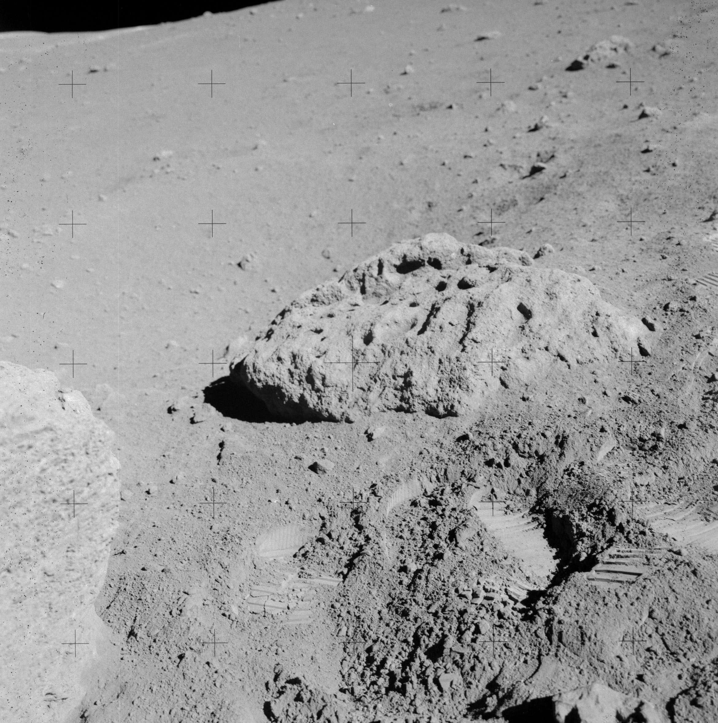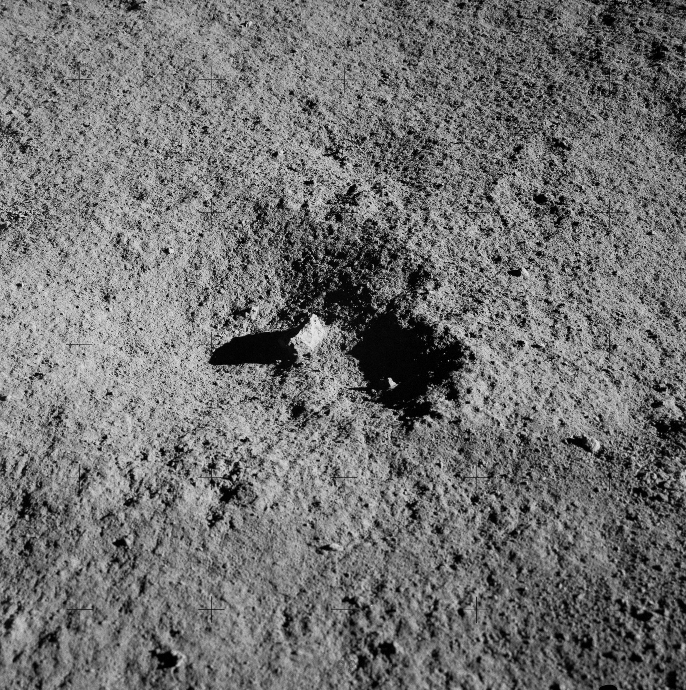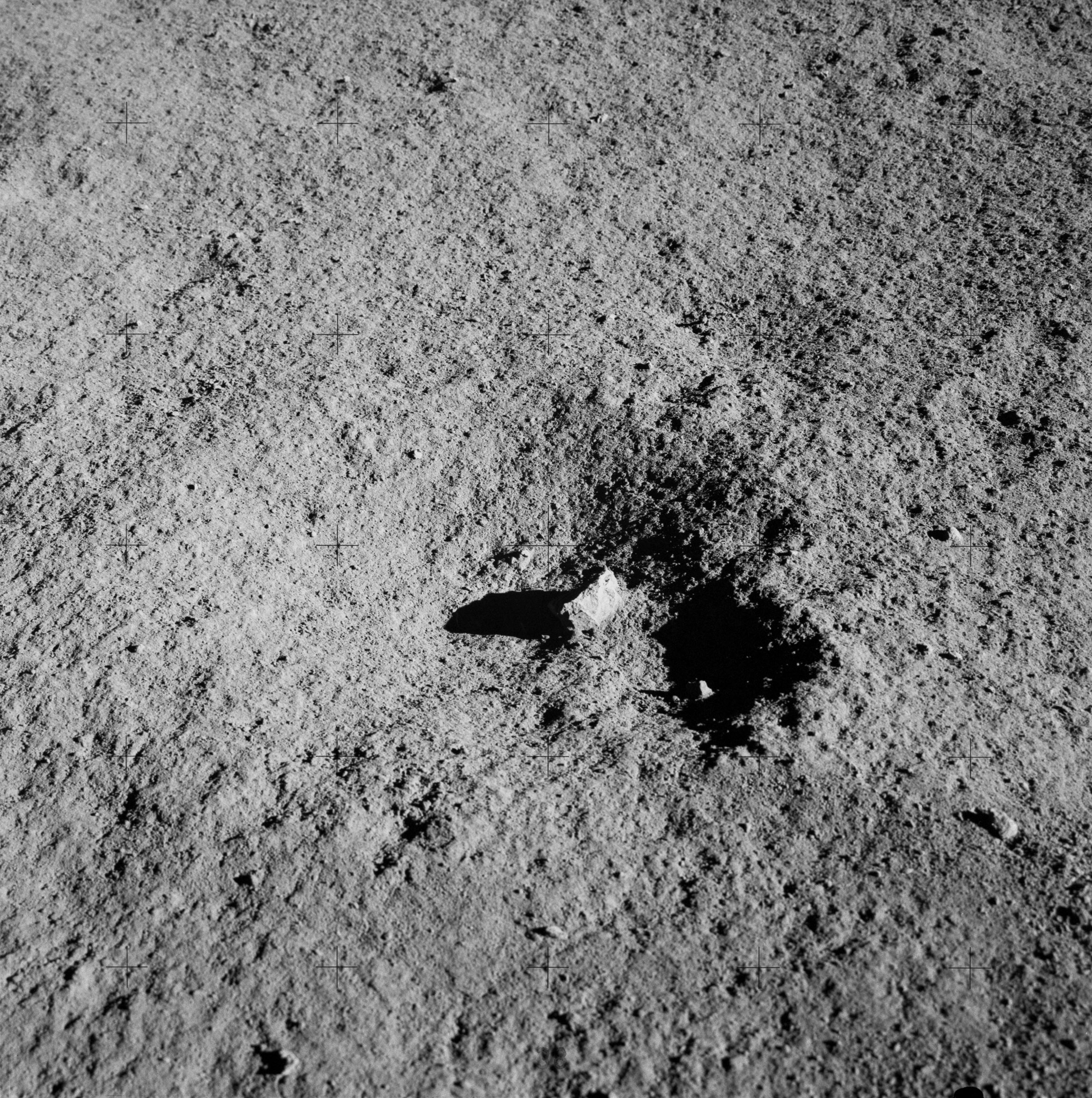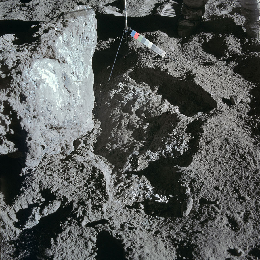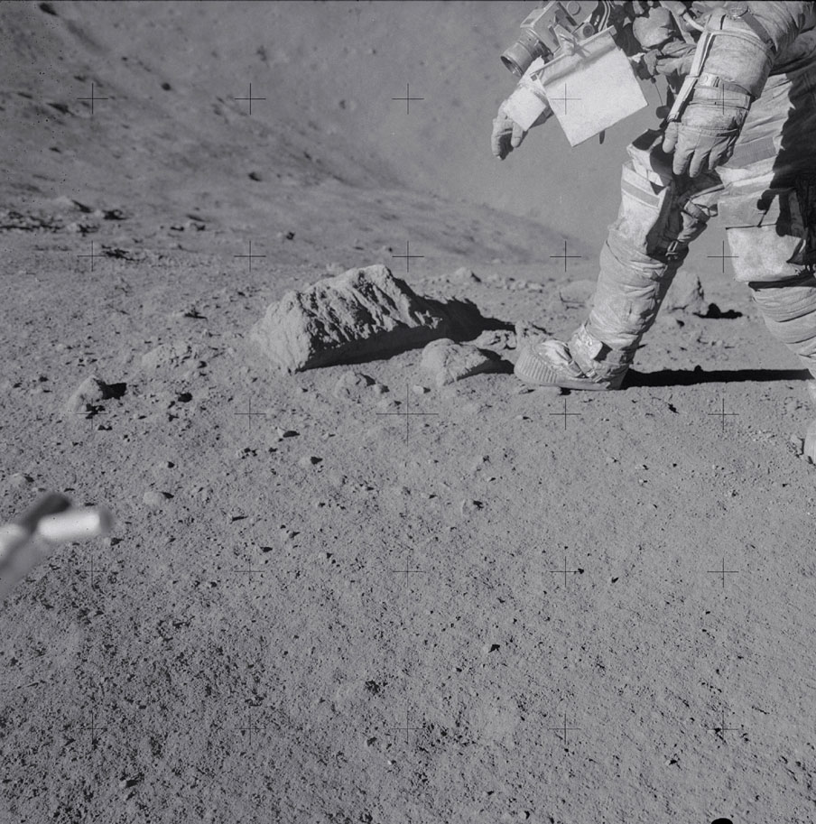 Seventh view of Great Scott. Black and white image. The cube at the lower right is one inch (2.54 cm) on eash side.S71-44778 (5 Mb or 0.4 Mb)