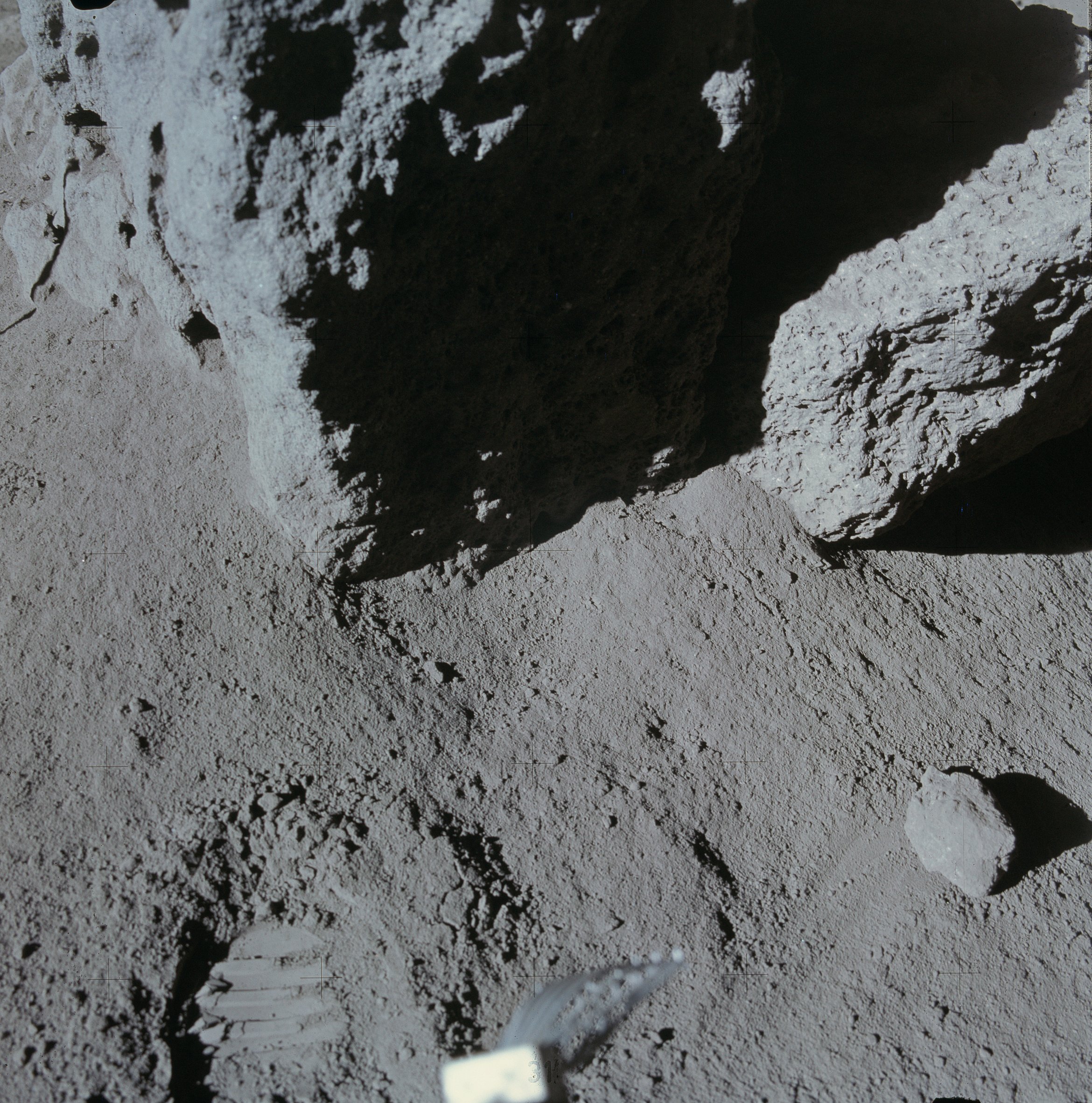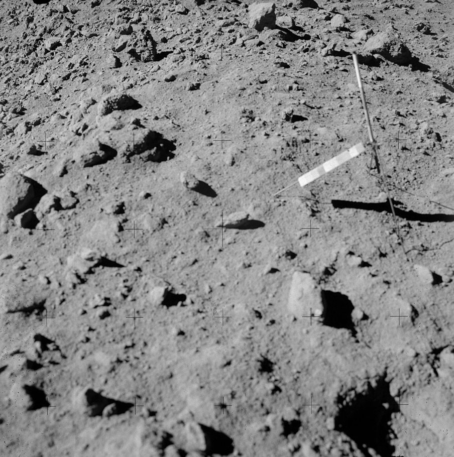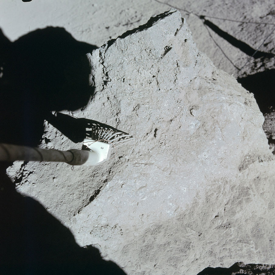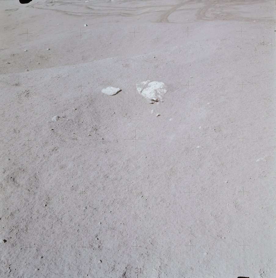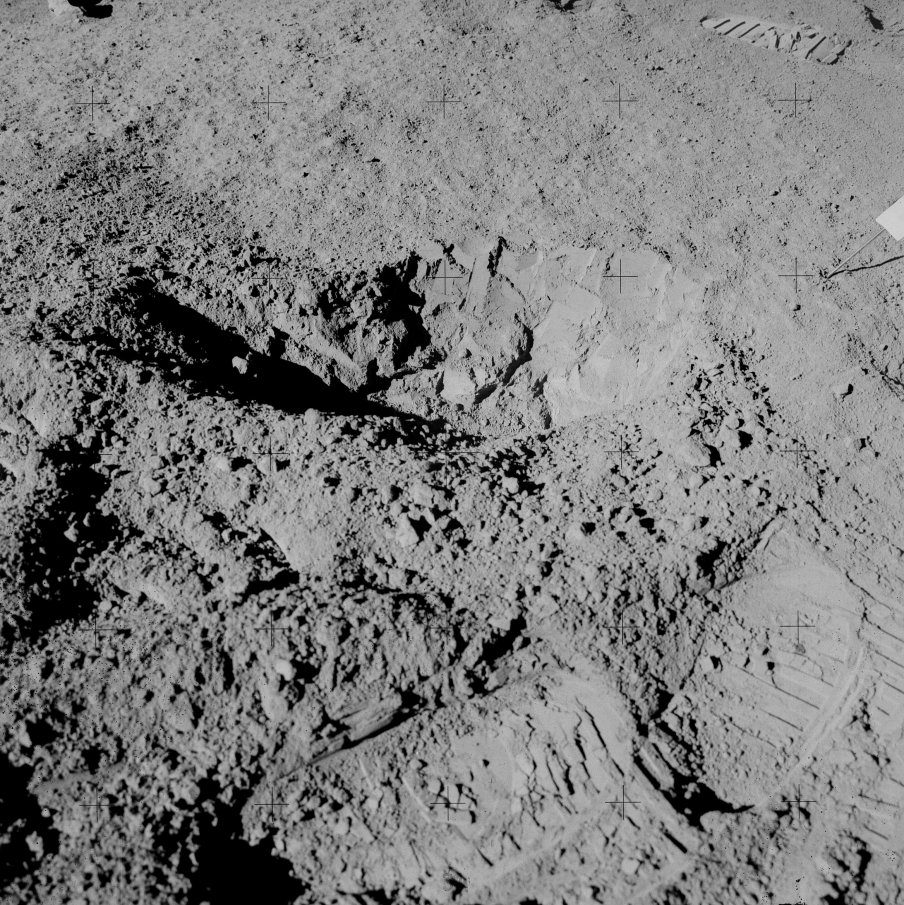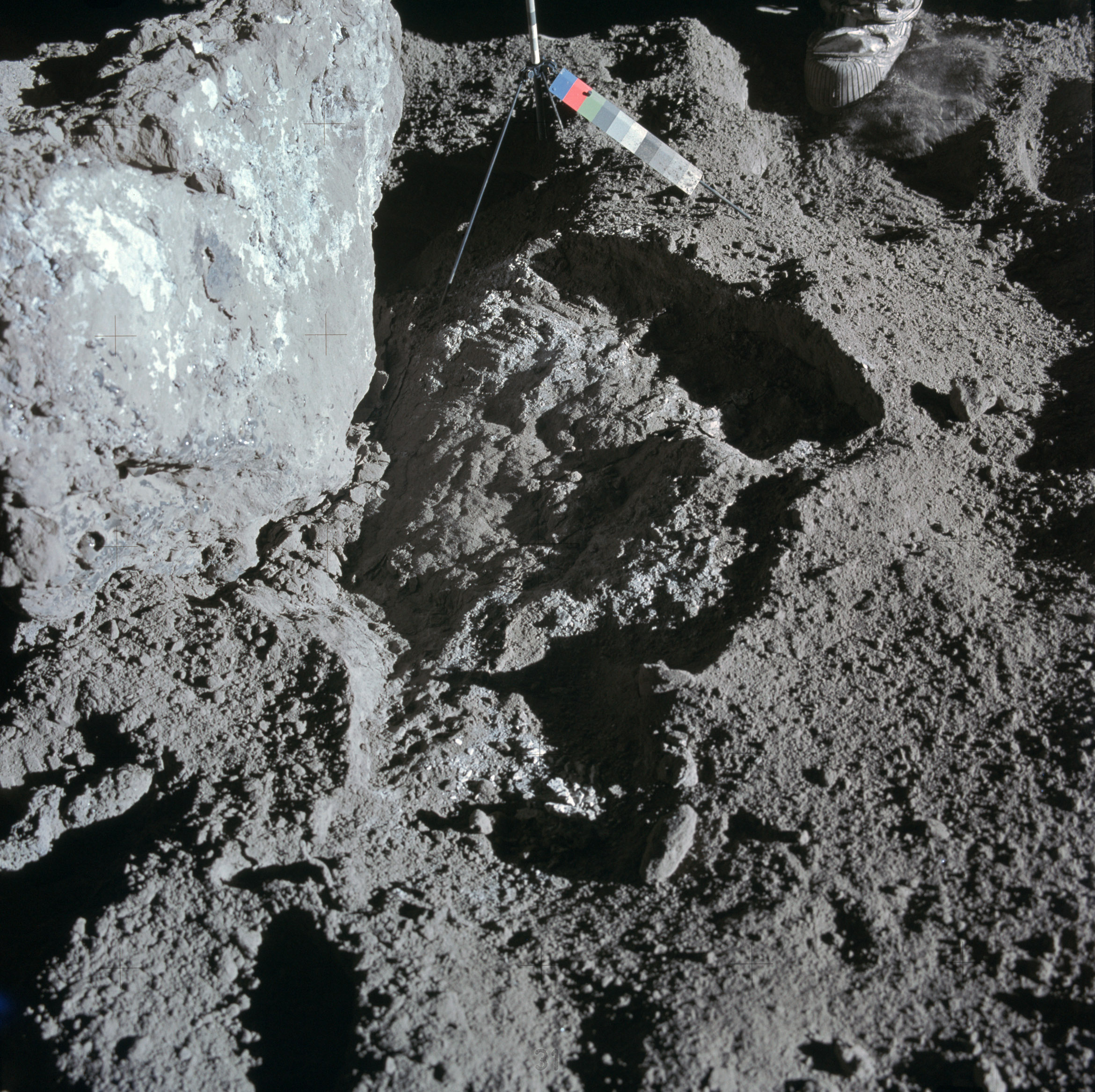 Seventh view of Great Scott. Black and white image. The cube at the lower right is one inch (2.54 cm) on eash side.S71-44778 (5 Mb or 0.4 Mb)