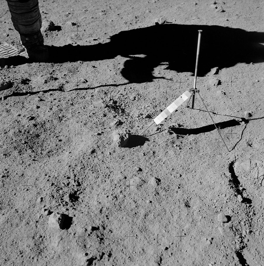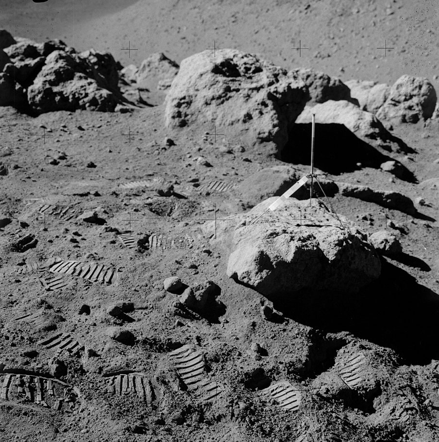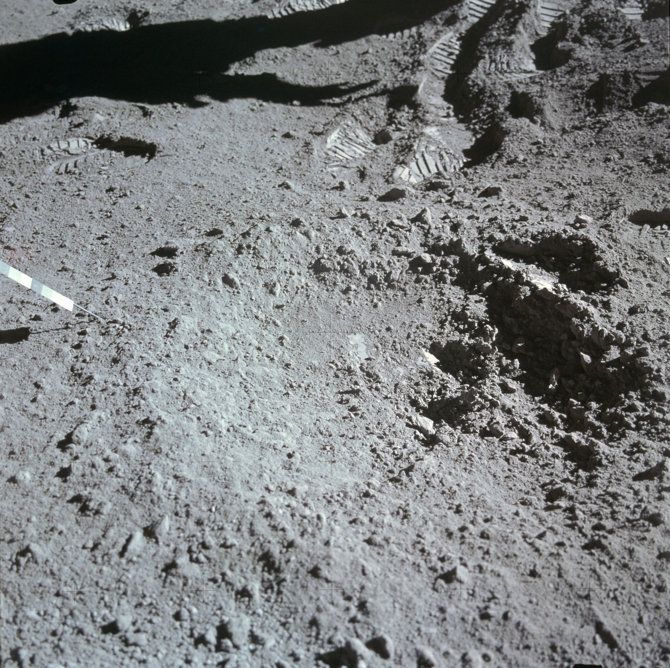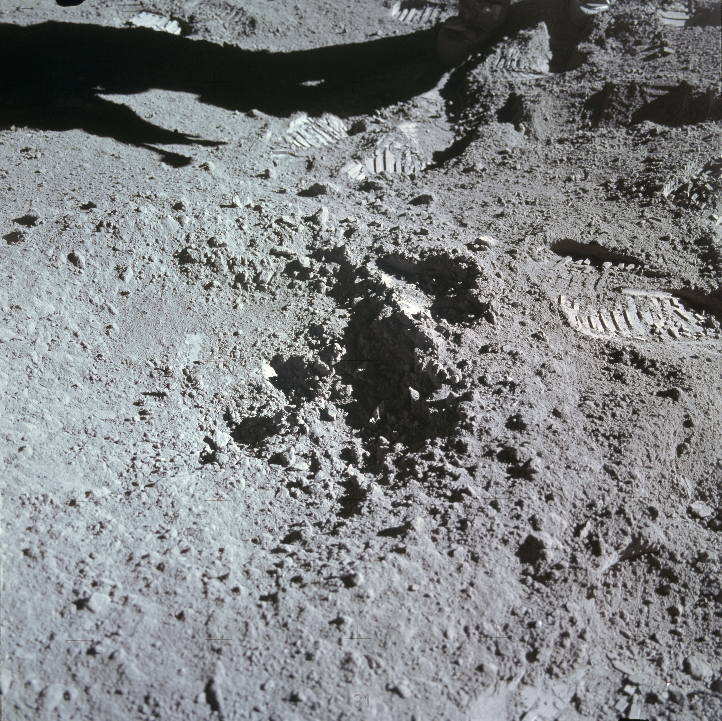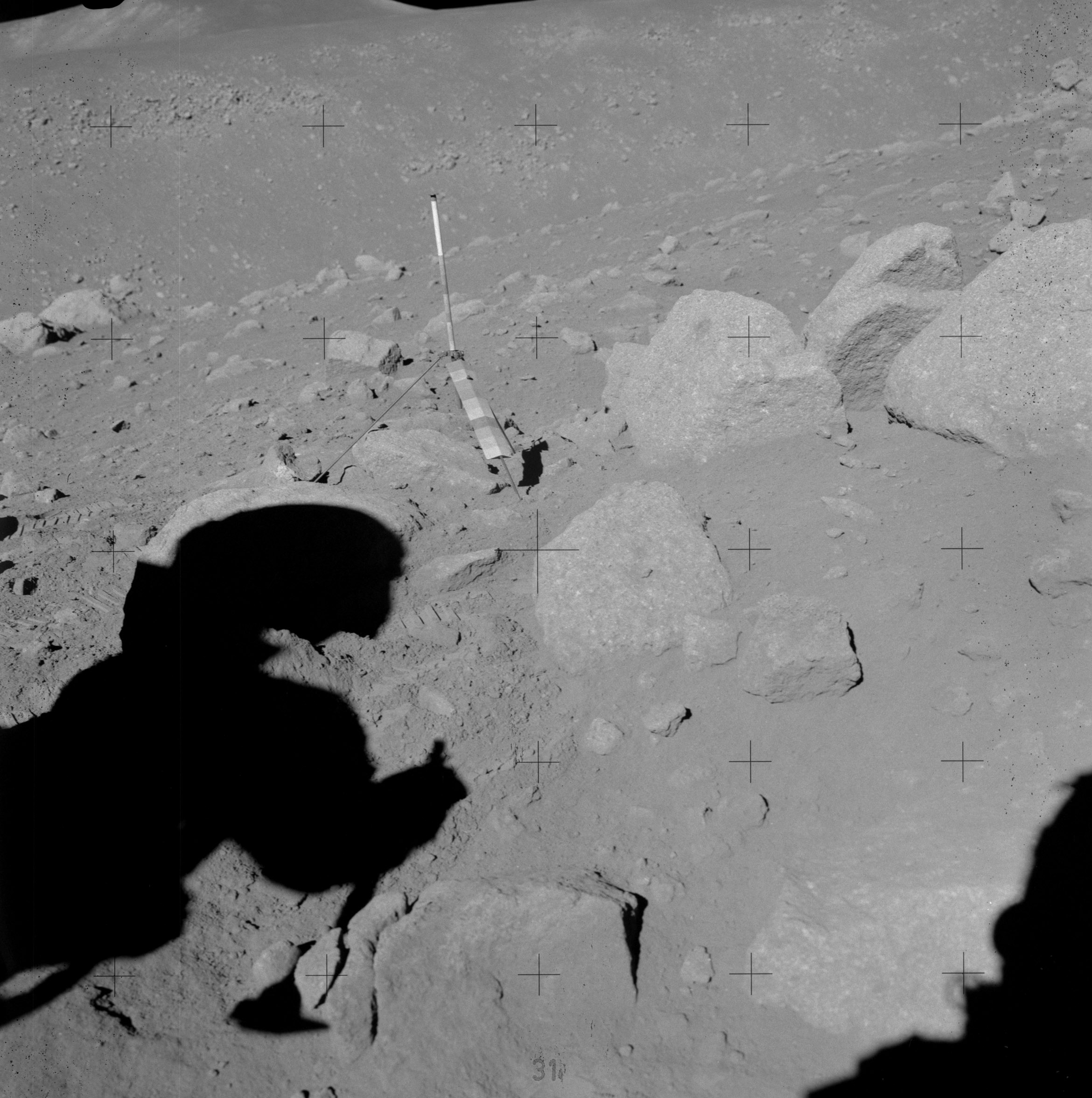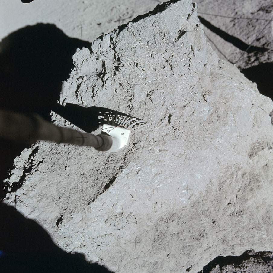 Seventh view of Great Scott. Black and white image. The cube at the lower right is one inch (2.54 cm) on eash side.S71-44778 (5 Mb or 0.4 Mb)