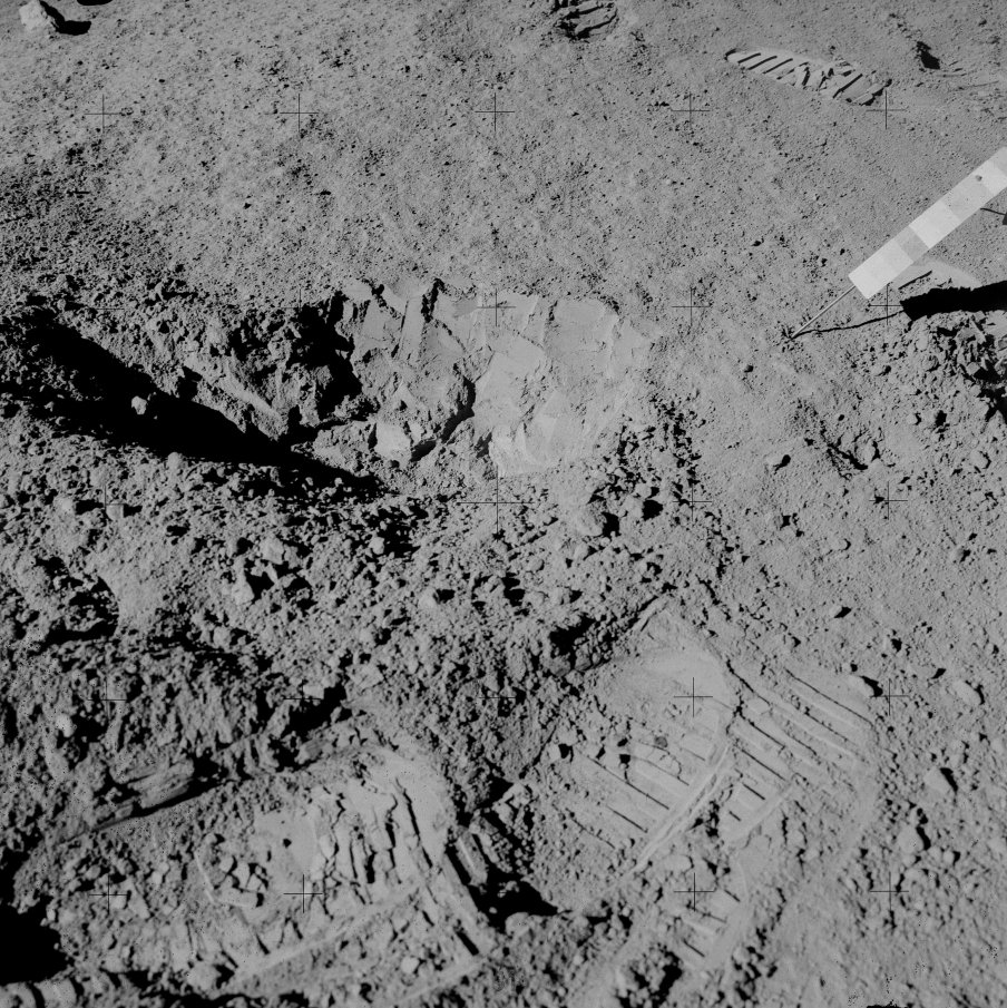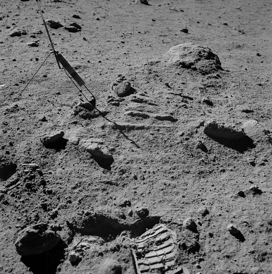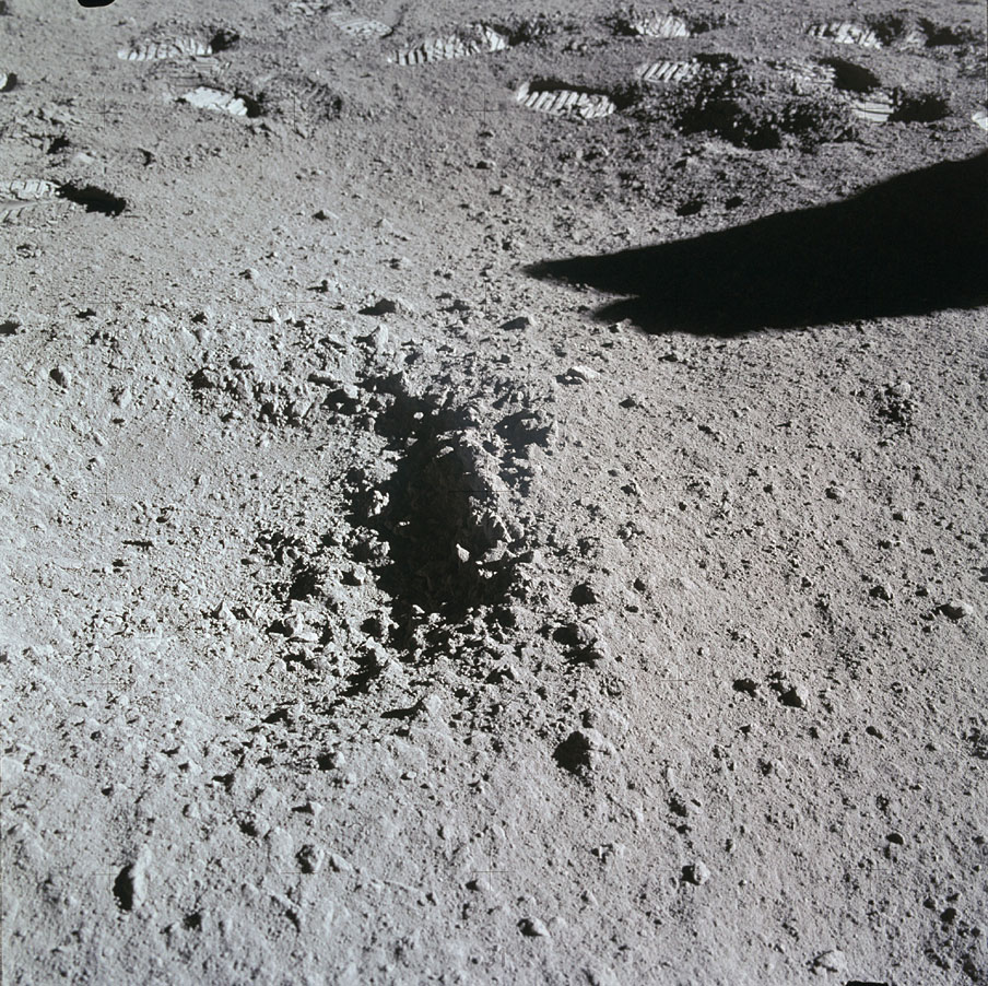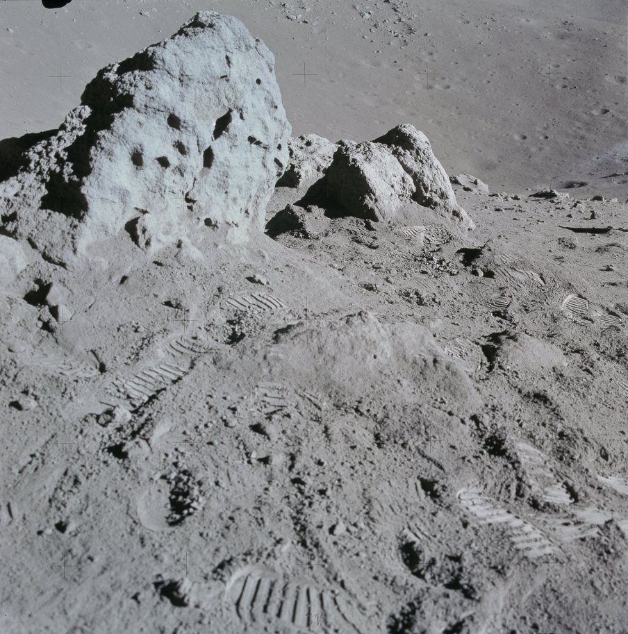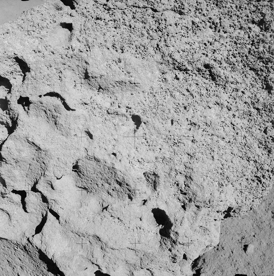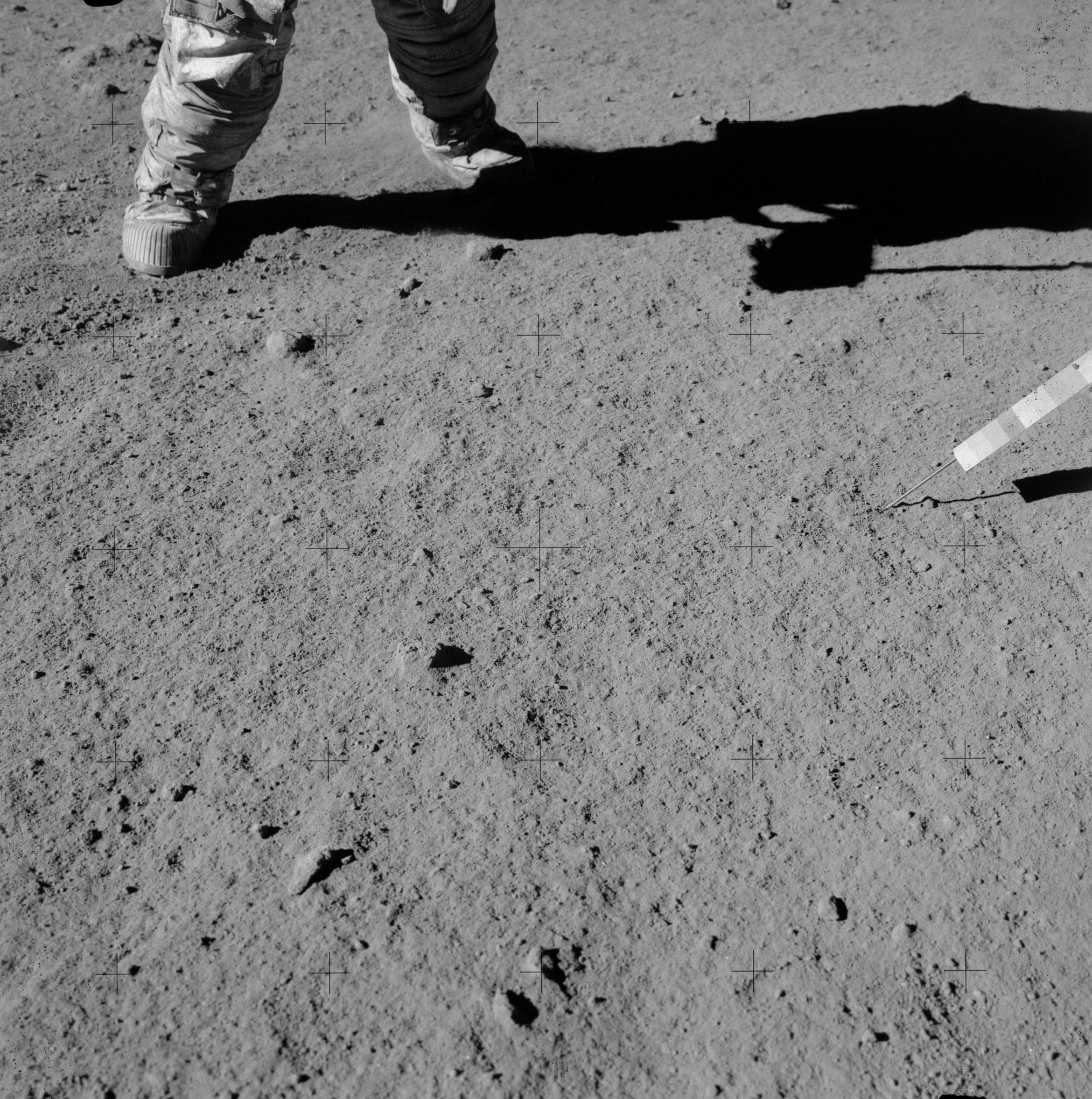 Seventh view of Great Scott. Black and white image. The cube at the lower right is one inch (2.54 cm) on eash side.S71-44778 (5 Mb or 0.4 Mb)