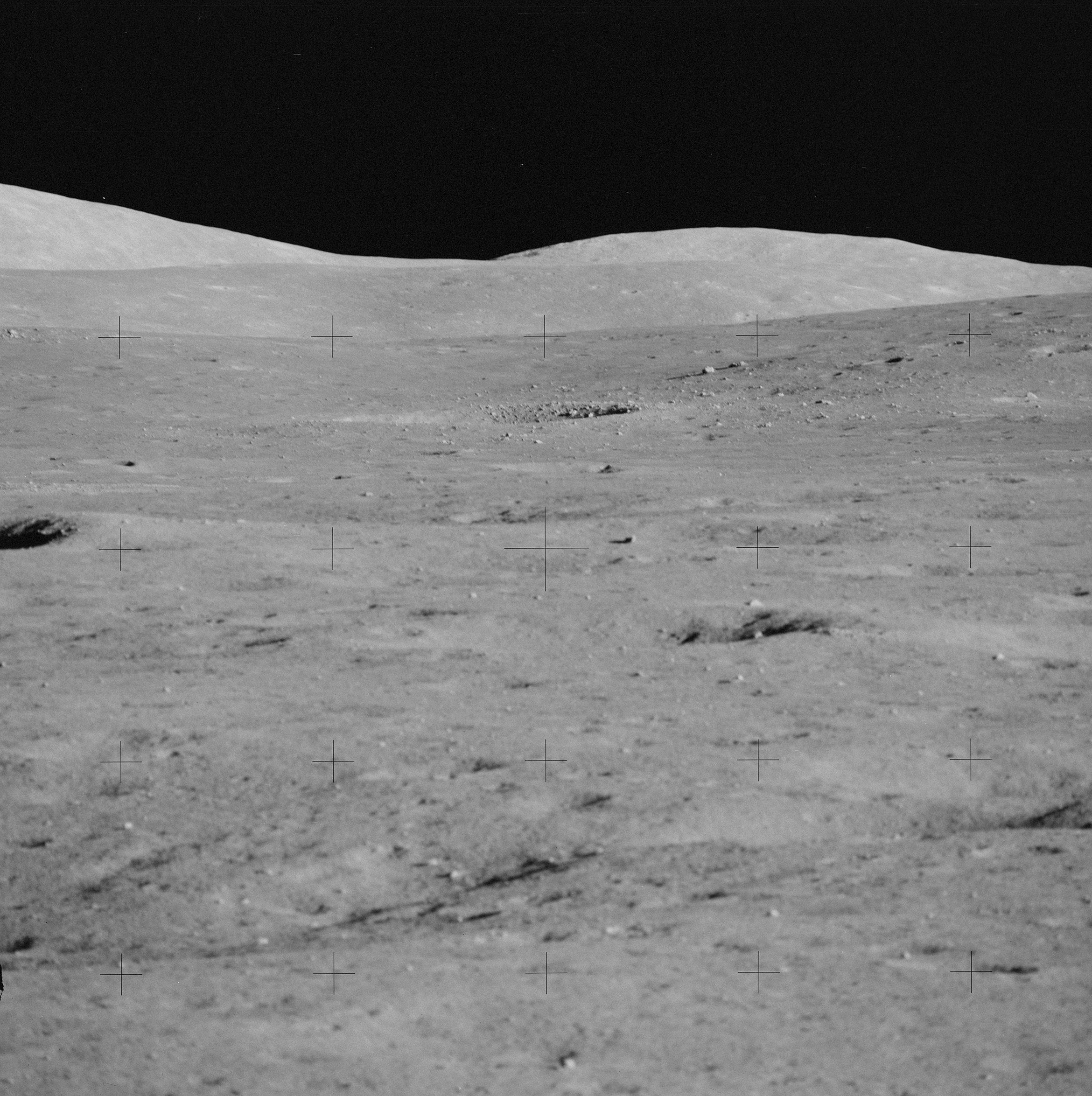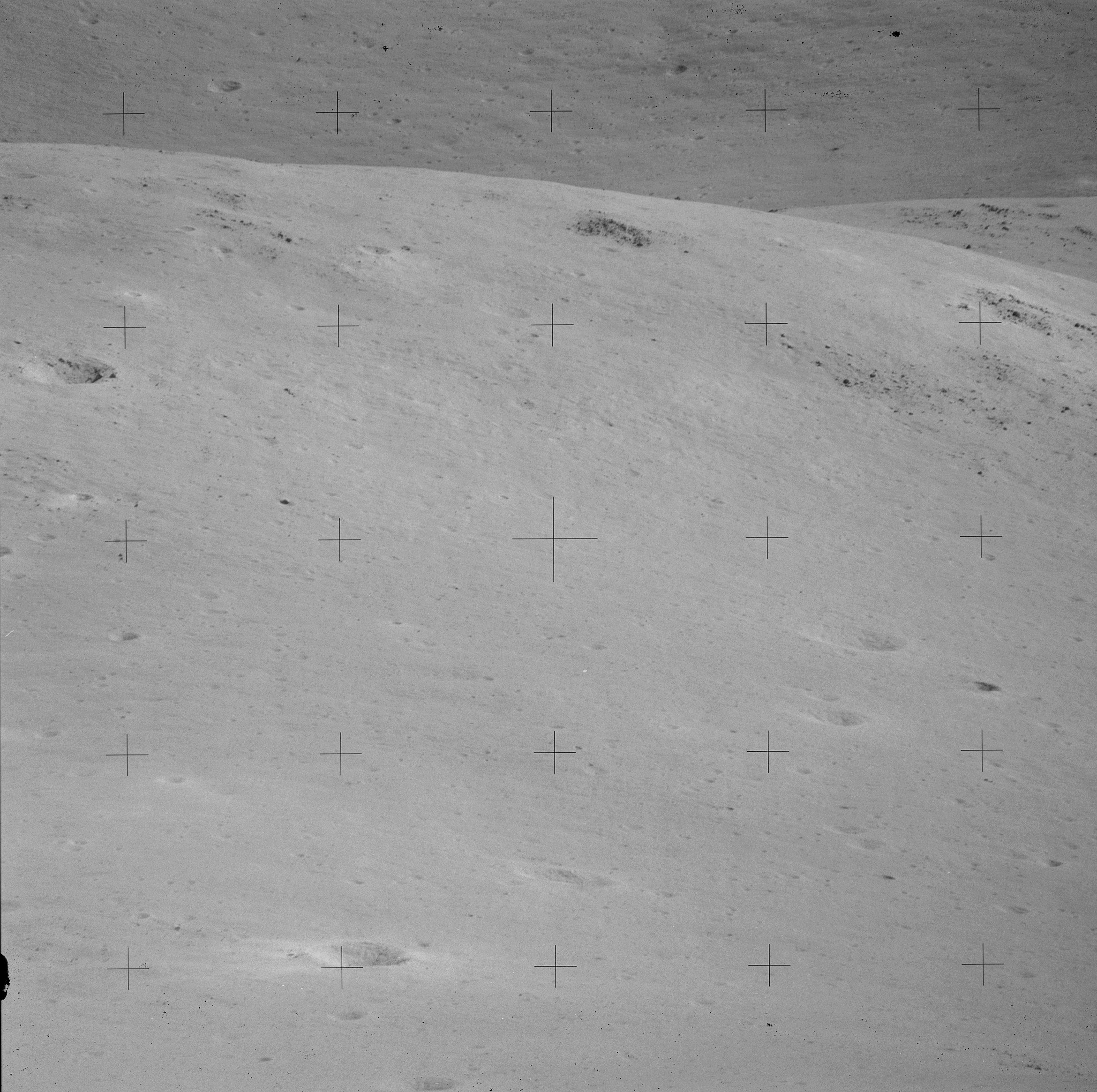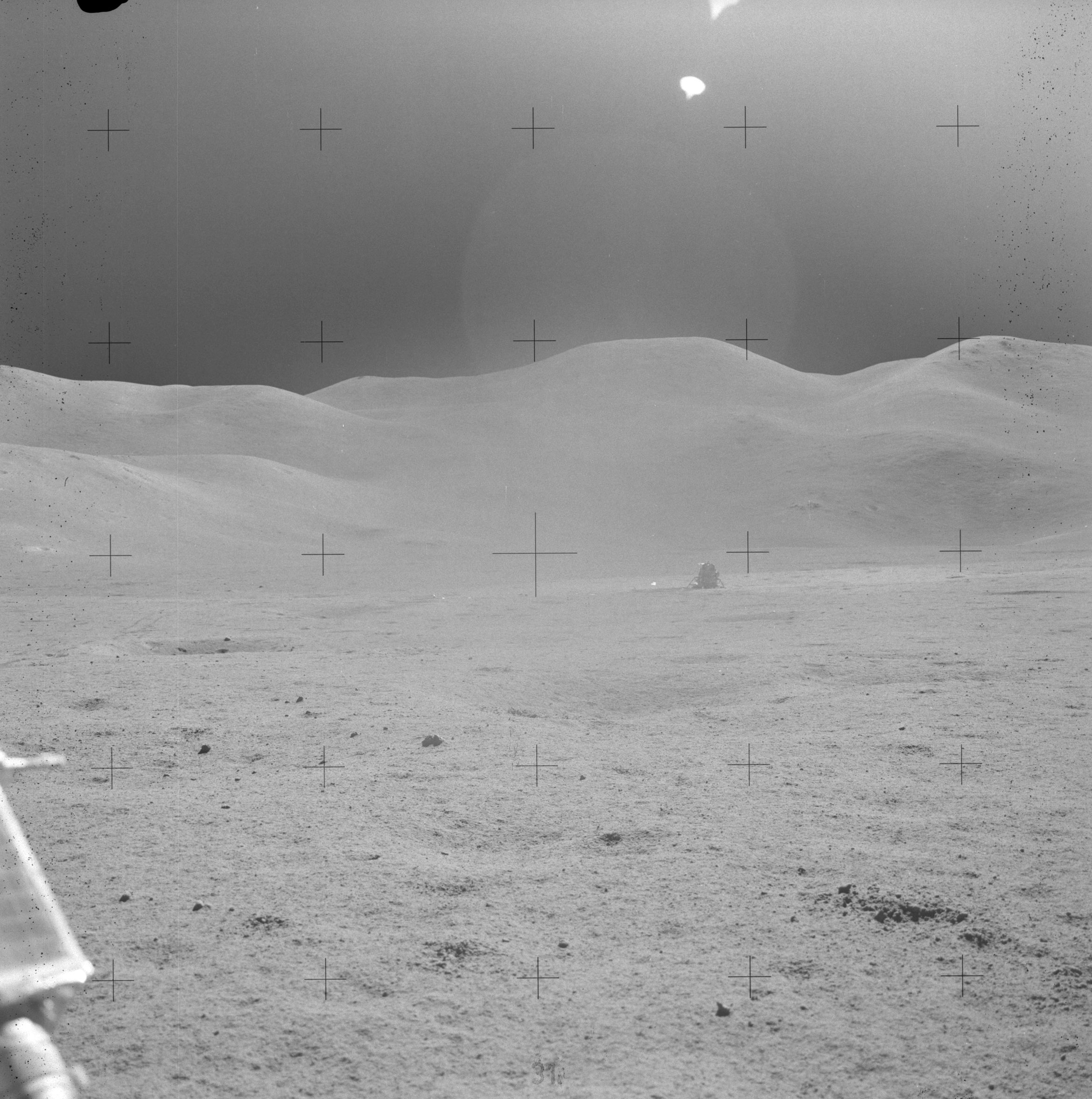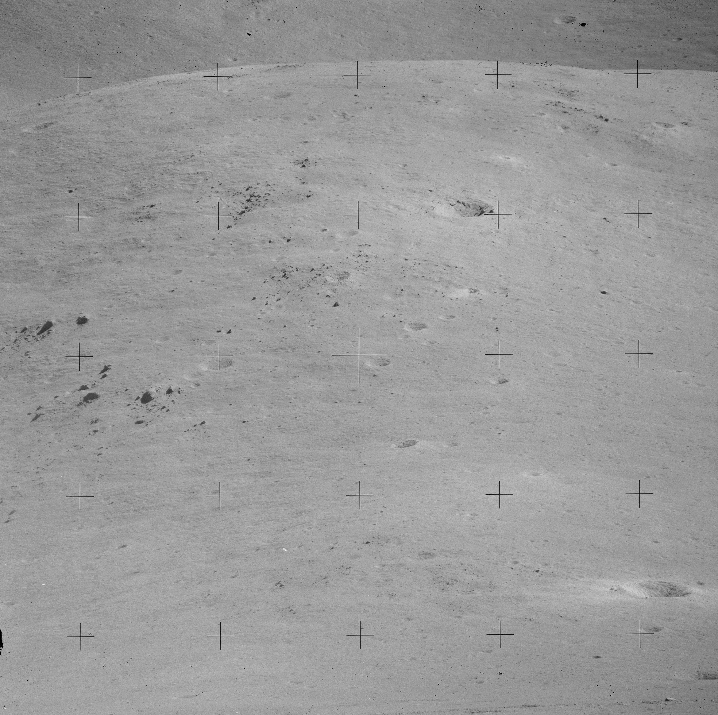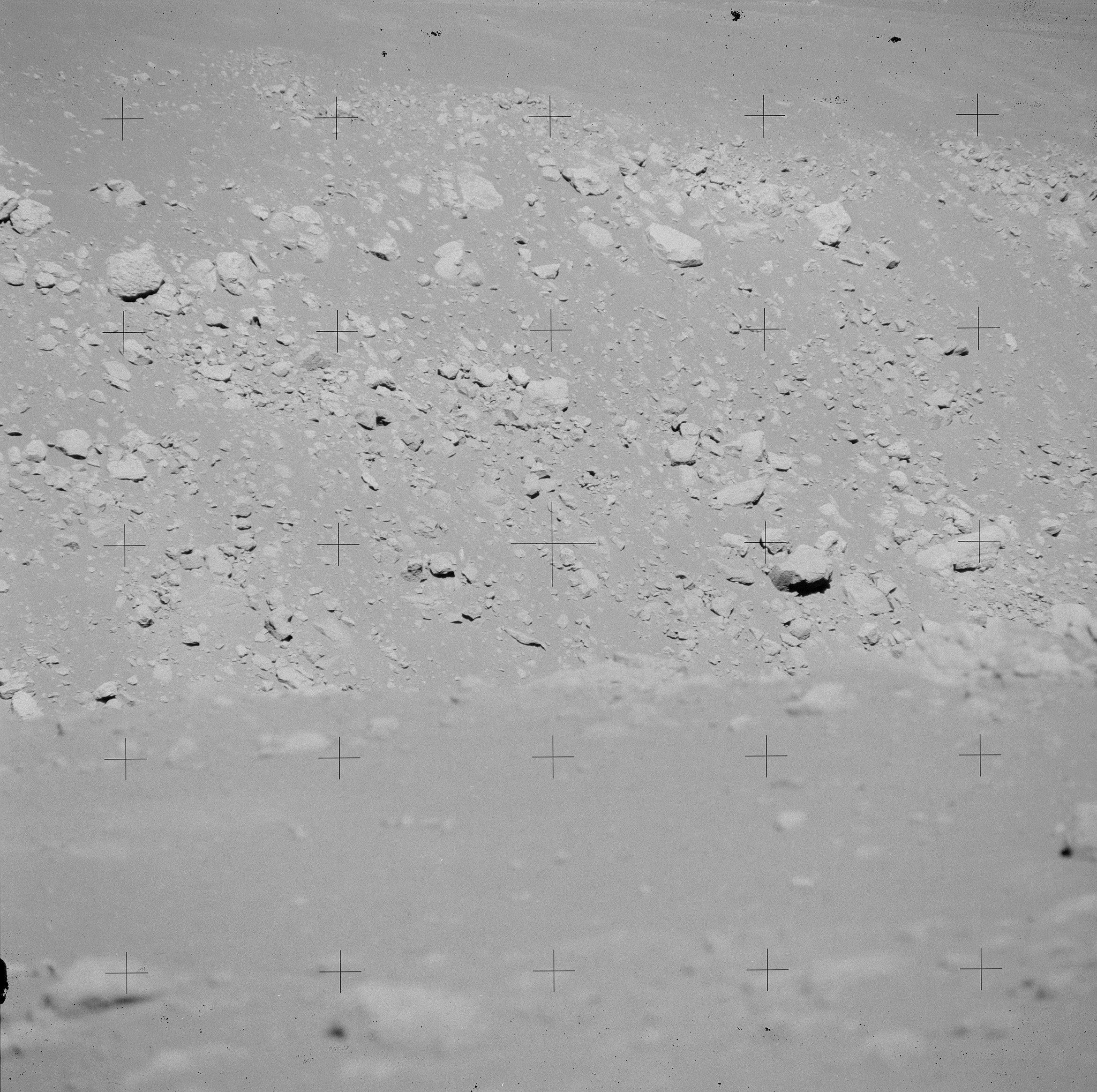This pan camera frame was taken at a Ground Elapsed Time of about 108 hours, which was about an hour after the end of the Stand-Up EVA (SEVA). The solar elevation was about 10.5 degrees. A high-resolution detail shows the area immediately around the LM. Scans courtesy Stephen Tellier.Rev 22 Mapping (Metric) Camera Frame 0585 ( 13 Mb )