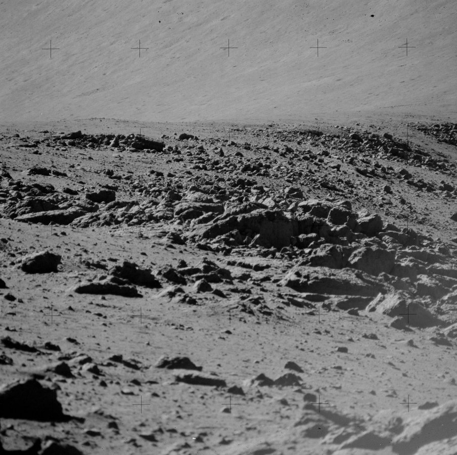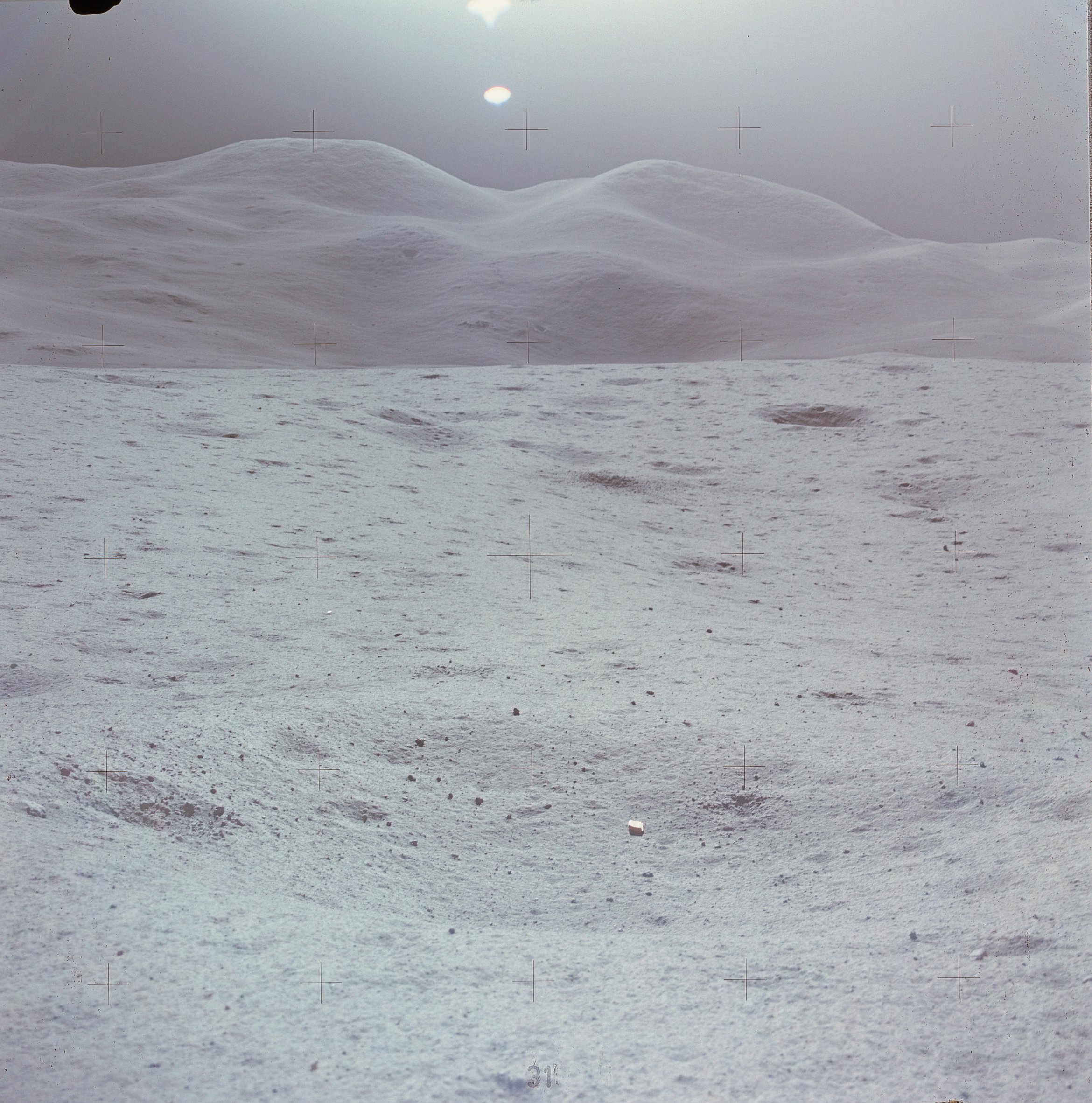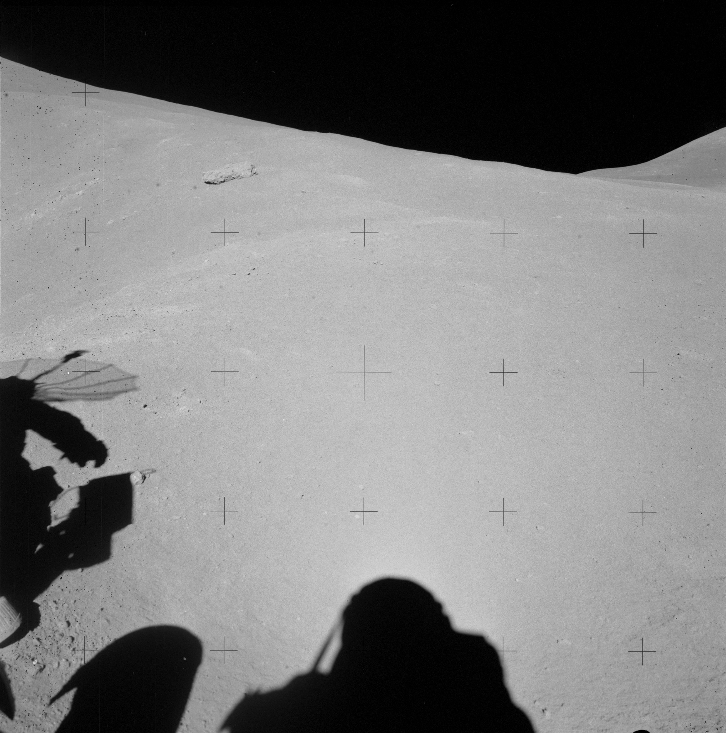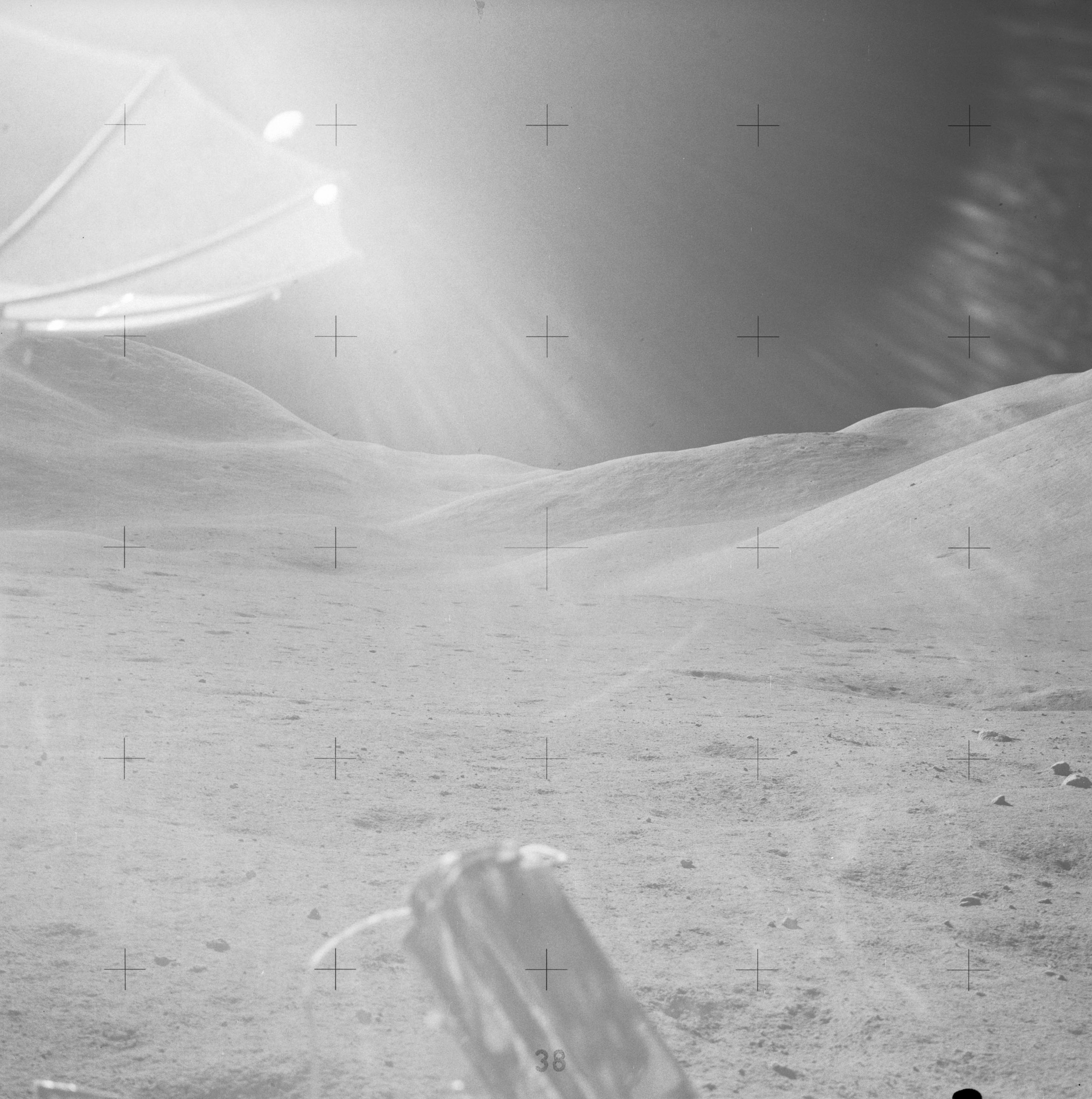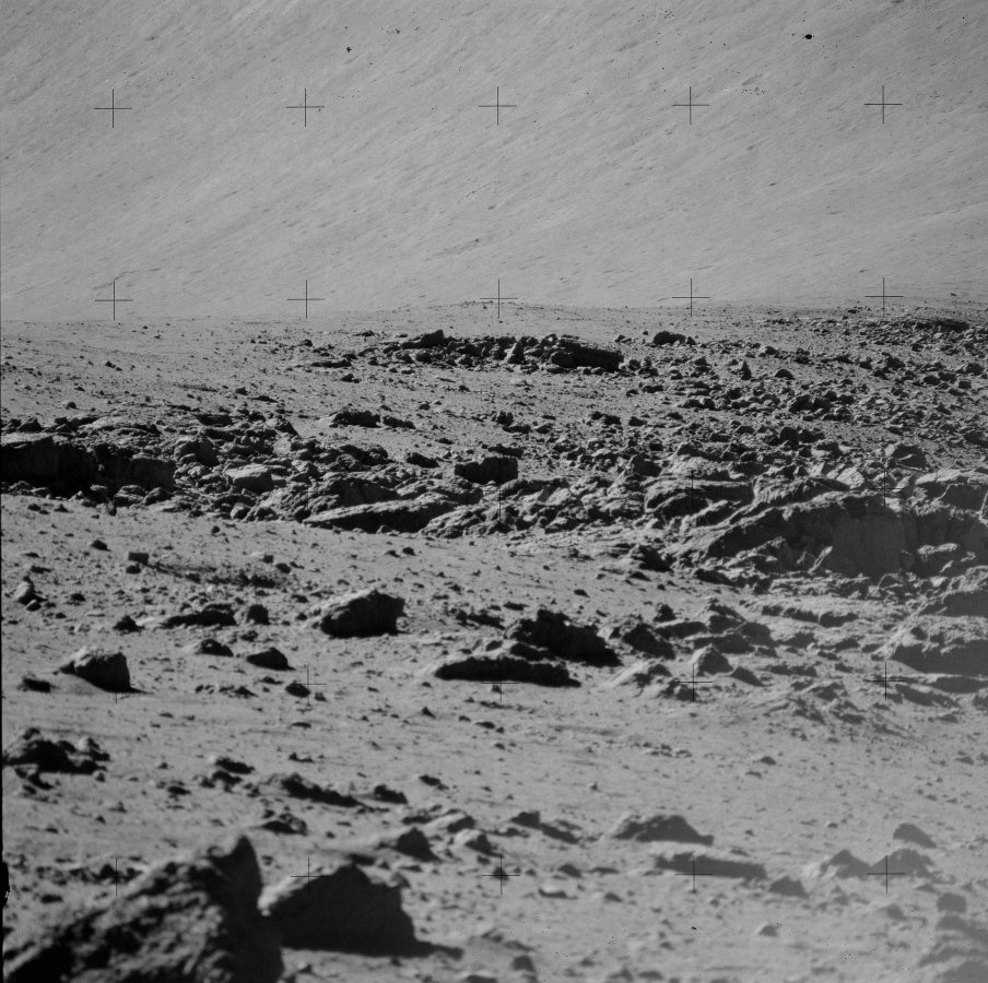 This pan camera frame was taken at a Ground Elapsed Time of about 108 hours, which was about an hour after the end of the Stand-Up EVA (SEVA). The solar elevation was about 10.5 degrees. A high-resolution detail shows the area immediately around the LM. Scans courtesy Stephen Tellier.Rev 22 Mapping (Metric) Camera Frame 0585 ( 13 Mb )