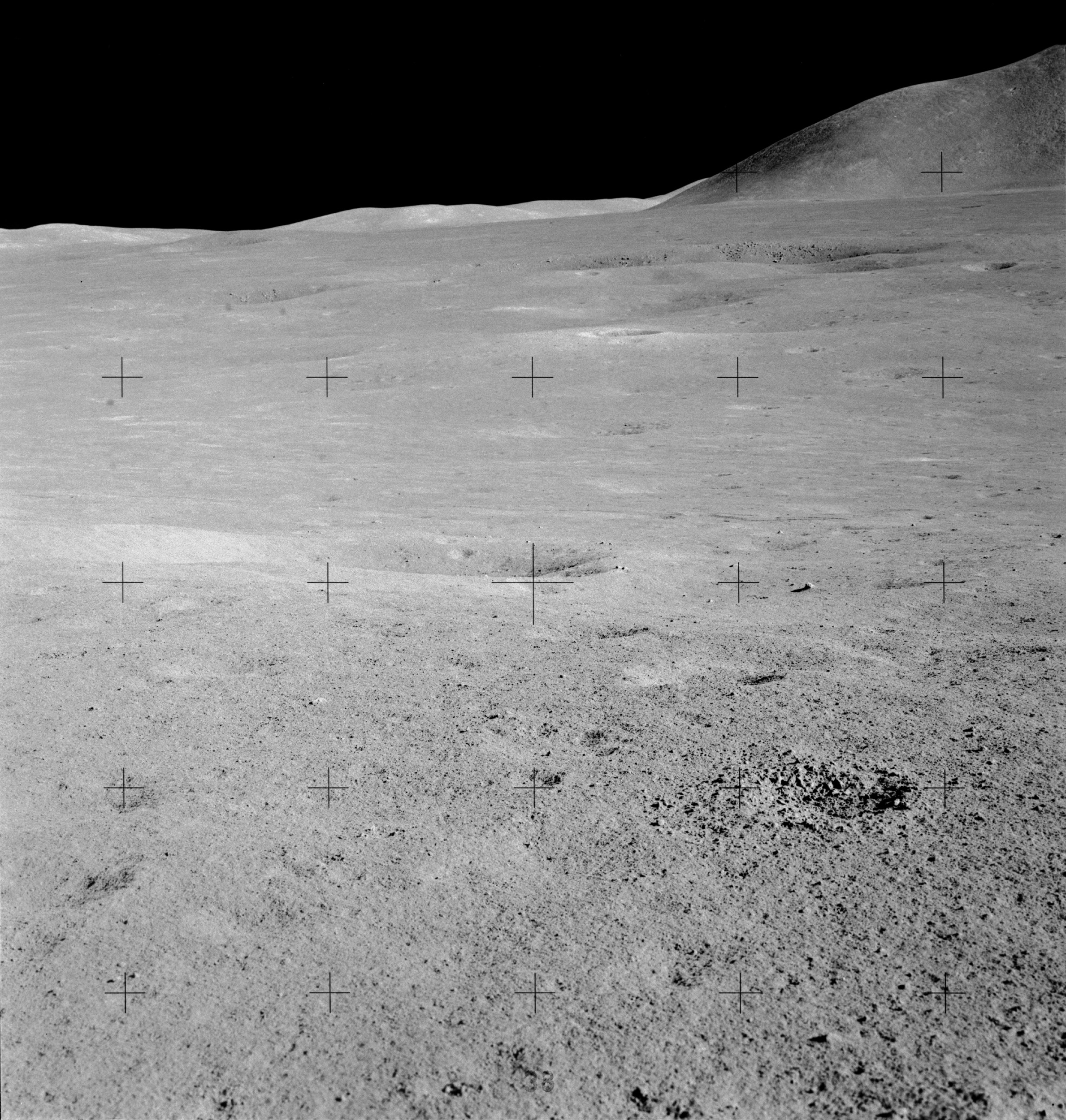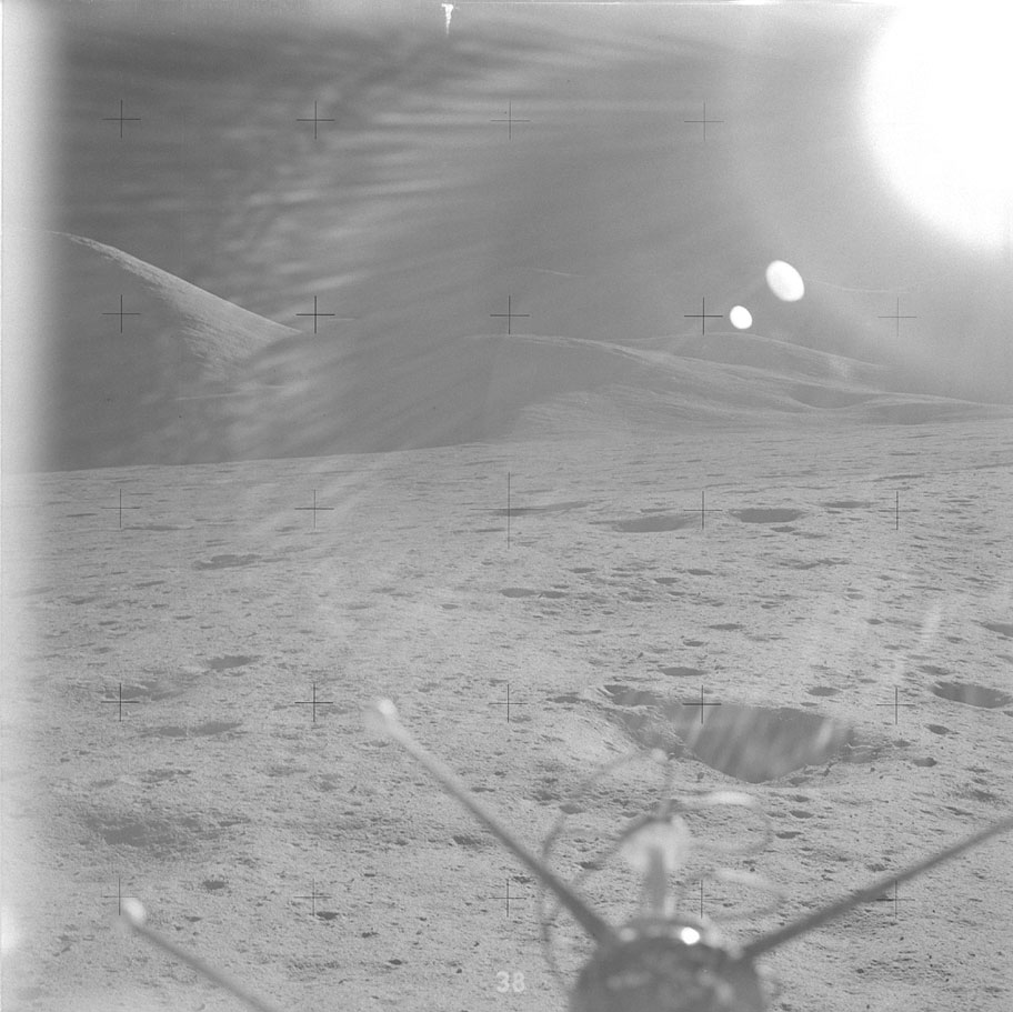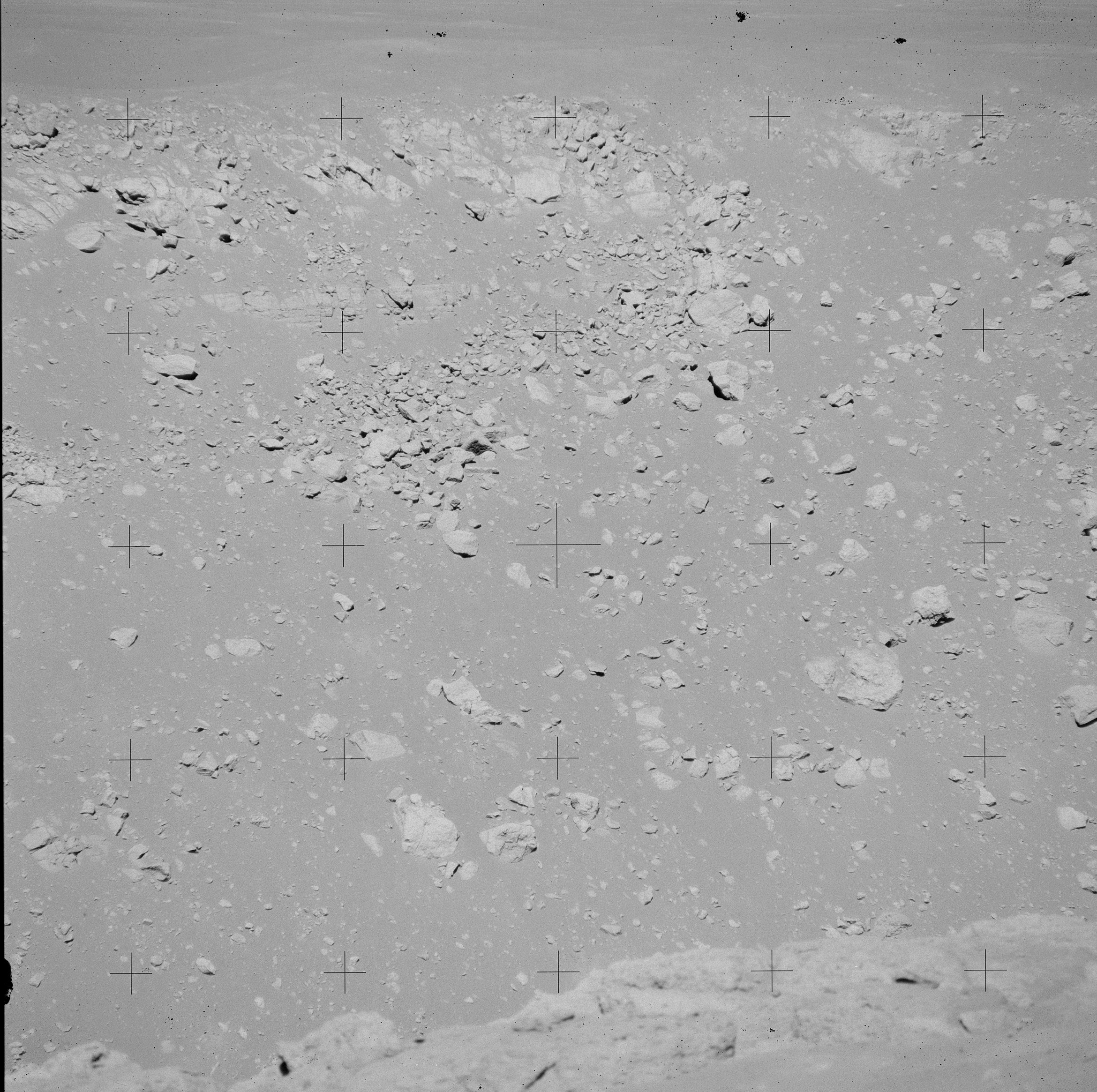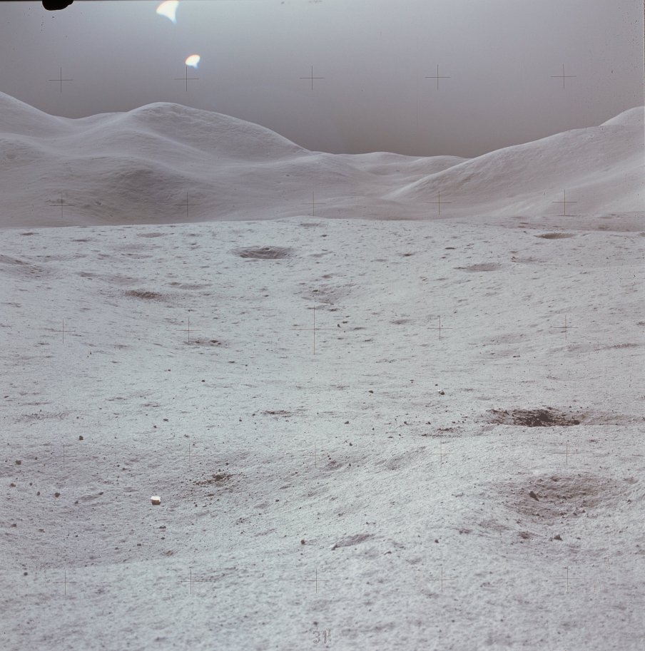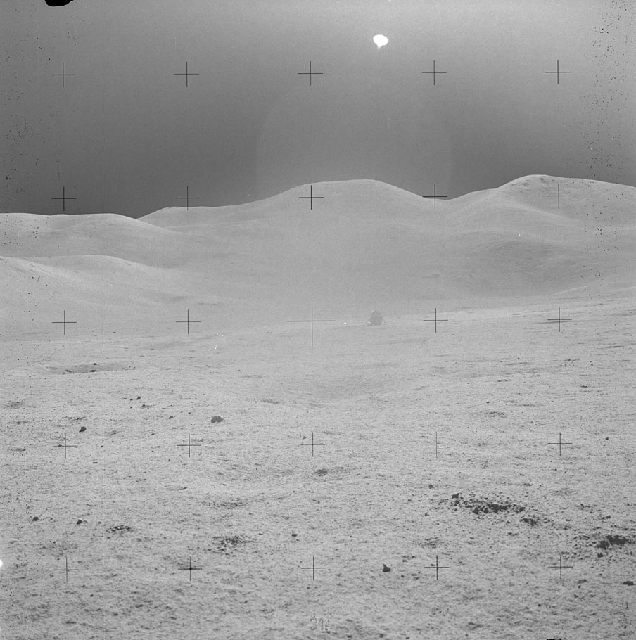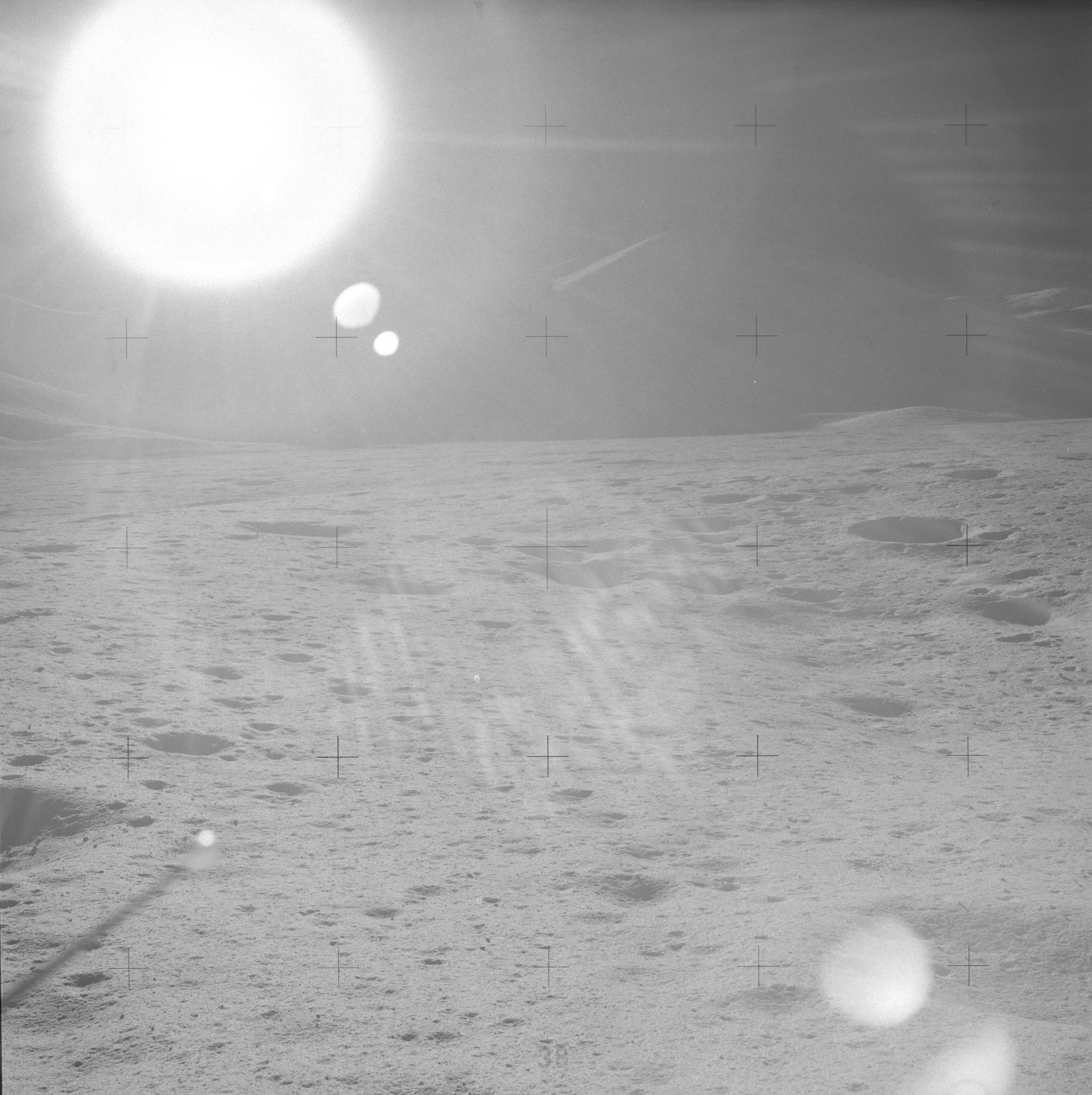 This pan camera frame was taken at a Ground Elapsed Time of about 108 hours, which was about an hour after the end of the Stand-Up EVA (SEVA). The solar elevation was about 10.5 degrees. A high-resolution detail shows the area immediately around the LM. Scans courtesy Stephen Tellier.Rev 22 Mapping (Metric) Camera Frame 0585 ( 13 Mb )