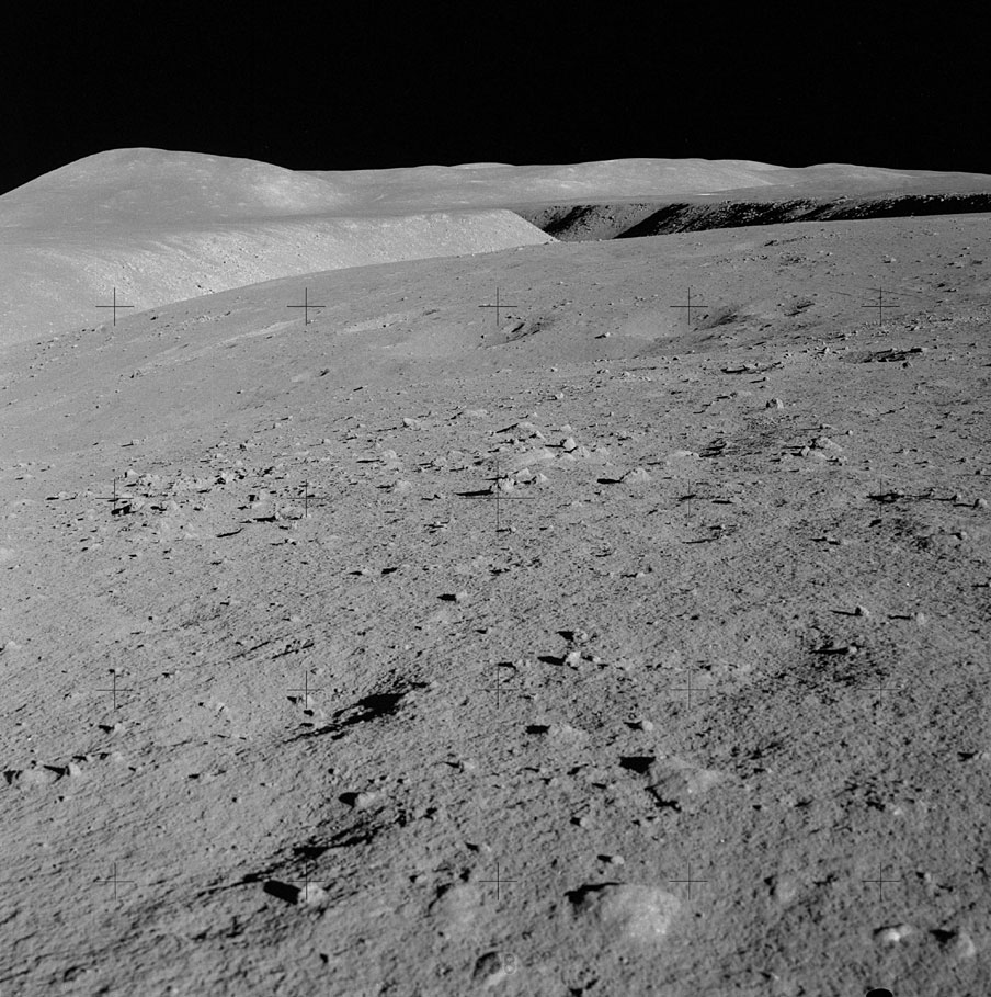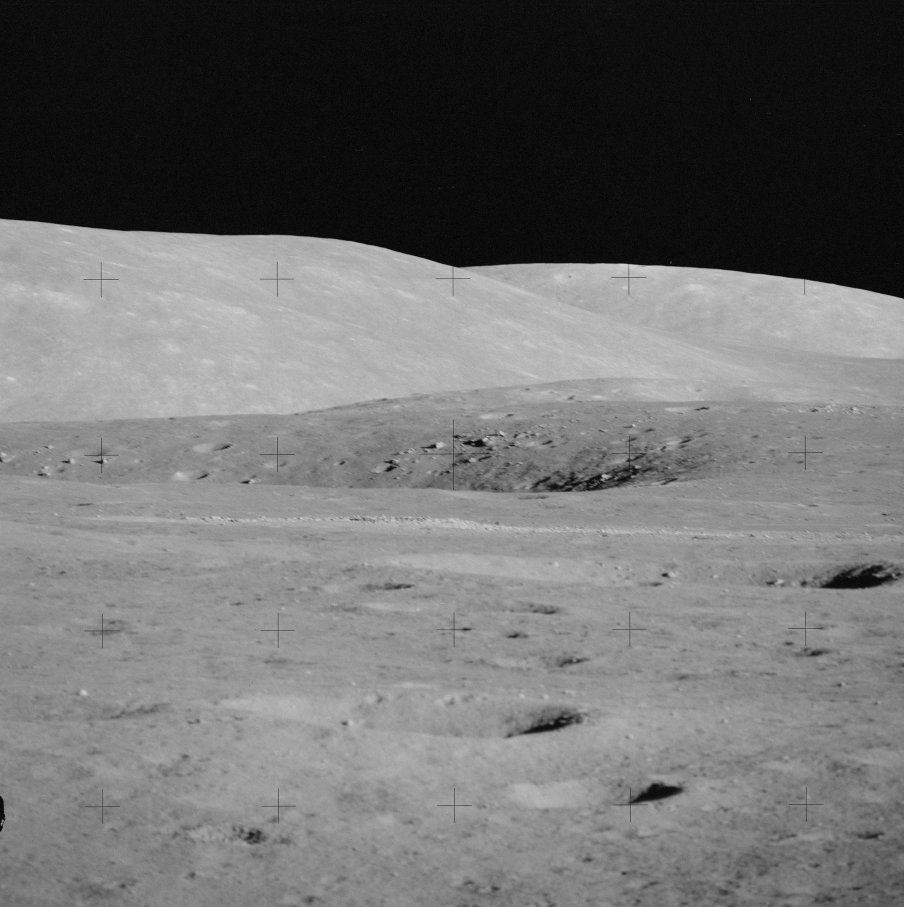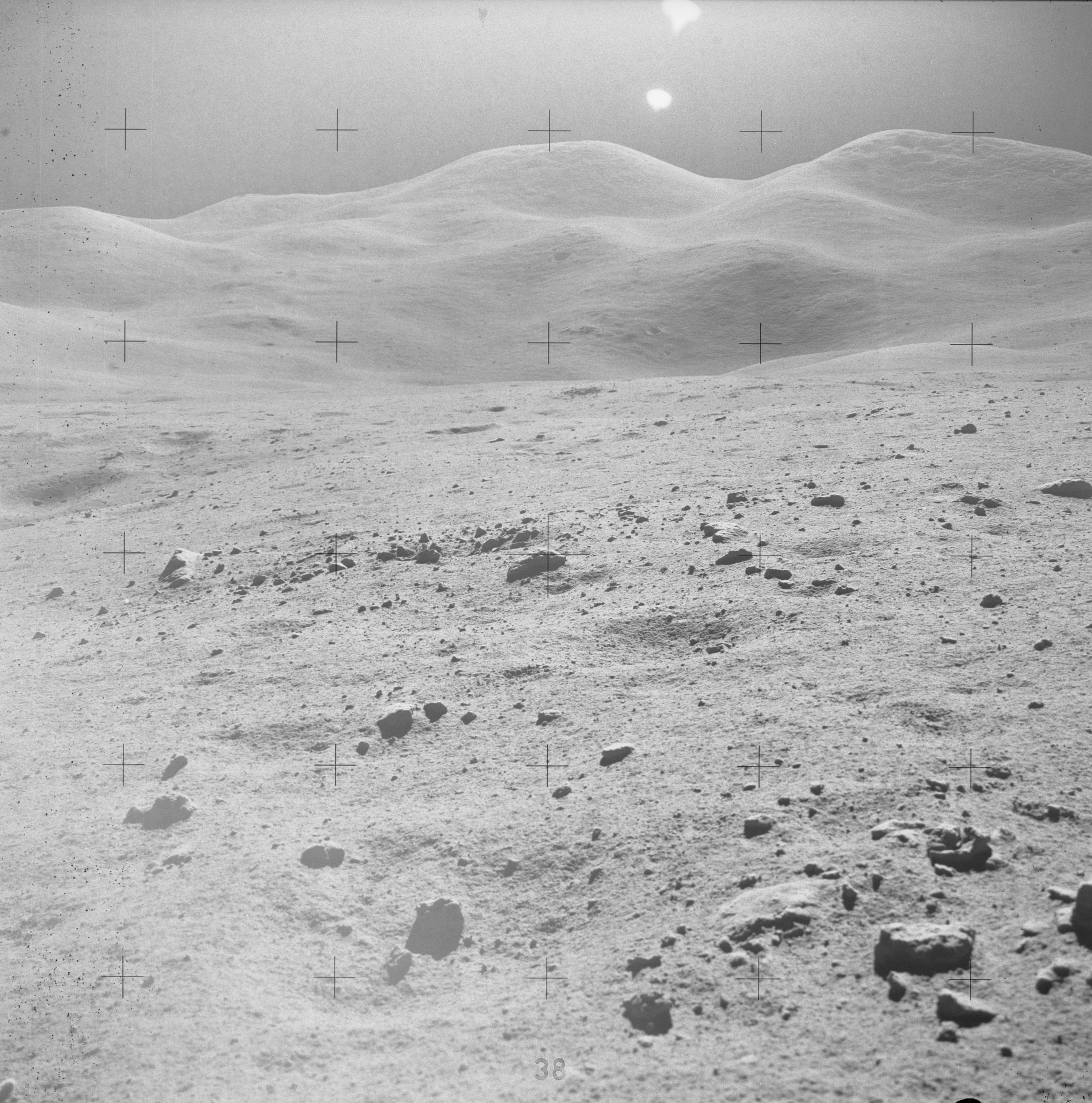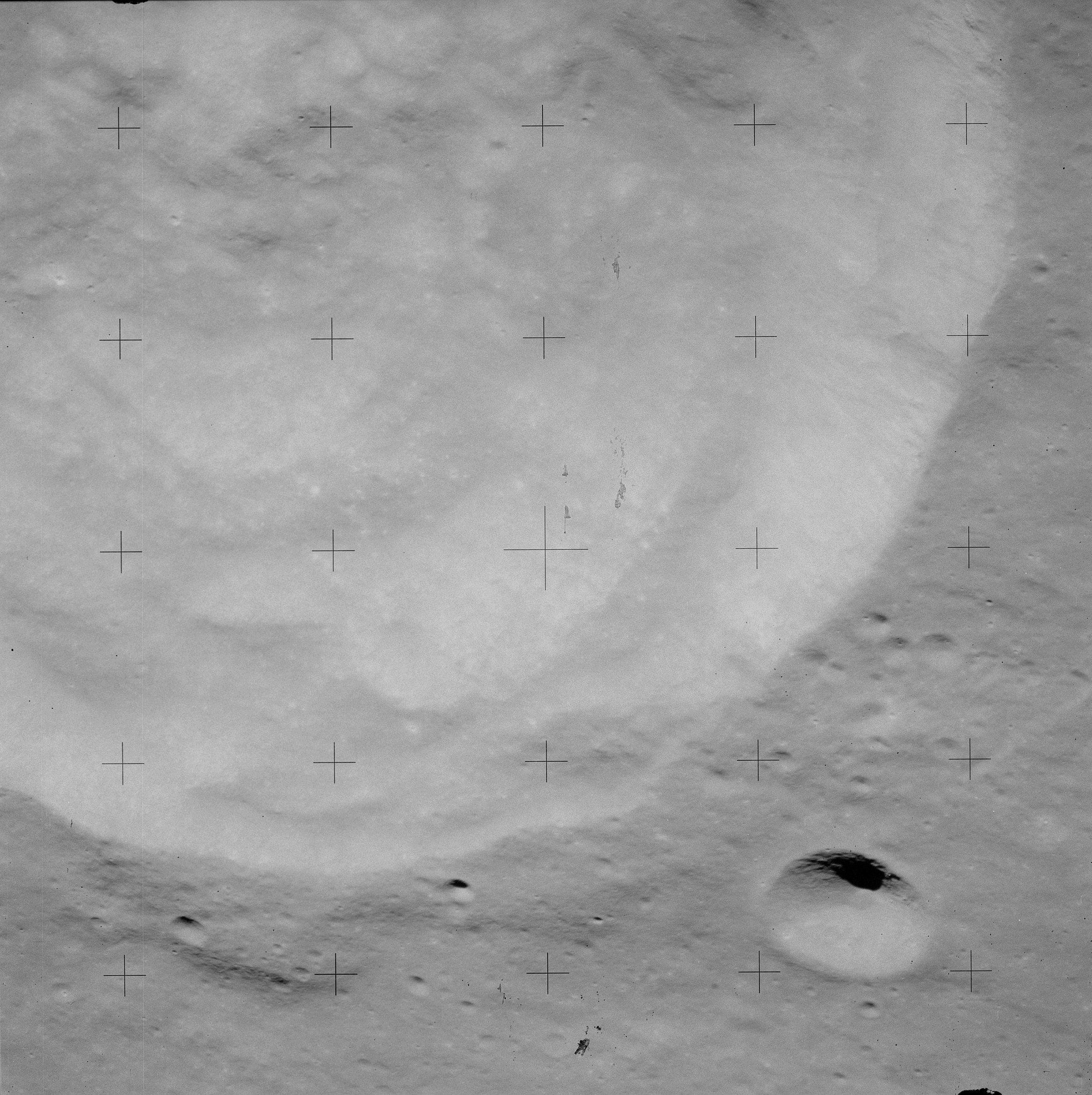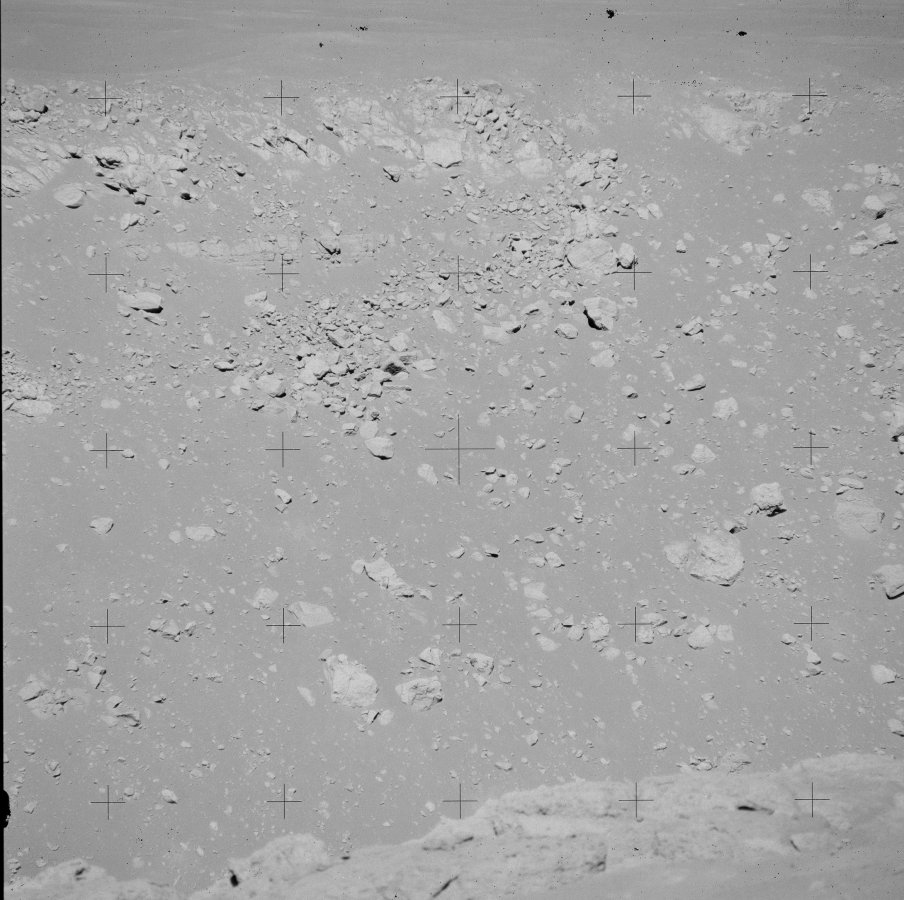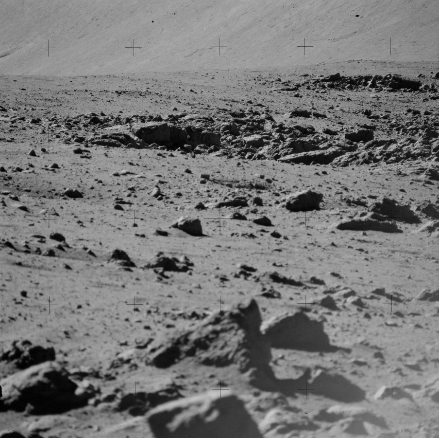 This pan camera frame was taken at a Ground Elapsed Time of about 108 hours, which was about an hour after the end of the Stand-Up EVA (SEVA). The solar elevation was about 10.5 degrees. A high-resolution detail shows the area immediately around the LM. Scans courtesy Stephen Tellier.Rev 22 Mapping (Metric) Camera Frame 0585 ( 13 Mb )