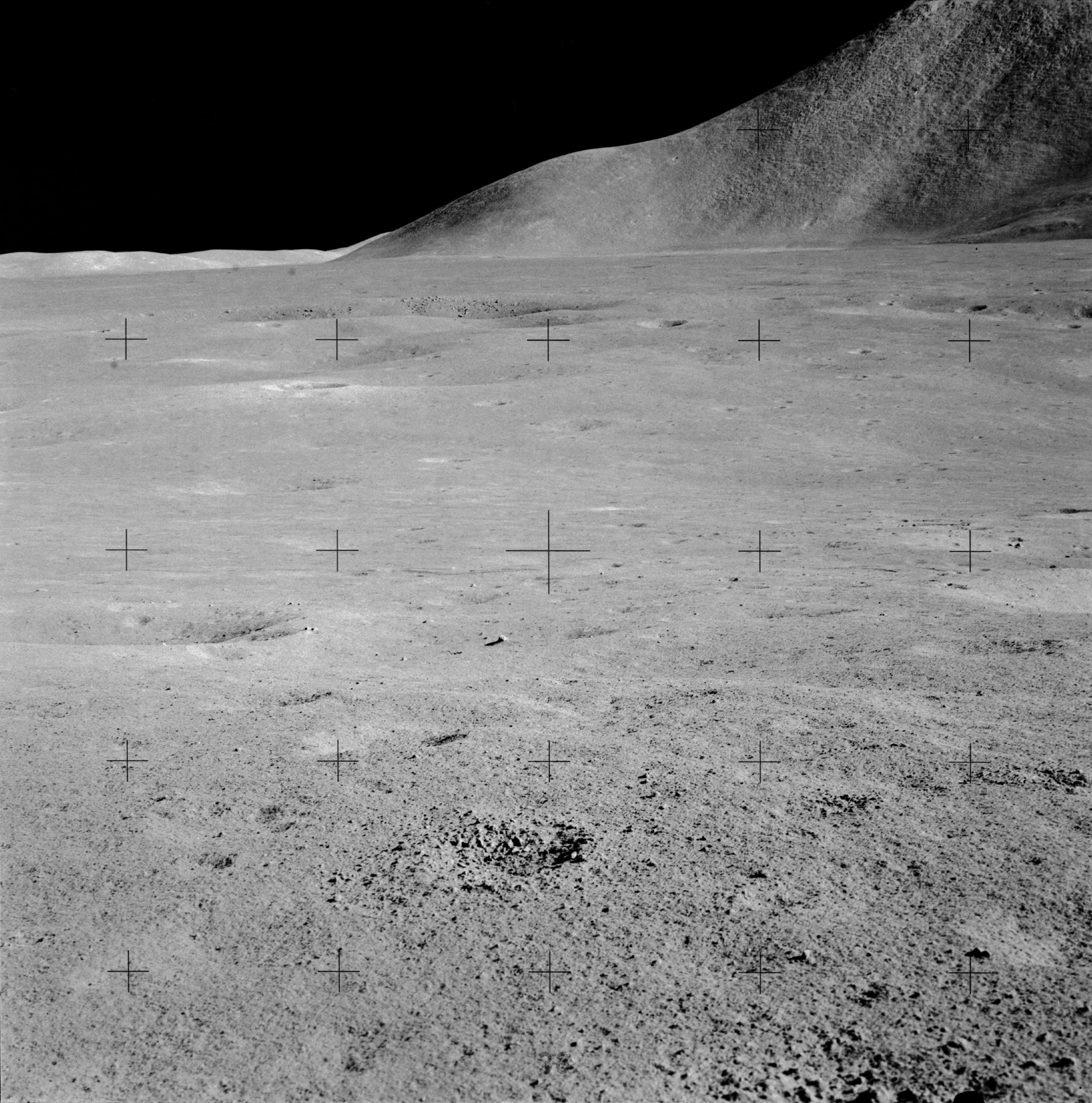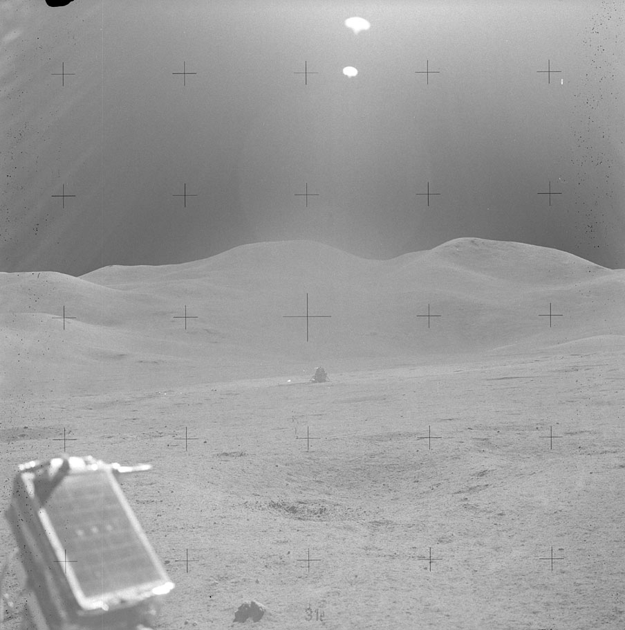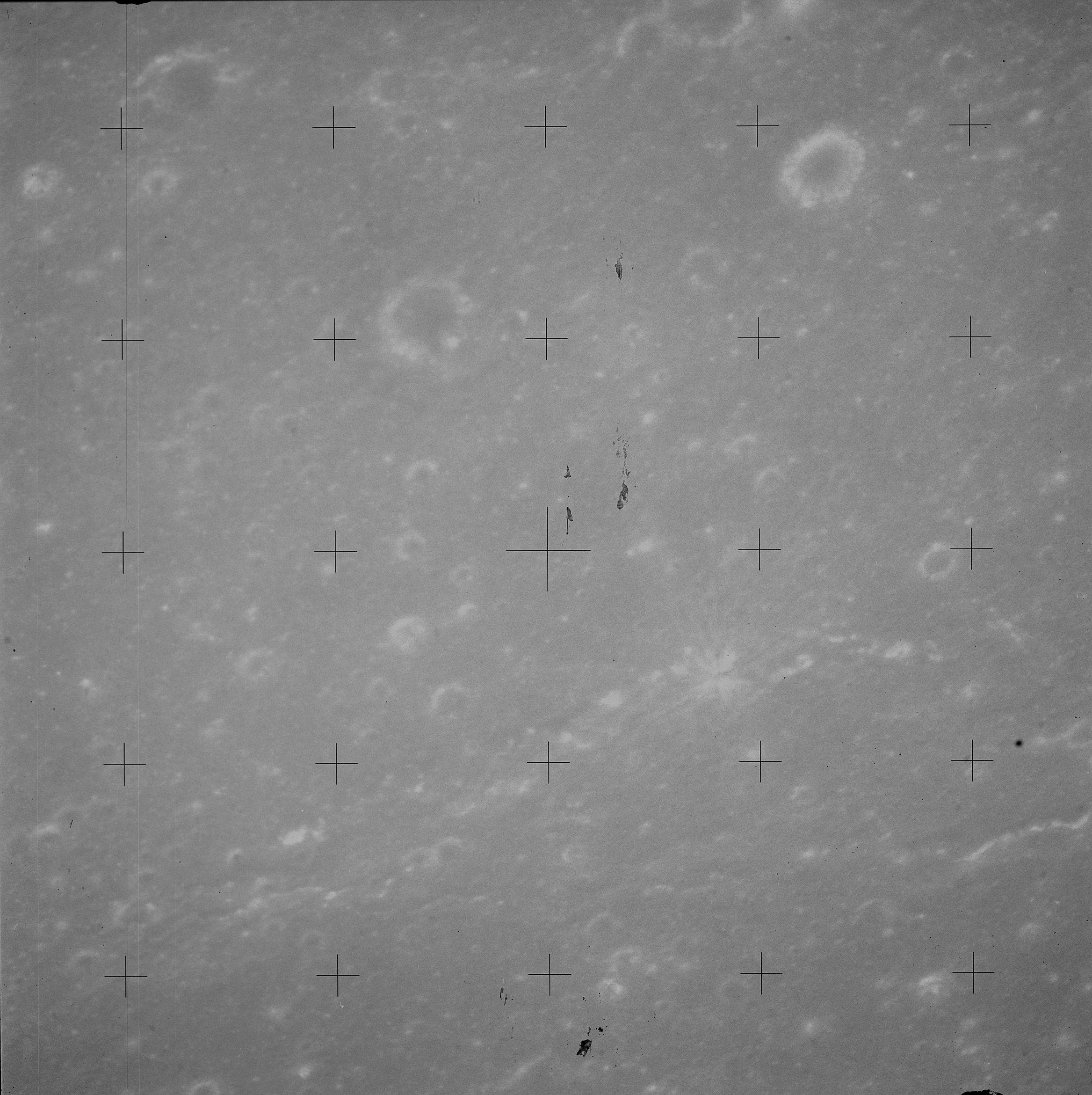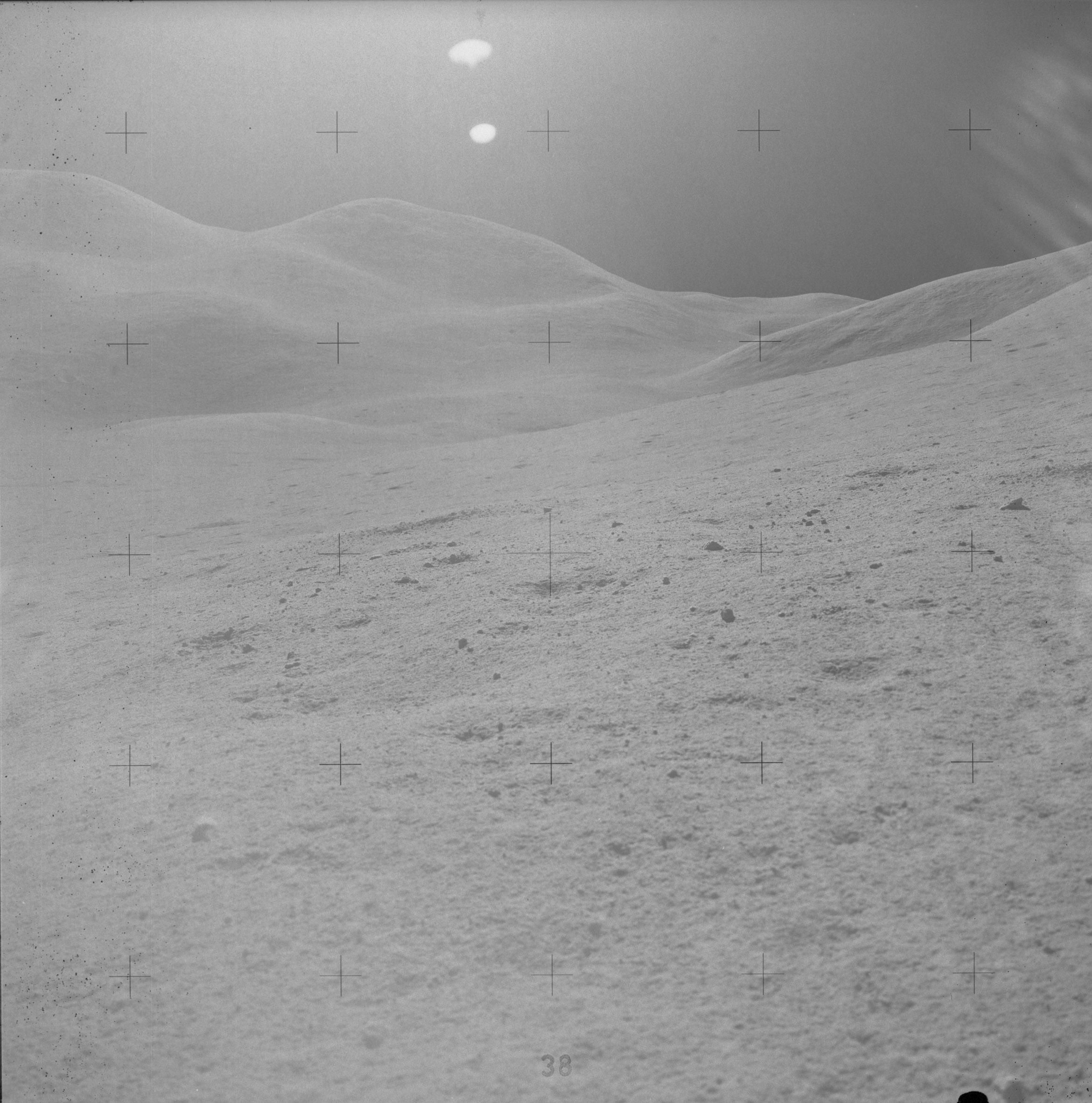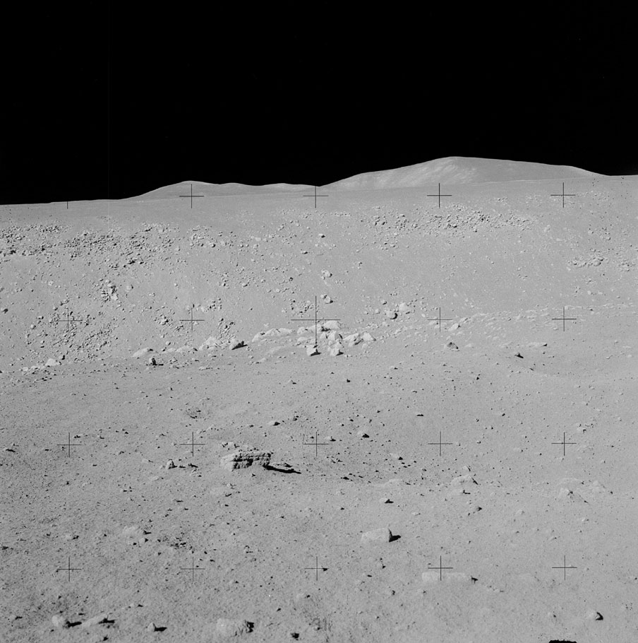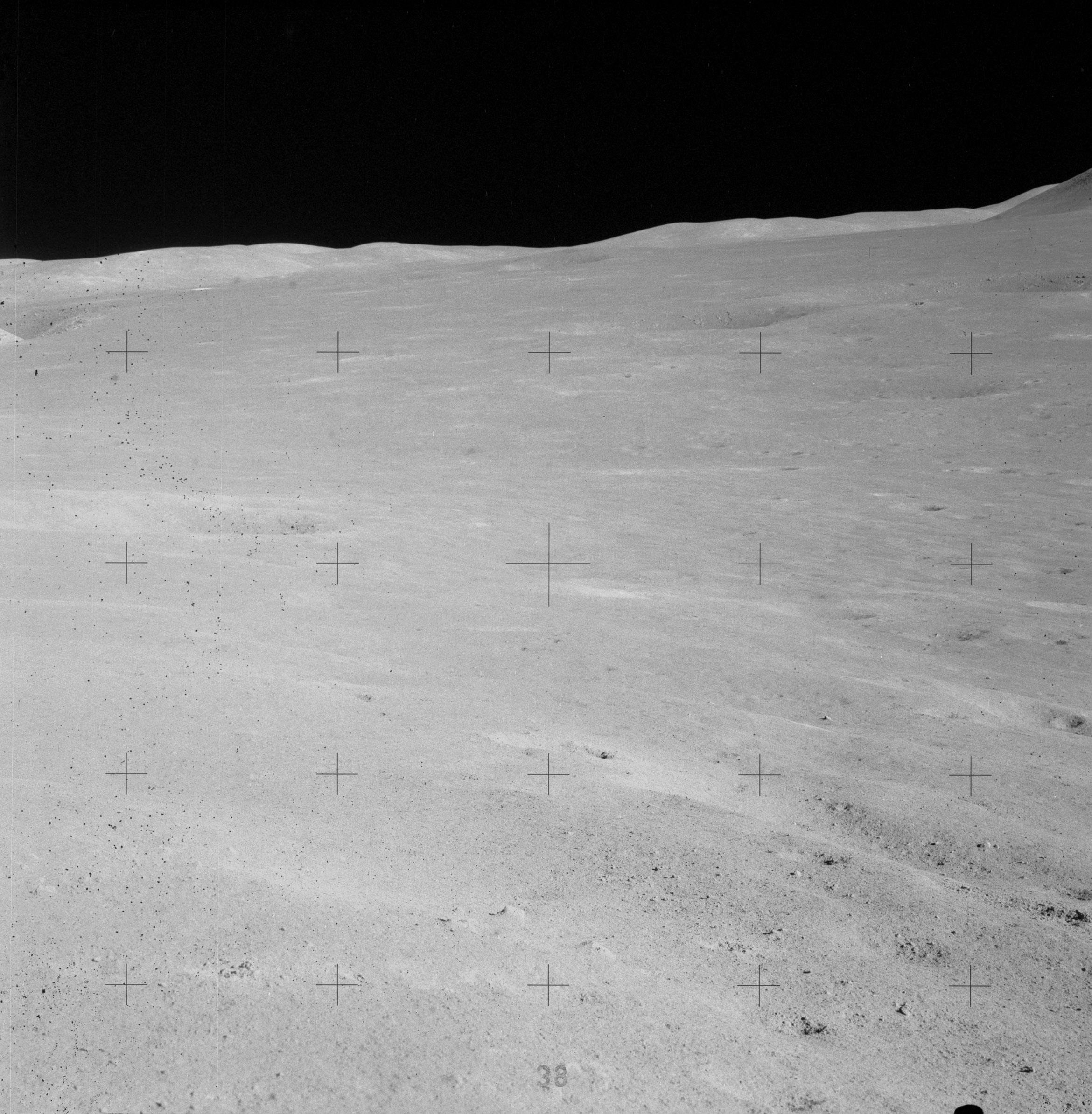 This pan camera frame was taken at a Ground Elapsed Time of about 108 hours, which was about an hour after the end of the Stand-Up EVA (SEVA). The solar elevation was about 10.5 degrees. A high-resolution detail shows the area immediately around the LM. Scans courtesy Stephen Tellier.Rev 22 Mapping (Metric) Camera Frame 0585 ( 13 Mb )