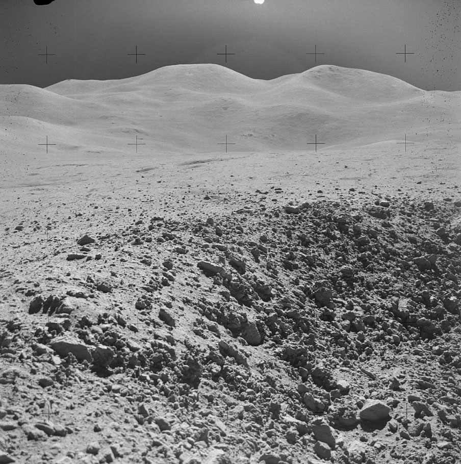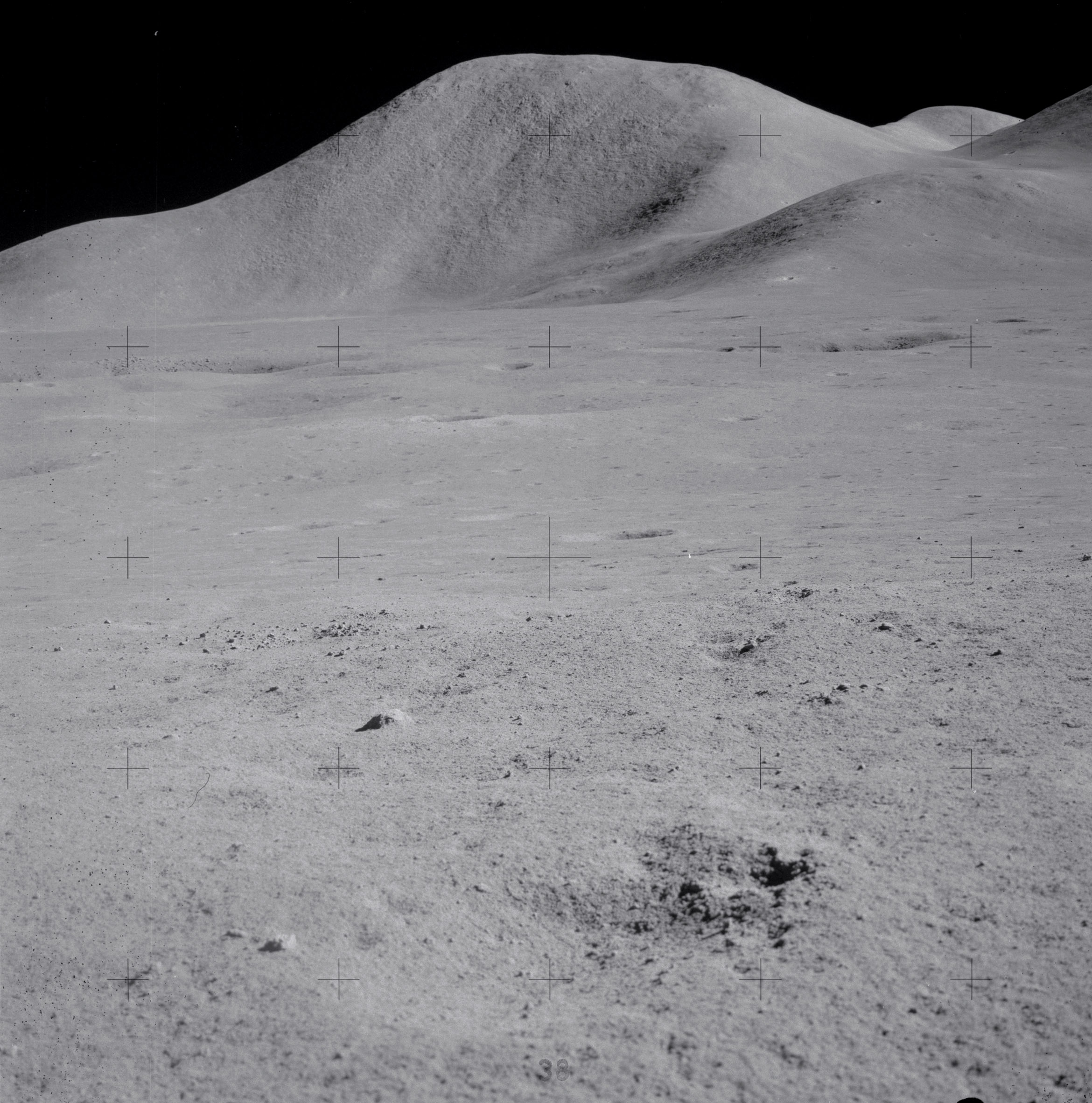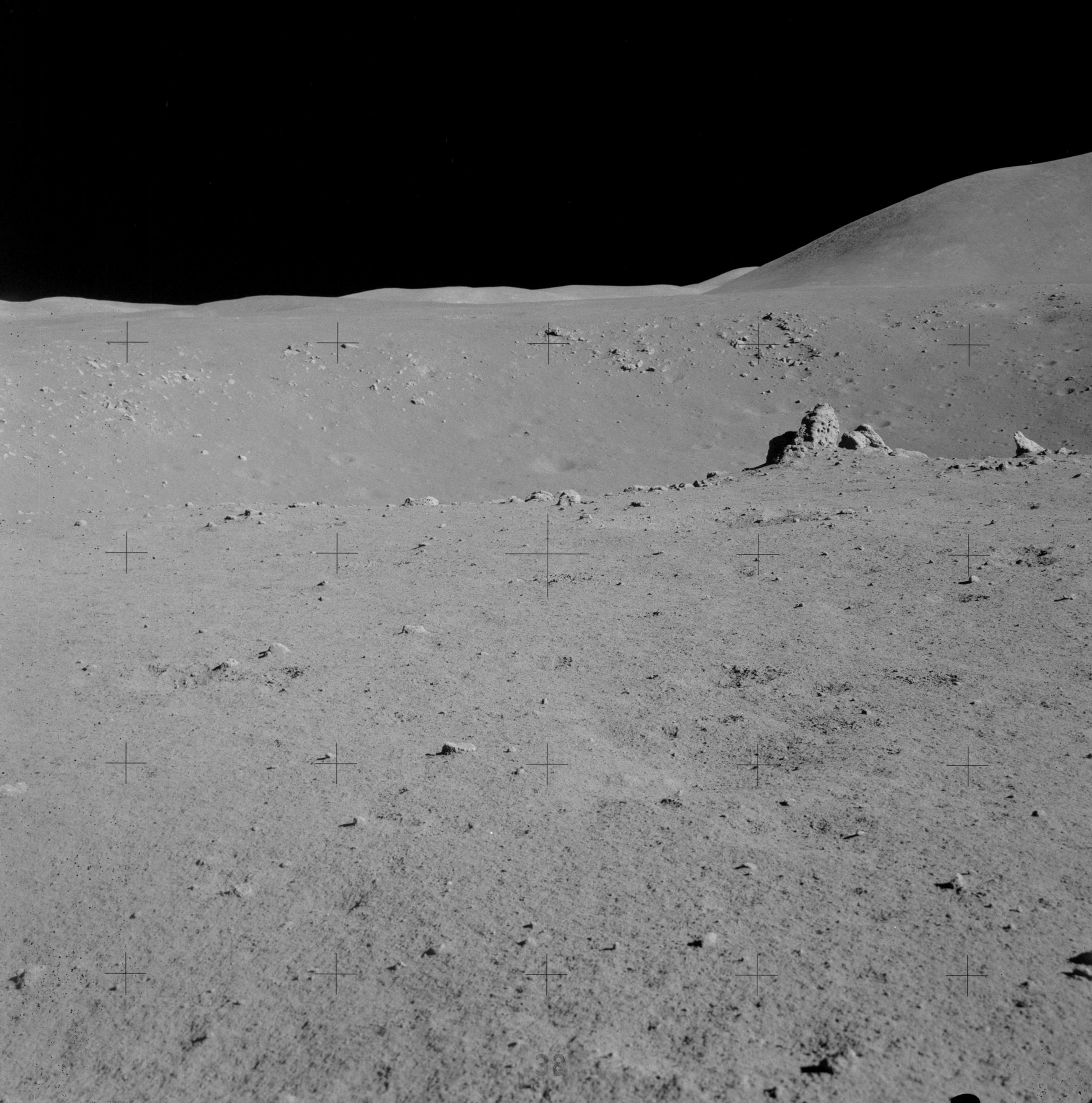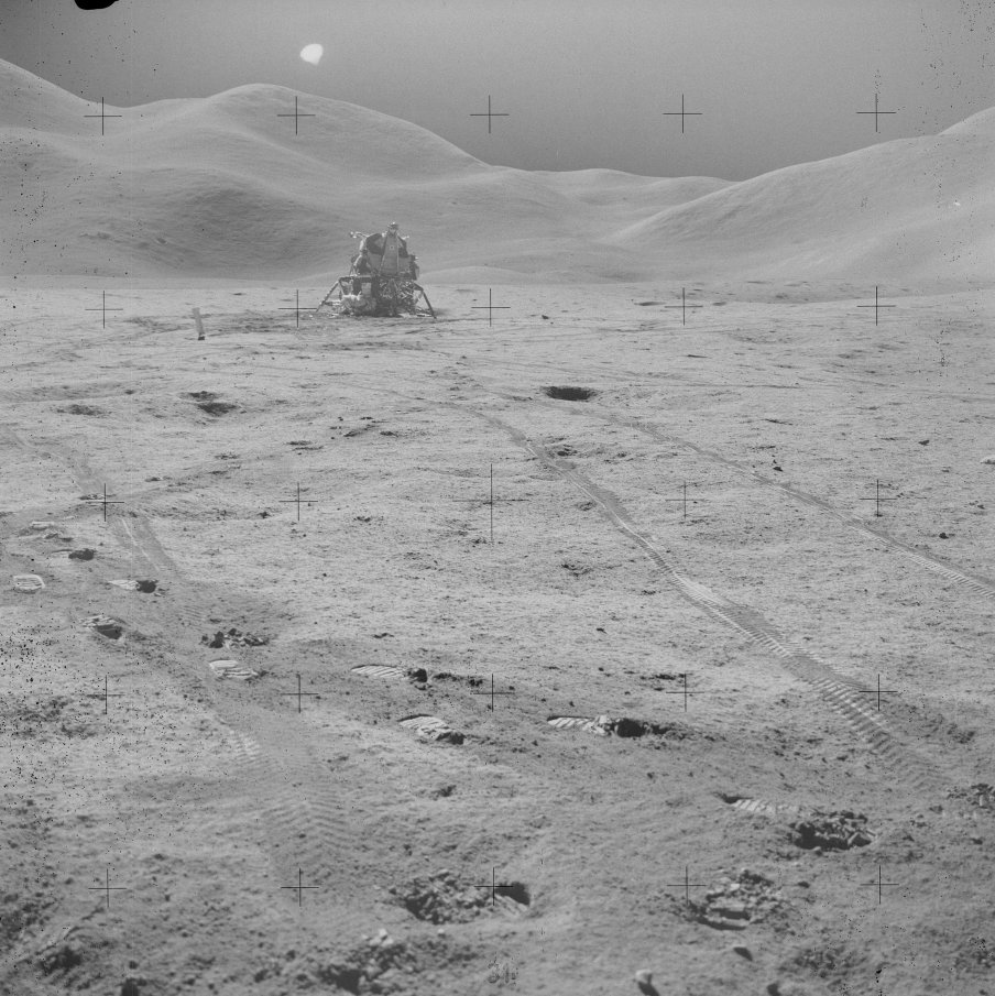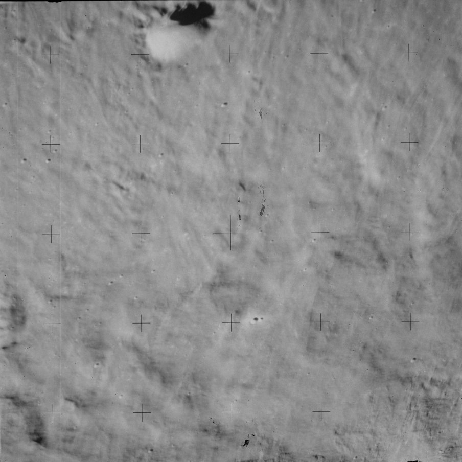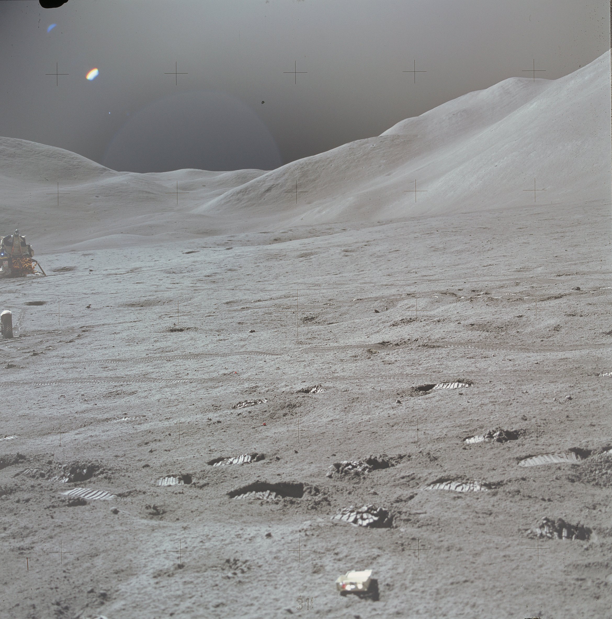This pan camera frame was taken at a Ground Elapsed Time of about 108 hours, which was about an hour after the end of the Stand-Up EVA (SEVA). The solar elevation was about 10.5 degrees. A high-resolution detail shows the area immediately around the LM. Scans courtesy Stephen Tellier.Rev 22 Mapping (Metric) Camera Frame 0585 ( 13 Mb )