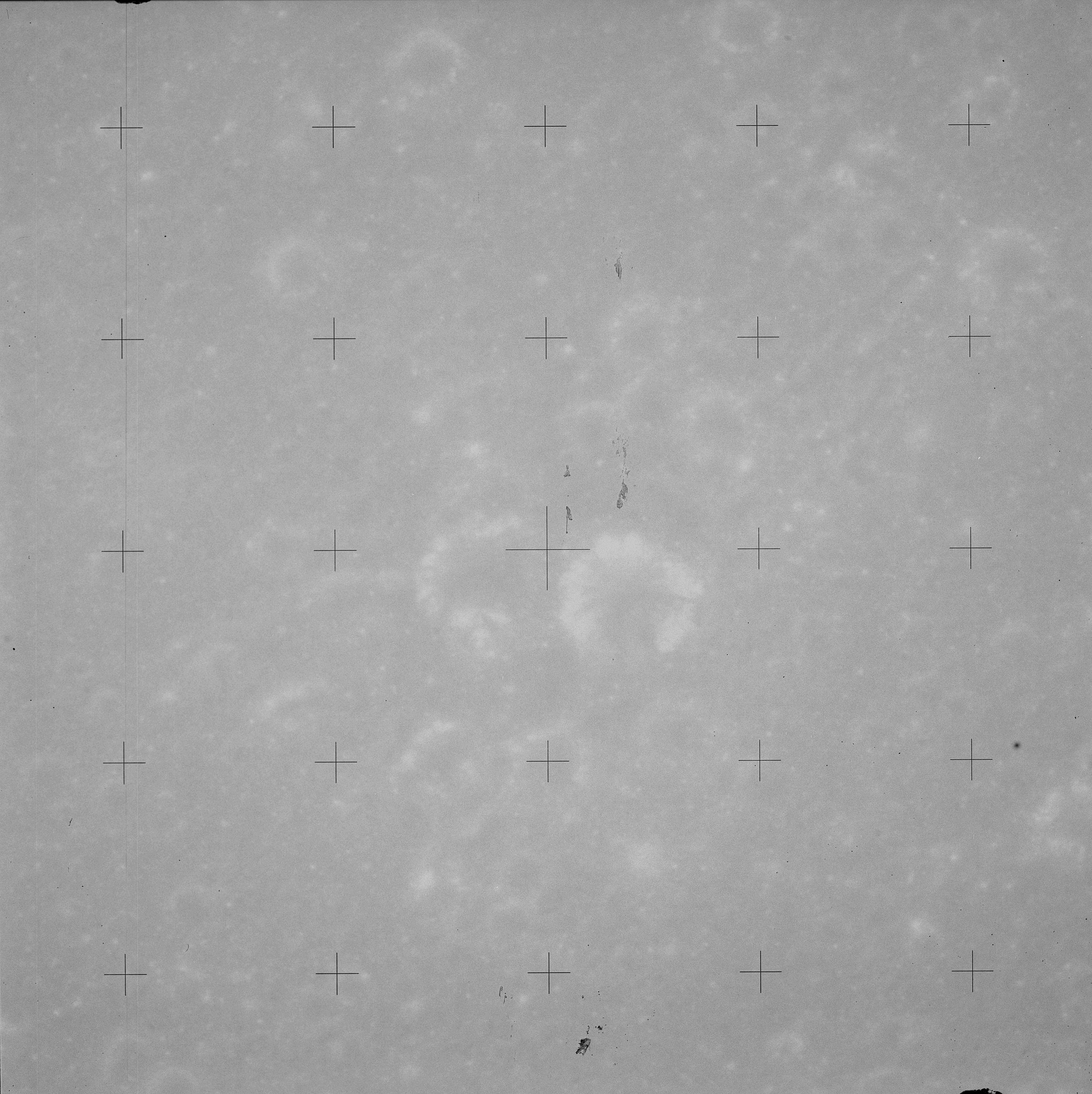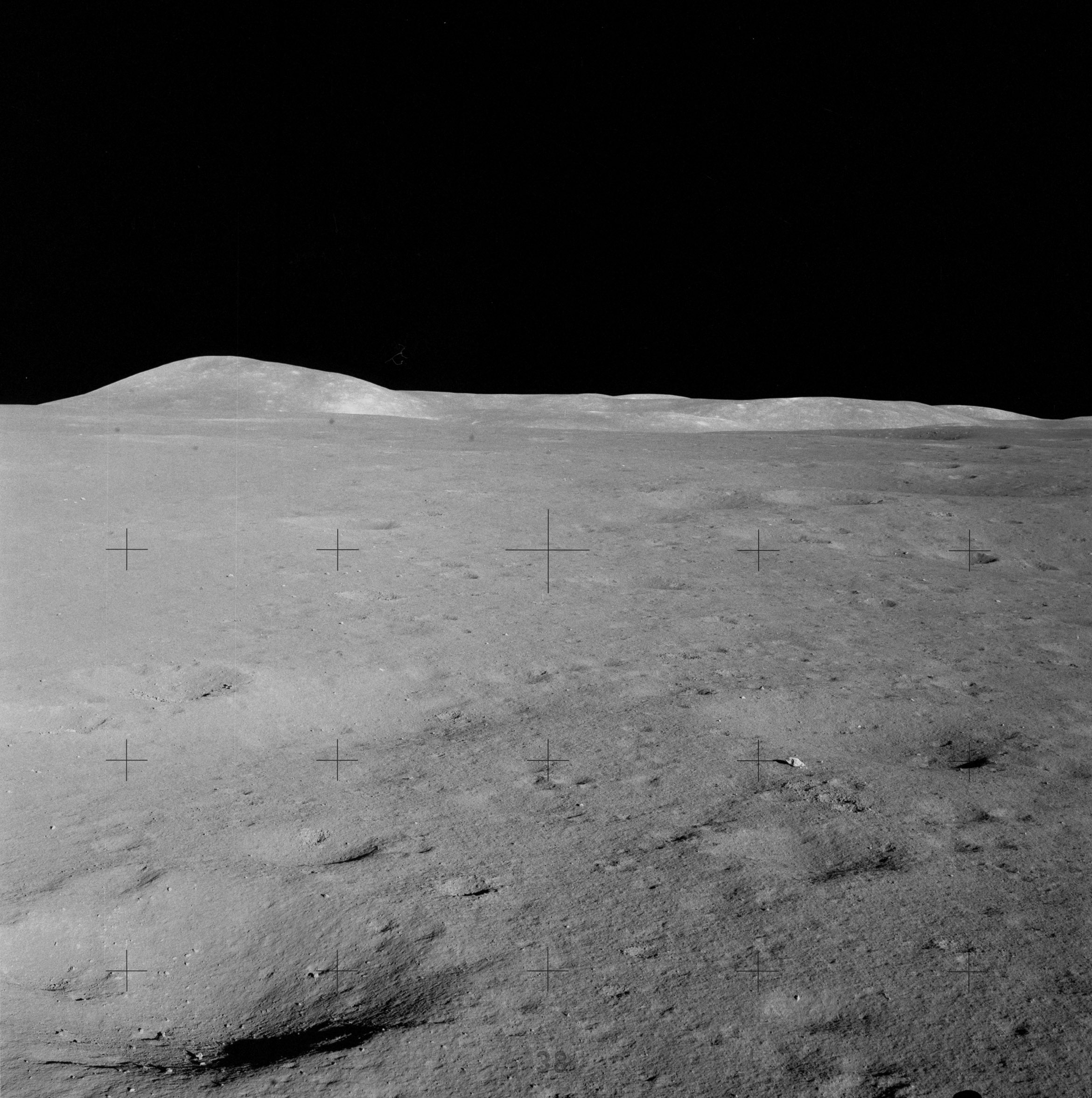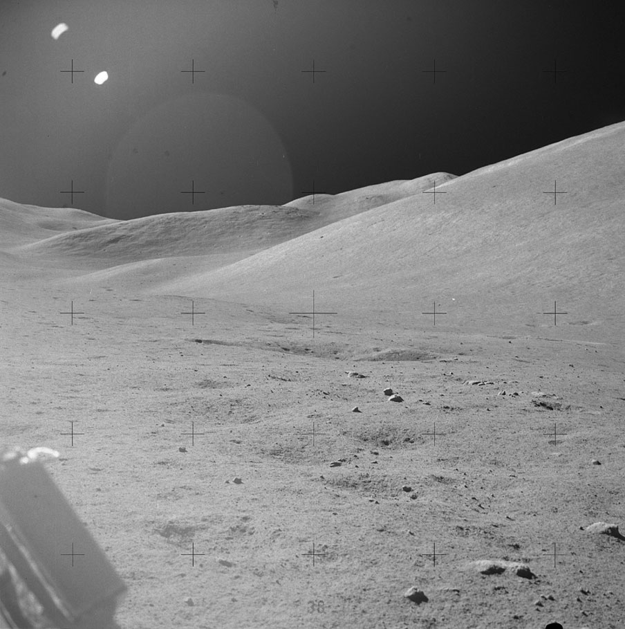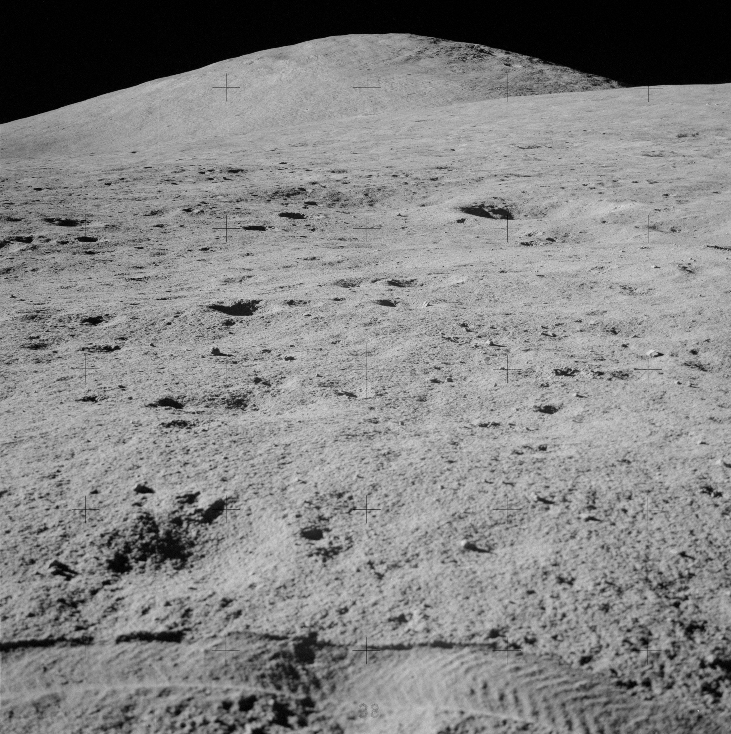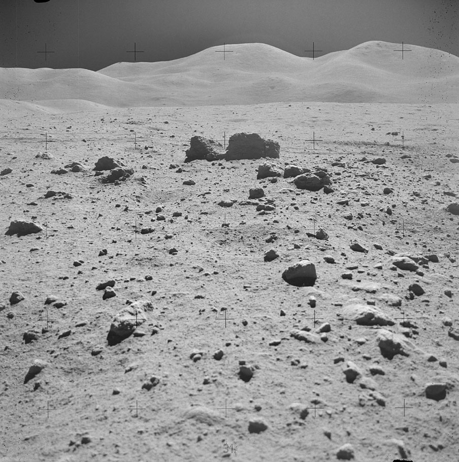 This pan camera frame was taken at a Ground Elapsed Time of about 108 hours, which was about an hour after the end of the Stand-Up EVA (SEVA). The solar elevation was about 10.5 degrees. A high-resolution detail shows the area immediately around the LM. Scans courtesy Stephen Tellier.Rev 22 Mapping (Metric) Camera Frame 0585 ( 13 Mb )