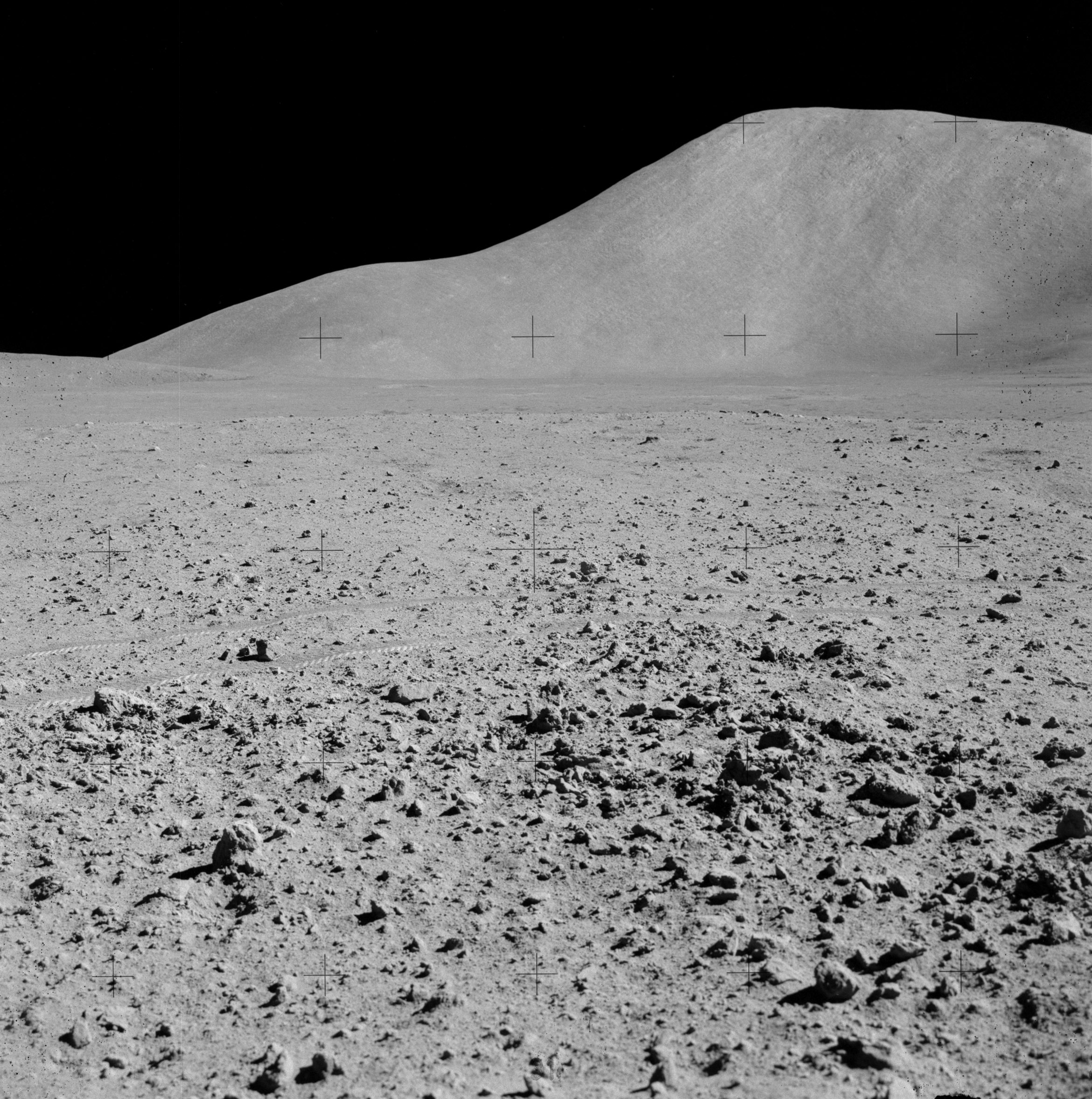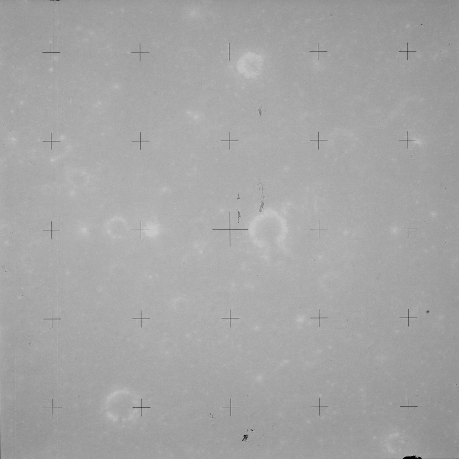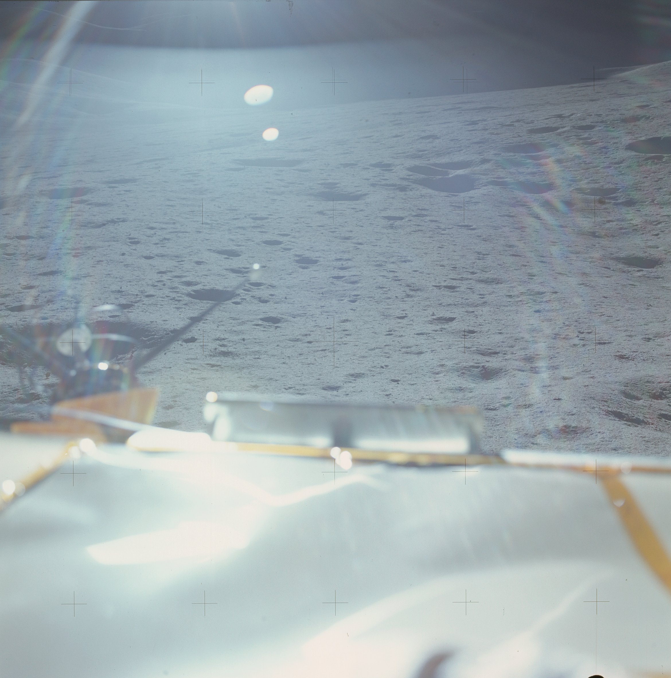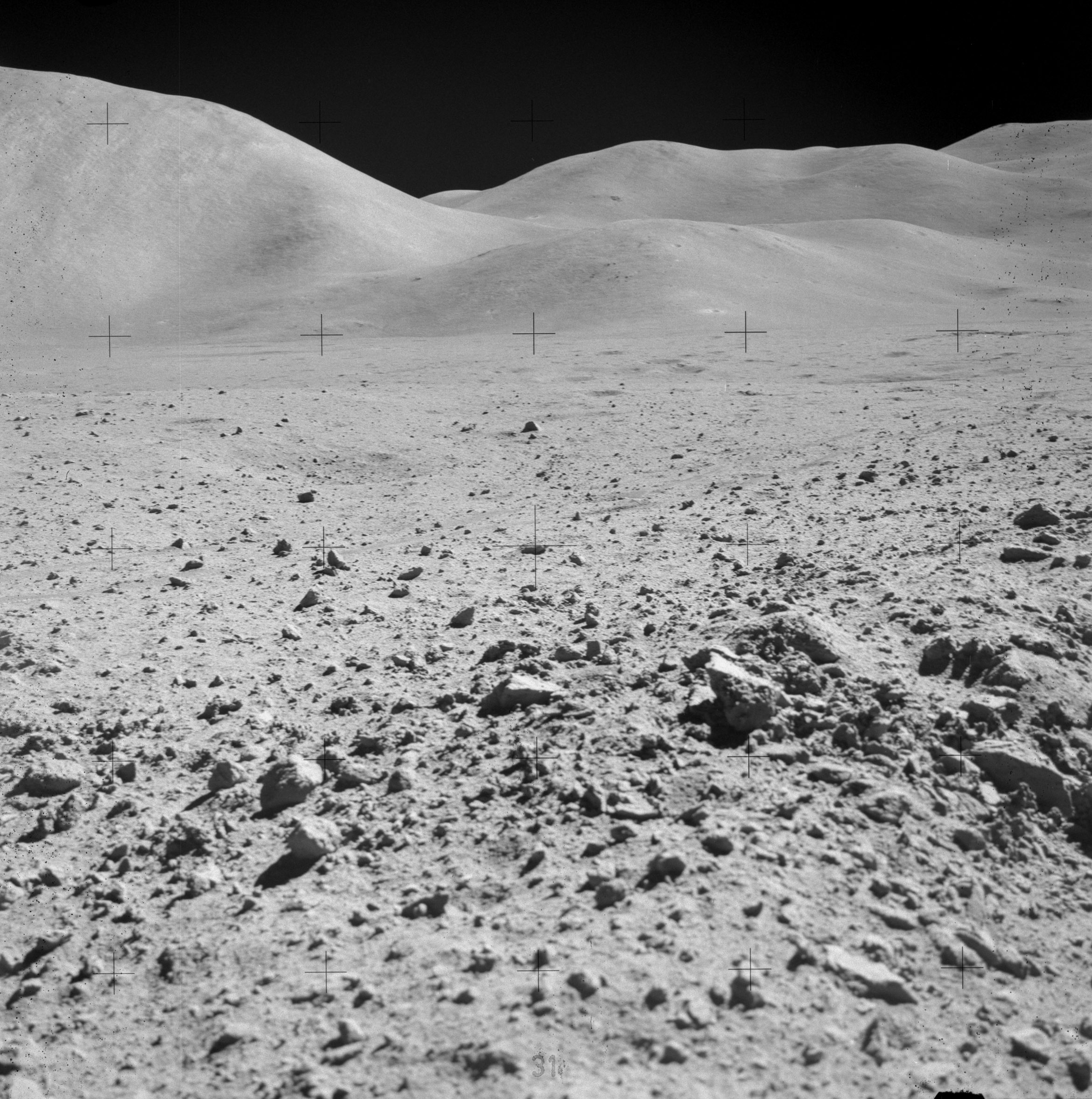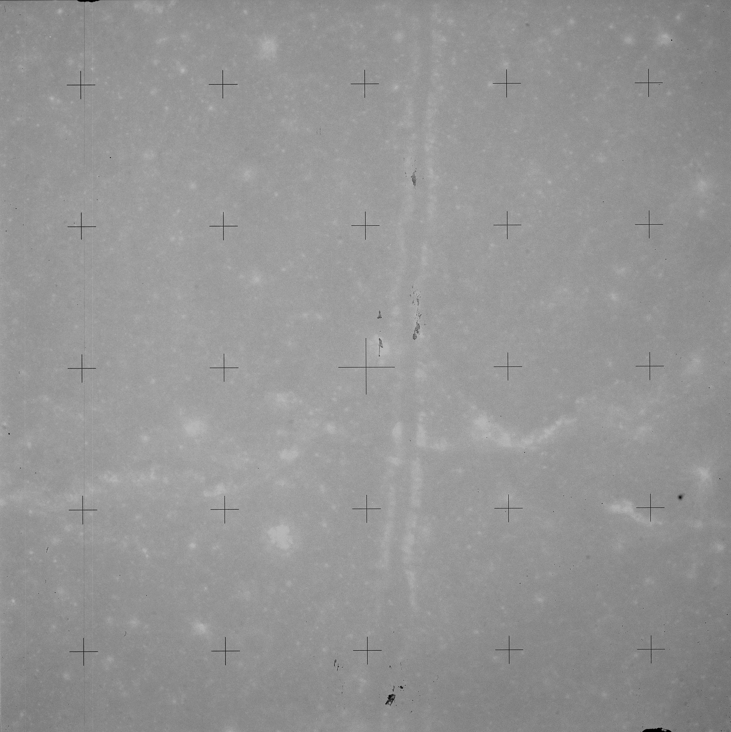 This pan camera frame was taken at a Ground Elapsed Time of about 108 hours, which was about an hour after the end of the Stand-Up EVA (SEVA). The solar elevation was about 10.5 degrees. A high-resolution detail shows the area immediately around the LM. Scans courtesy Stephen Tellier.Rev 22 Mapping (Metric) Camera Frame 0585 ( 13 Mb )