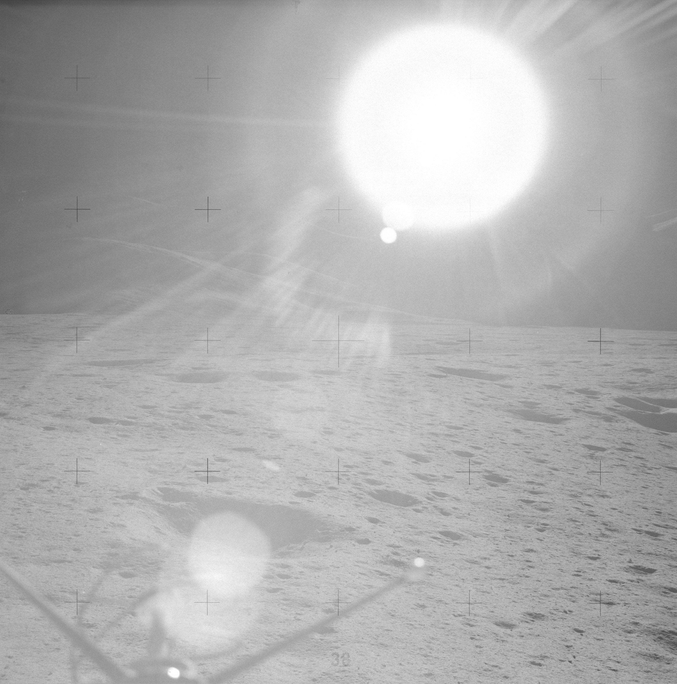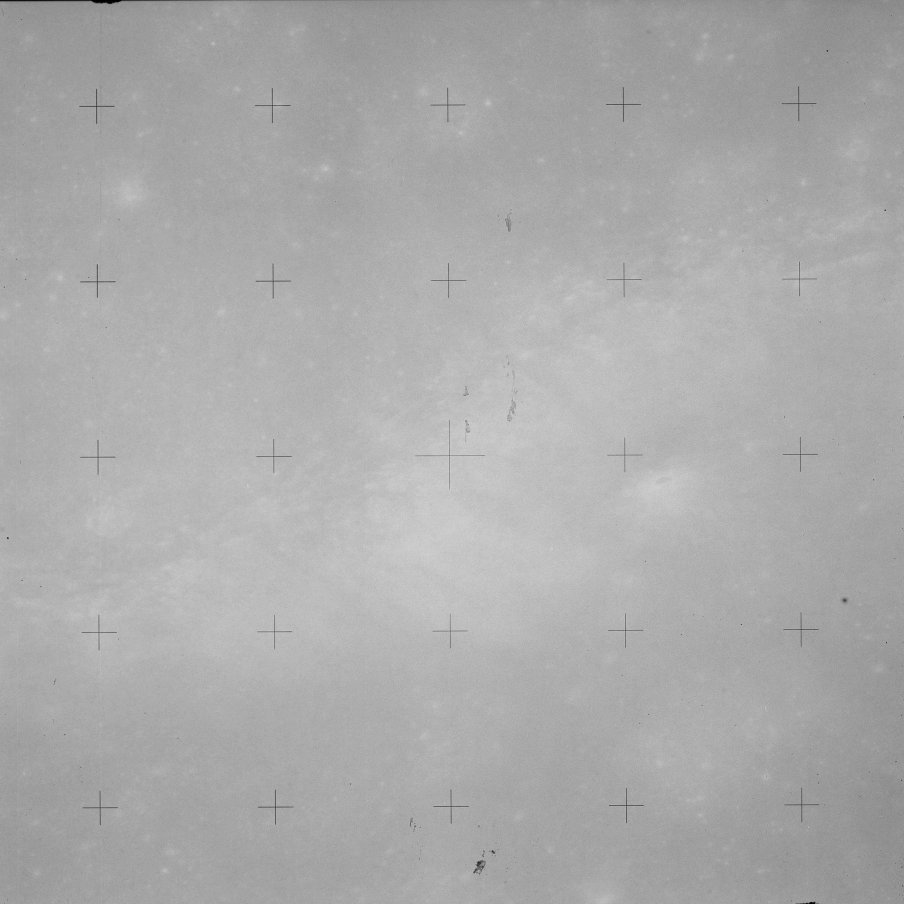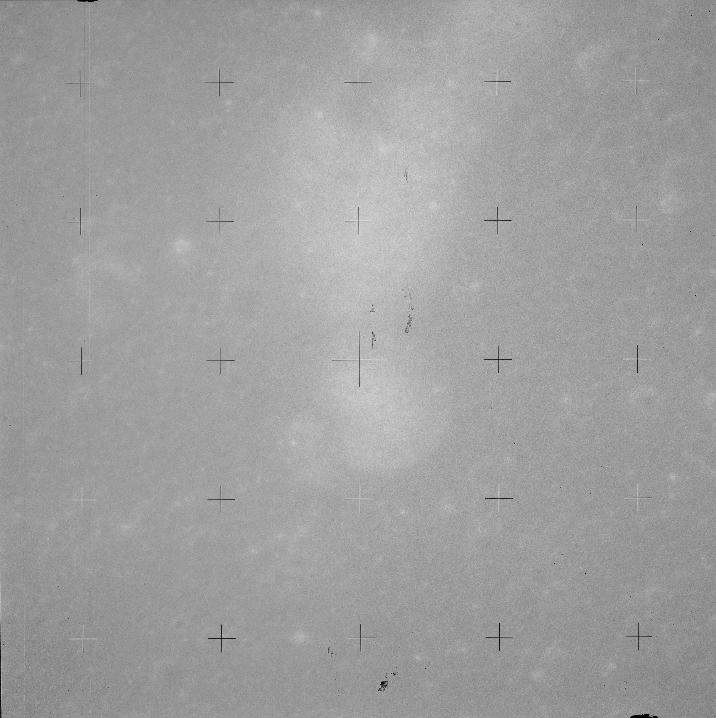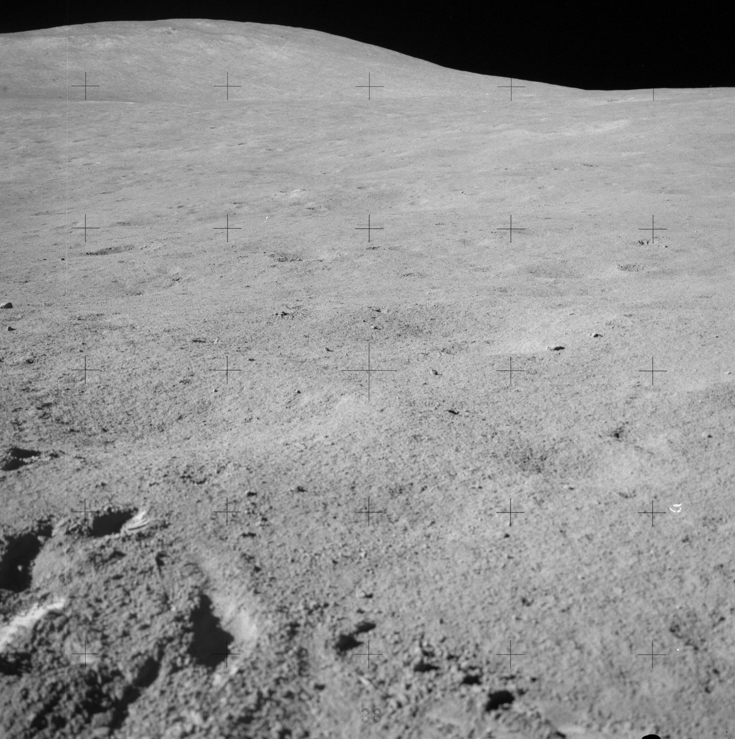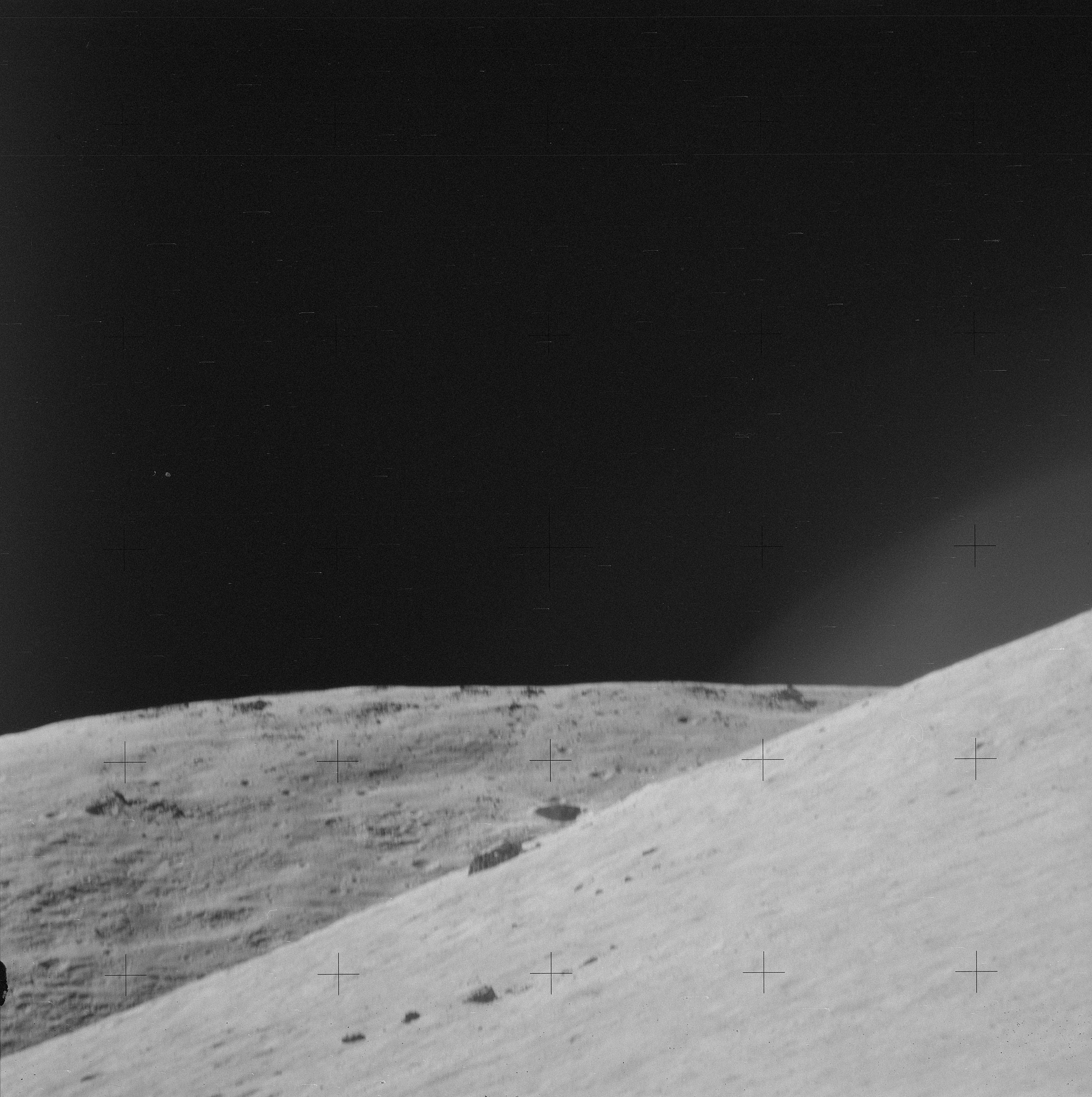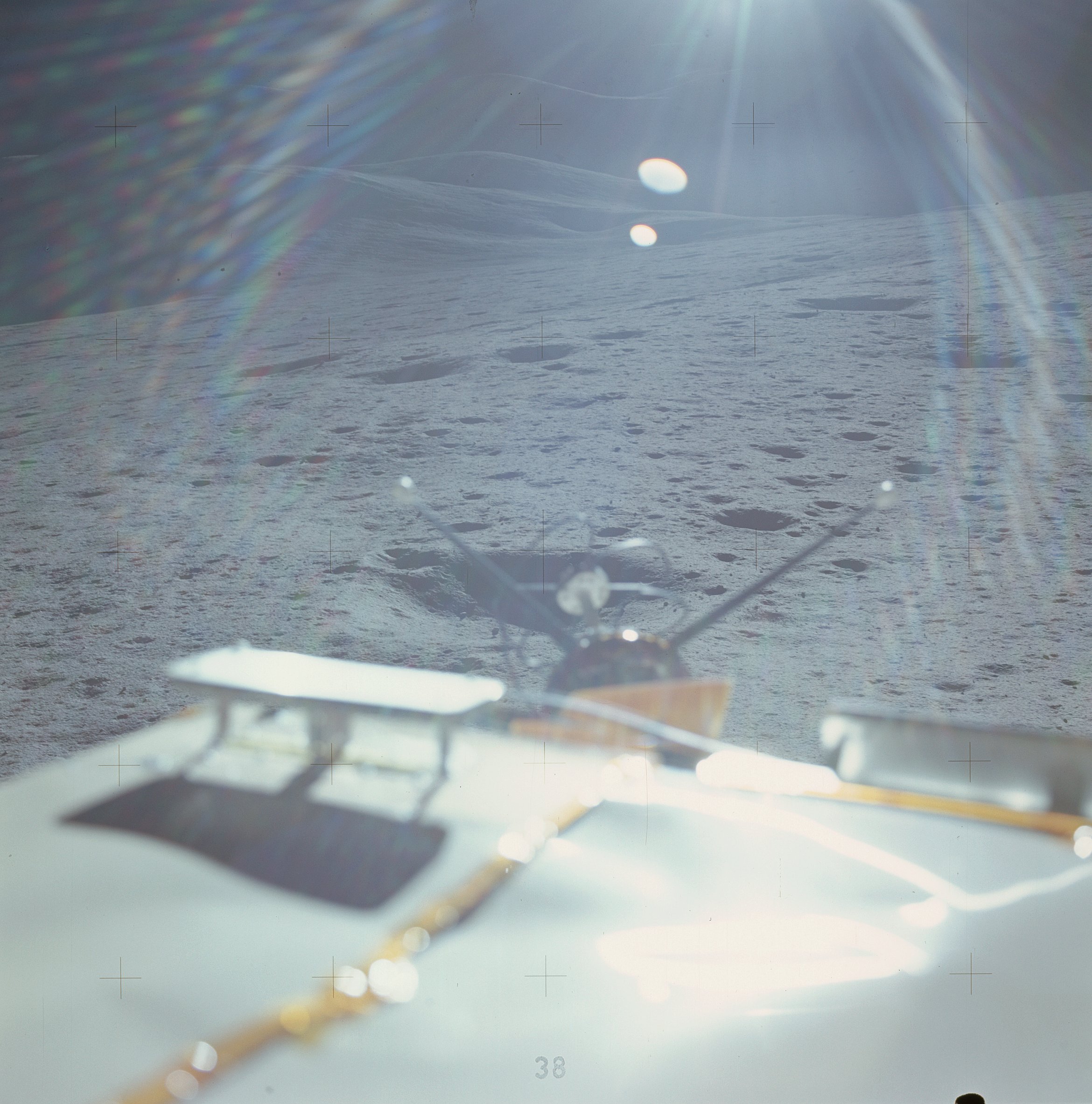 This pan camera frame was taken at a Ground Elapsed Time of about 108 hours, which was about an hour after the end of the Stand-Up EVA (SEVA). The solar elevation was about 10.5 degrees. A high-resolution detail shows the area immediately around the LM. Scans courtesy Stephen Tellier.Rev 22 Mapping (Metric) Camera Frame 0585 ( 13 Mb )