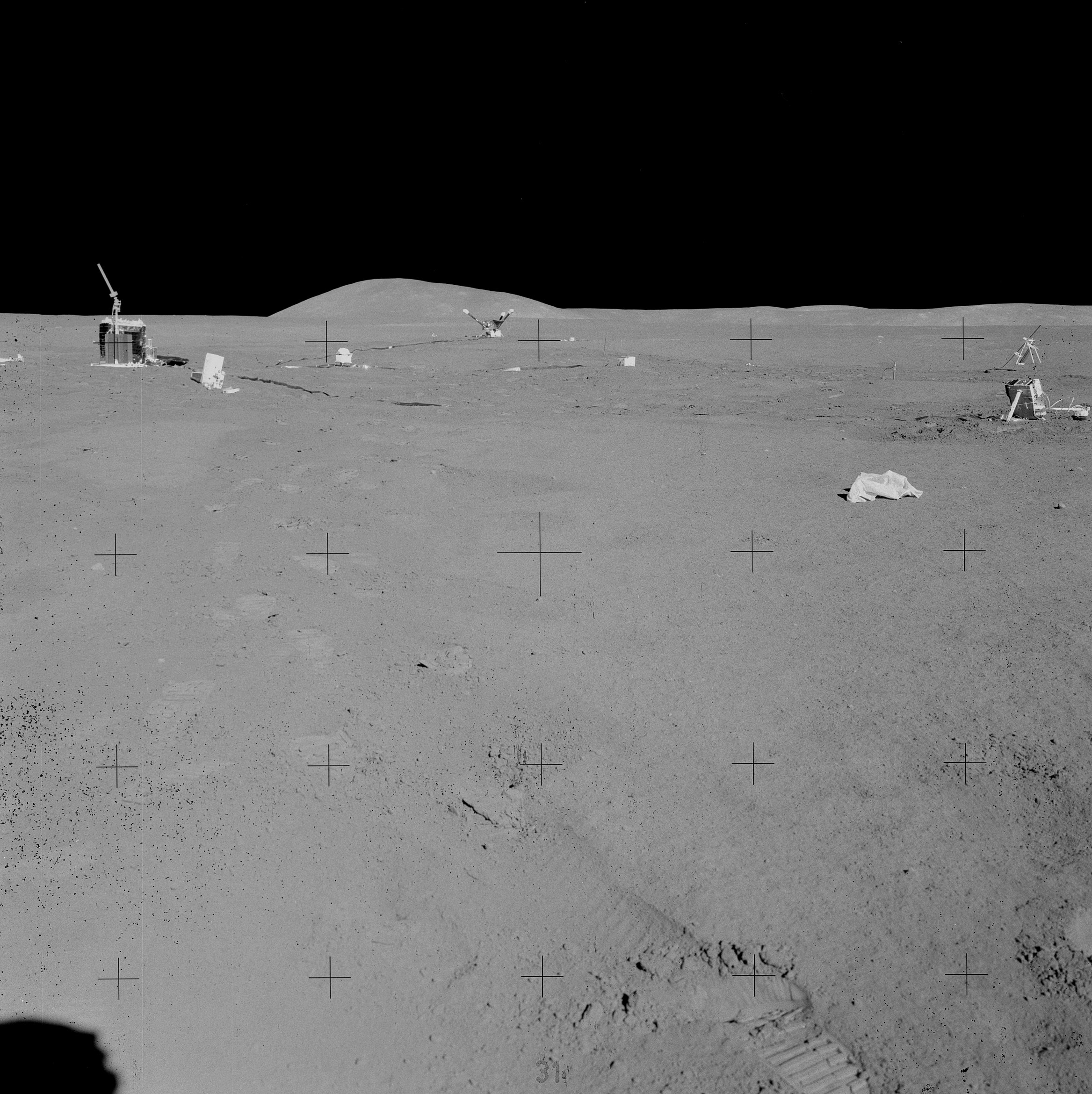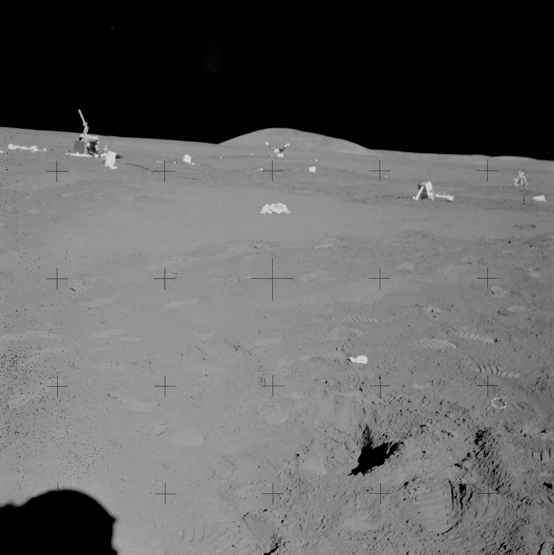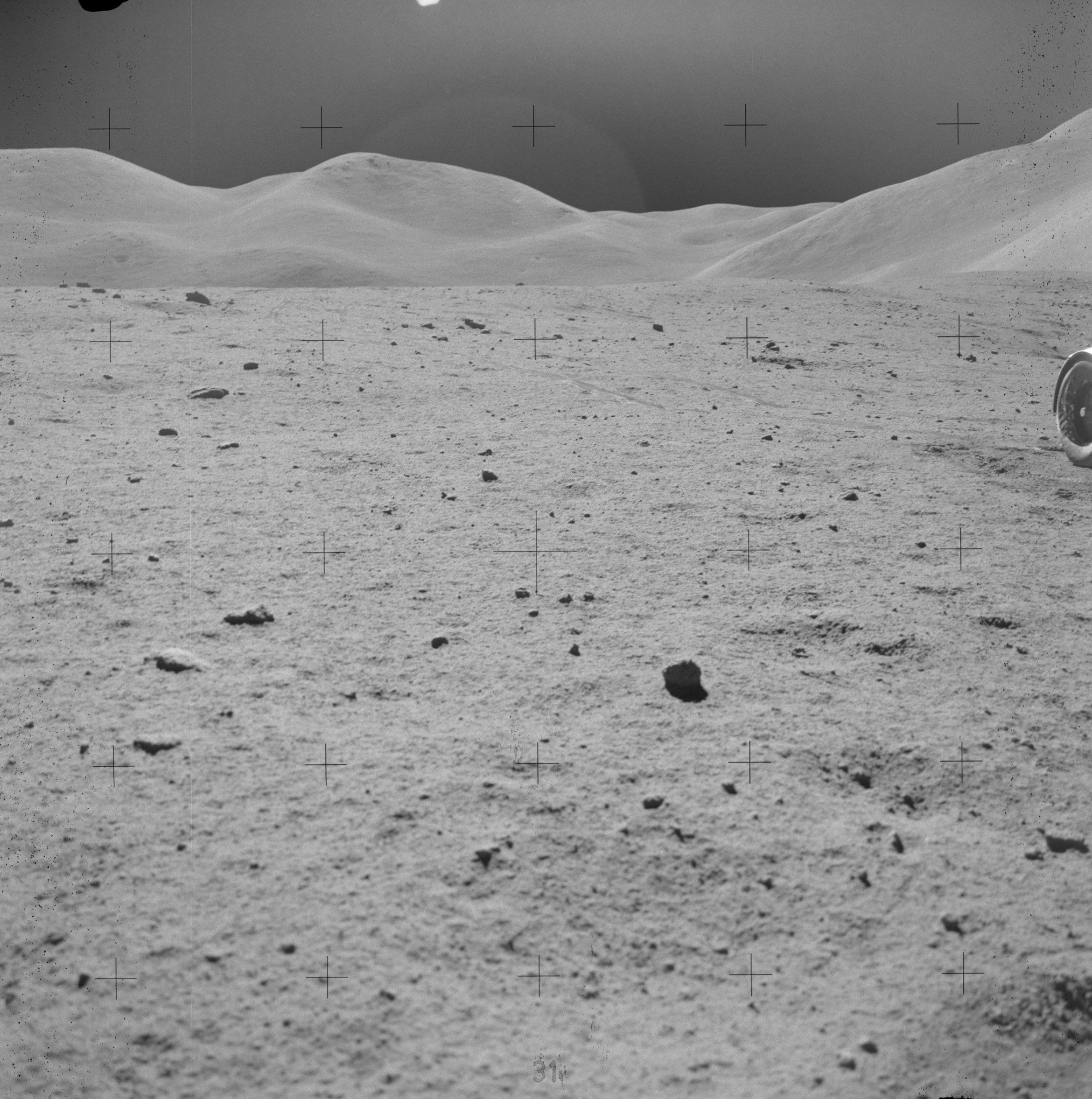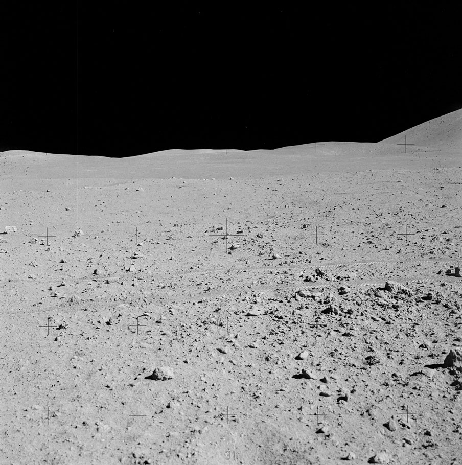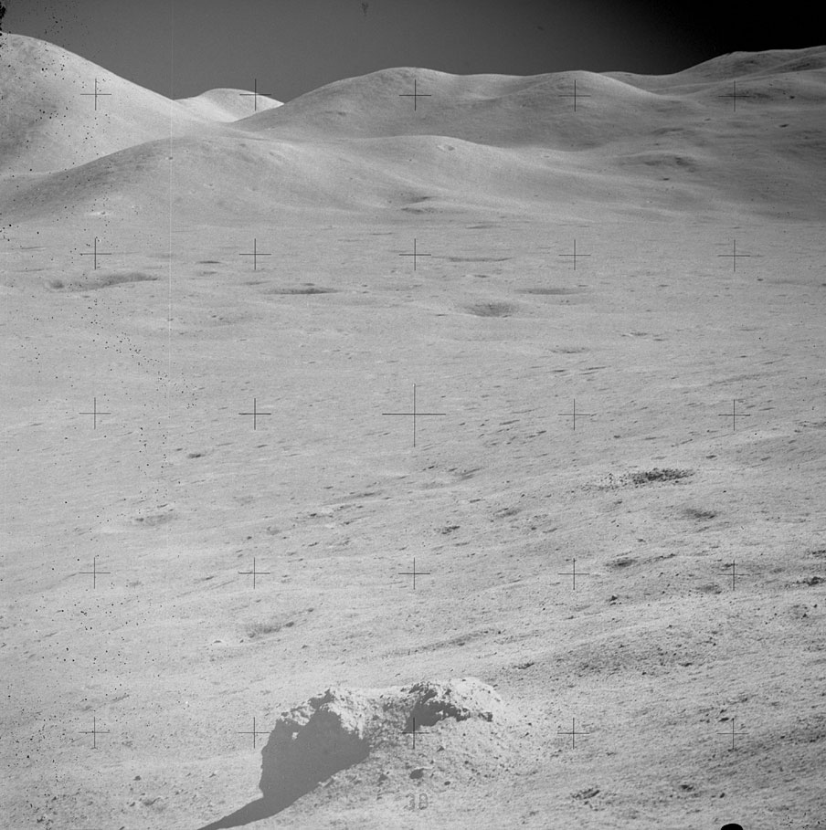 This pan camera frame was taken at a Ground Elapsed Time of about 108 hours, which was about an hour after the end of the Stand-Up EVA (SEVA). The solar elevation was about 10.5 degrees. A high-resolution detail shows the area immediately around the LM. Scans courtesy Stephen Tellier.Rev 22 Mapping (Metric) Camera Frame 0585 ( 13 Mb )