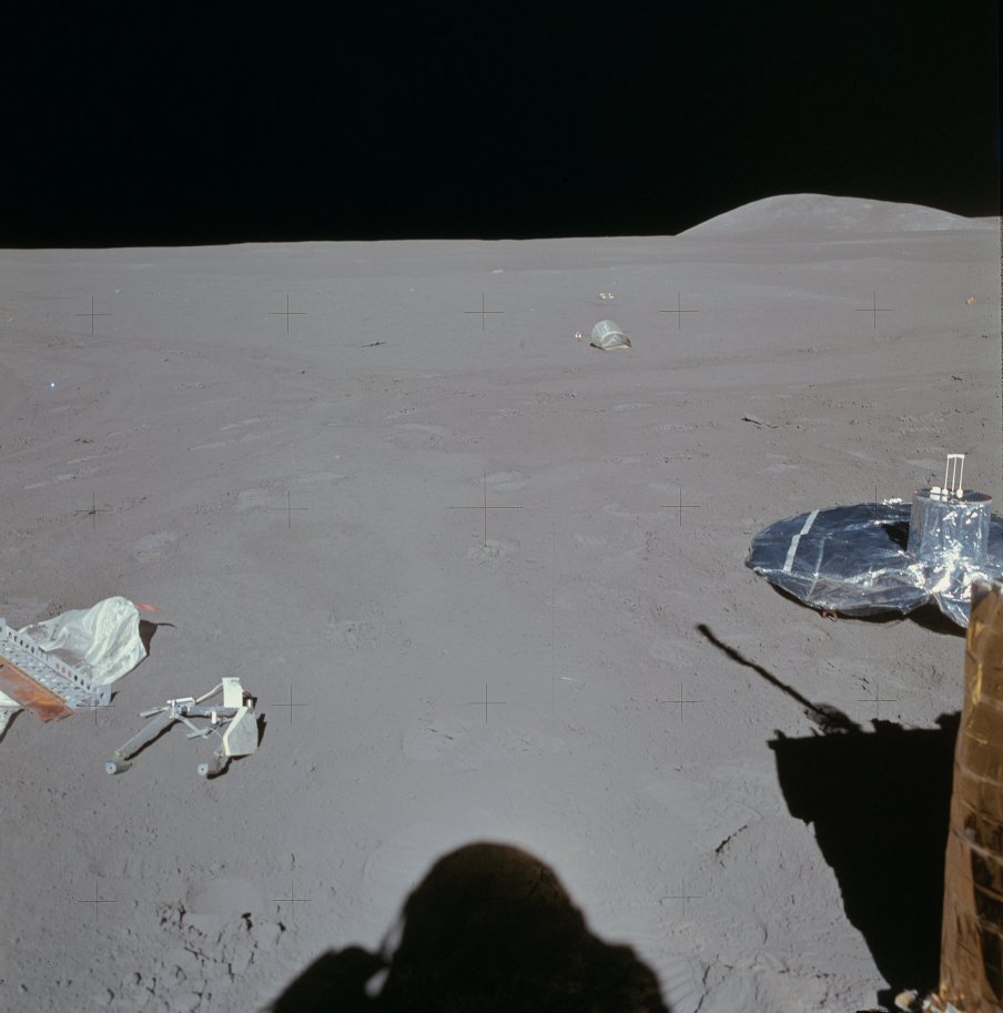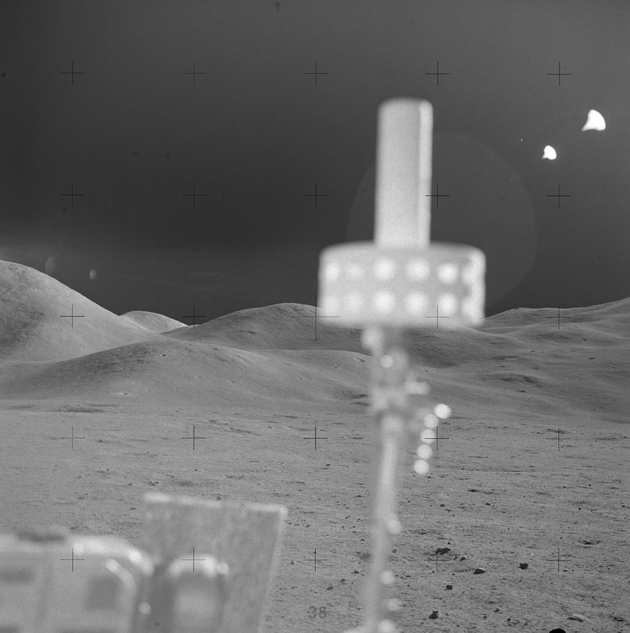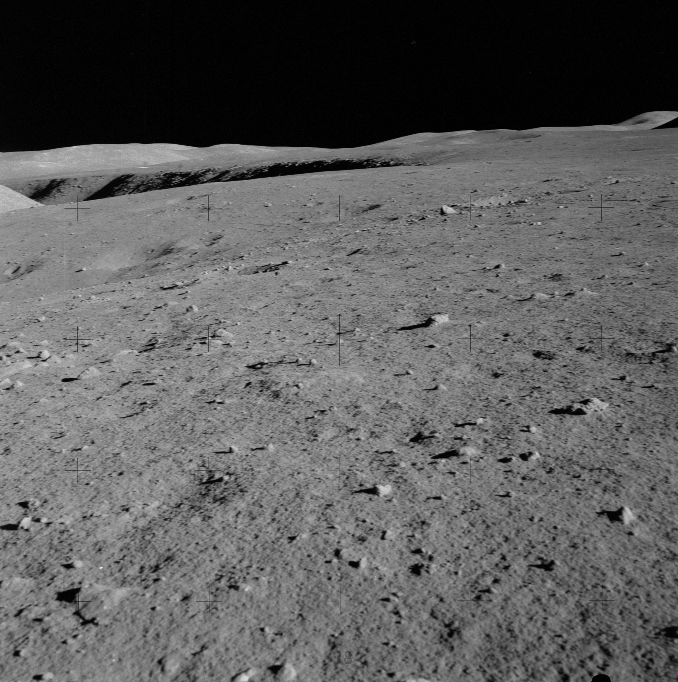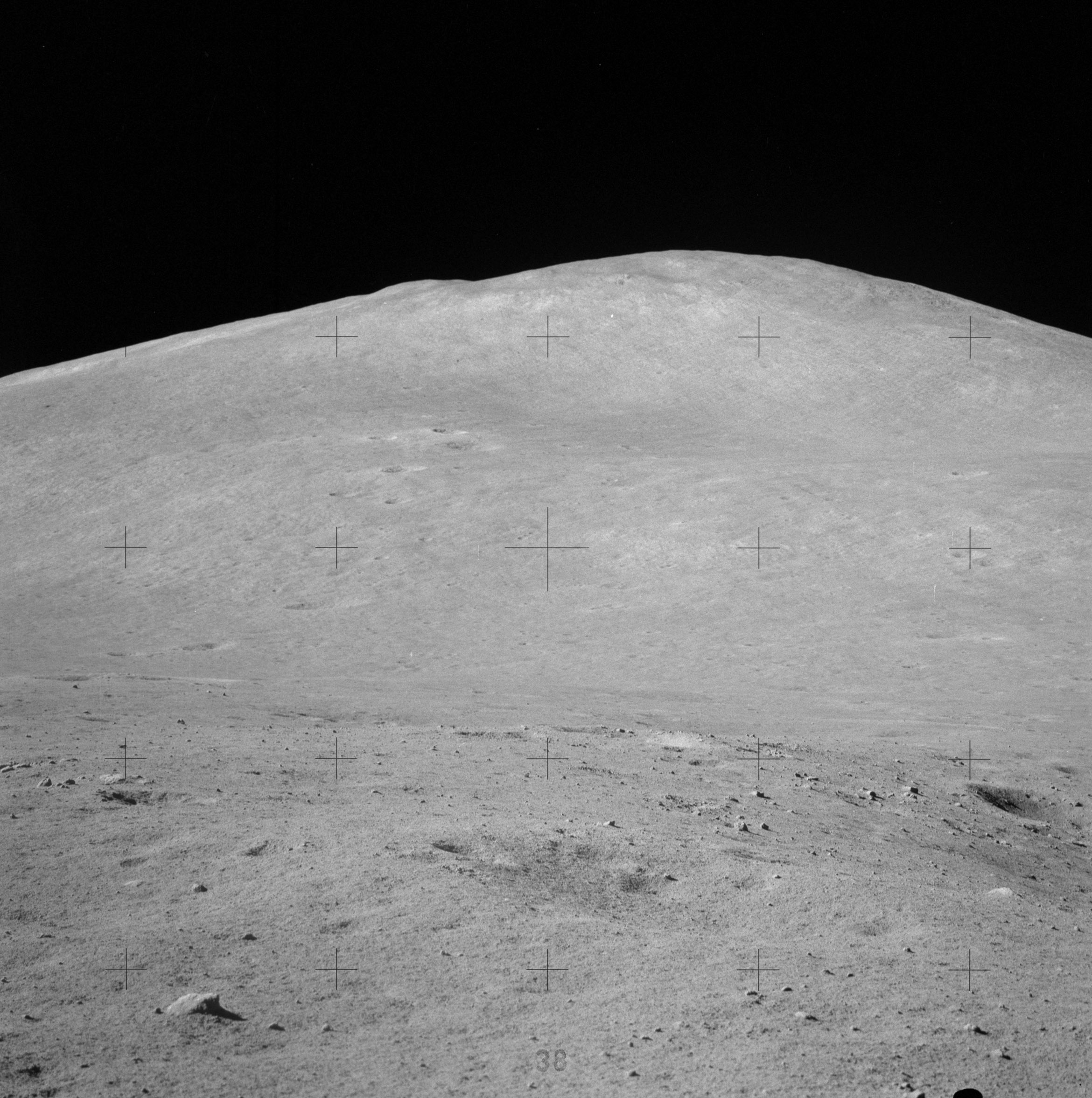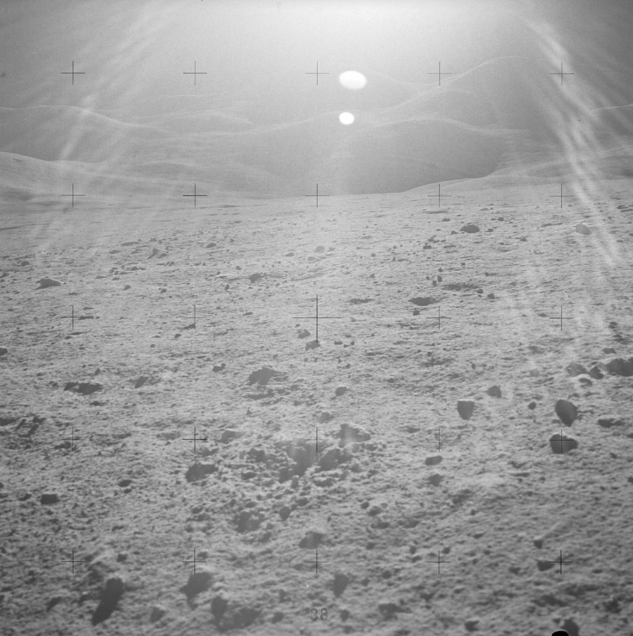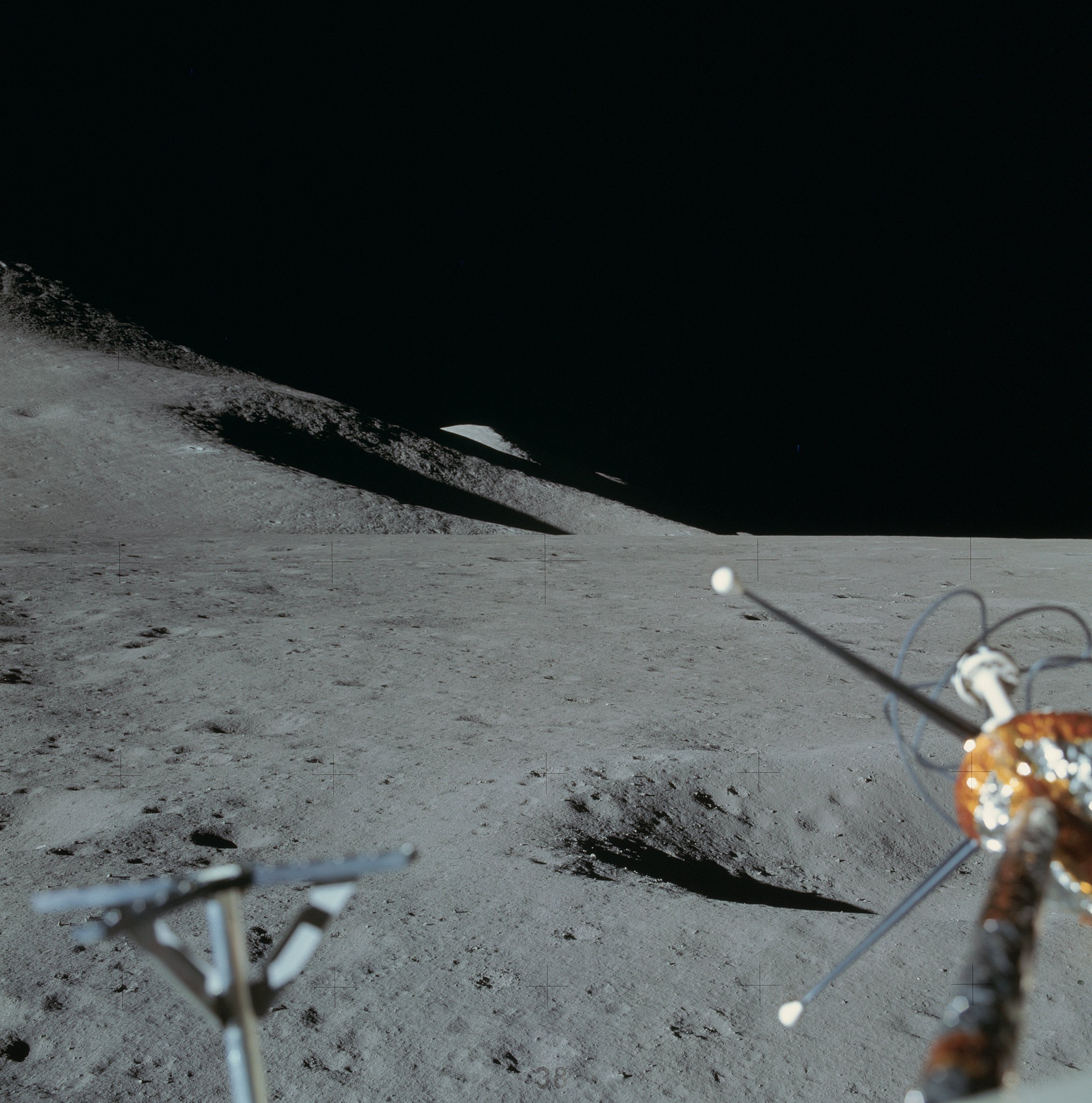 This pan camera frame was taken at a Ground Elapsed Time of about 108 hours, which was about an hour after the end of the Stand-Up EVA (SEVA). The solar elevation was about 10.5 degrees. A high-resolution detail shows the area immediately around the LM. Scans courtesy Stephen Tellier.Rev 22 Mapping (Metric) Camera Frame 0585 ( 13 Mb )