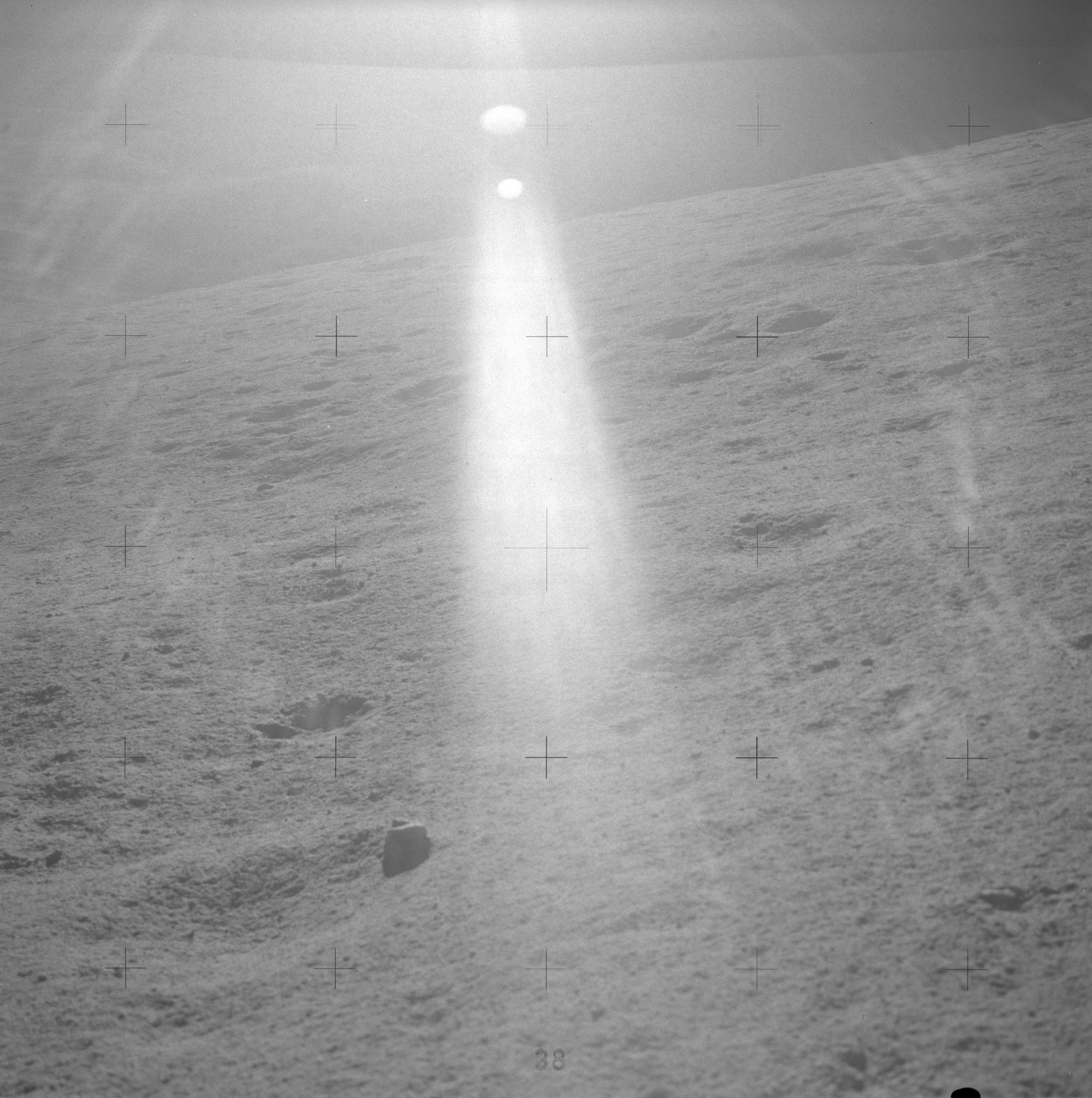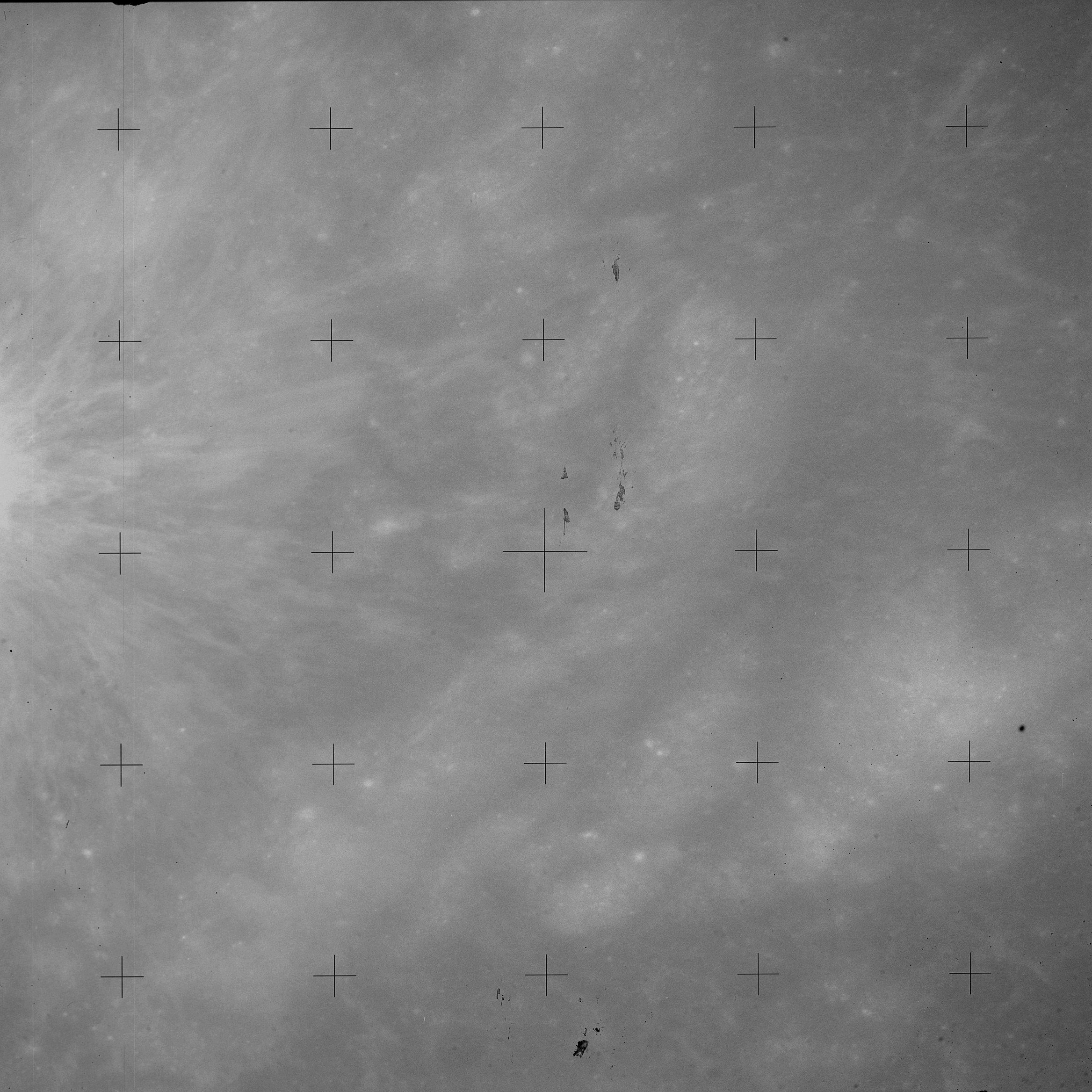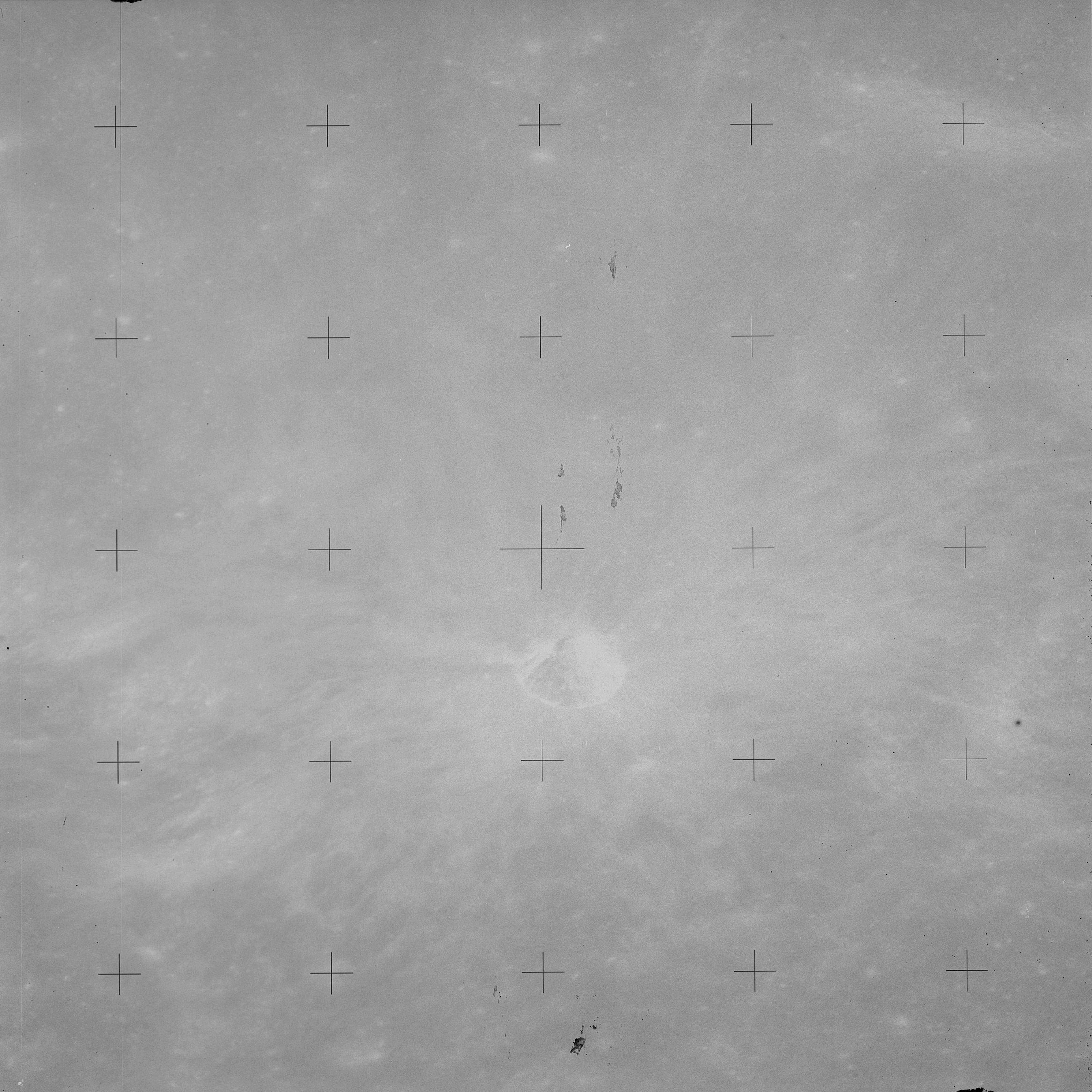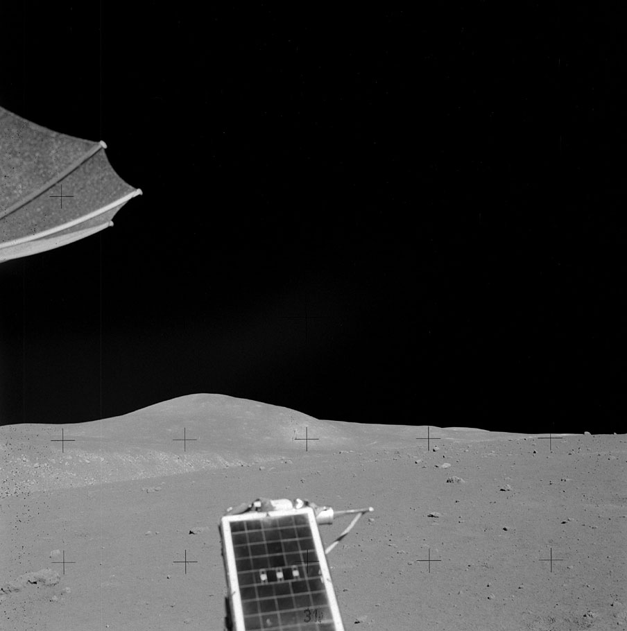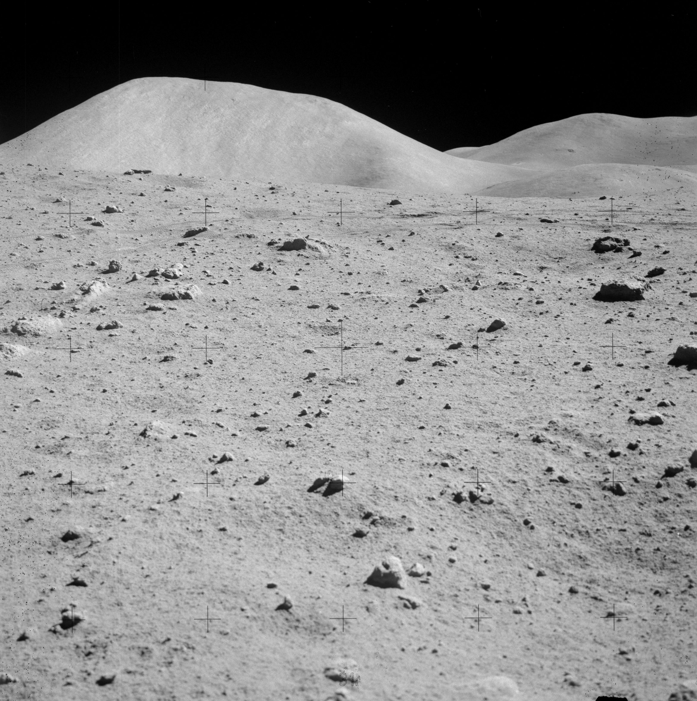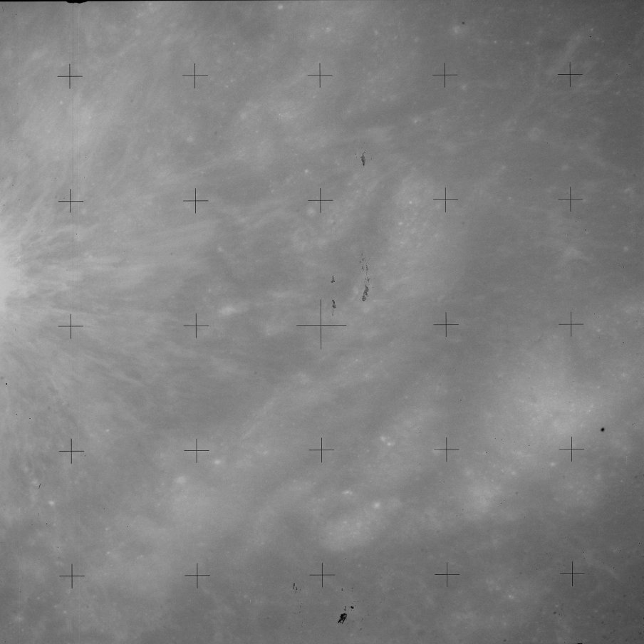 This pan camera frame was taken at a Ground Elapsed Time of about 108 hours, which was about an hour after the end of the Stand-Up EVA (SEVA). The solar elevation was about 10.5 degrees. A high-resolution detail shows the area immediately around the LM. Scans courtesy Stephen Tellier.Rev 22 Mapping (Metric) Camera Frame 0585 ( 13 Mb )