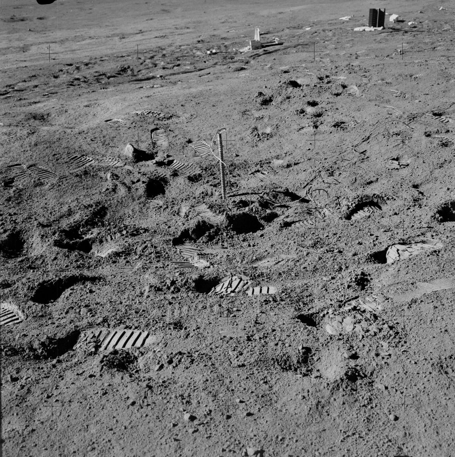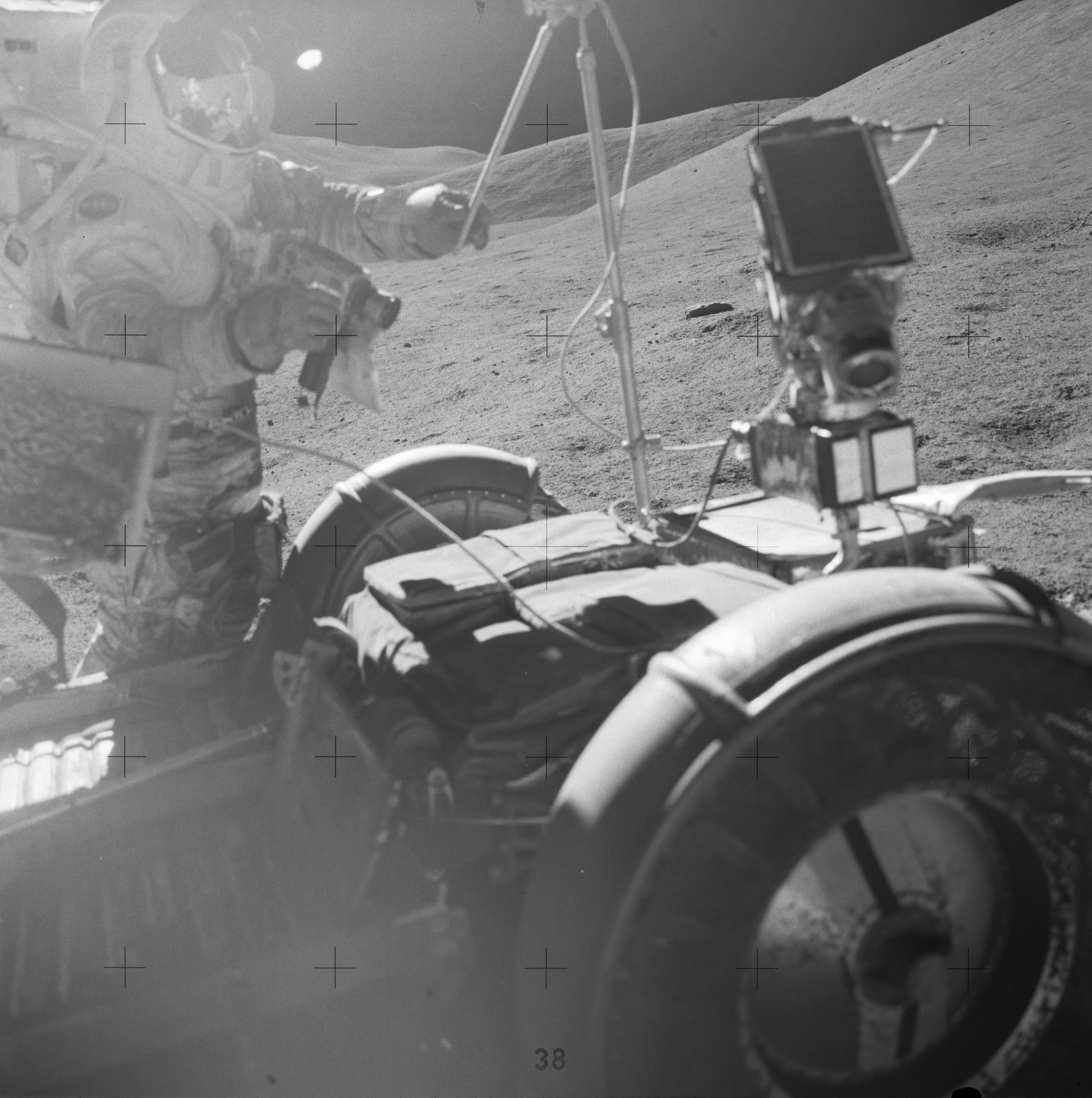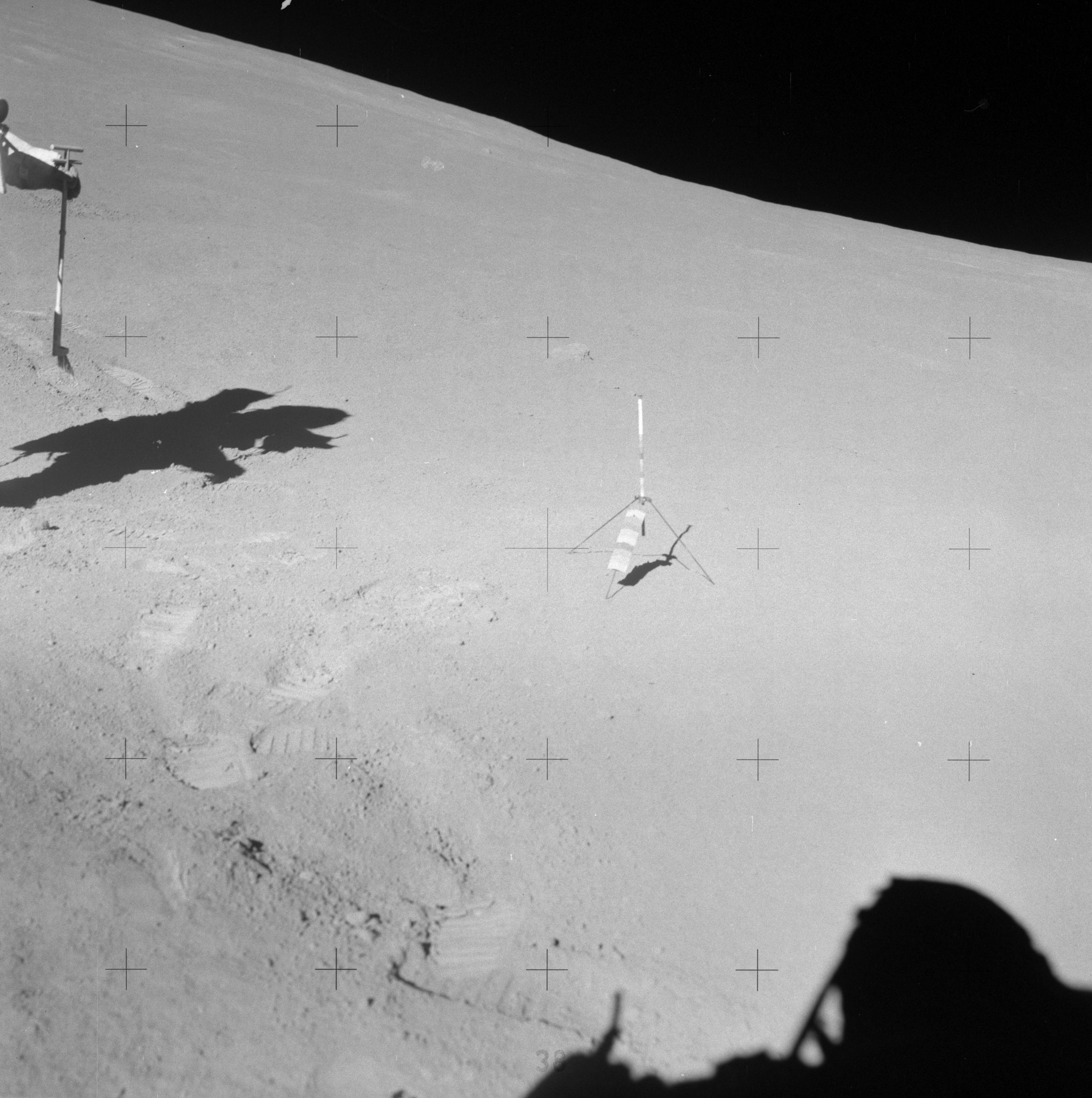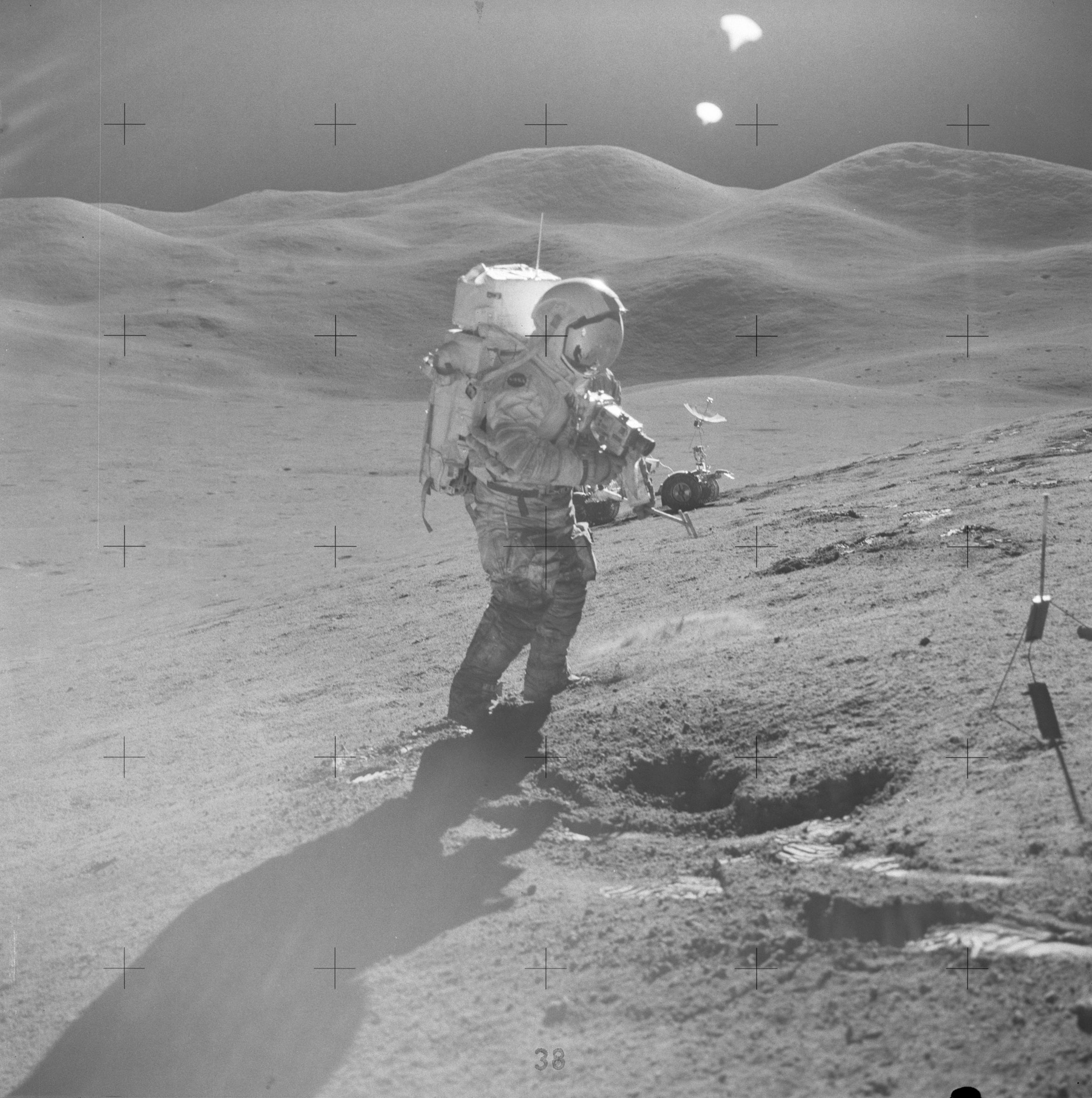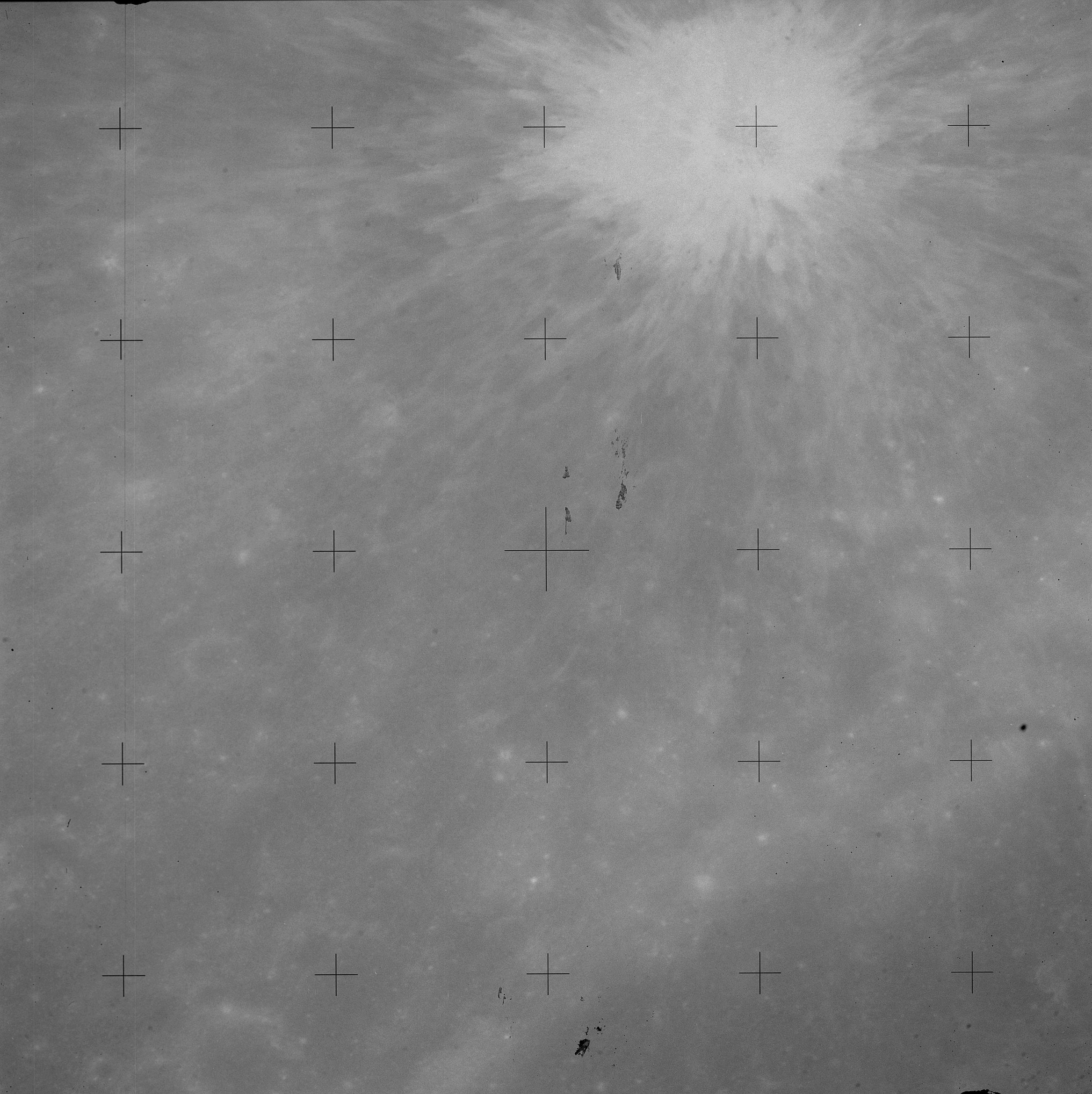 This pan camera frame was taken at a Ground Elapsed Time of about 108 hours, which was about an hour after the end of the Stand-Up EVA (SEVA). The solar elevation was about 10.5 degrees. A high-resolution detail shows the area immediately around the LM. Scans courtesy Stephen Tellier.Rev 22 Mapping (Metric) Camera Frame 0585 ( 13 Mb )