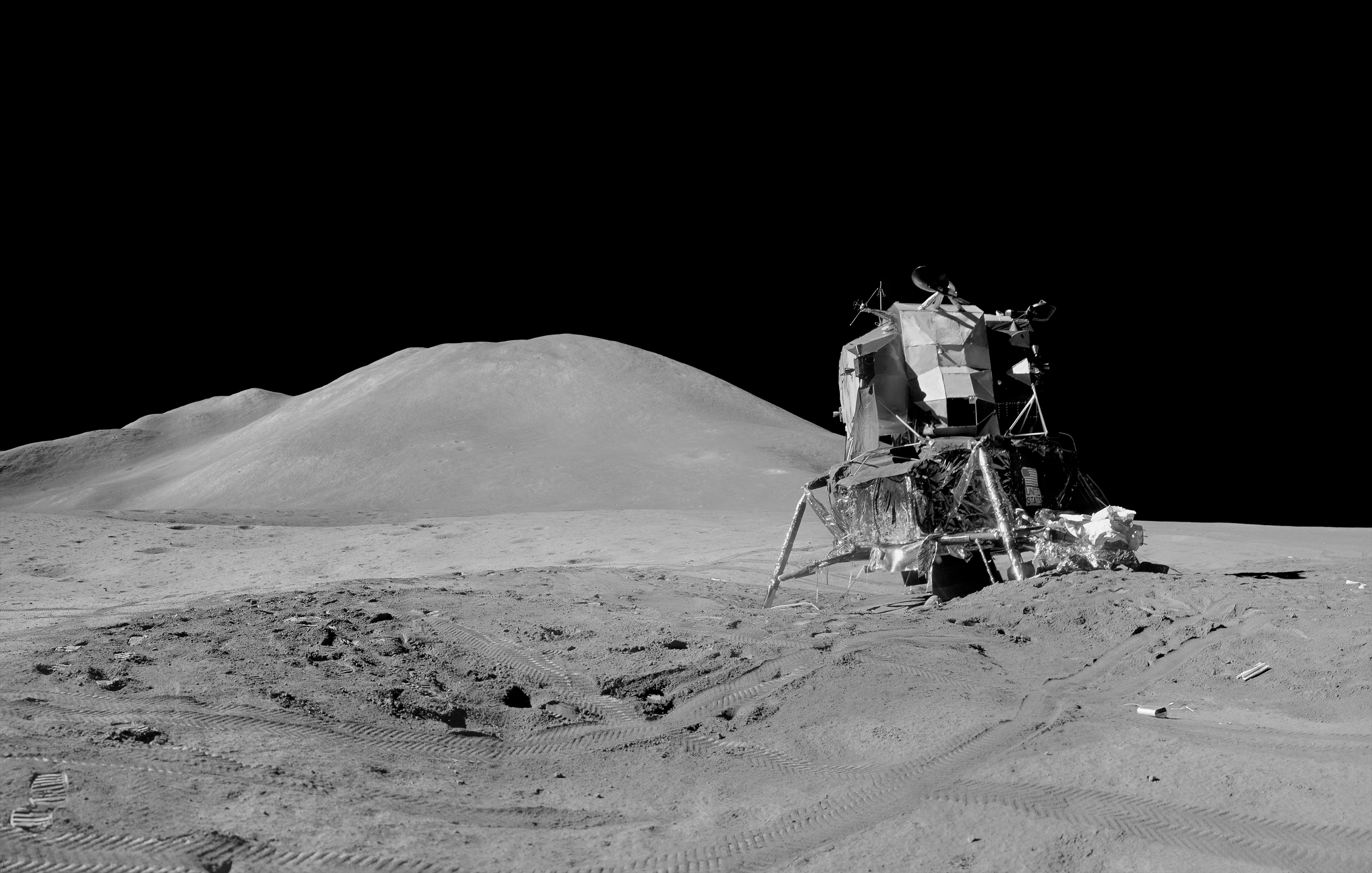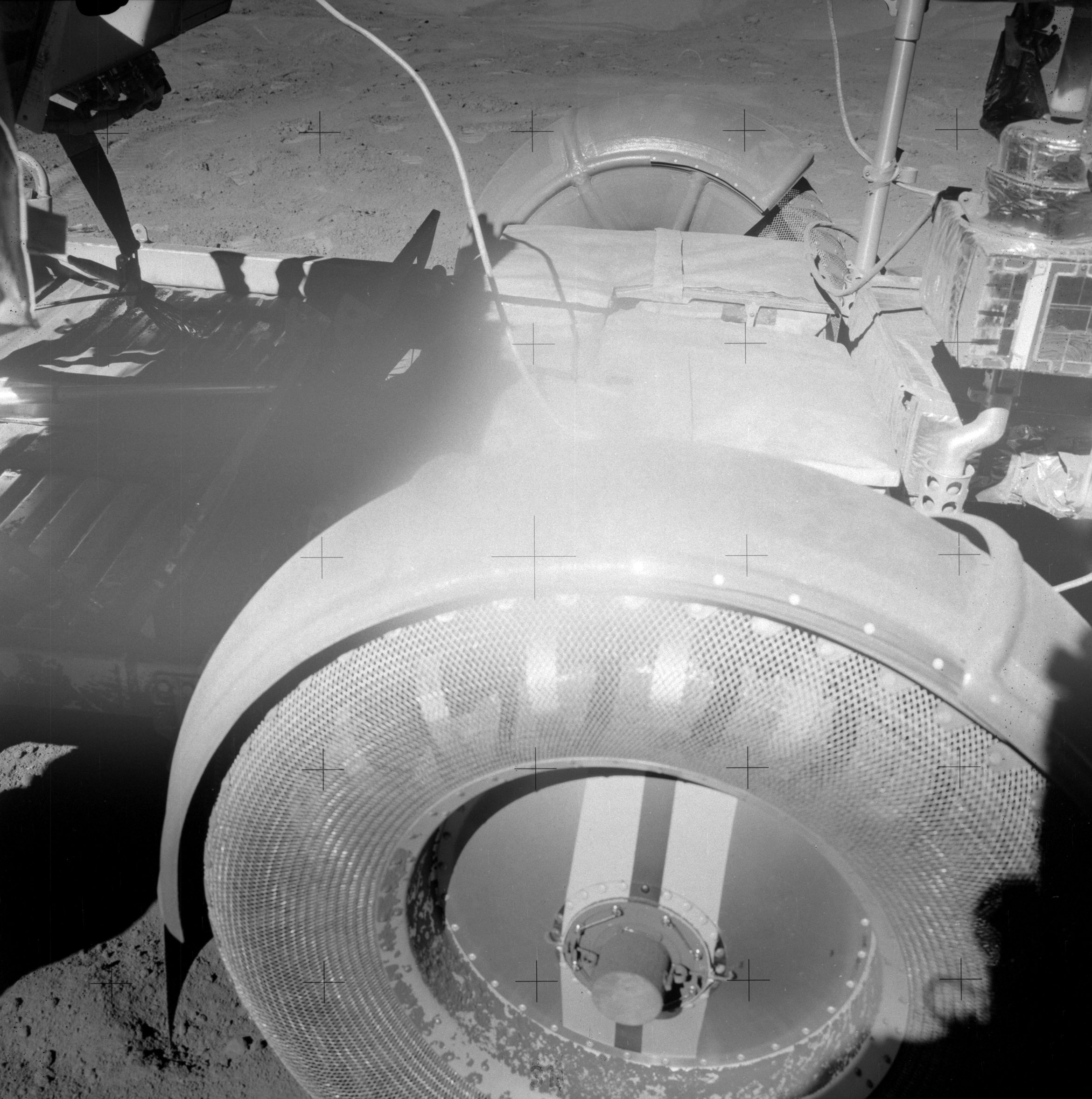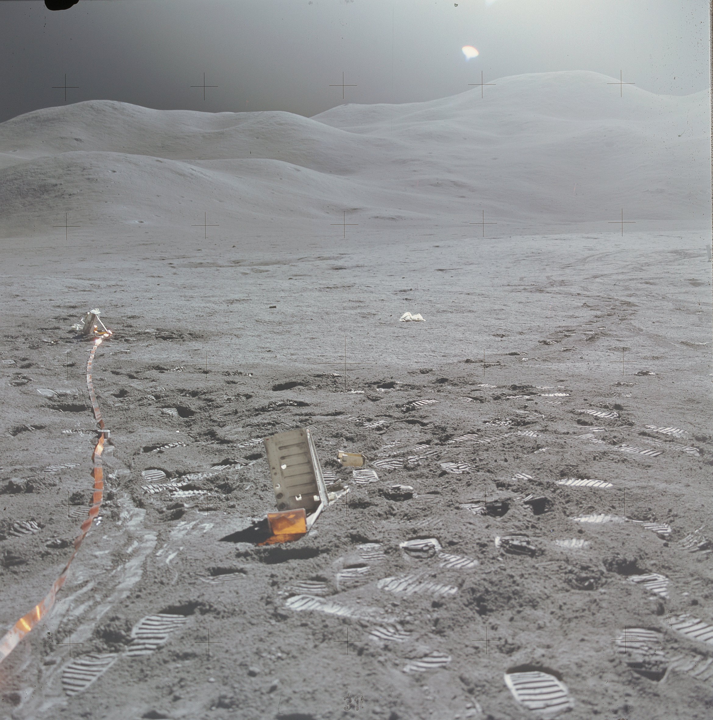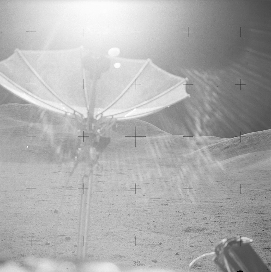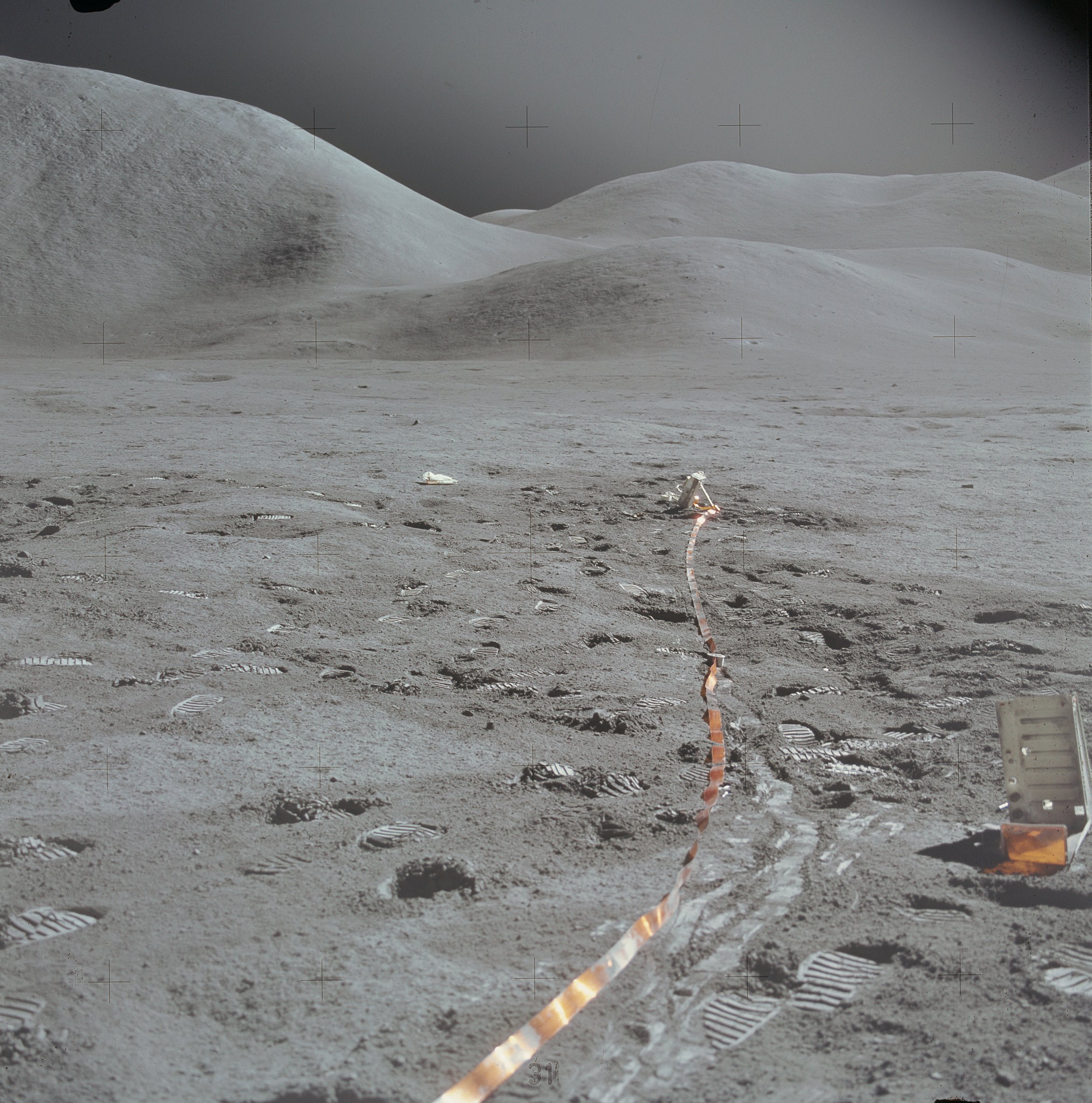 This pan camera frame was taken at a Ground Elapsed Time of about 108 hours, which was about an hour after the end of the Stand-Up EVA (SEVA). The solar elevation was about 10.5 degrees. A high-resolution detail shows the area immediately around the LM. Scans courtesy Stephen Tellier.Rev 22 Mapping (Metric) Camera Frame 0585 ( 13 Mb )