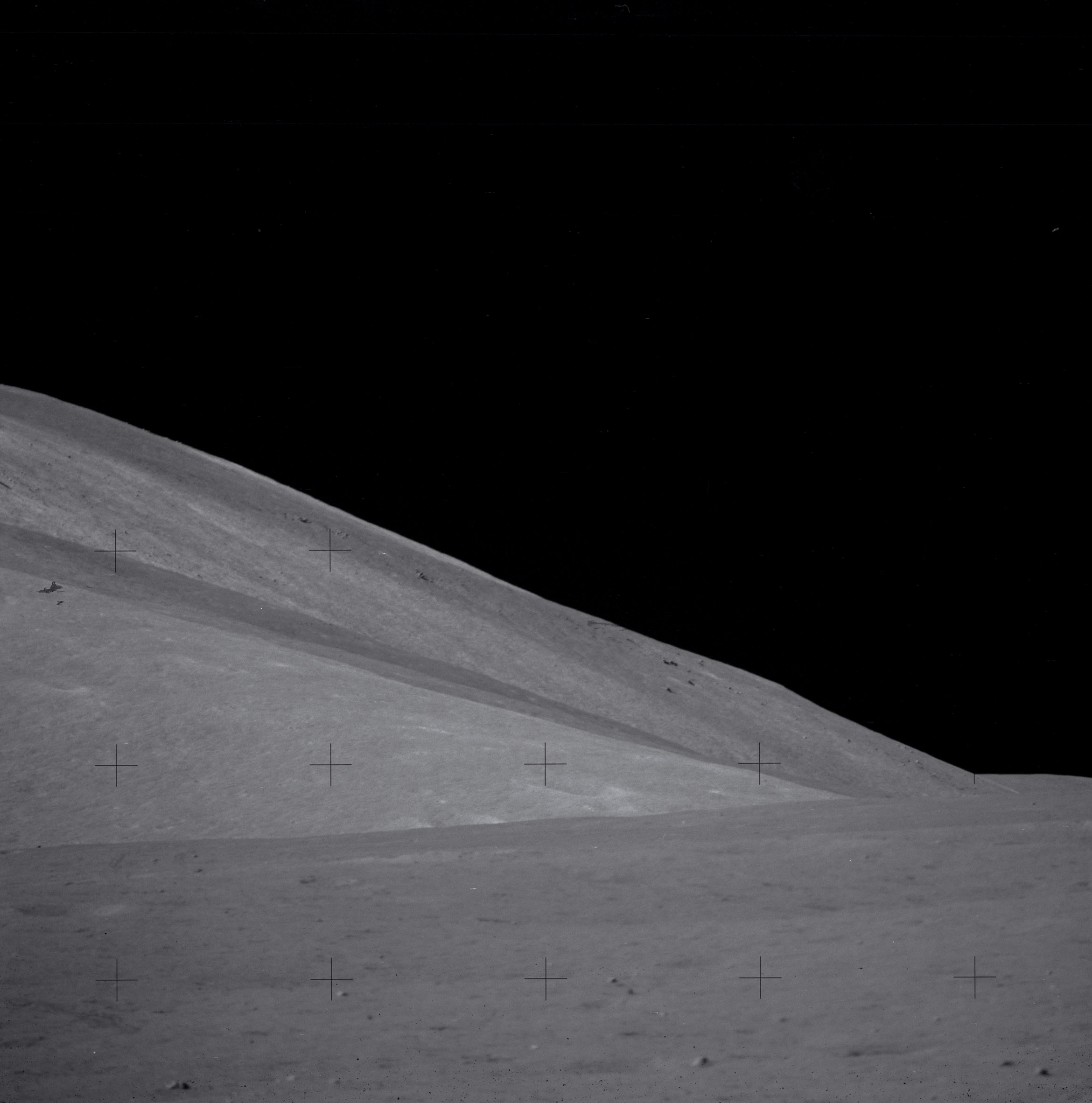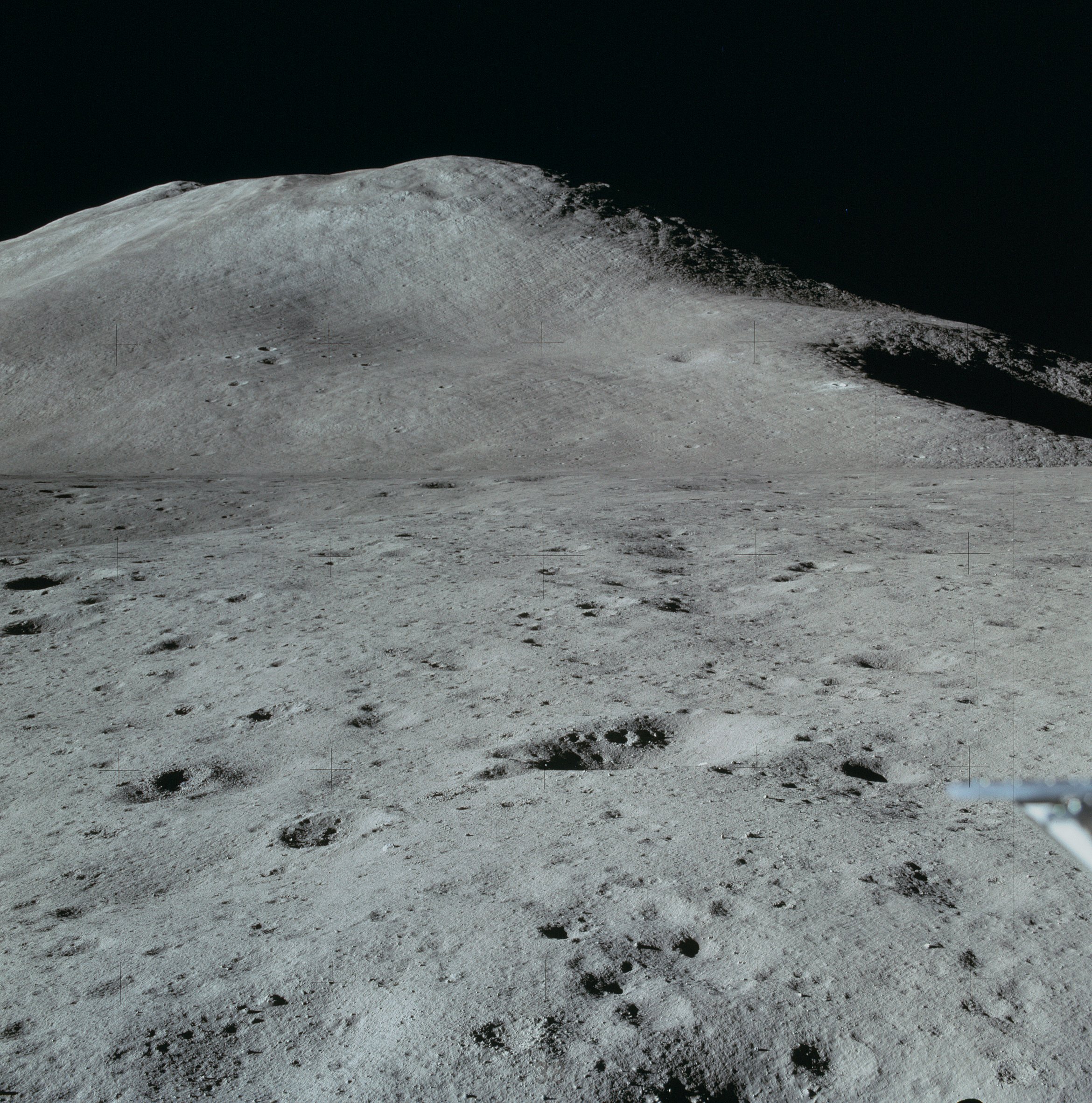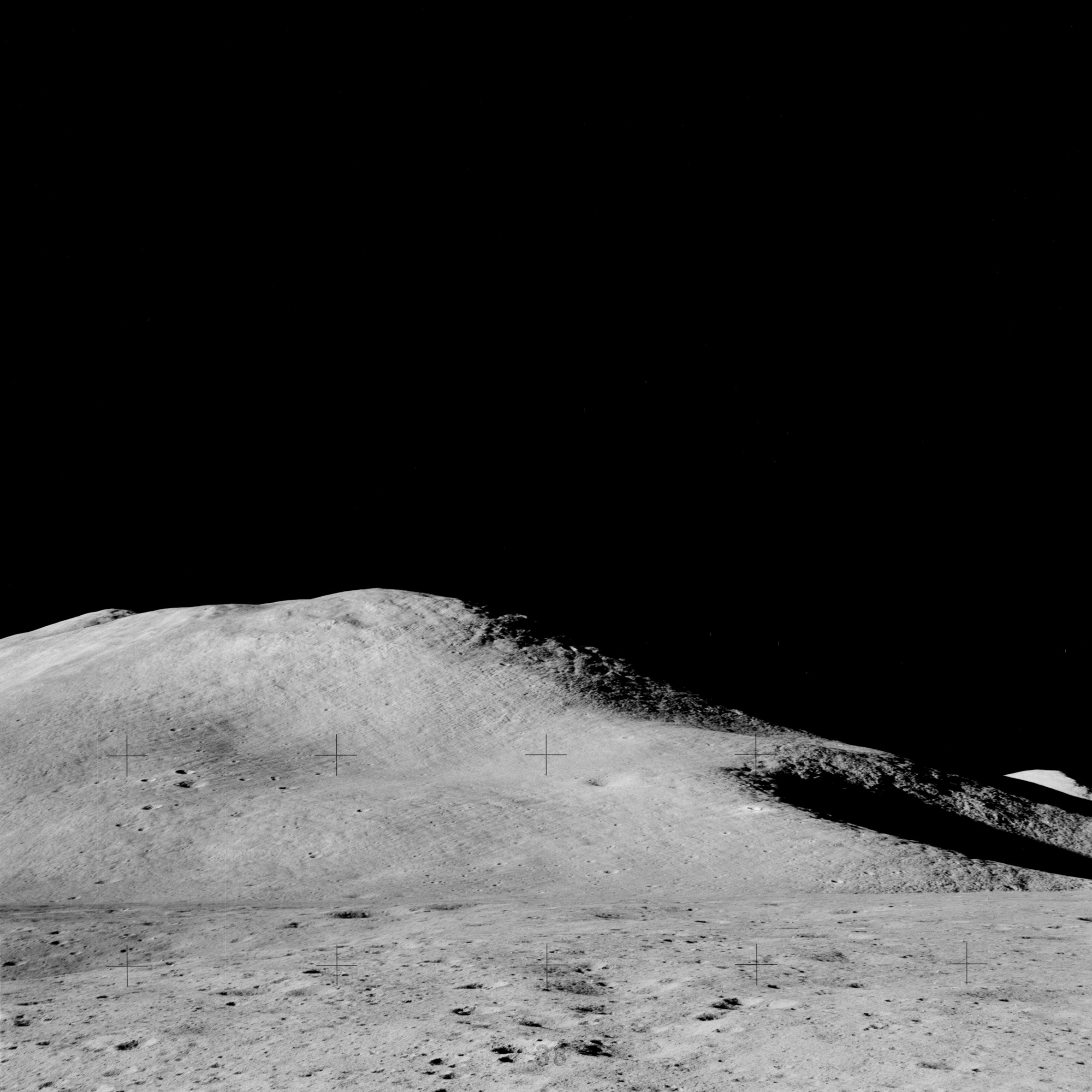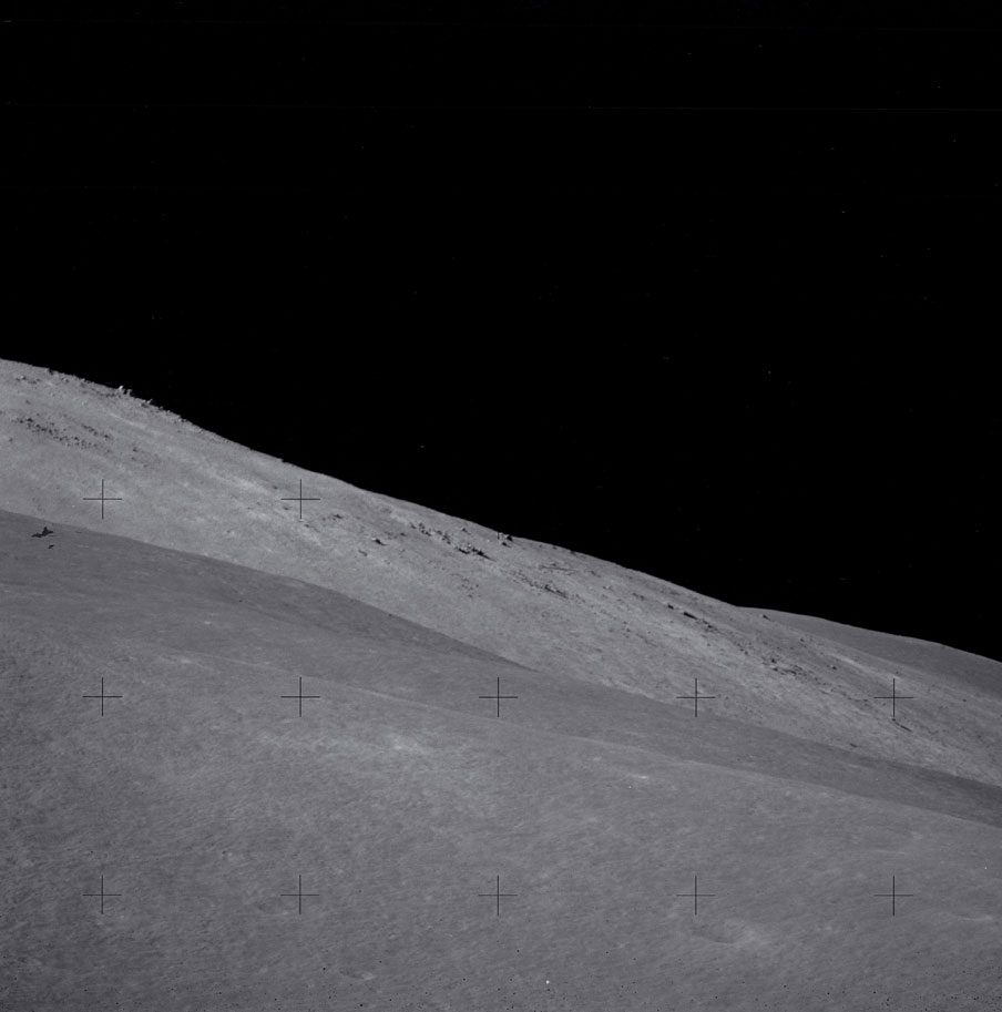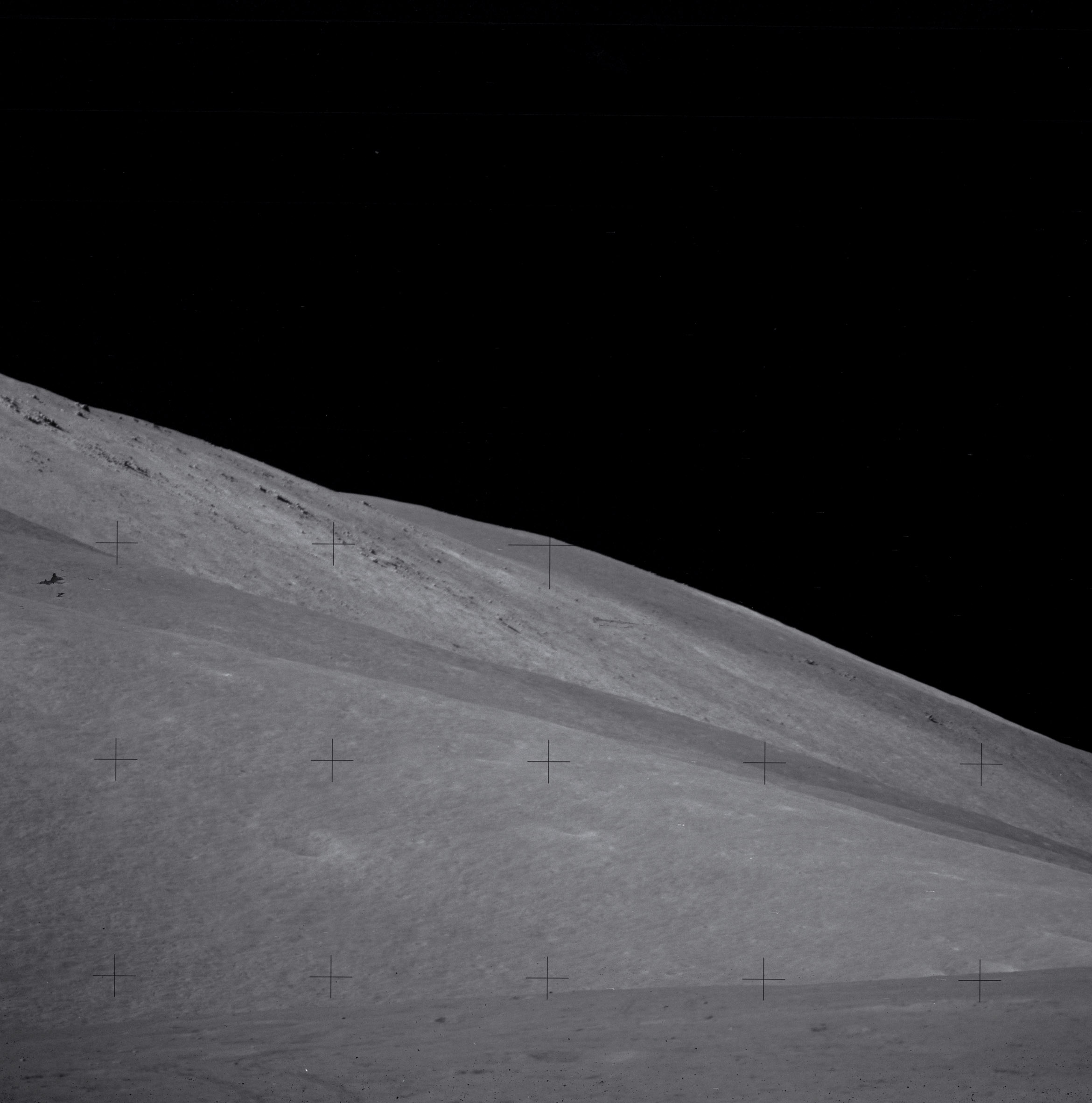 This frame was shot on 31 July 1971 at 15:59 UTC, with a camera tilt of 25 degrees. Higher resolution versions of M-0854 available from the ASU Apollo Image Archive. Frames 0853 and 0855 also include the landing site. Scan from the original film courtesy NASA/JSC/Arizona State University.Rev 27 Mapping (Metric) Camera Frame 0993 ( 13 Mb )