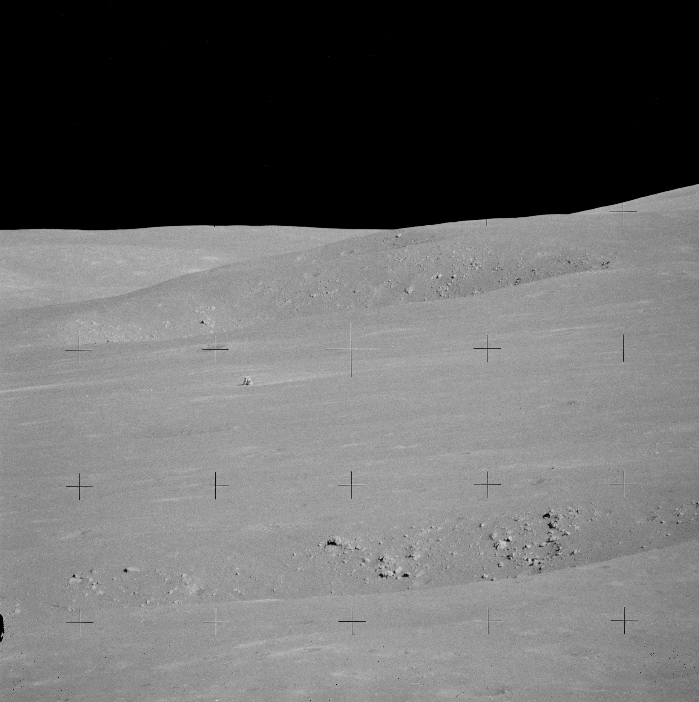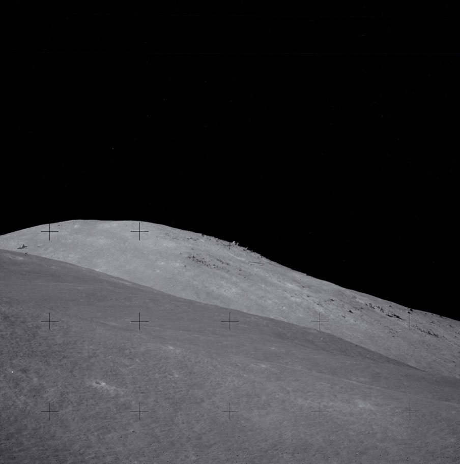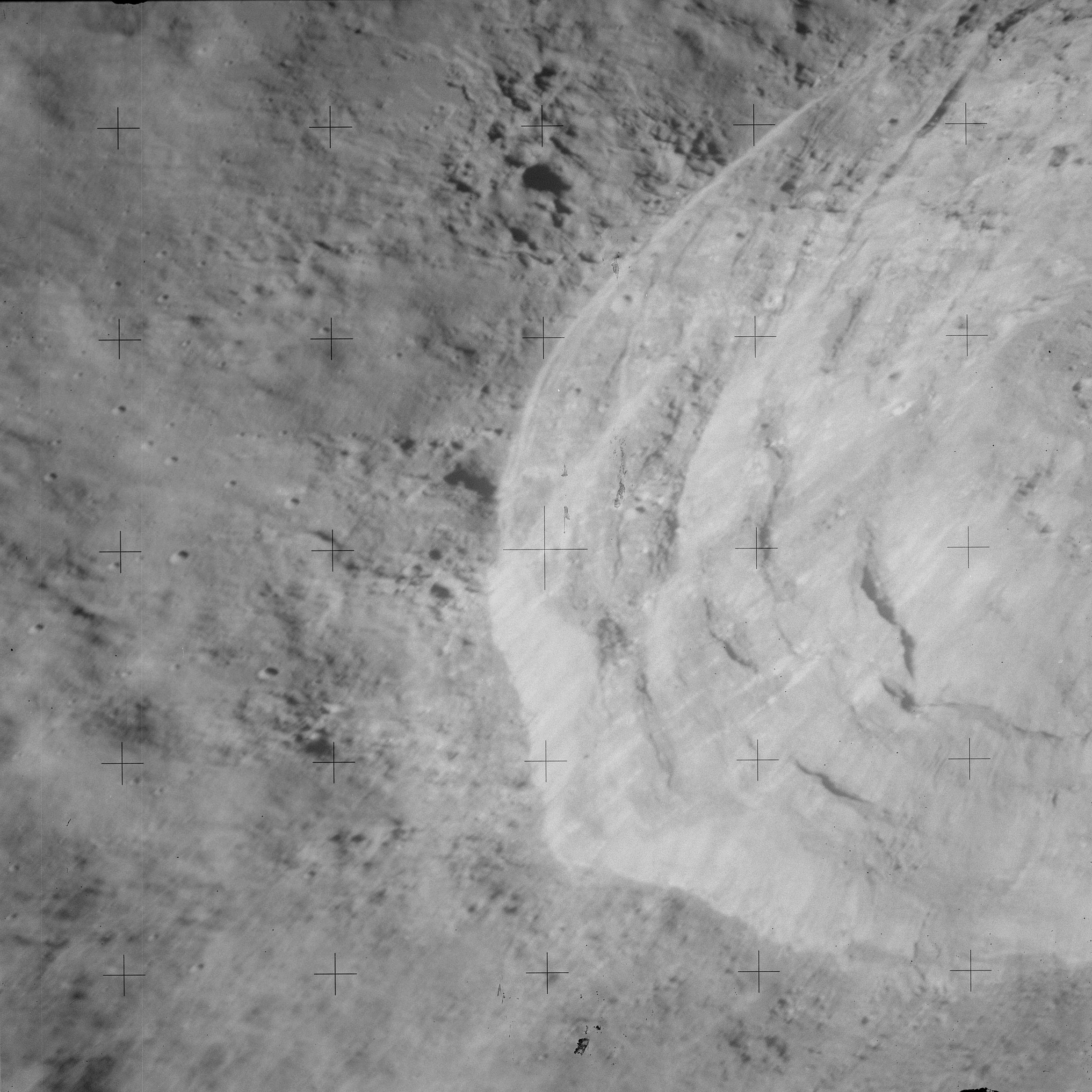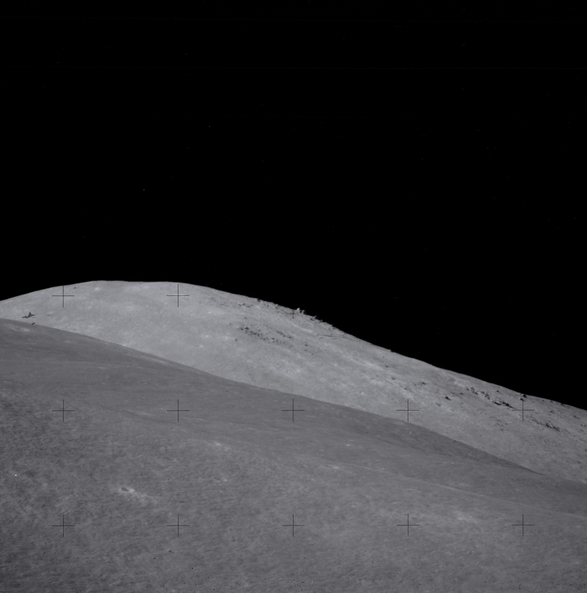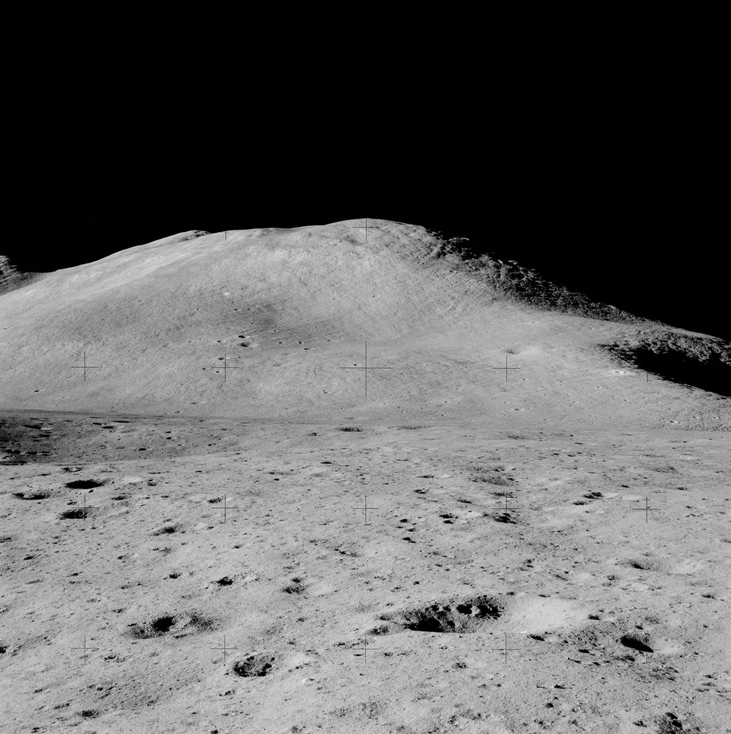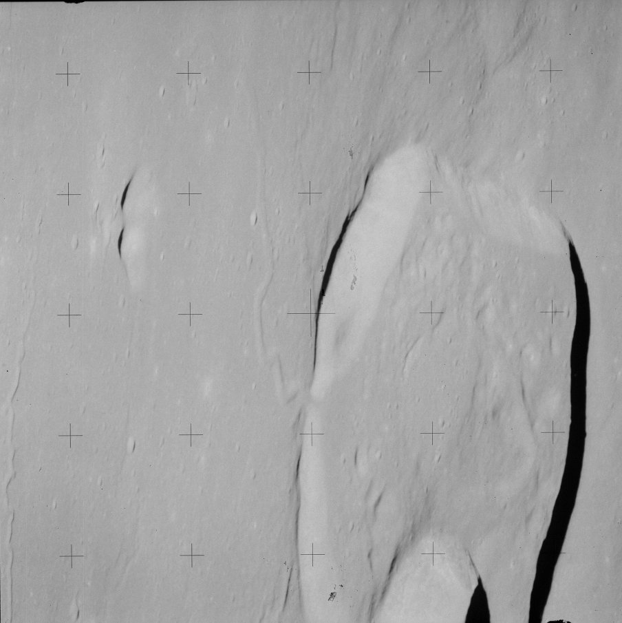 This frame was shot on 31 July 1971 at 15:59 UTC, with a camera tilt of 25 degrees. Higher resolution versions of M-0854 available from the ASU Apollo Image Archive. Frames 0853 and 0855 also include the landing site. Scan from the original film courtesy NASA/JSC/Arizona State University.Rev 27 Mapping (Metric) Camera Frame 0993 ( 13 Mb )