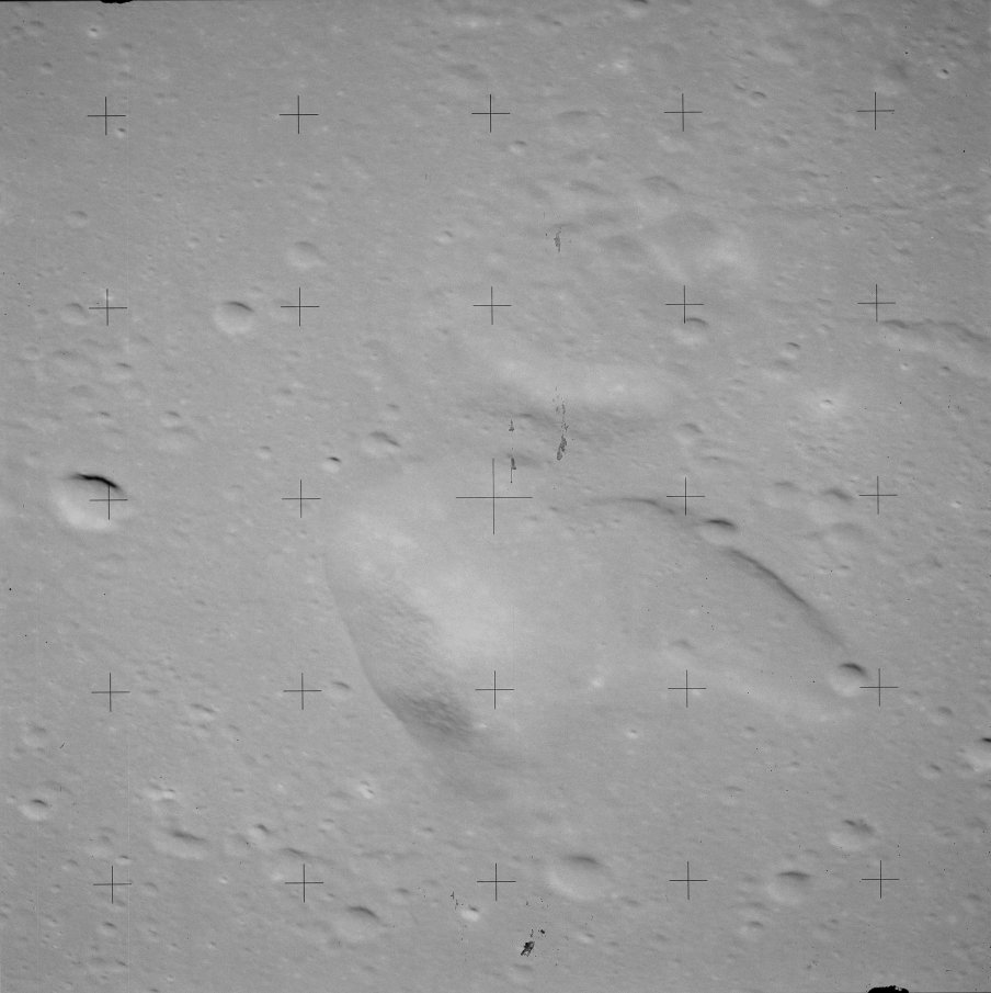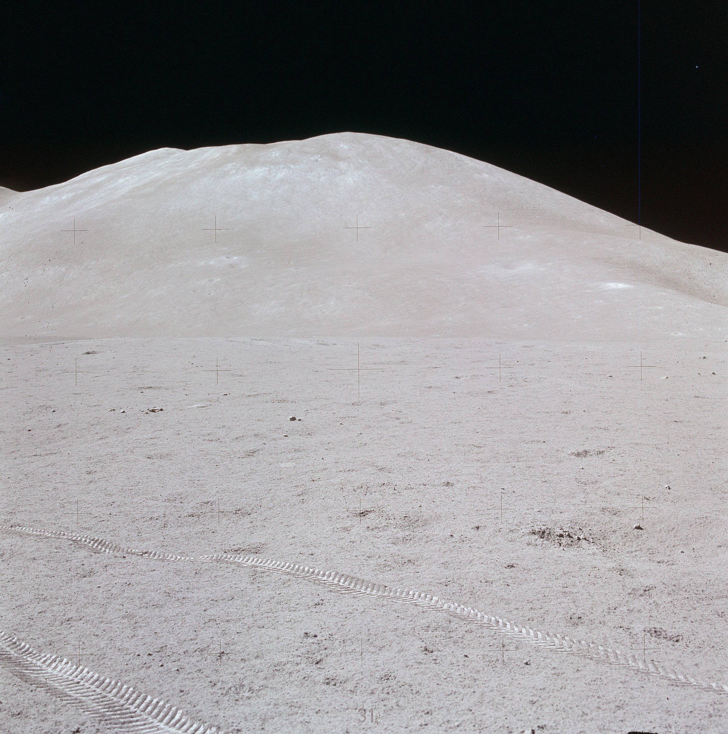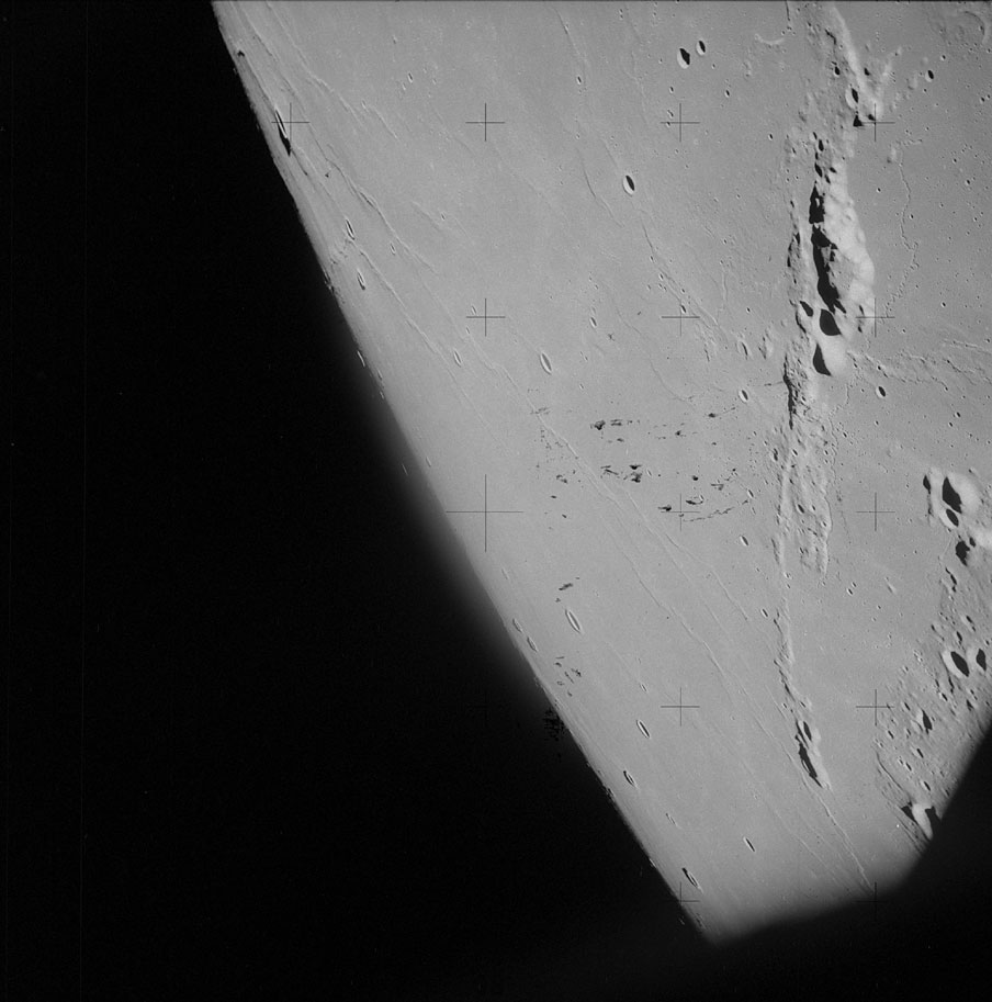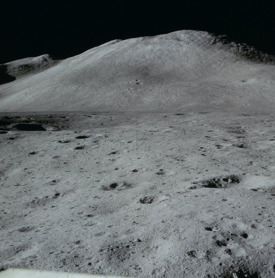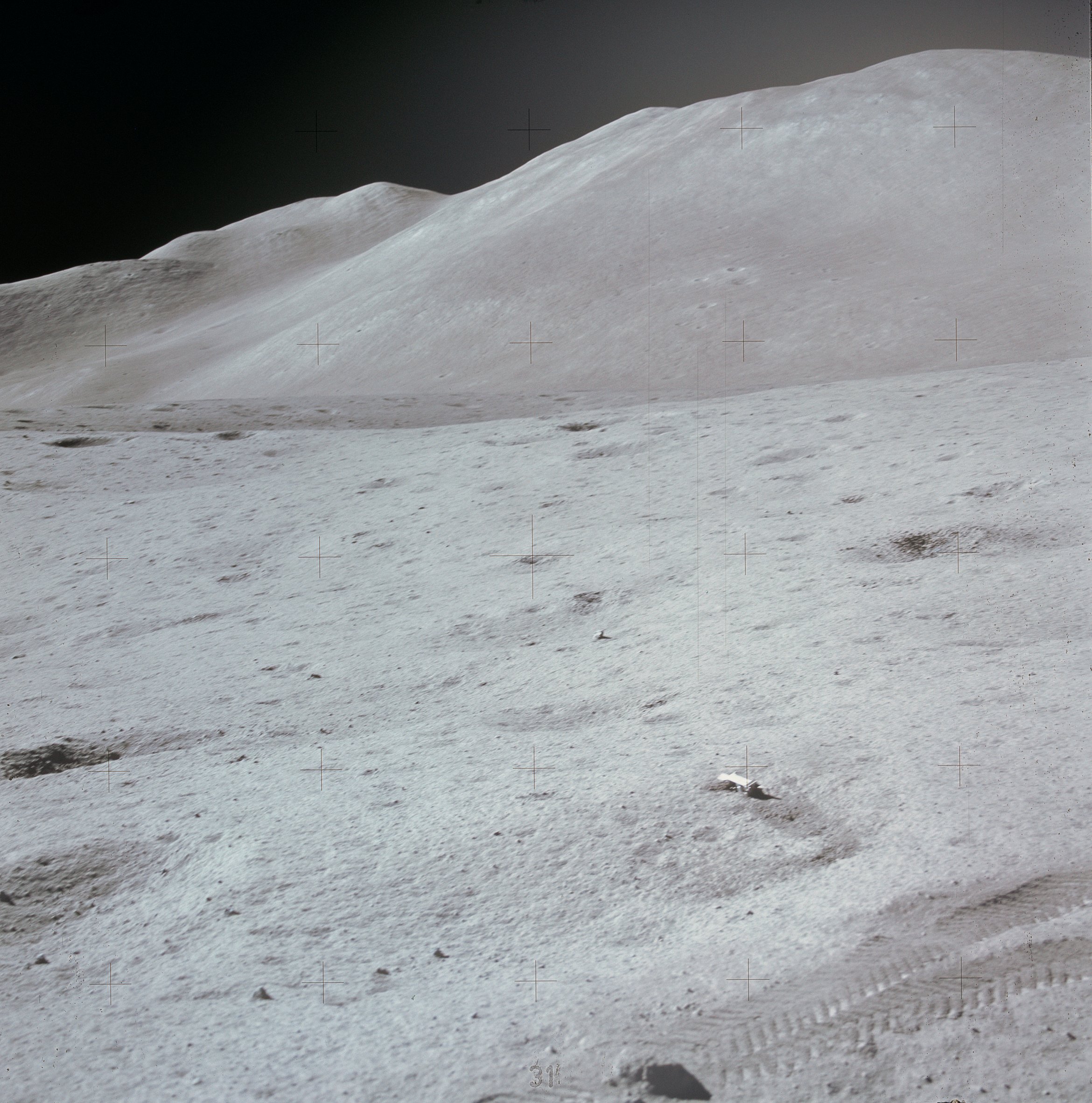 This frame was shot on 31 July 1971 at 15:59 UTC, with a camera tilt of 25 degrees. Higher resolution versions of M-0854 available from the ASU Apollo Image Archive. Frames 0853 and 0855 also include the landing site. Scan from the original film courtesy NASA/JSC/Arizona State University.Rev 27 Mapping (Metric) Camera Frame 0993 ( 13 Mb )