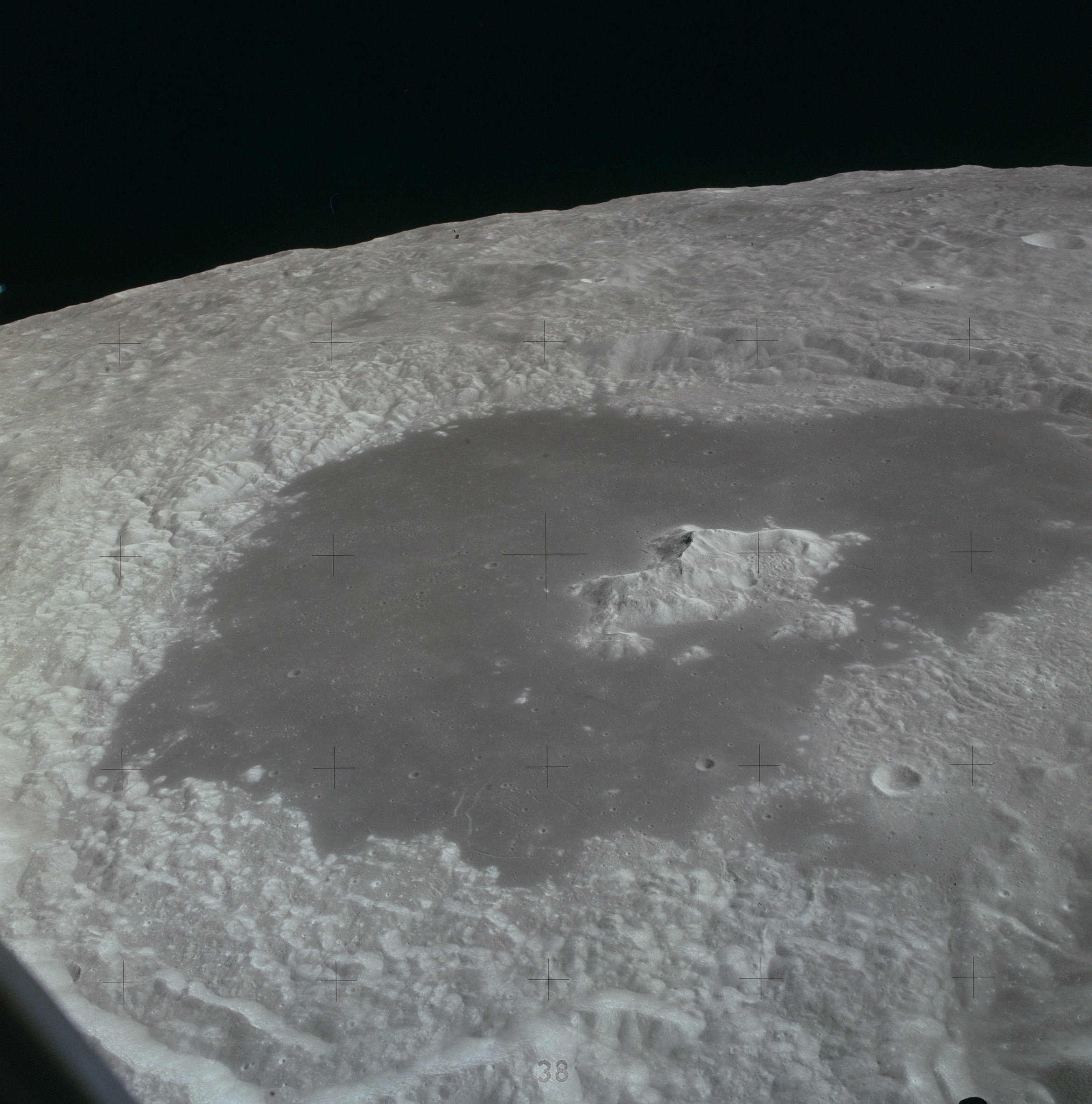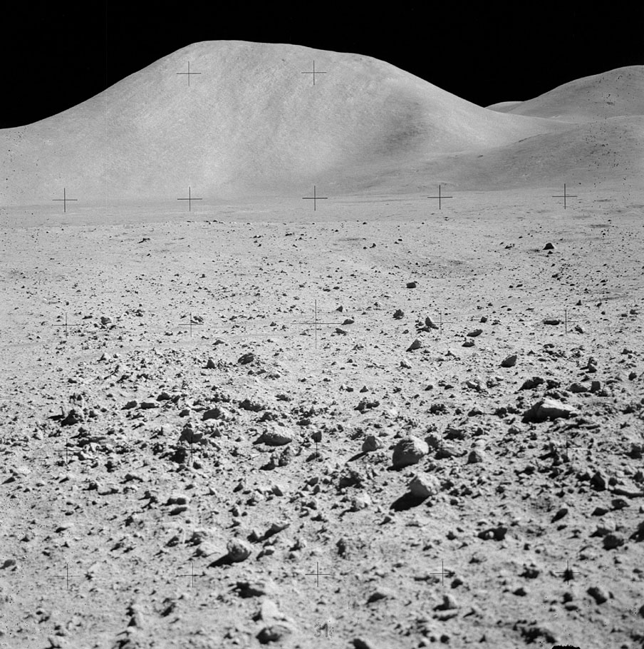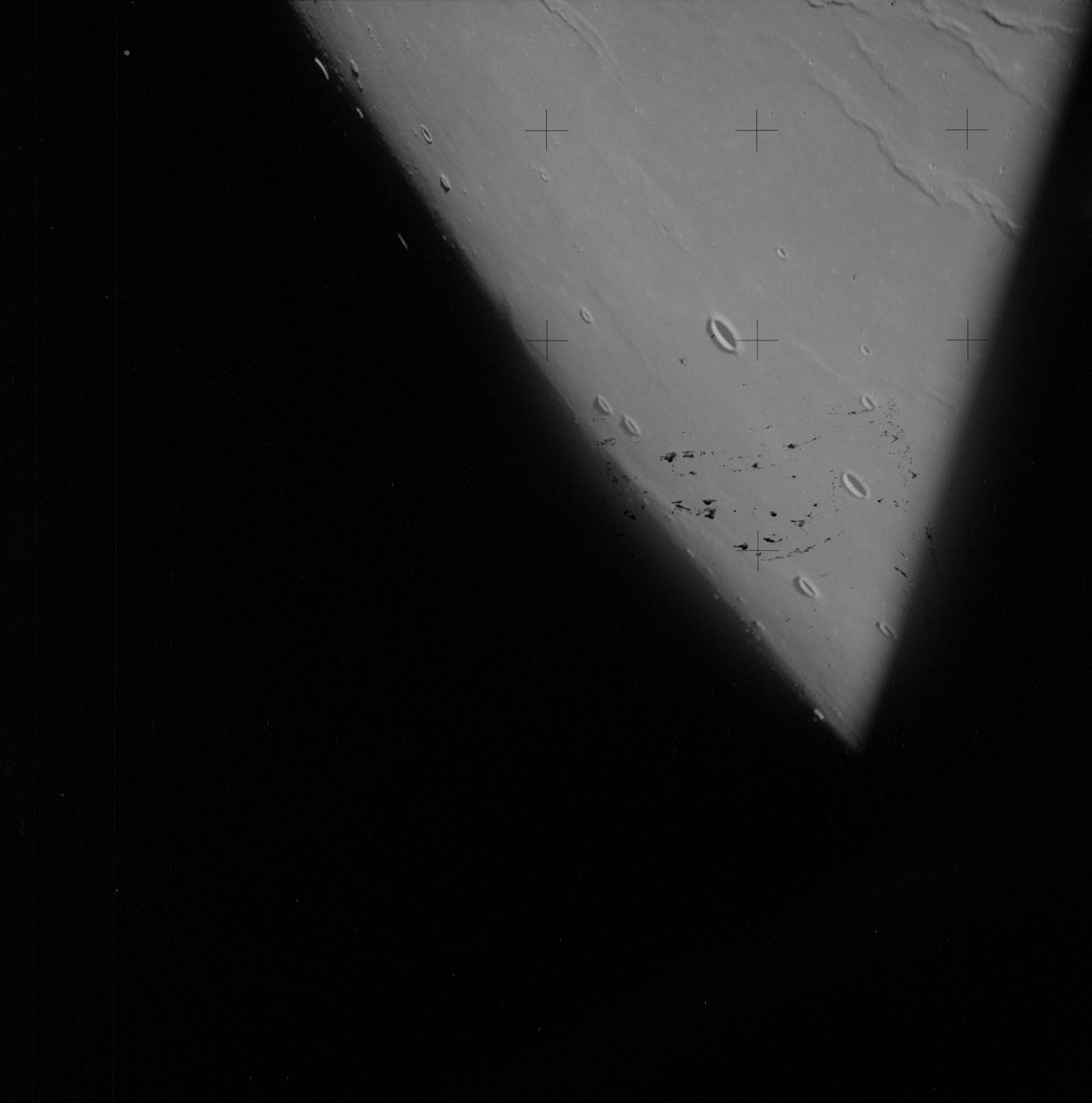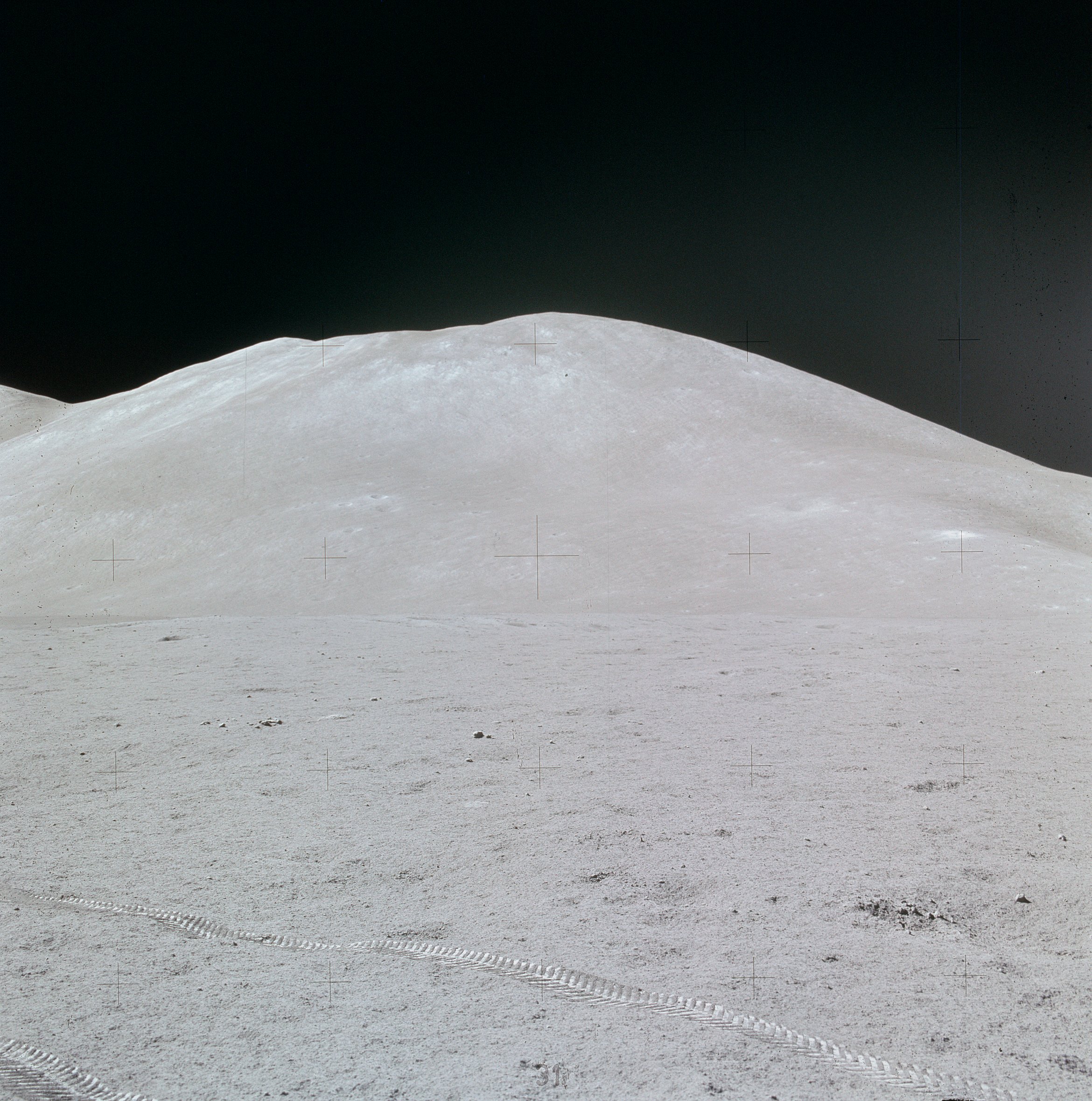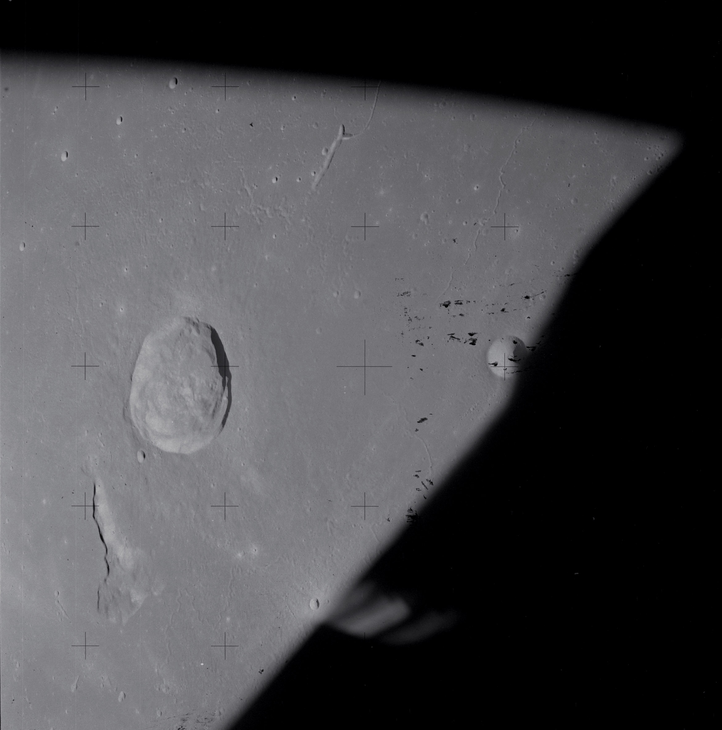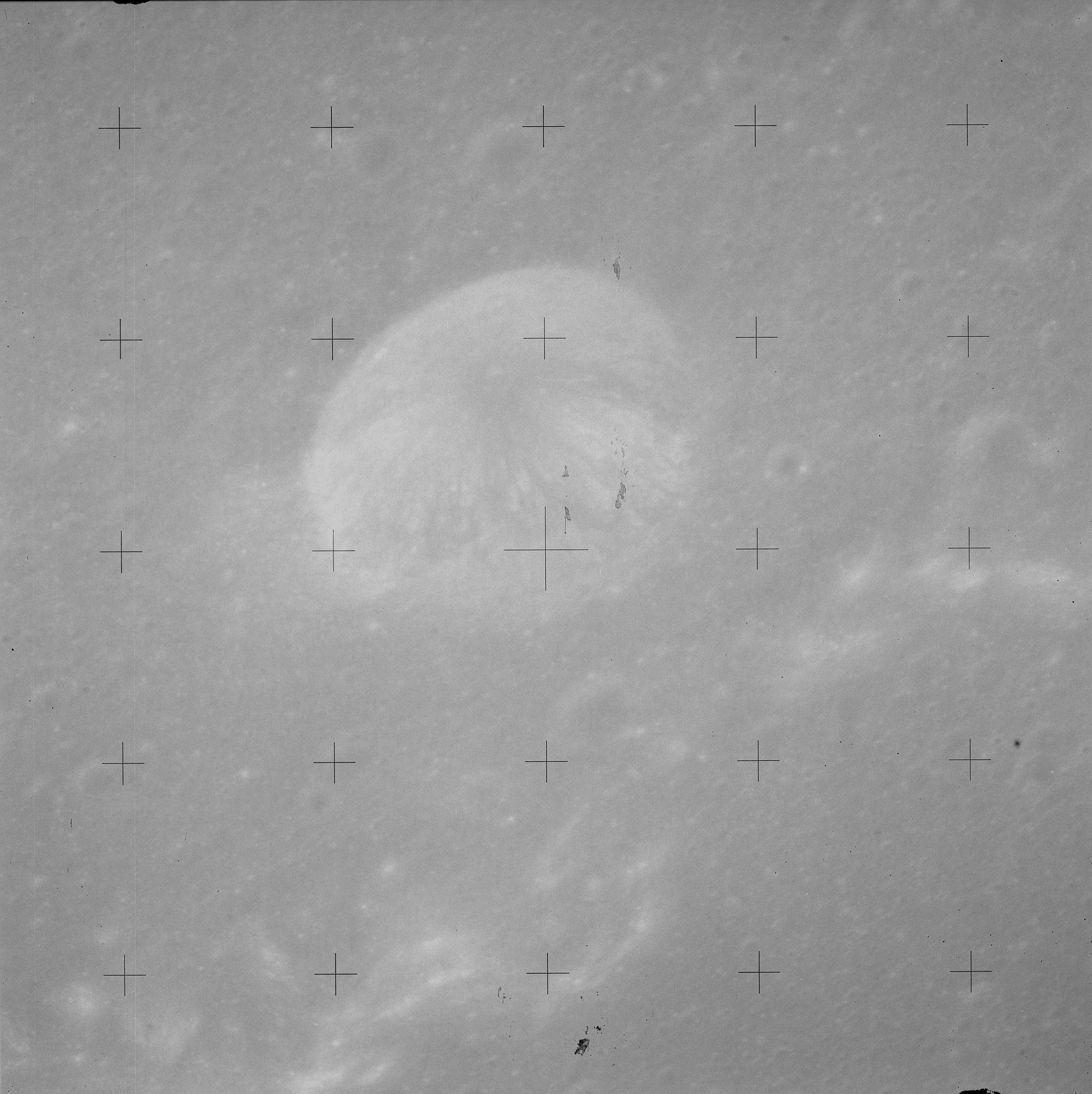 This frame was shot on 31 July 1971 at 15:59 UTC, with a camera tilt of 25 degrees. Higher resolution versions of M-0854 available from the ASU Apollo Image Archive. Frames 0853 and 0855 also include the landing site. Scan from the original film courtesy NASA/JSC/Arizona State University.Rev 27 Mapping (Metric) Camera Frame 0993 ( 13 Mb )