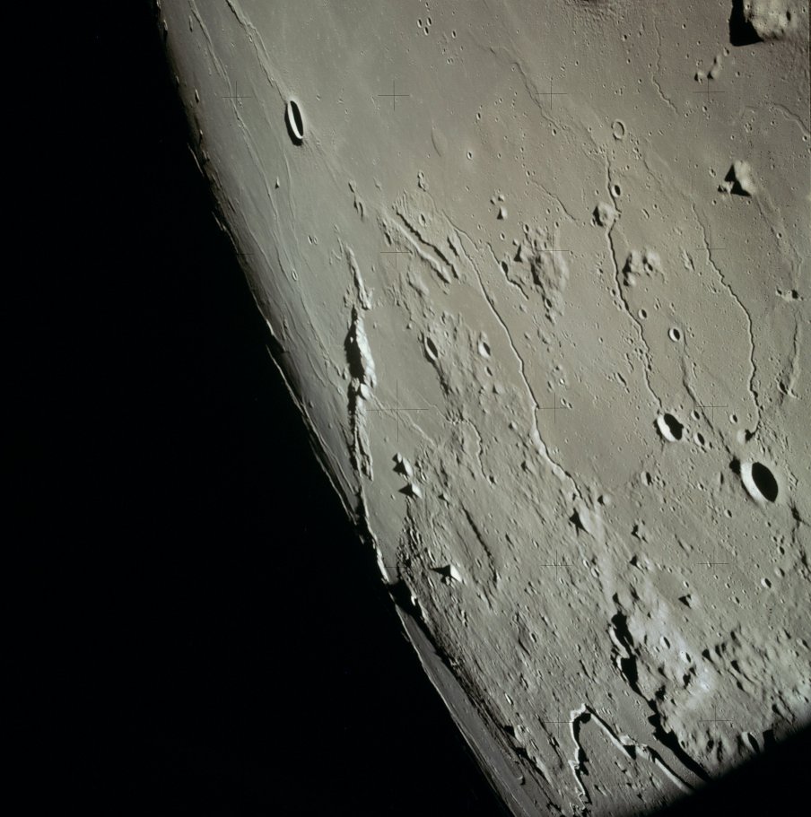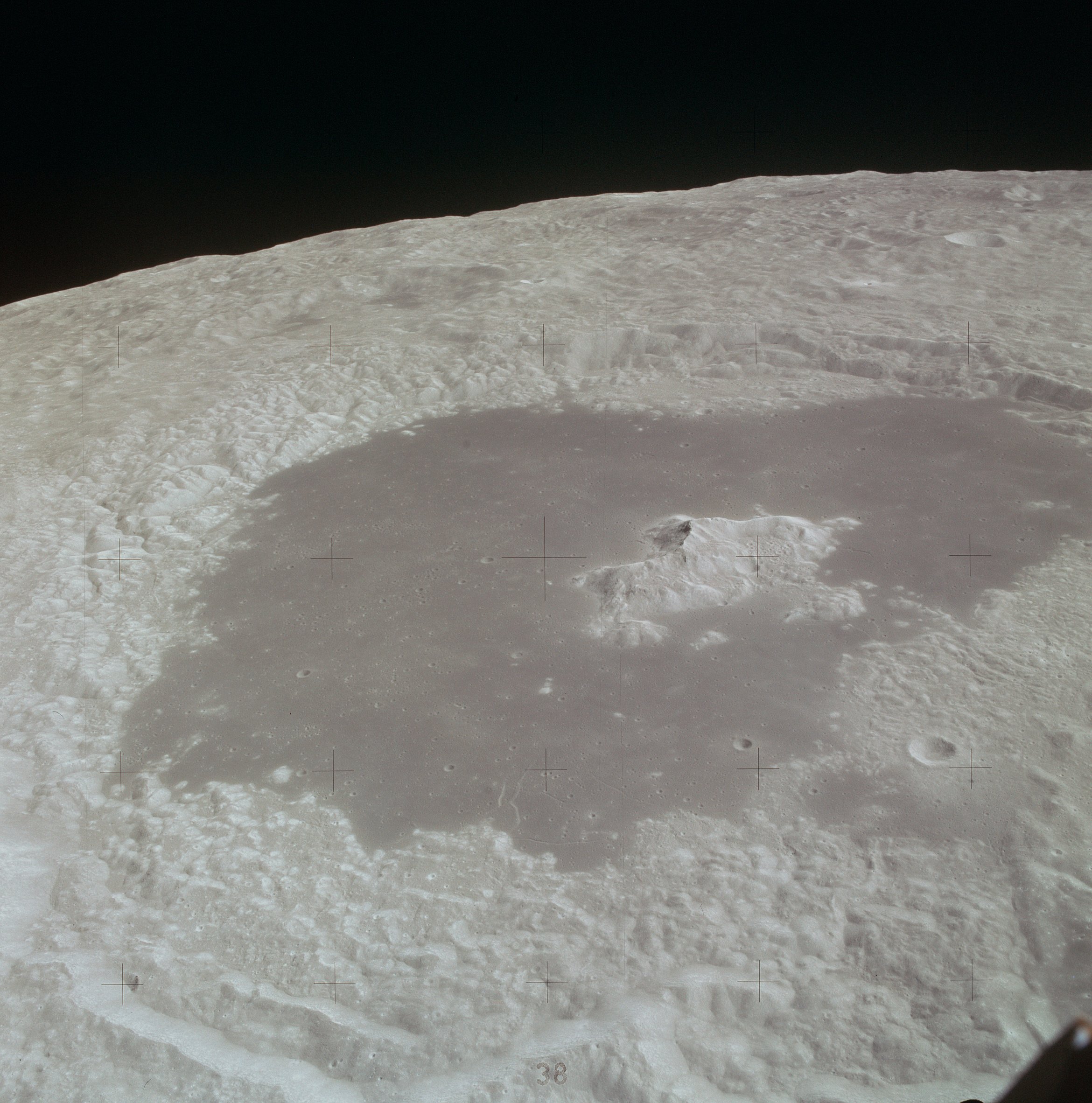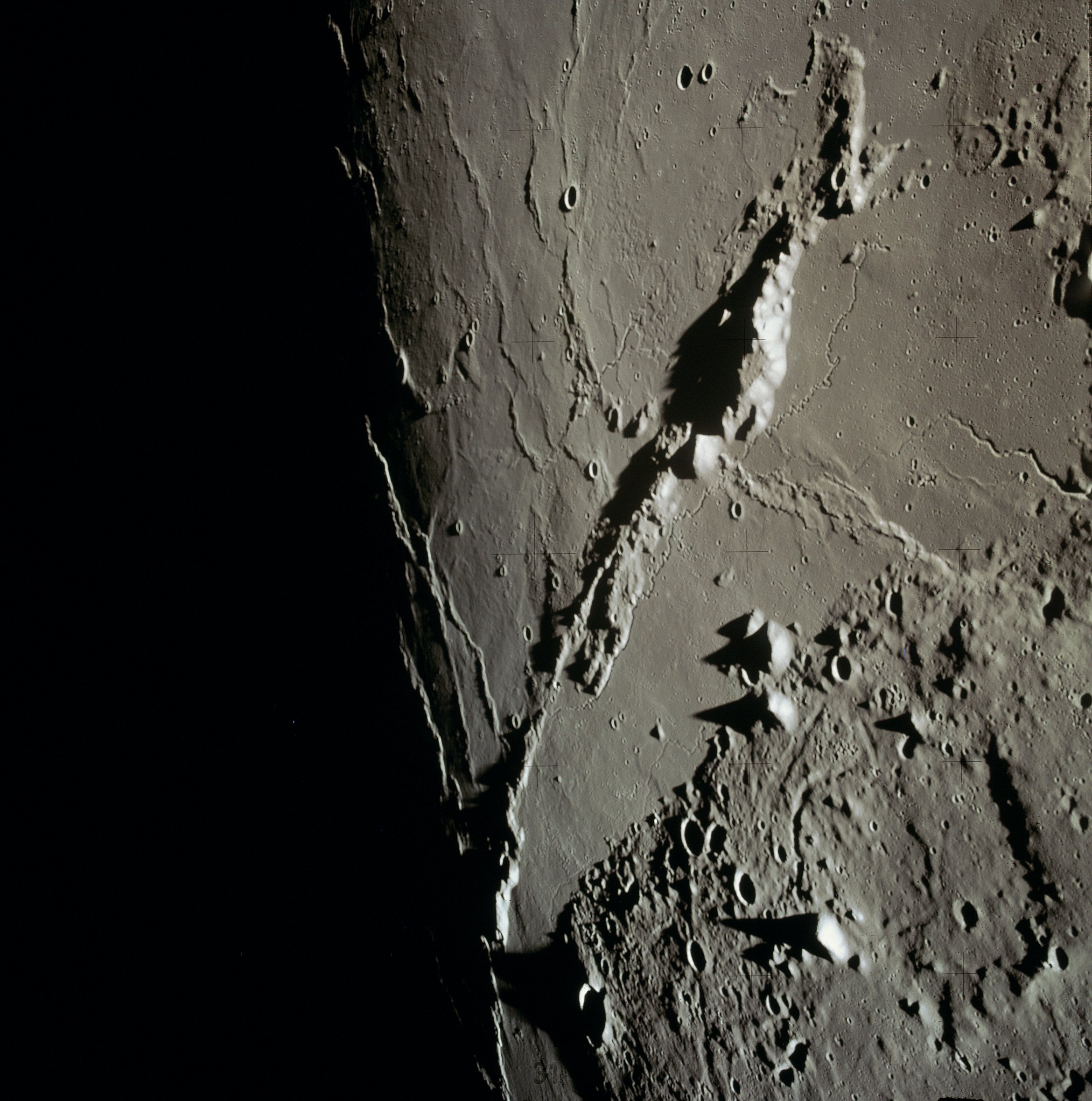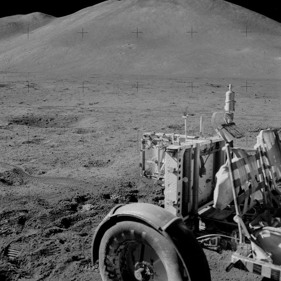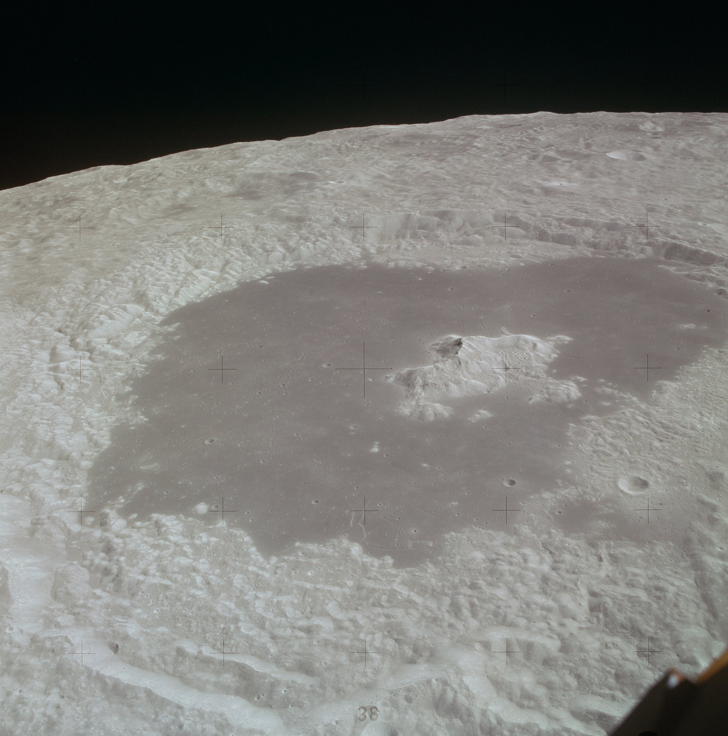 This frame was shot on 31 July 1971 at 15:59 UTC, with a camera tilt of 25 degrees. Higher resolution versions of M-0854 available from the ASU Apollo Image Archive. Frames 0853 and 0855 also include the landing site. Scan from the original film courtesy NASA/JSC/Arizona State University.Rev 27 Mapping (Metric) Camera Frame 0993 ( 13 Mb )