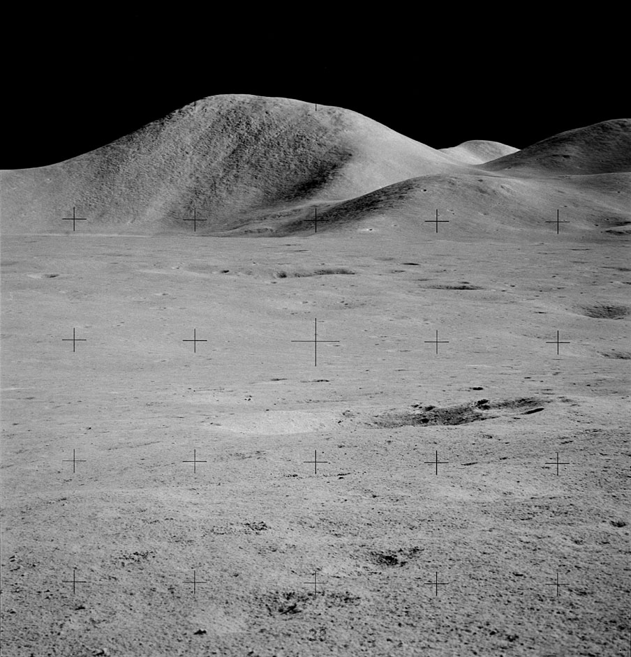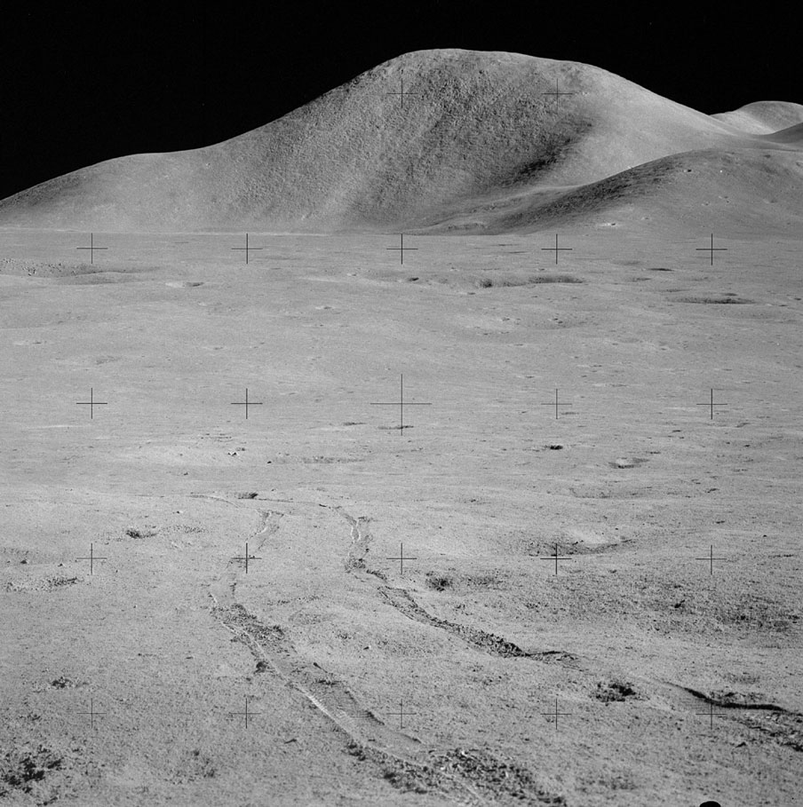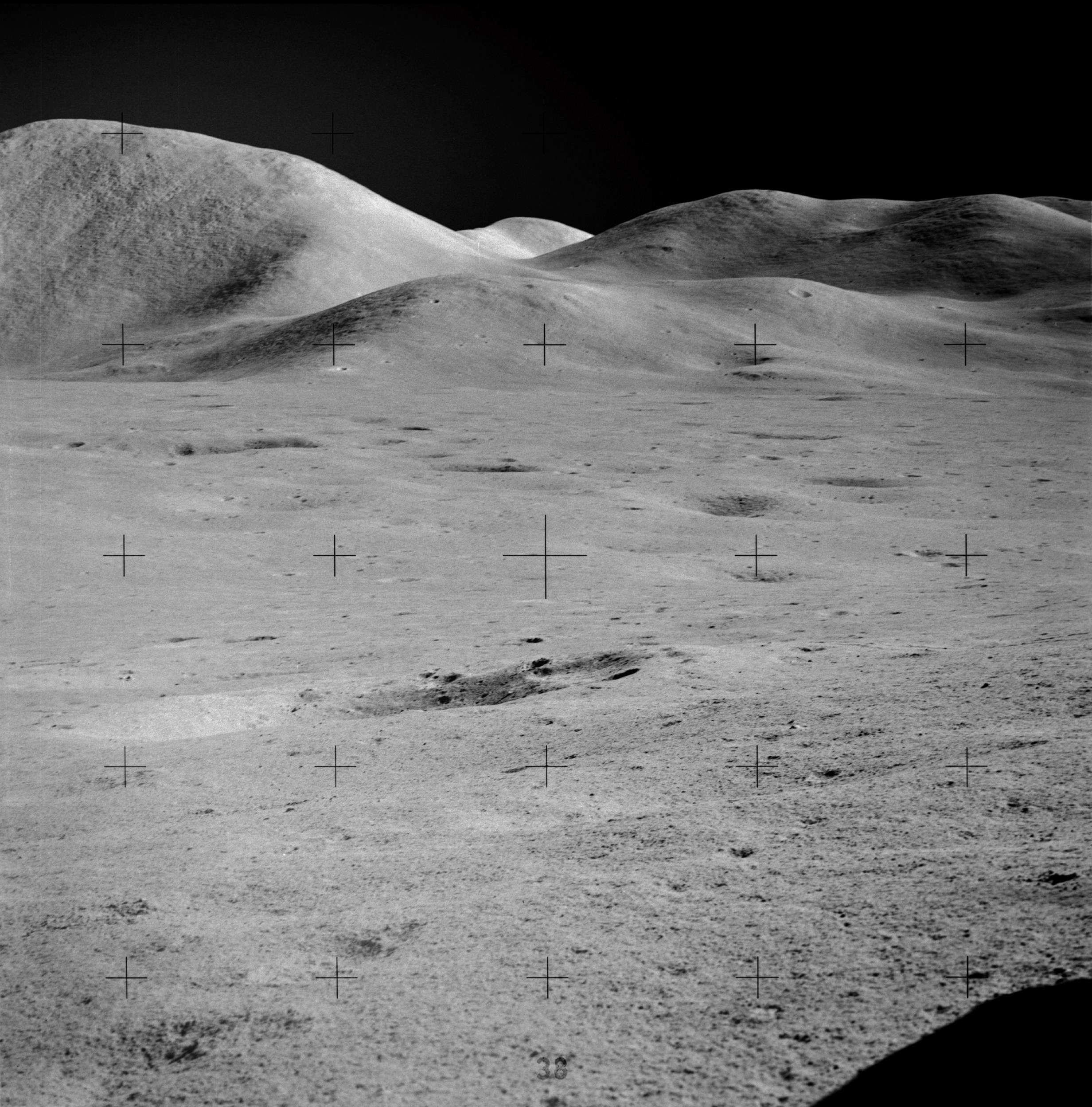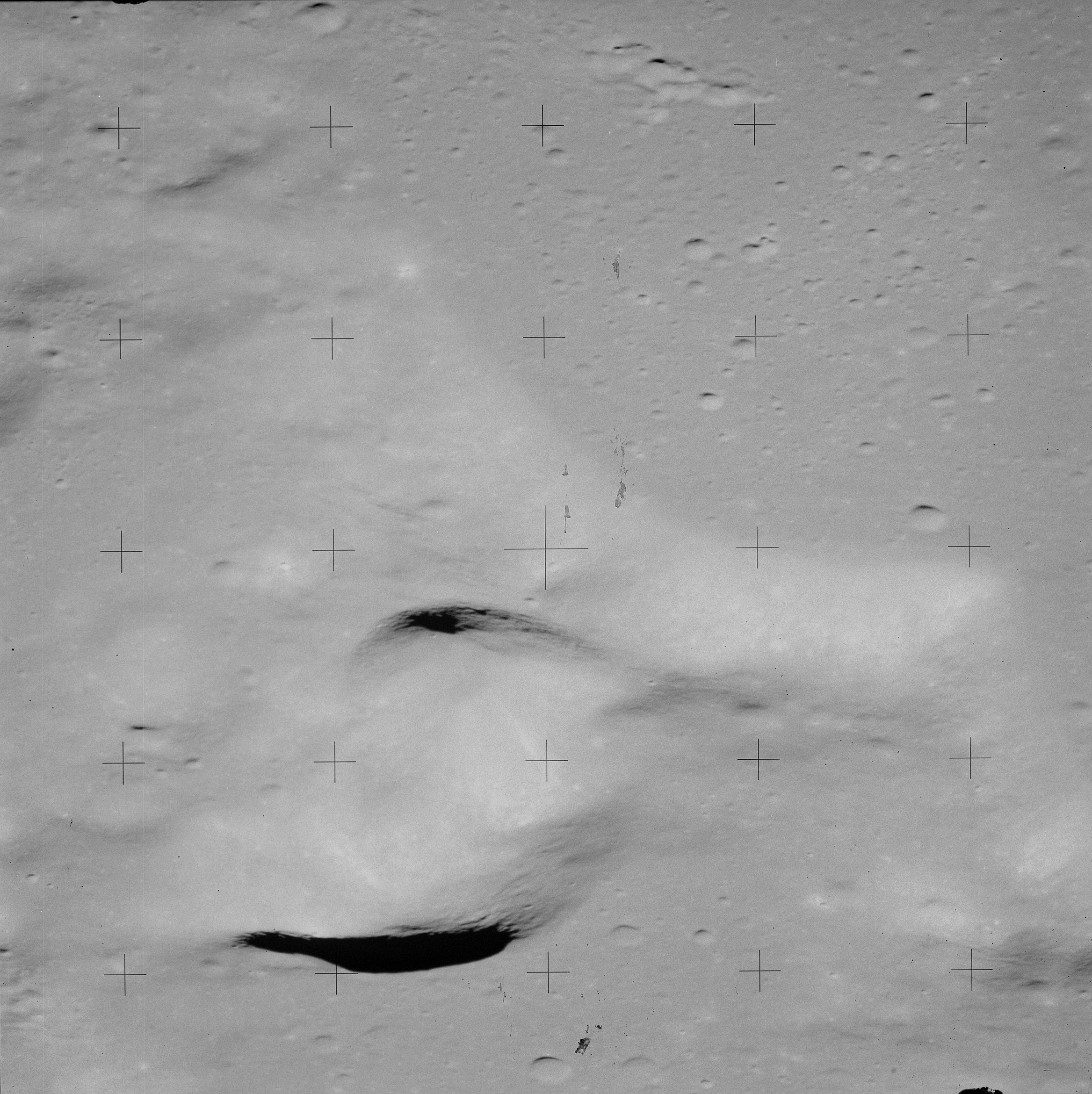 This frame was shot on 1 August 1971 at 11:41 UTC, with the camera looking vertifally down. The Sun was 29 degrees above the eastern horizon. Higher resolution versions of M-1134 available from the ASU Apollo Image Archive. Frames 1133 and 1135 also include the landing site. Scan from the original film courtesy NASA/JSC/Arizona State University.Anaglyph of Apollo 15 Mapping (Metric) Camera Frames 1134 and 1135, Rev 33 - Hadley ( 0.4 Mb )