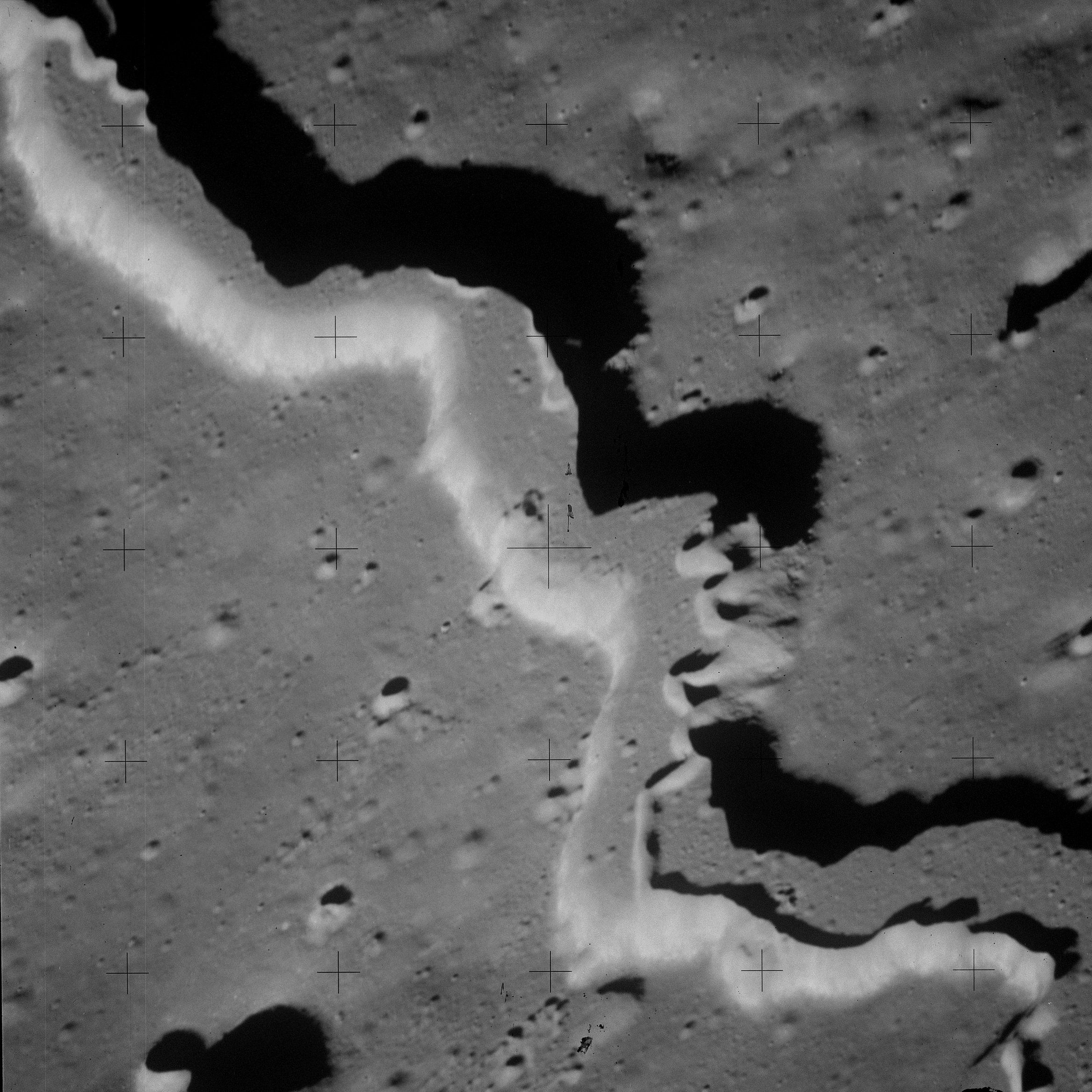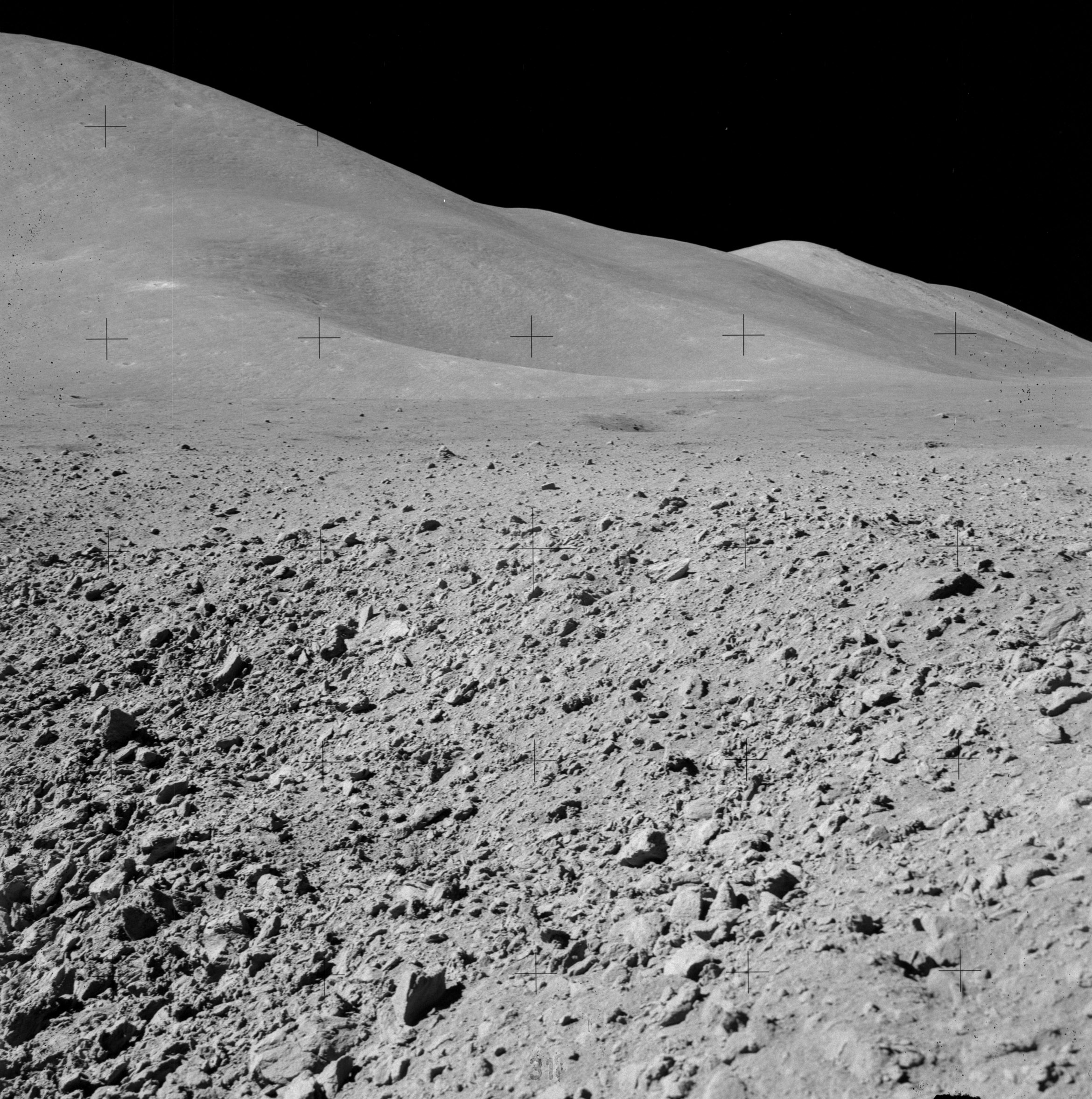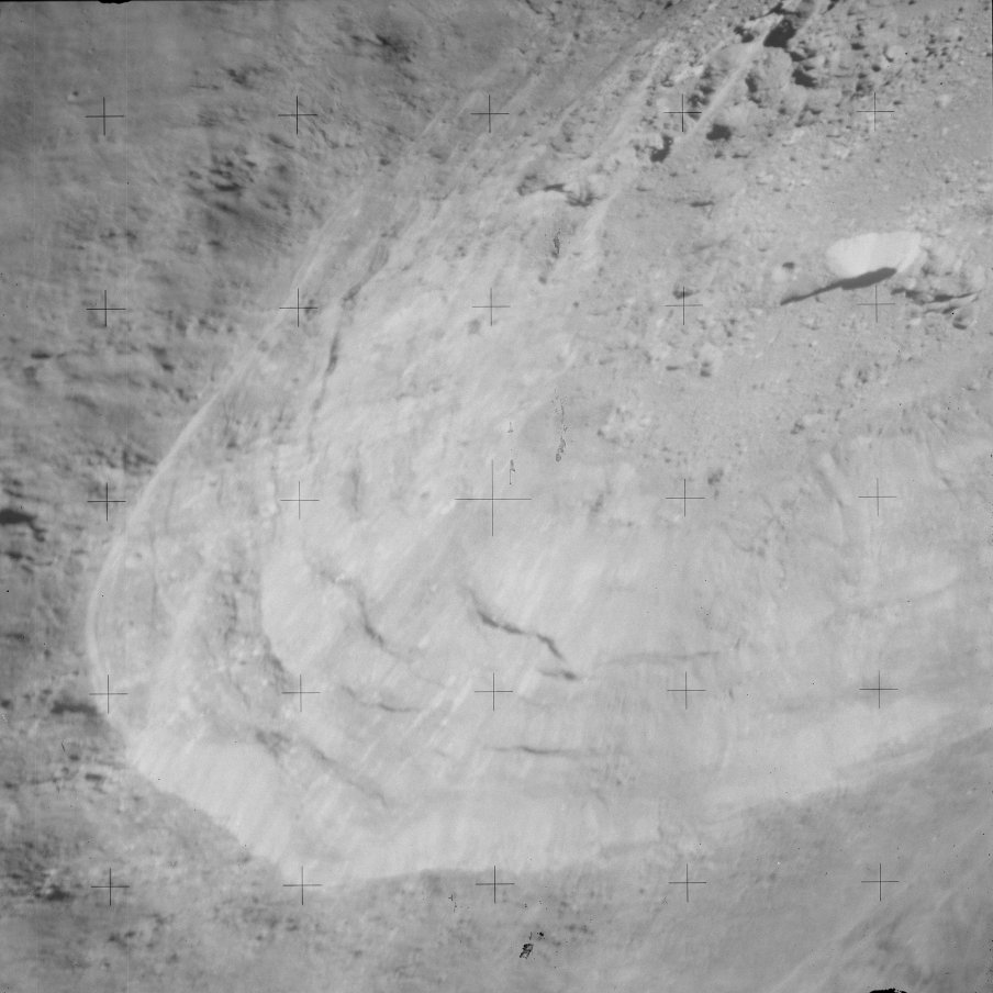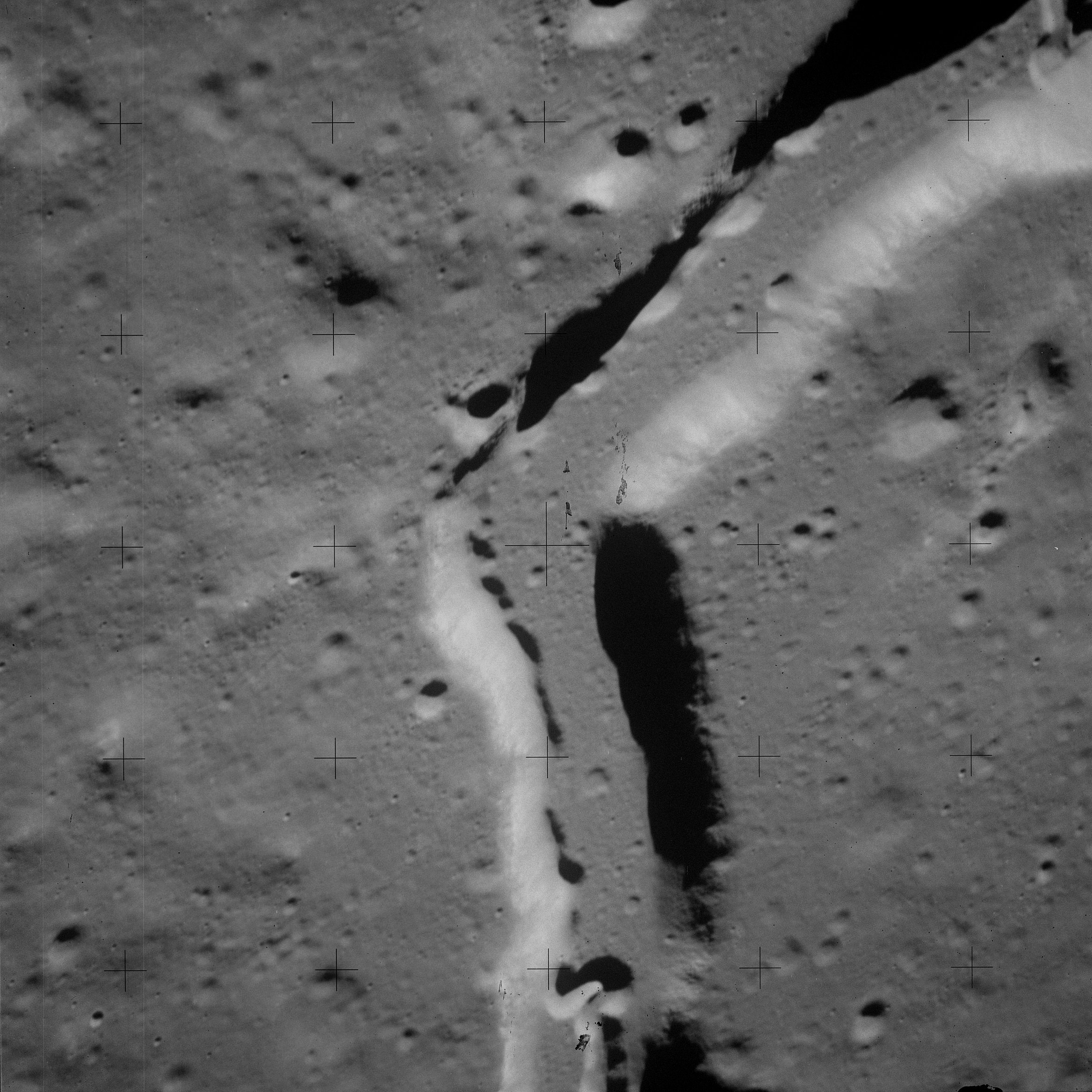 This frame was shot on 1 August 1971 at 11:41 UTC, with the camera looking vertifally down. The Sun was 29 degrees above the eastern horizon. Higher resolution versions of M-1134 available from the ASU Apollo Image Archive. Frames 1133 and 1135 also include the landing site. Scan from the original film courtesy NASA/JSC/Arizona State University.Anaglyph of Apollo 15 Mapping (Metric) Camera Frames 1134 and 1135, Rev 33 - Hadley ( 0.4 Mb )