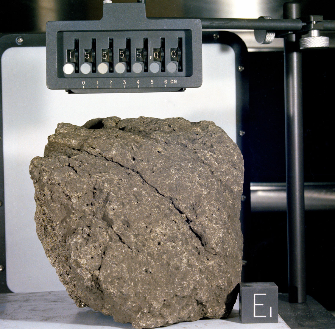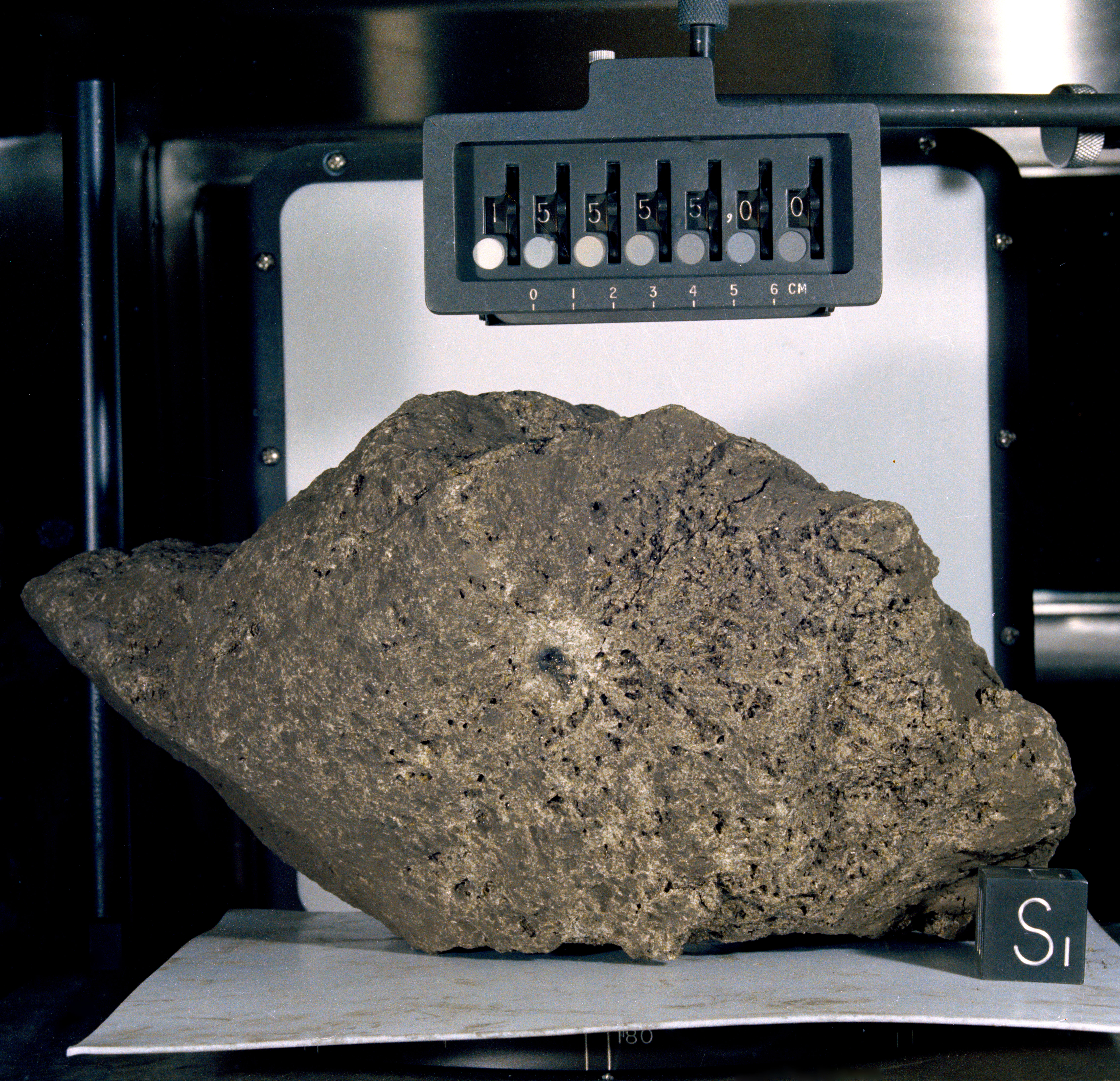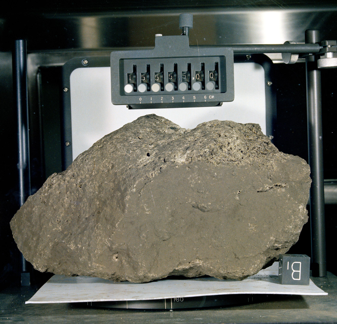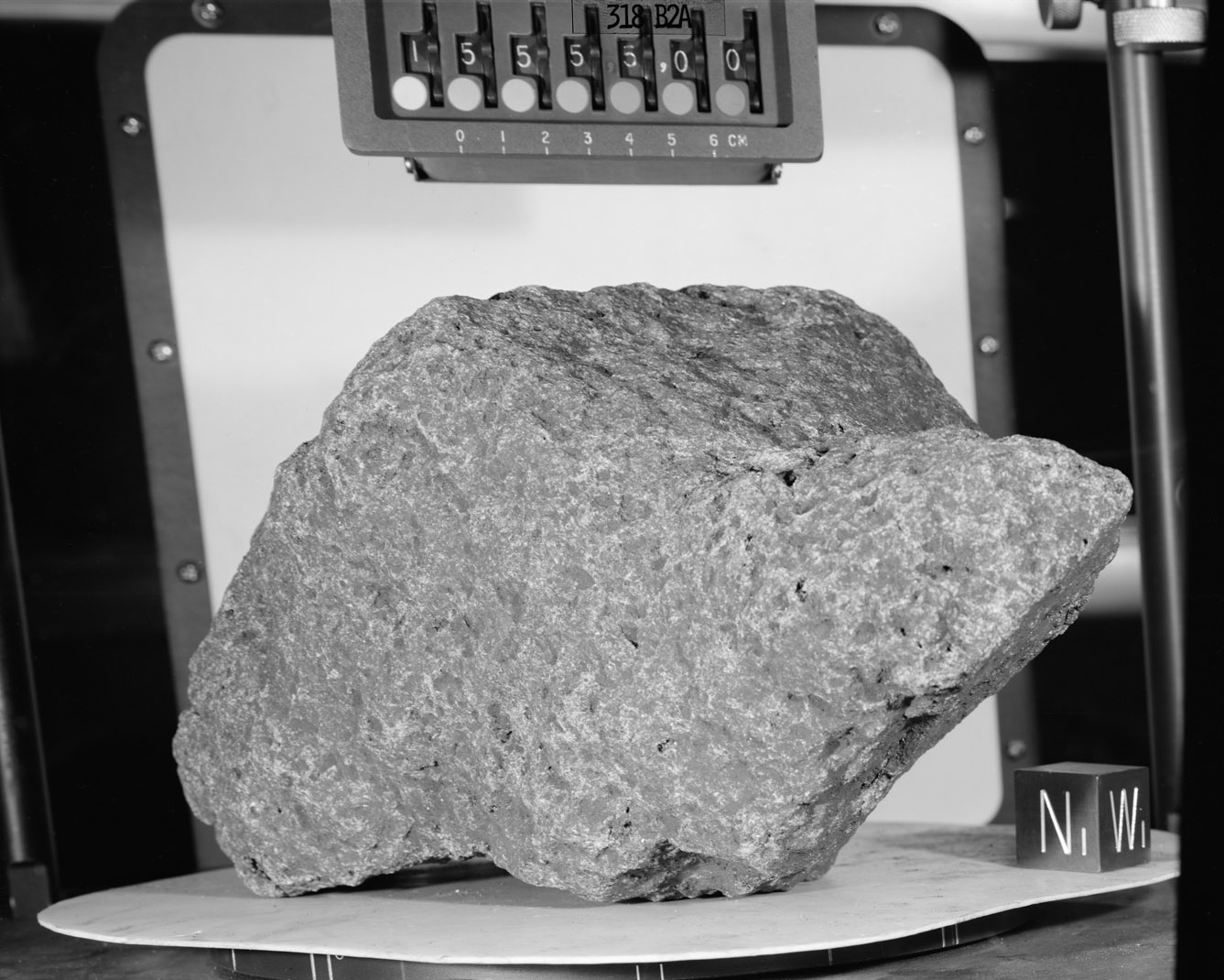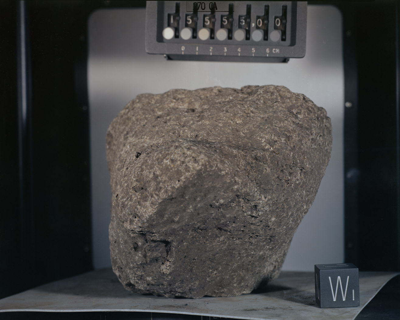 Second view of Great Scott. The cube at the lower right is one inch (2.54 cm) on eash side.S71-43392 (10 Mb or 0.5 Mb)