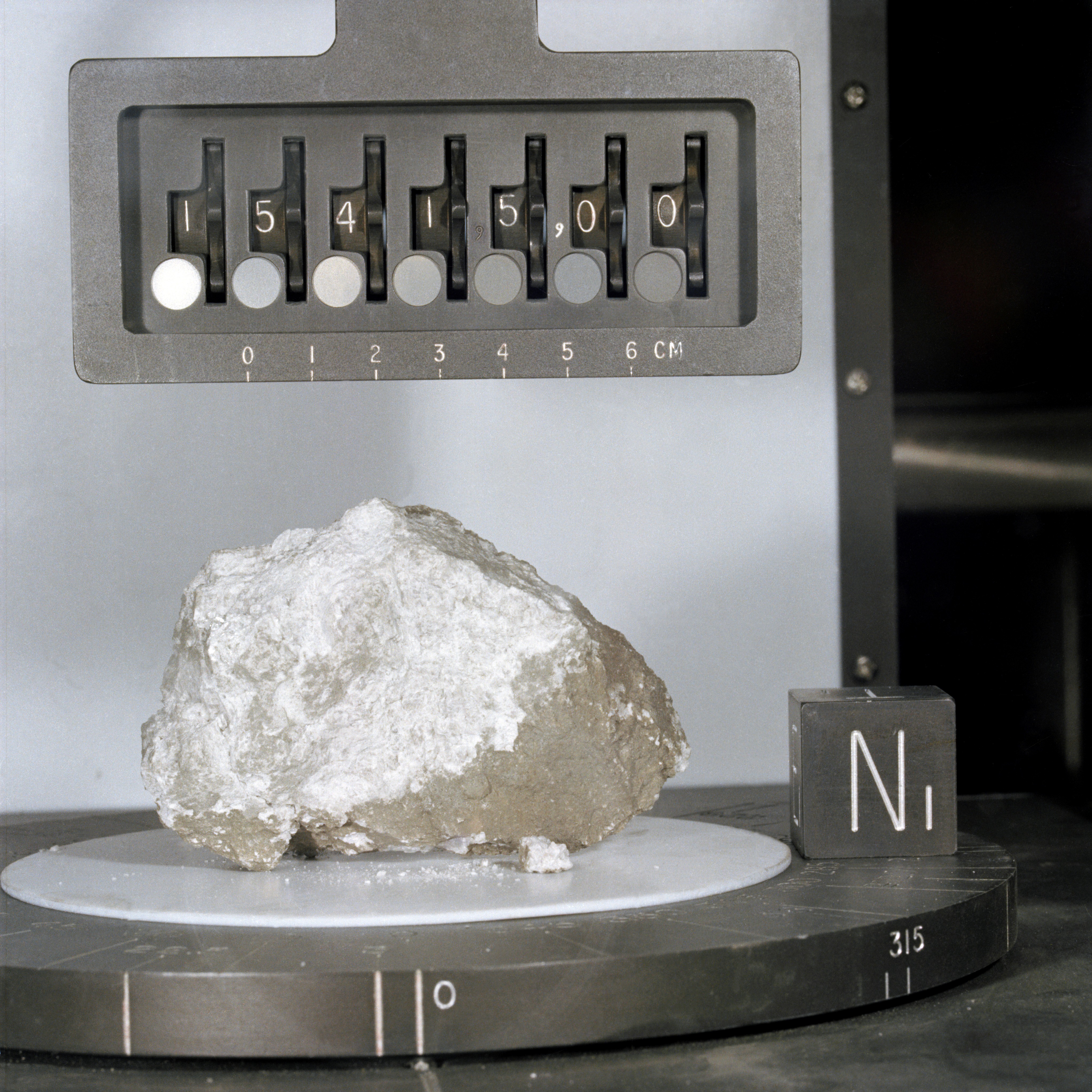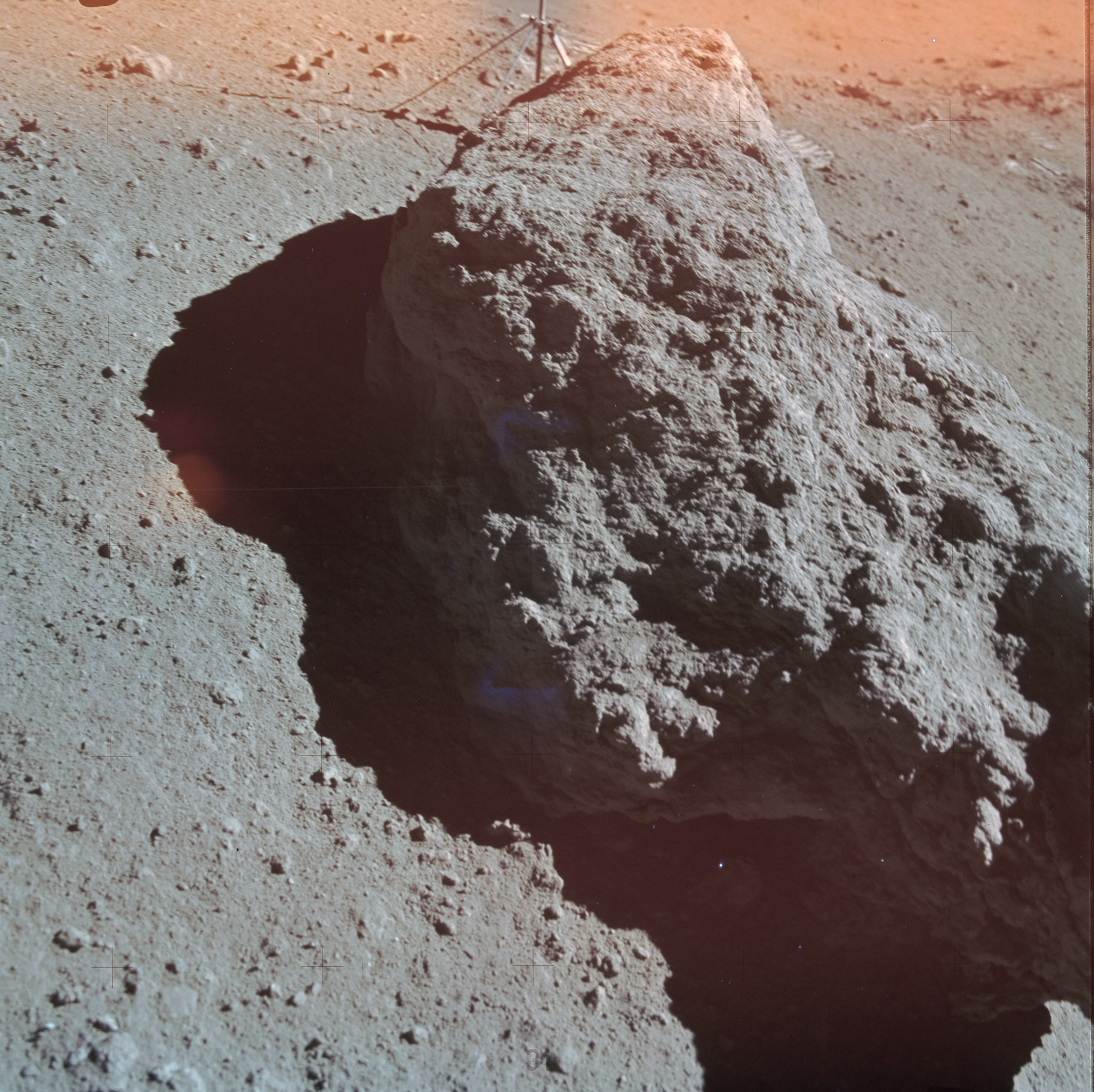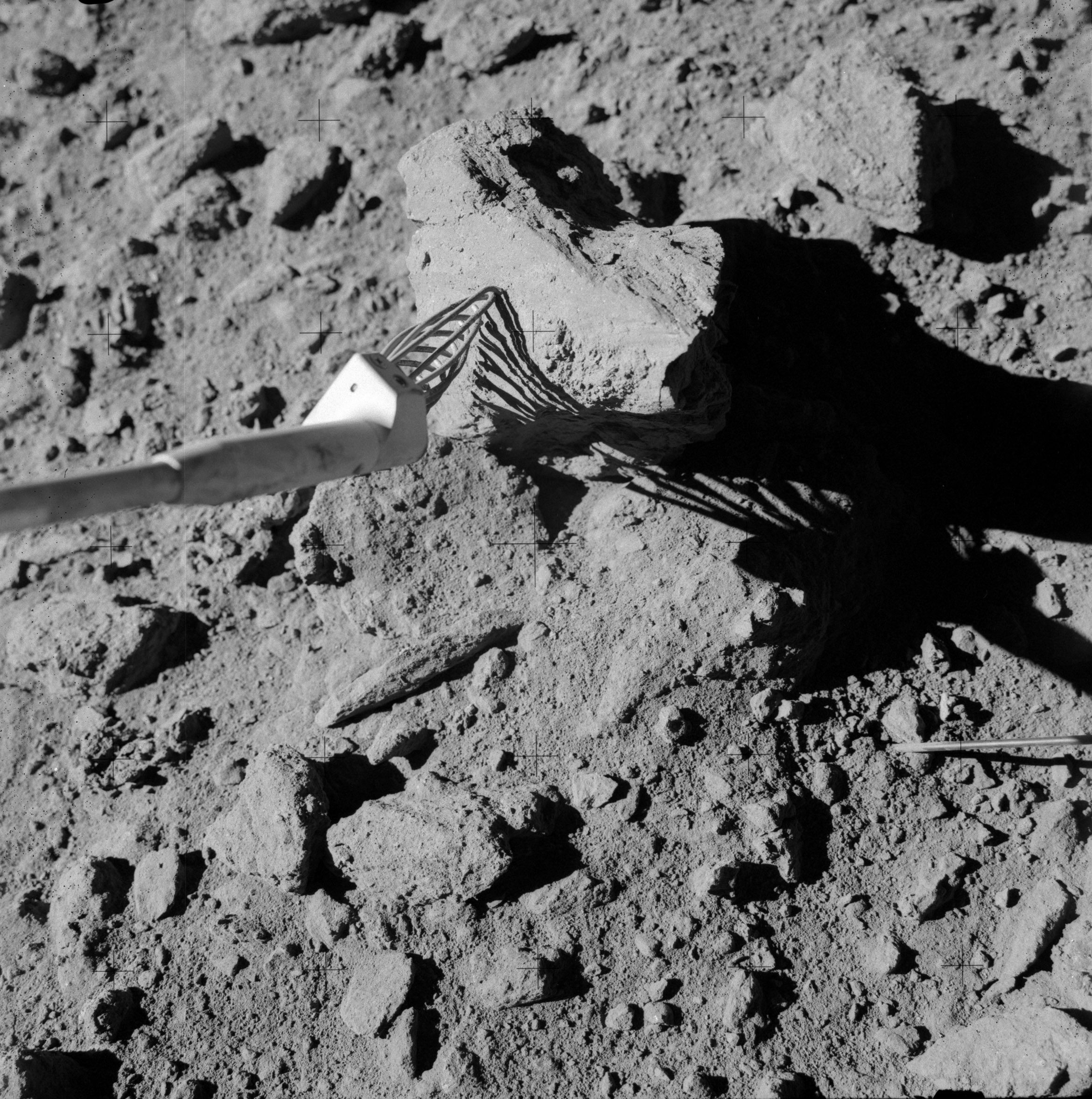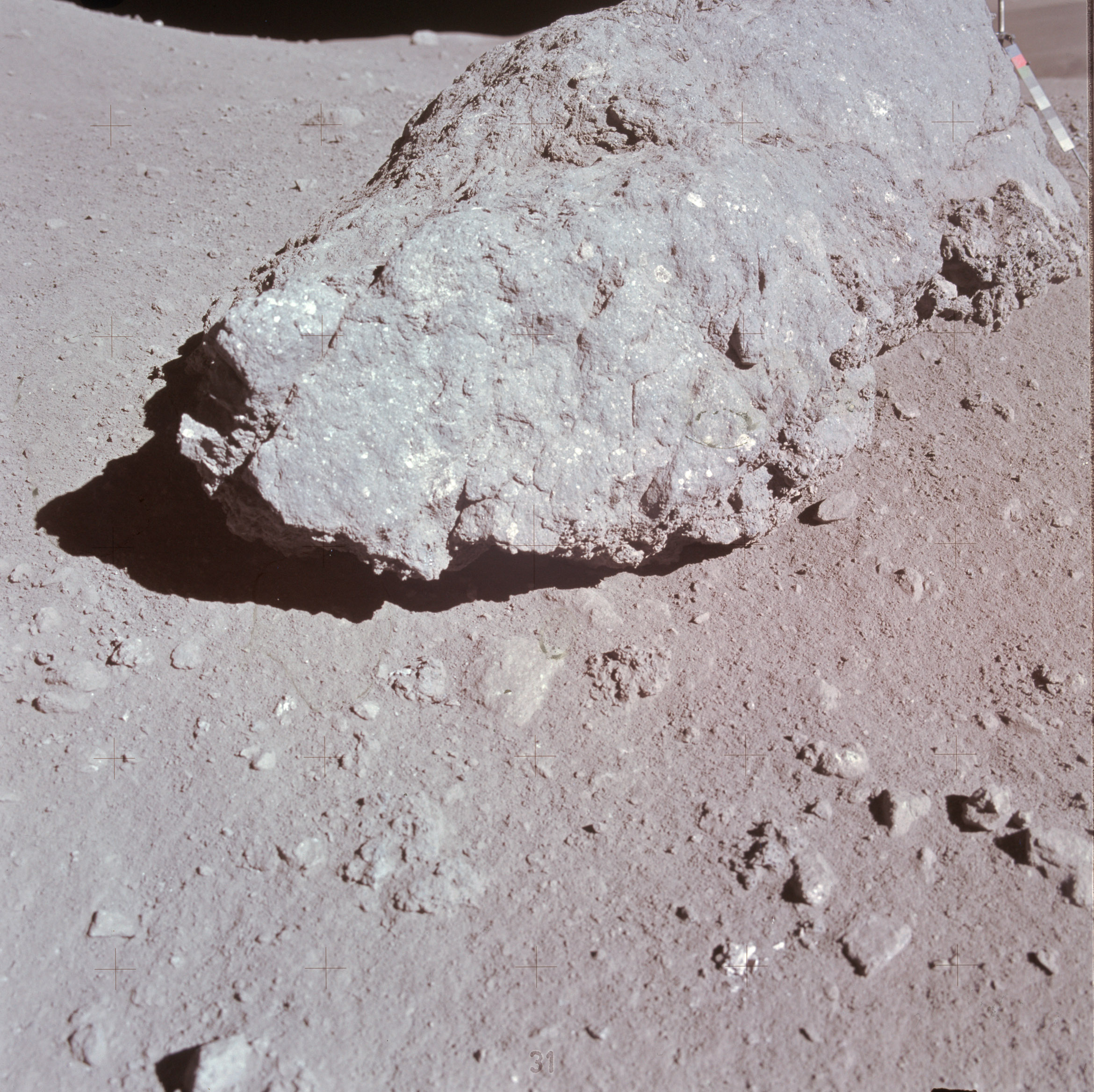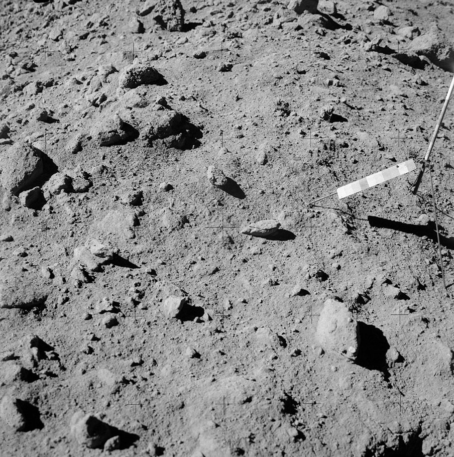 Second view of Great Scott. The cube at the lower right is one inch (2.54 cm) on eash side.S71-43392 (10 Mb or 0.5 Mb)