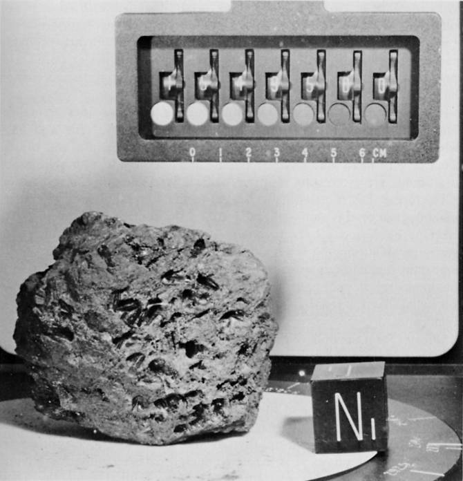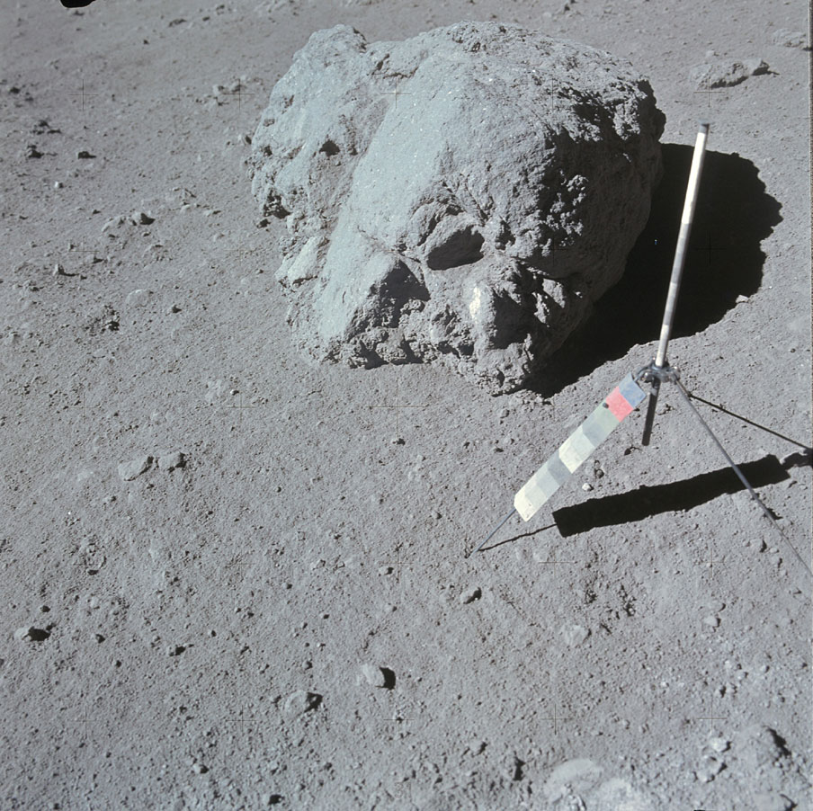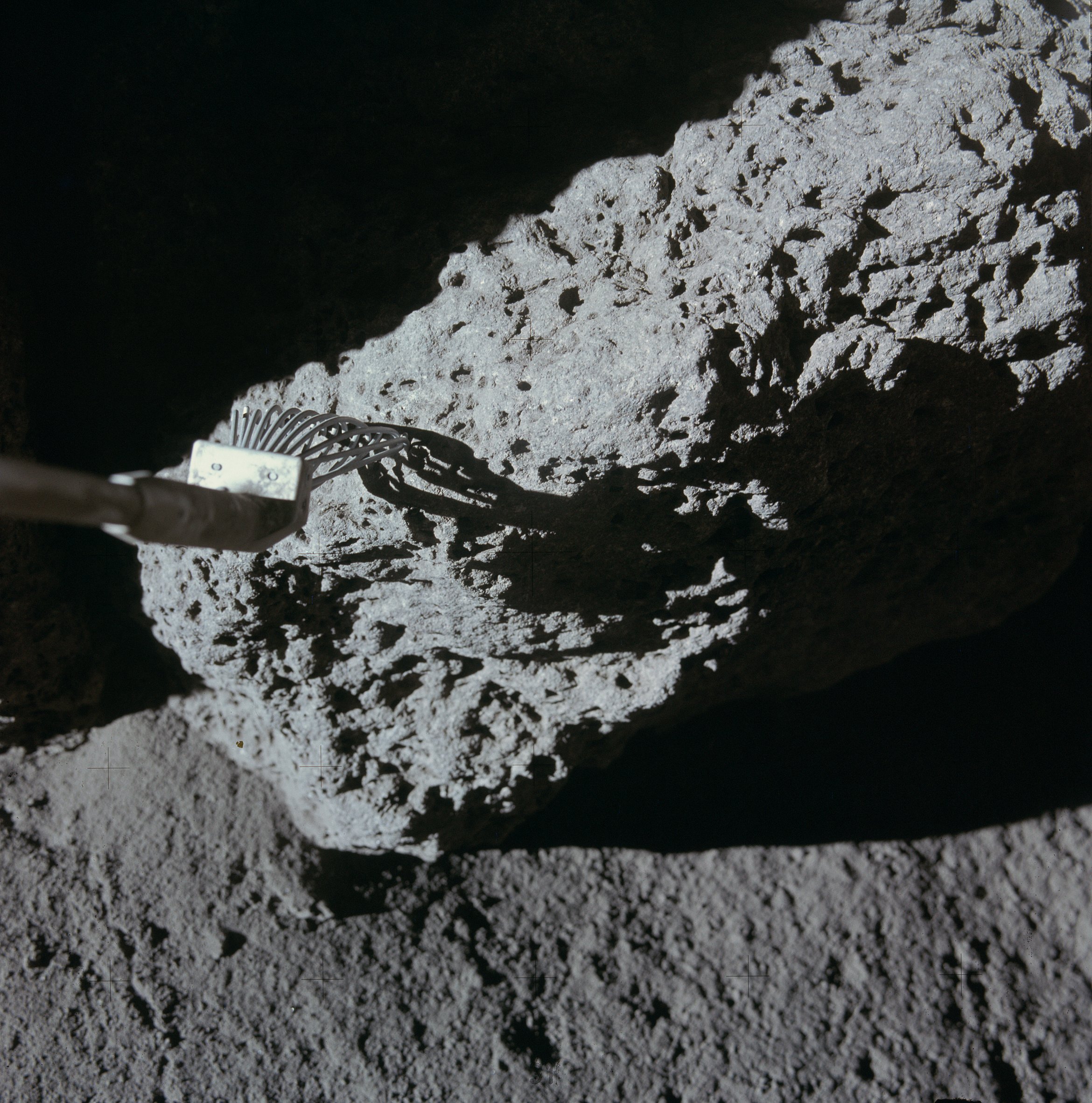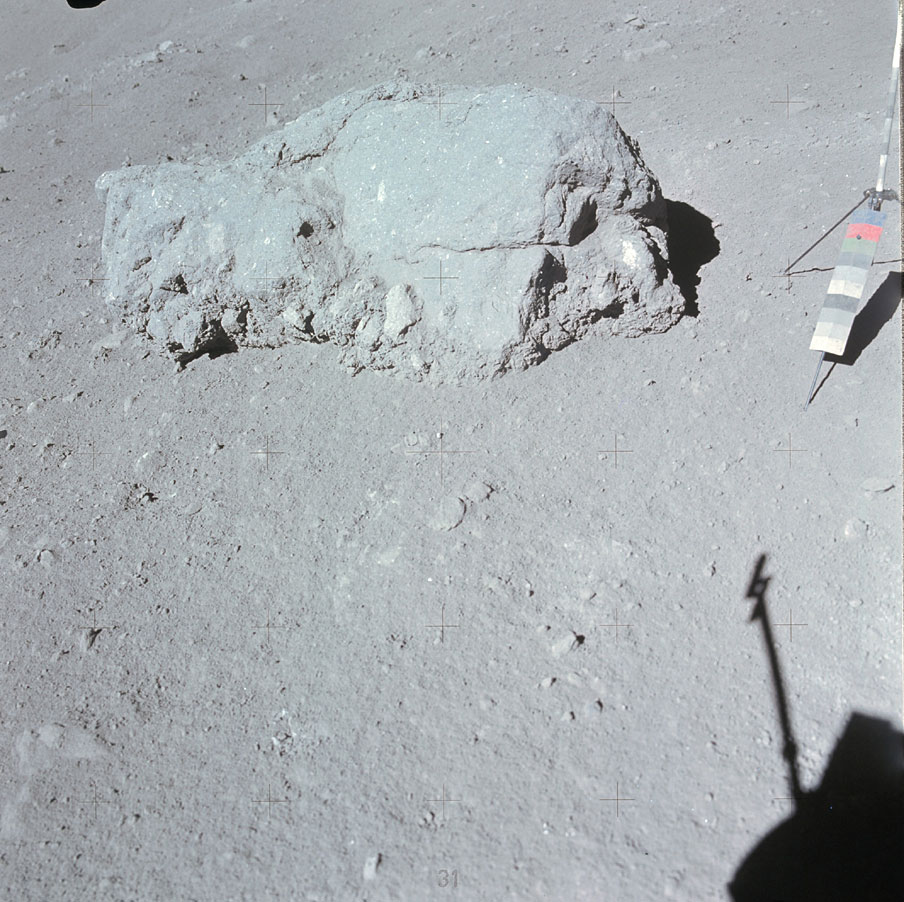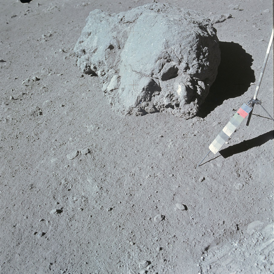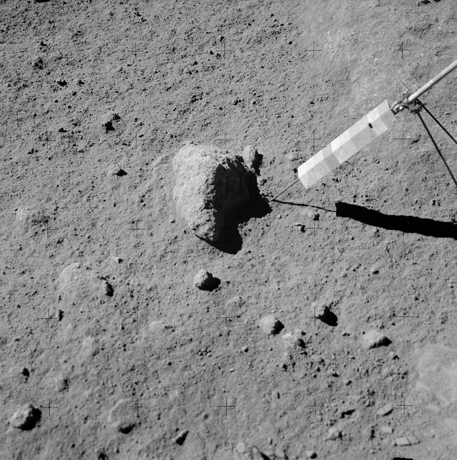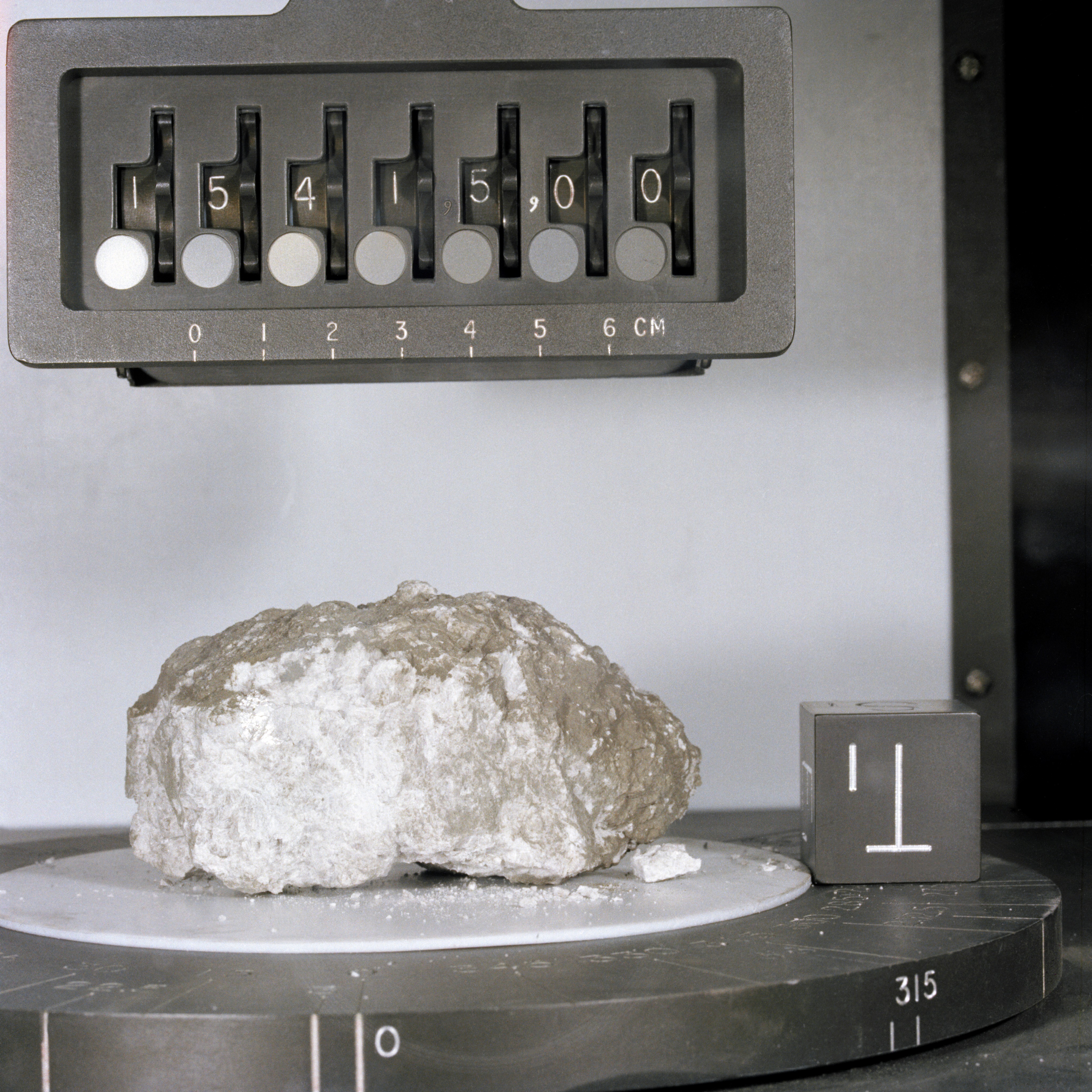 Second view of Great Scott. The cube at the lower right is one inch (2.54 cm) on eash side.S71-43392 (10 Mb or 0.5 Mb)