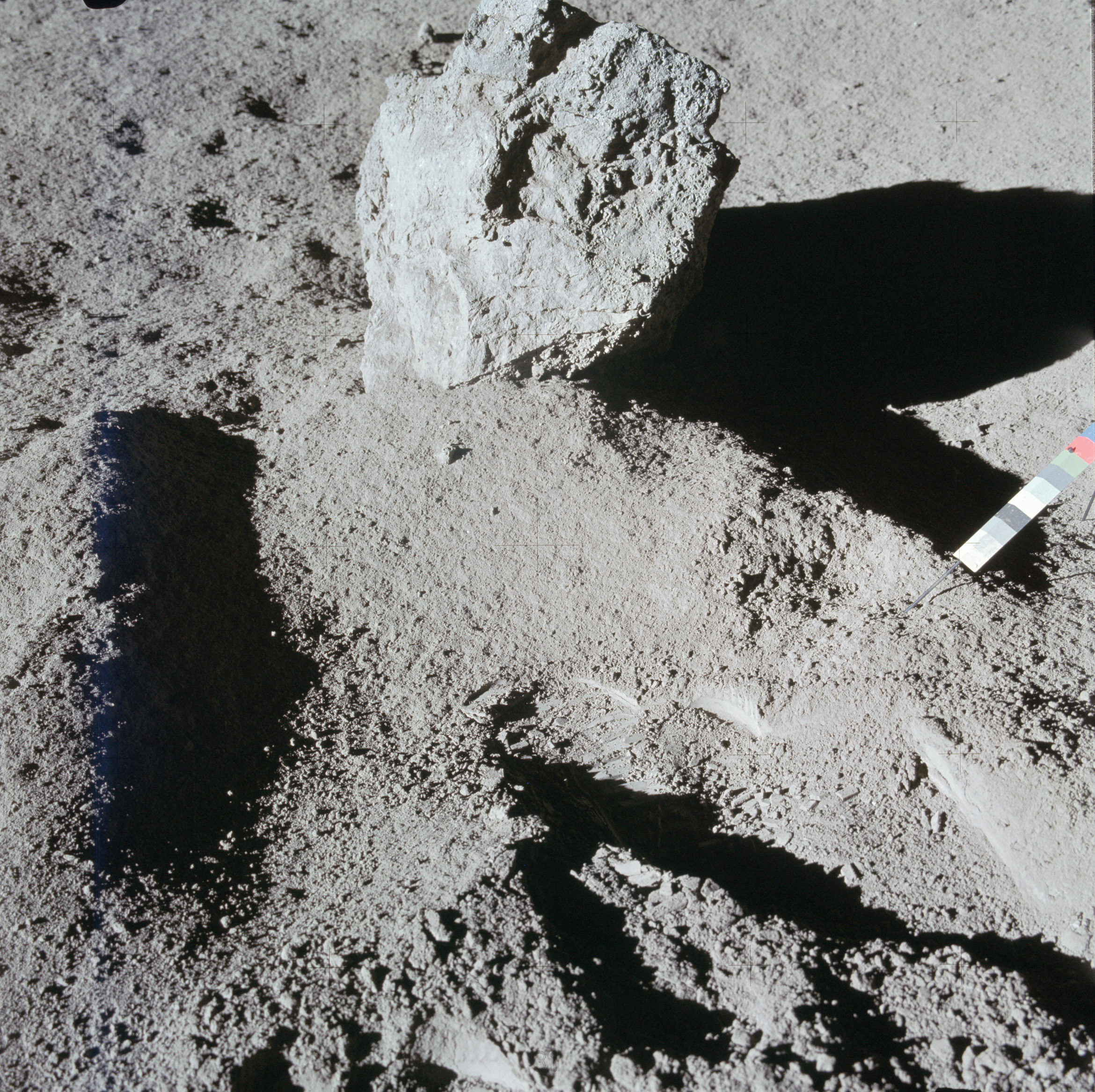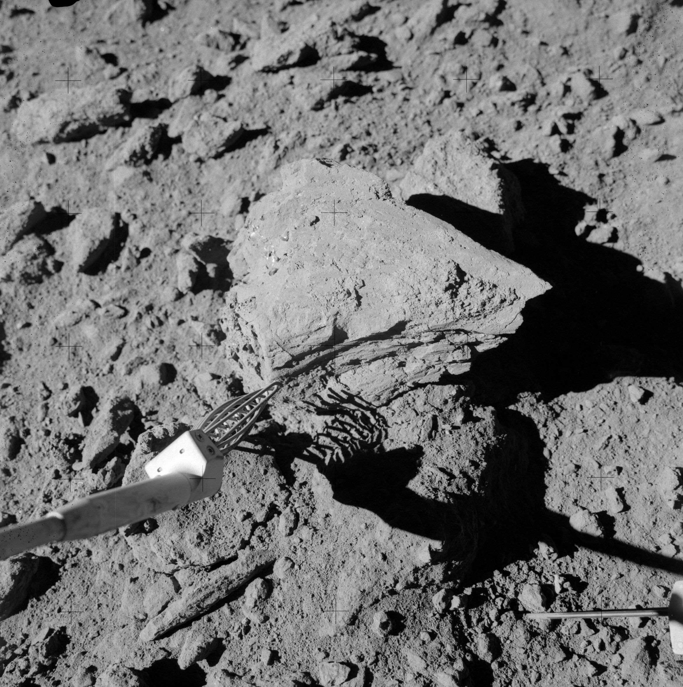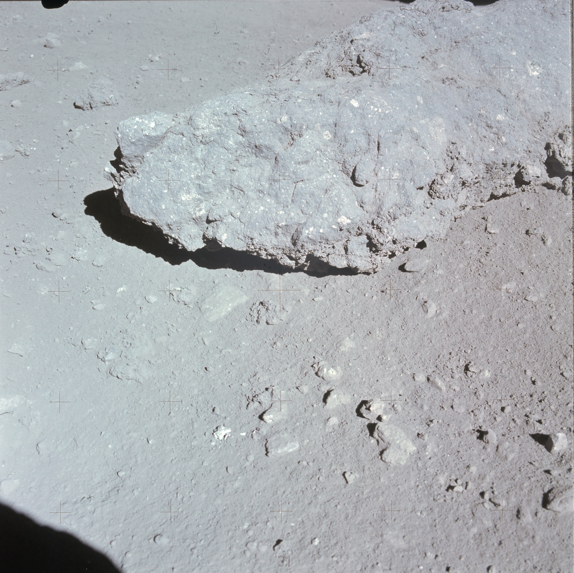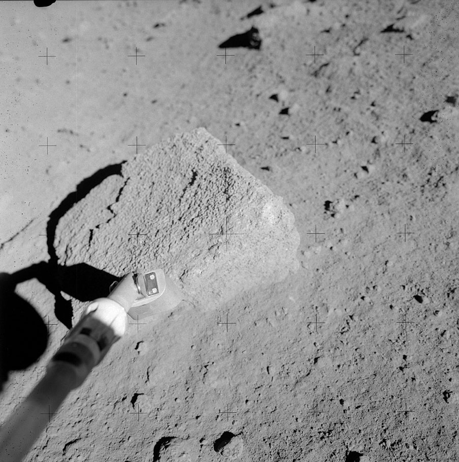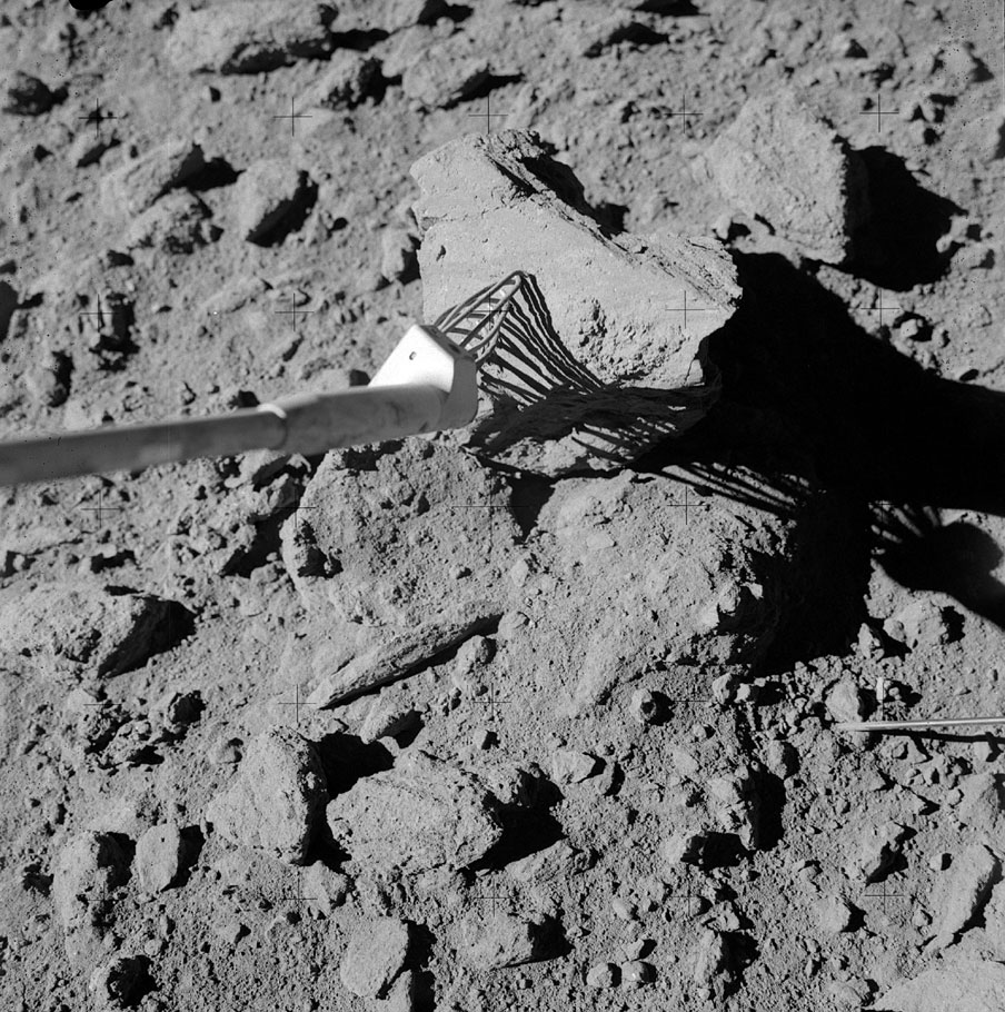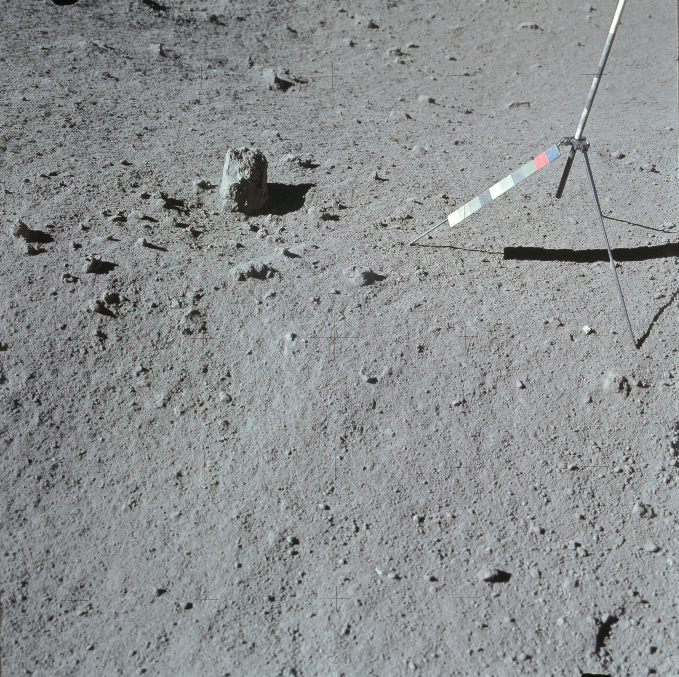 Second view of Great Scott. The cube at the lower right is one inch (2.54 cm) on eash side.S71-43392 (10 Mb or 0.5 Mb)