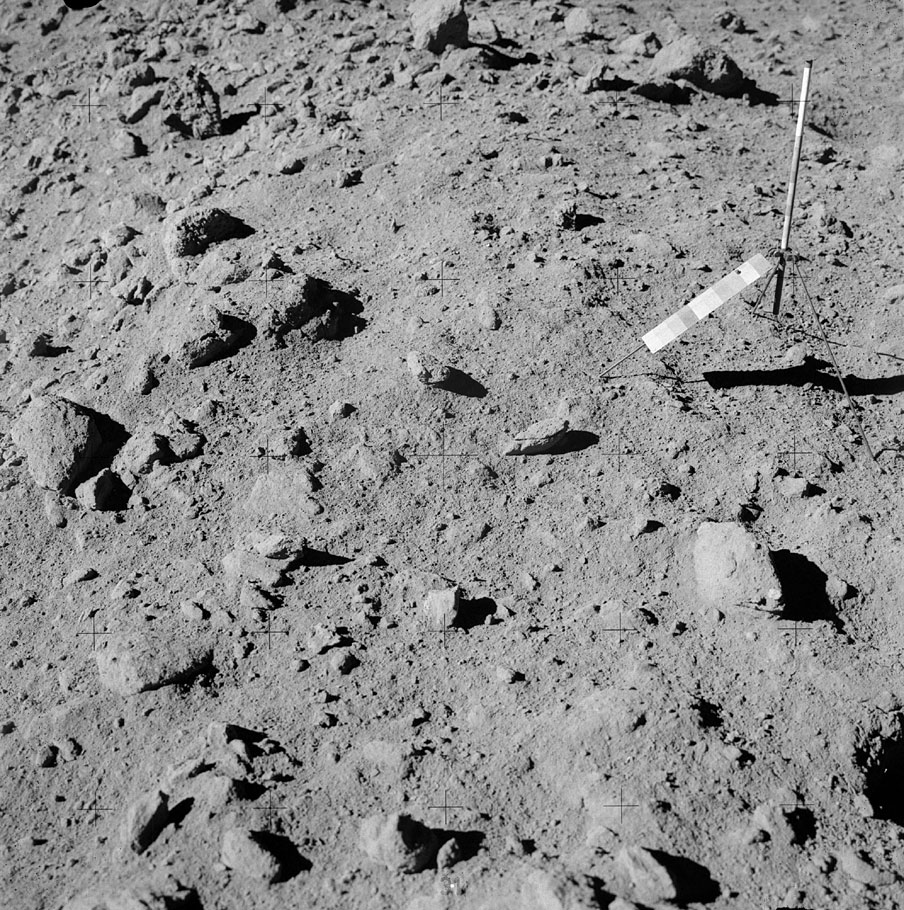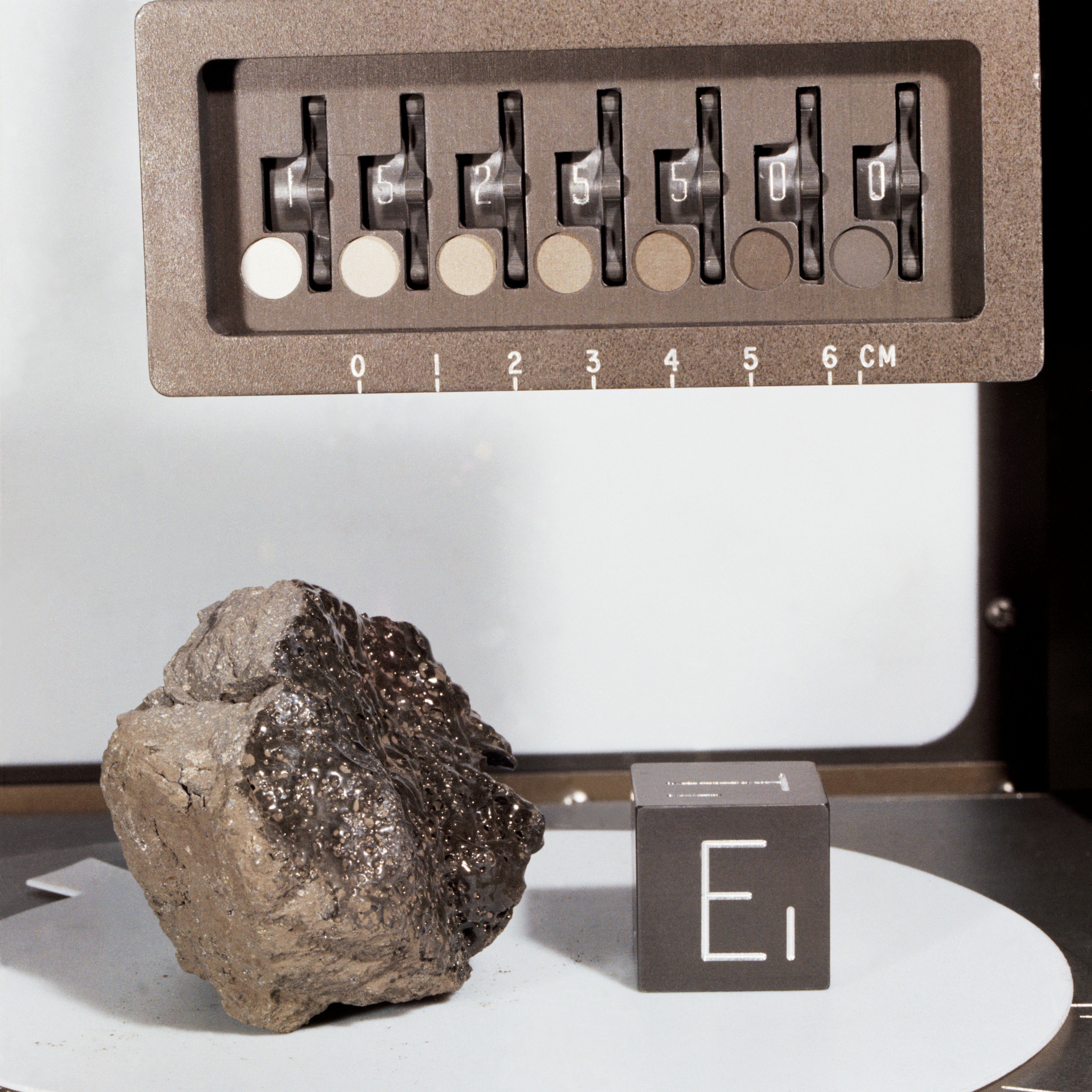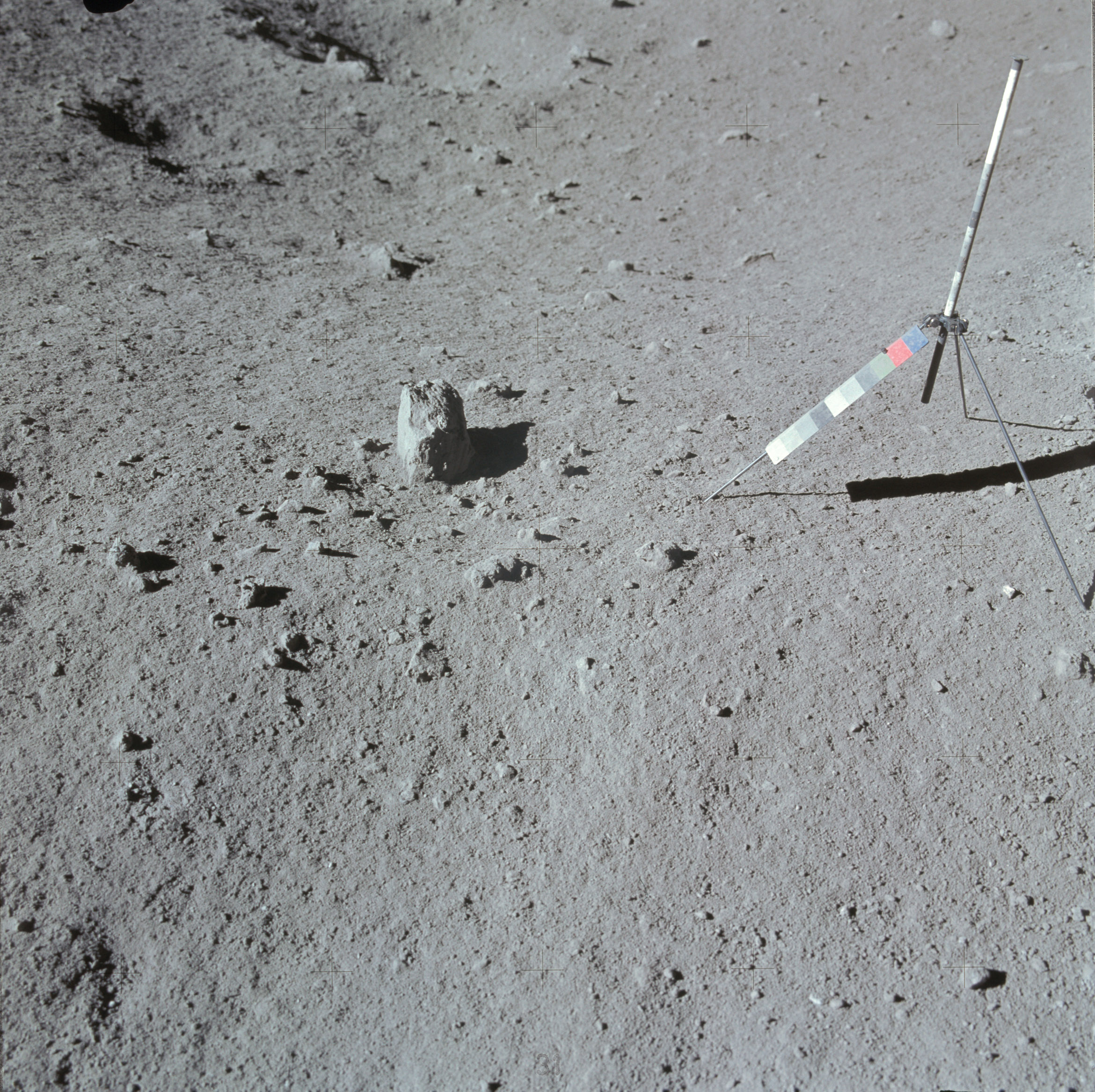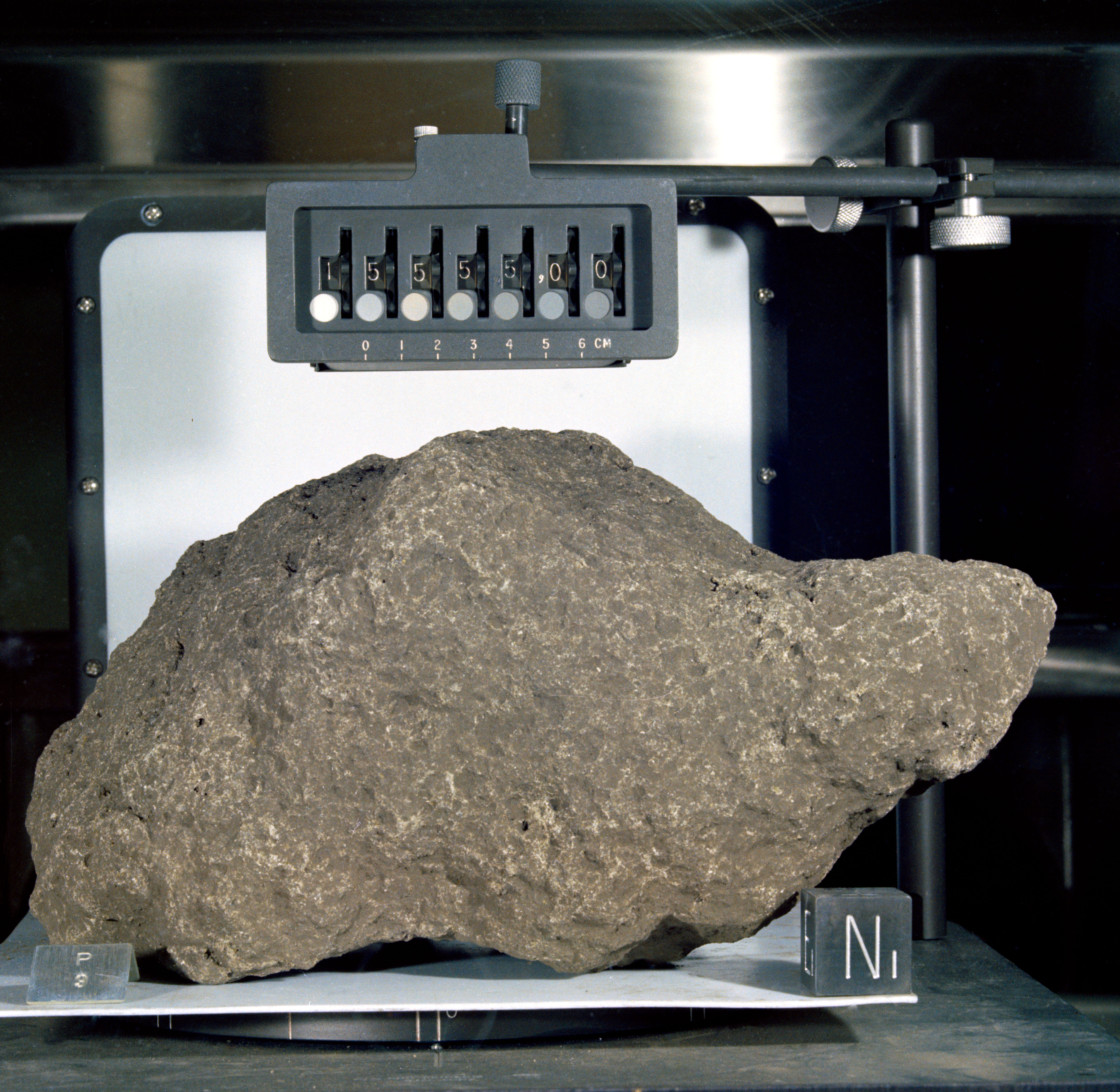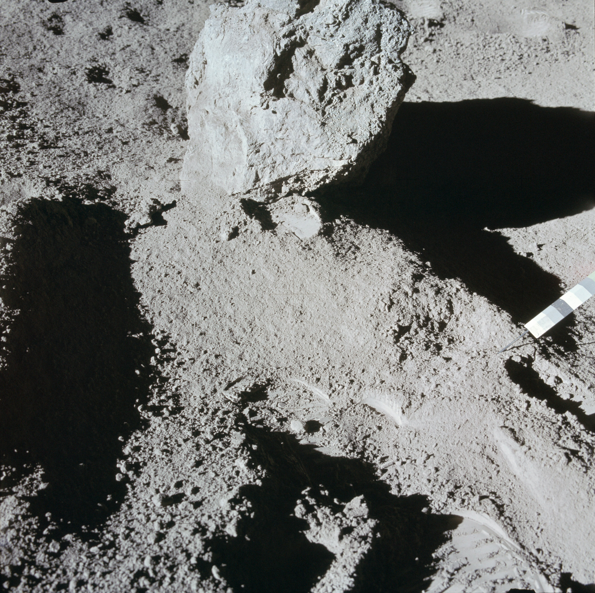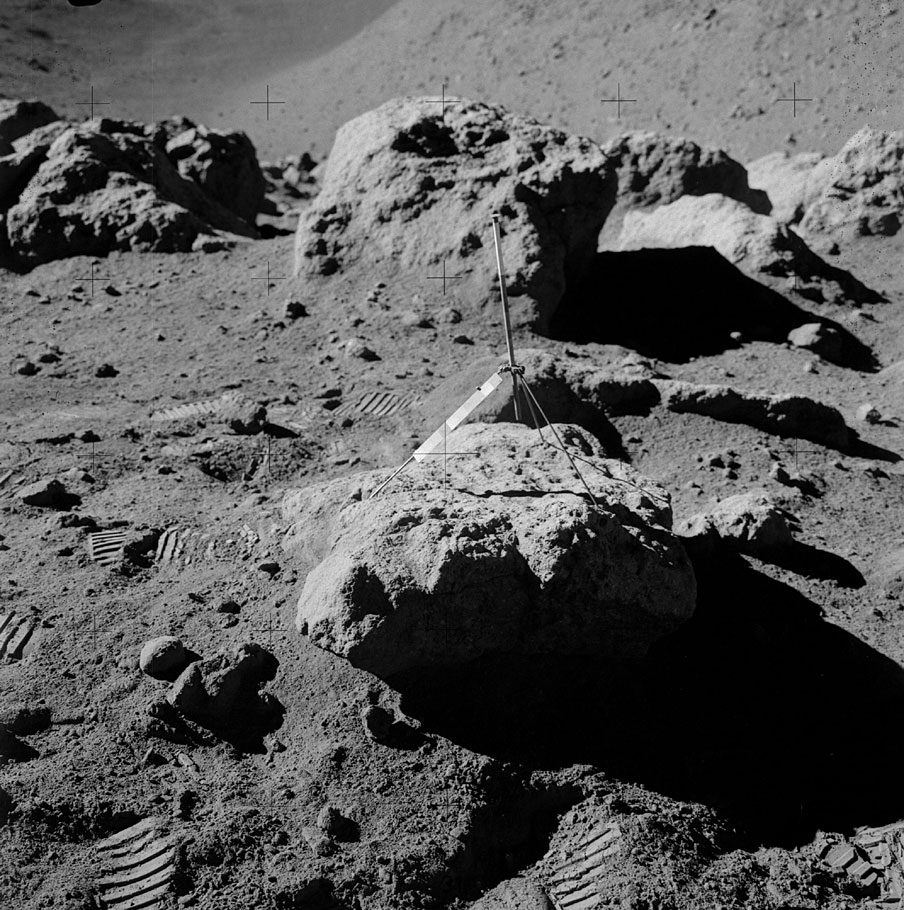 Second view of Great Scott. The cube at the lower right is one inch (2.54 cm) on eash side.S71-43392 (10 Mb or 0.5 Mb)